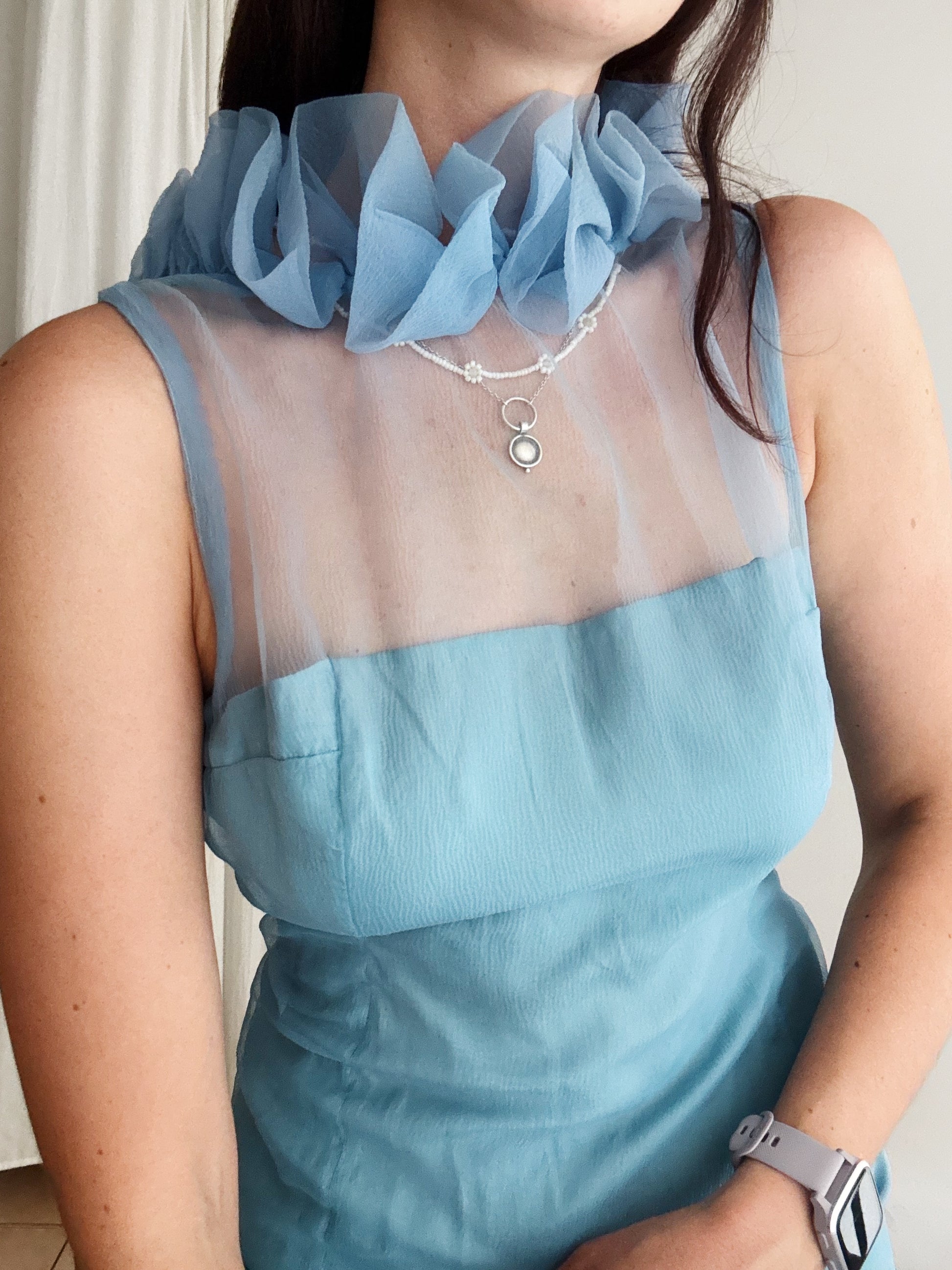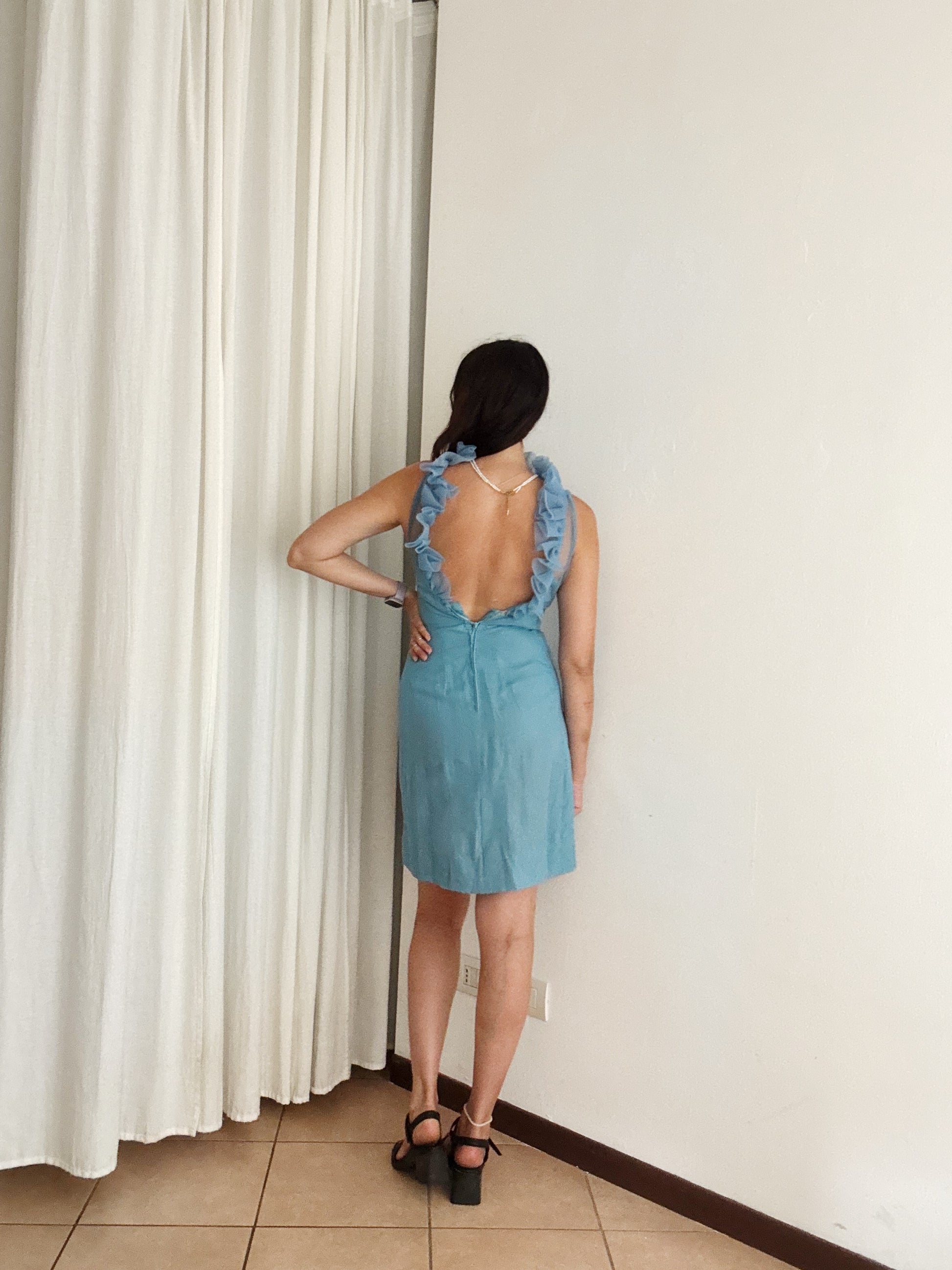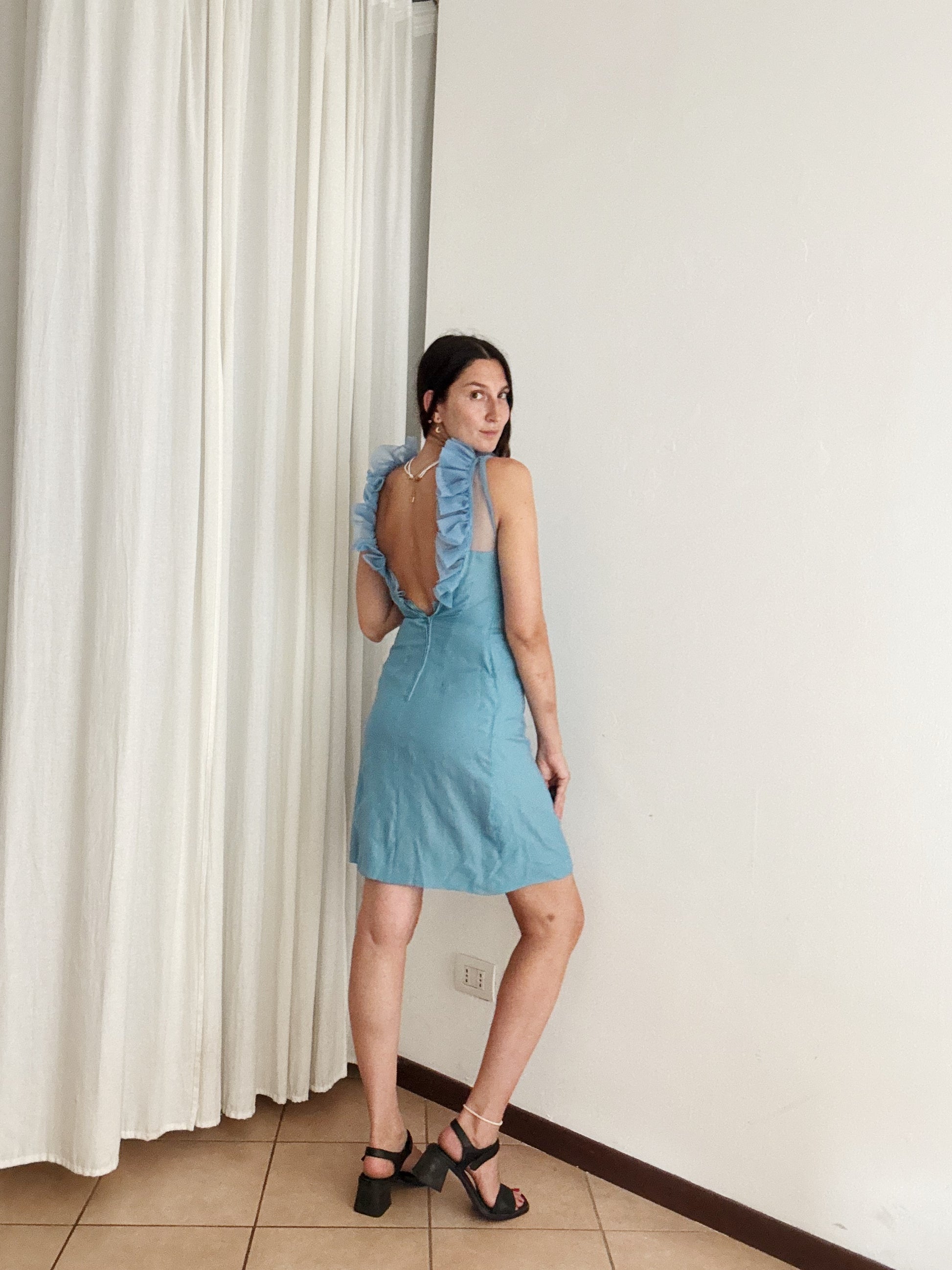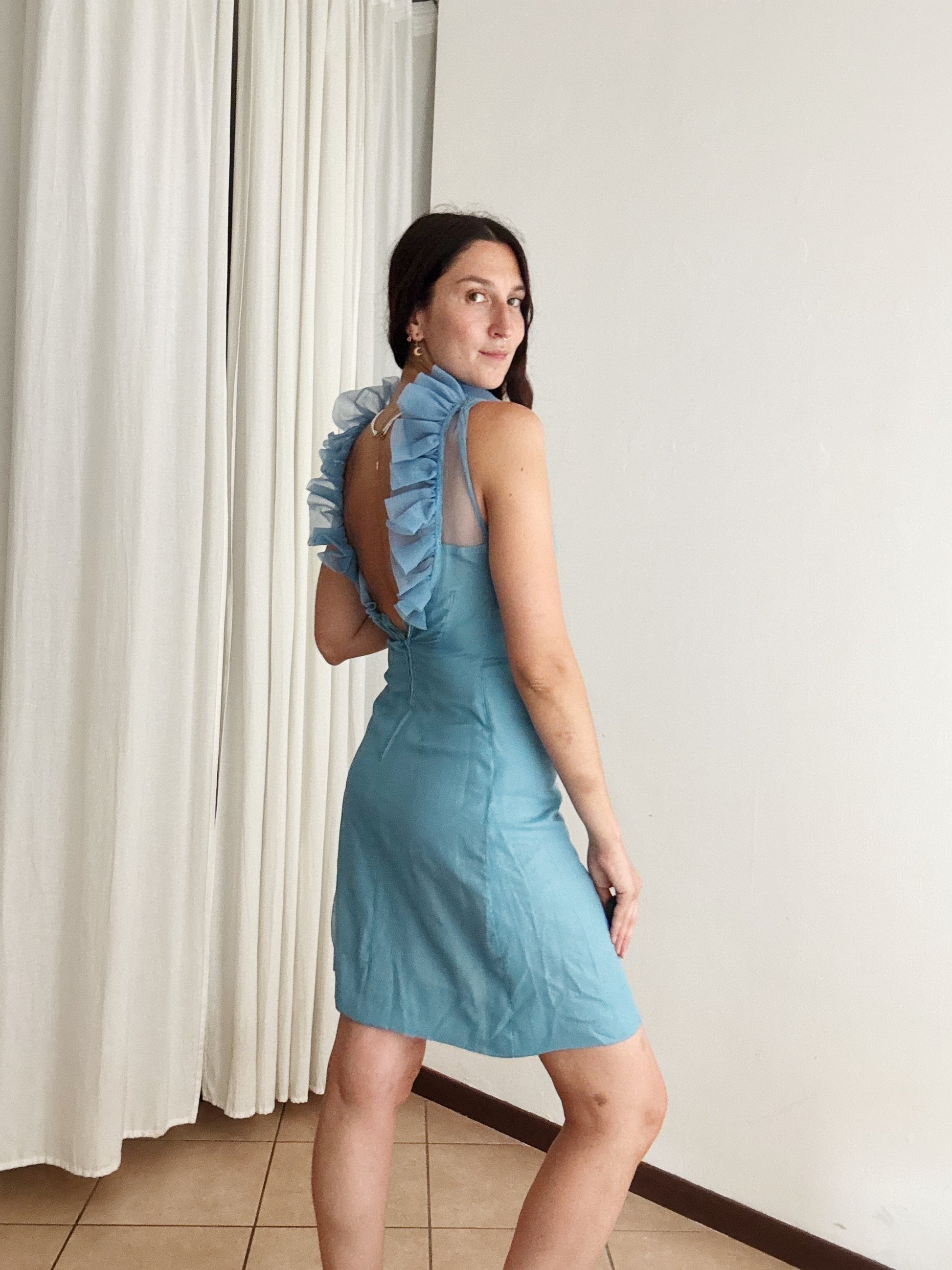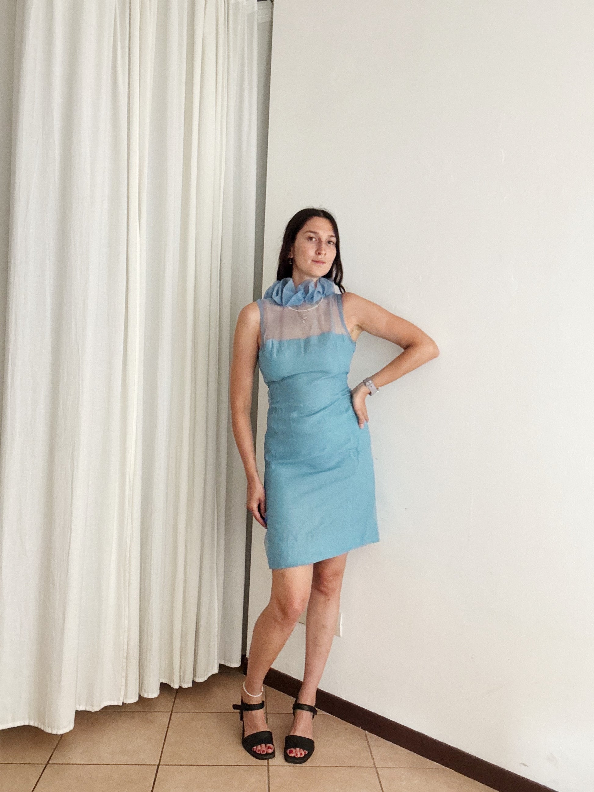 Abito vintage sartoriale azzurro con rouches sul collo e ampia scollatura posteriore. Misure: ascelle 38, vita 33, fianchi 45, lunghezza 93. Fun fact: sul fondo sono cucite delle monete che fungono da pesetti per tenerlo giù