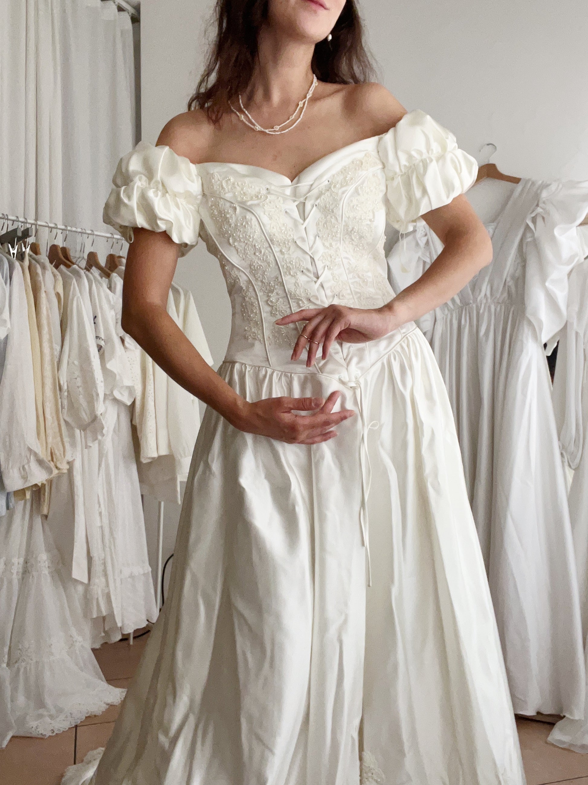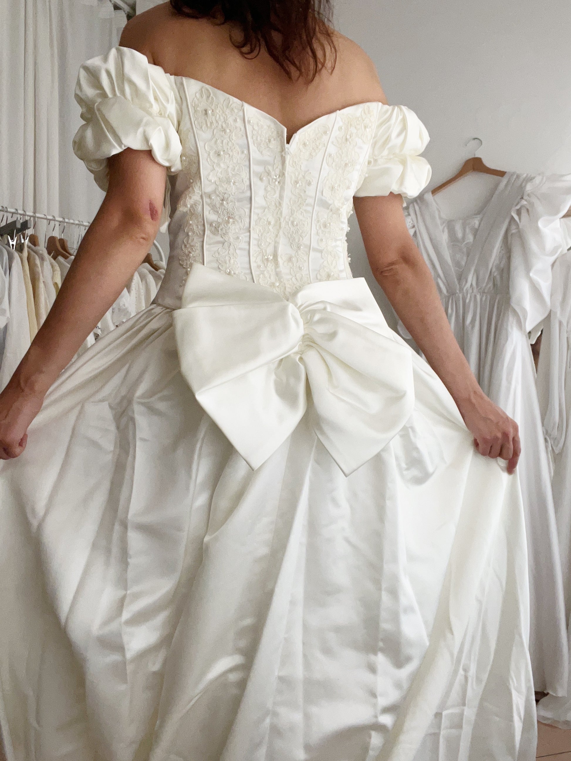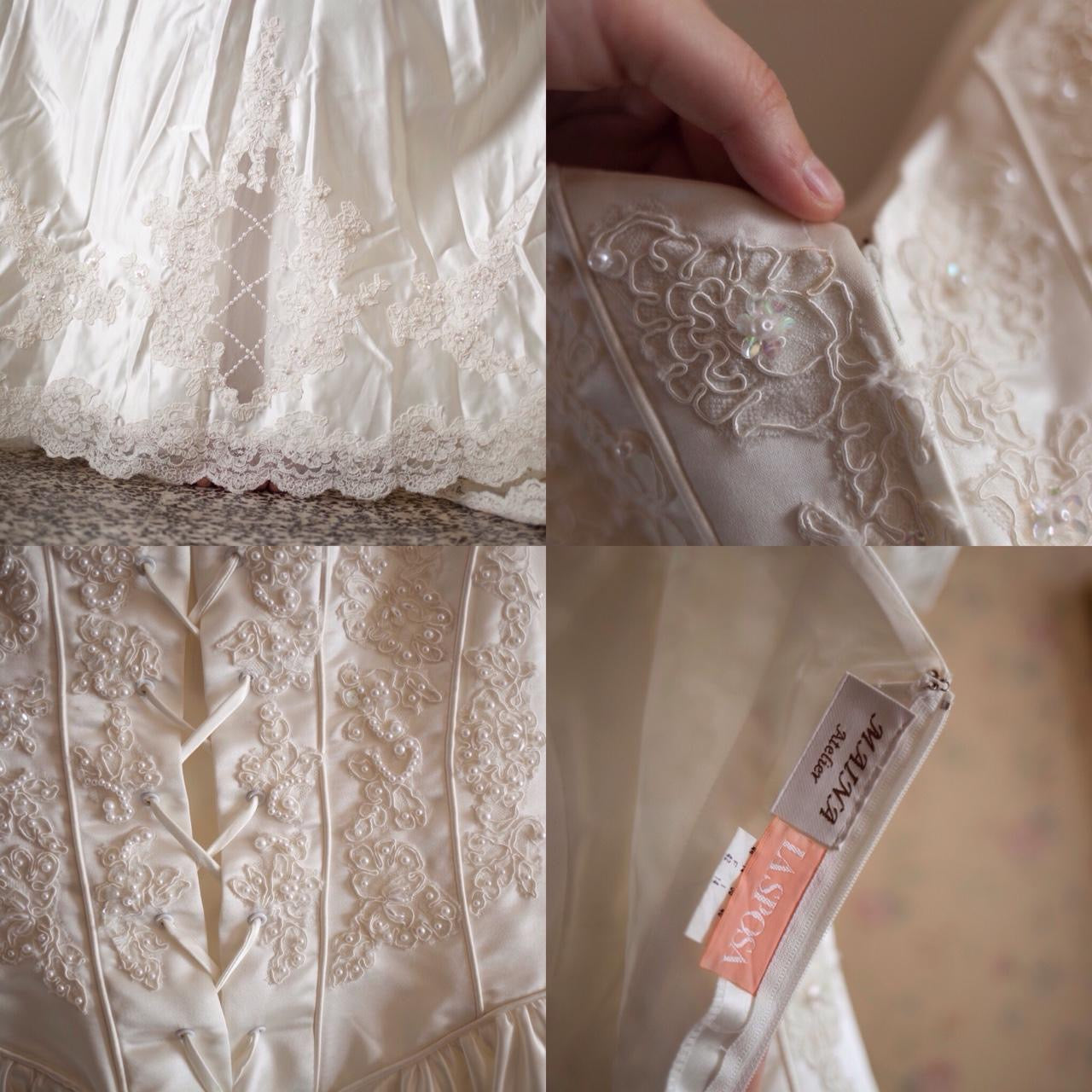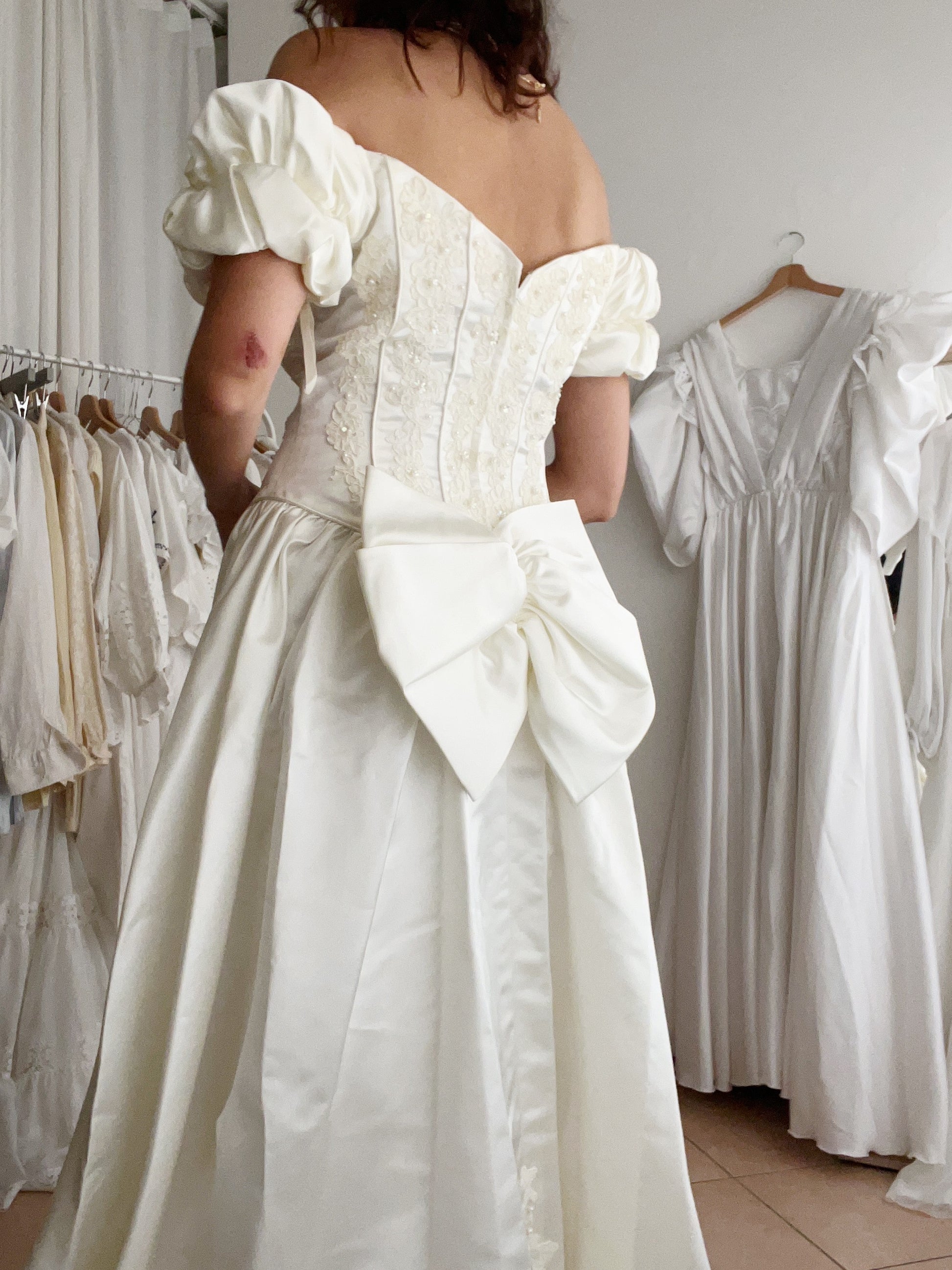 Bellissimo abito da sposa color bianco avorio, la taglia dovrebbe essere una 44/46 con corpetto che piò essere stretto/allargato in modo da seguire le forme. Maina Atelier La Sposa. Fiocco sul retro, pizzi e perline su tutto l'abito, strascico posteriore. Misure approssimative: ascelle 44-48cm, vita 36-38 cm