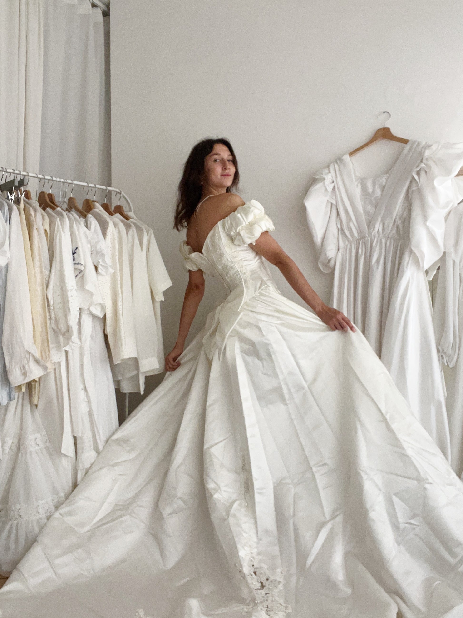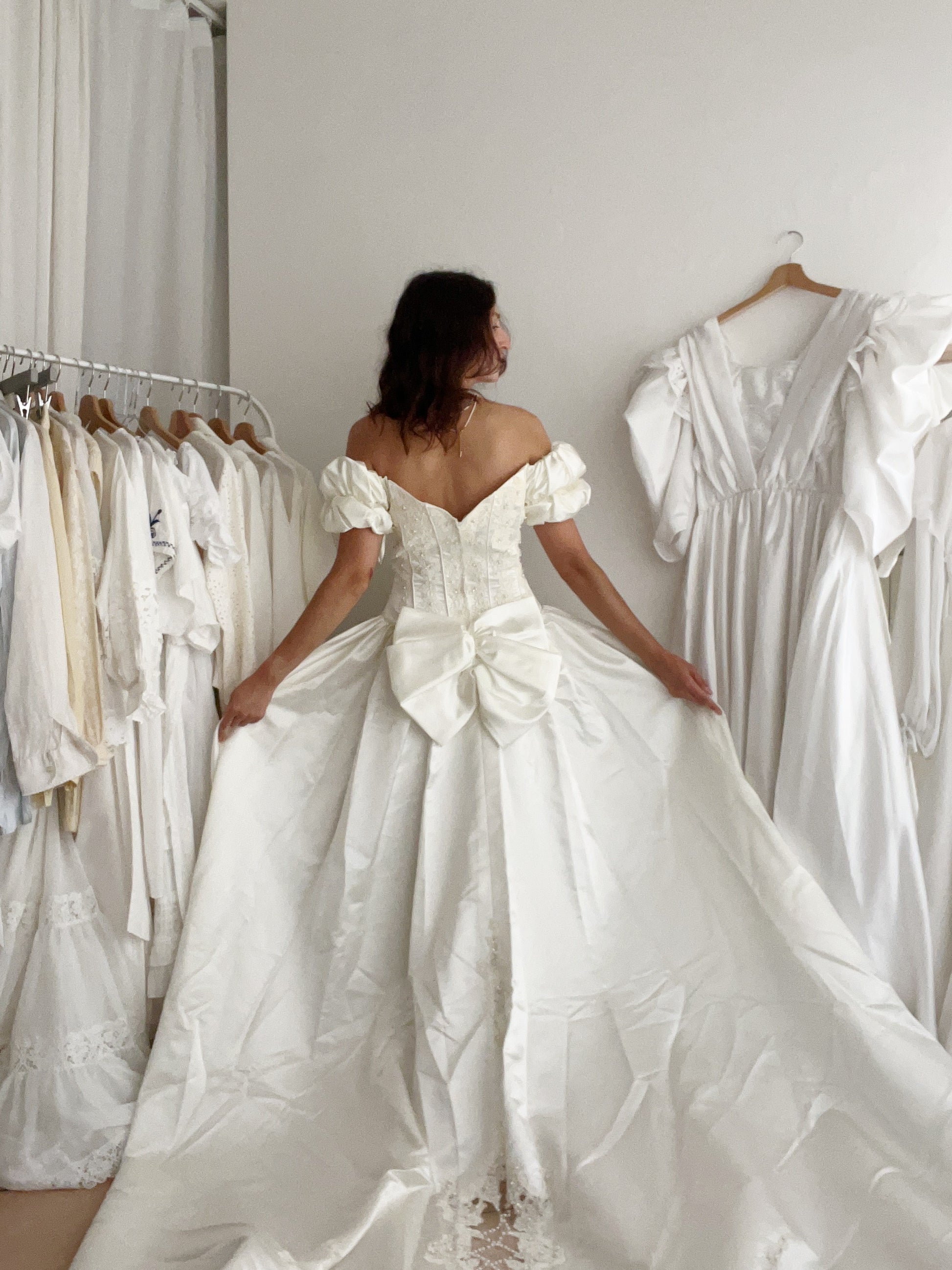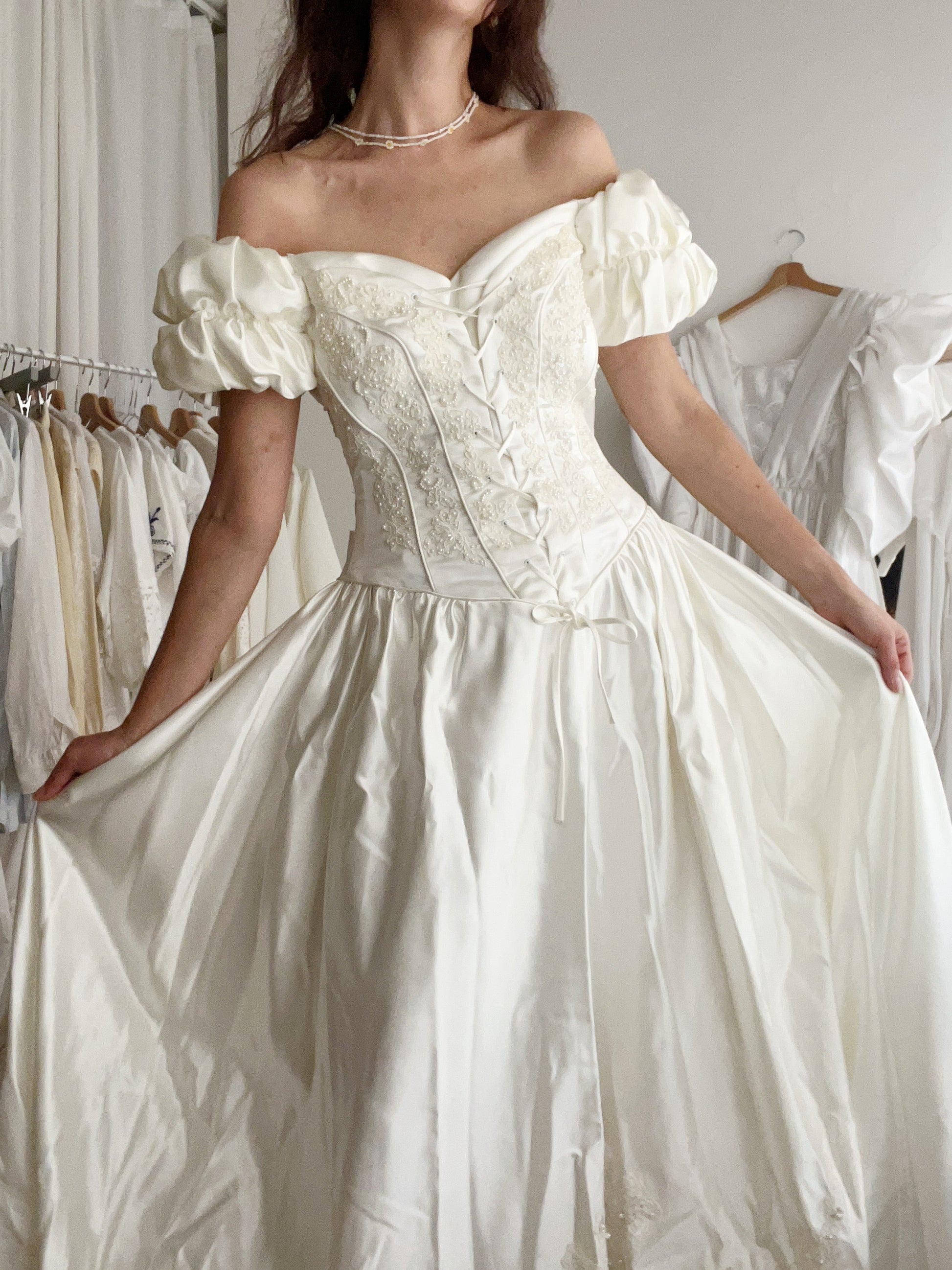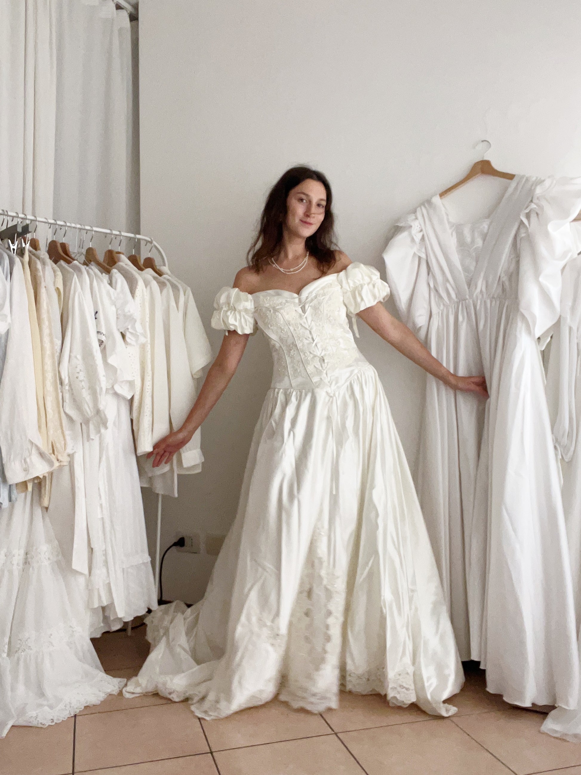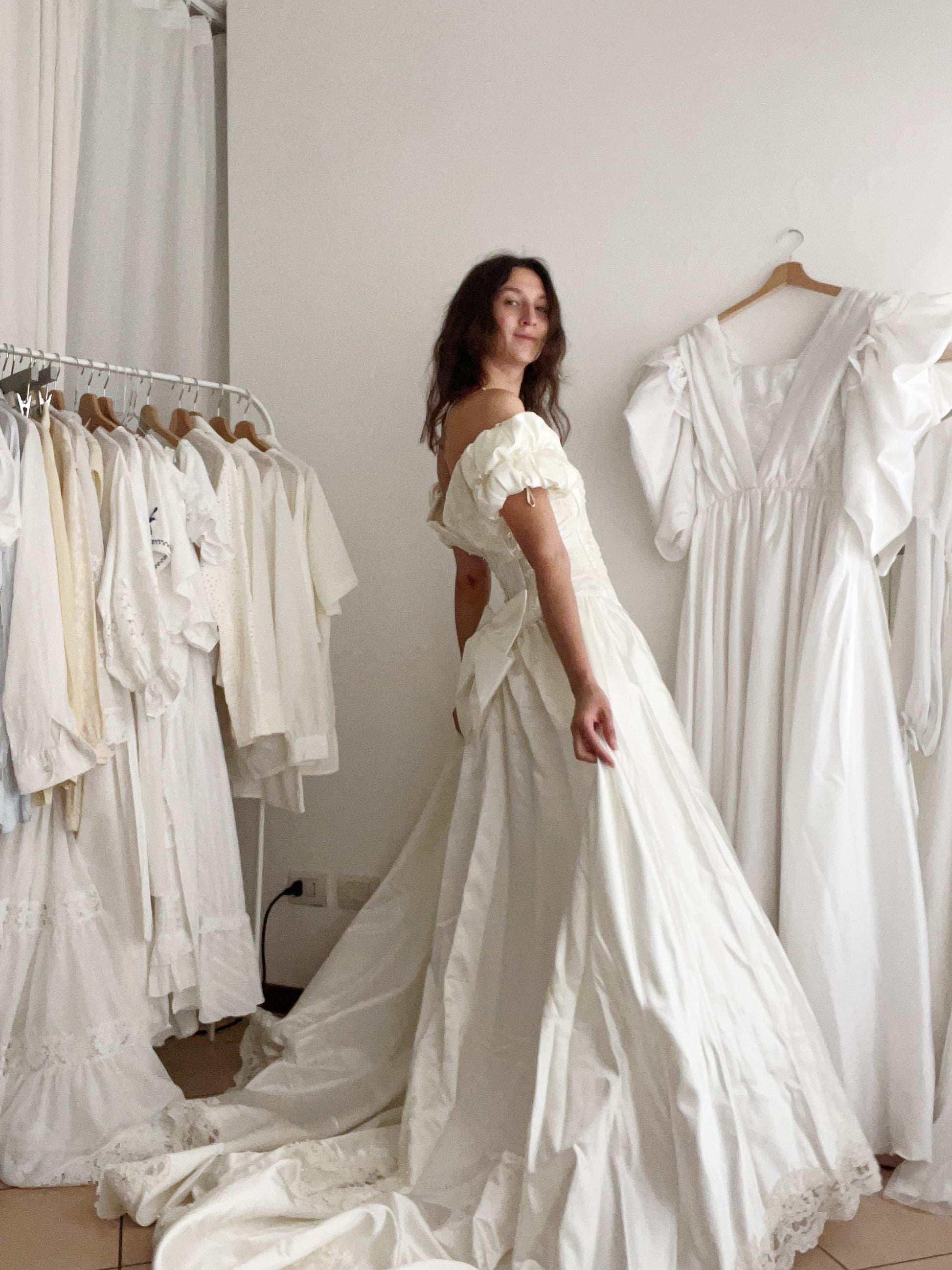 Bellissimo abito da sposa color bianco avorio, la taglia dovrebbe essere una 44/46 con corpetto che piò essere stretto/allargato in modo da seguire le forme. Maina Atelier La Sposa. Fiocco sul retro, pizzi e perline su tutto l'abito, strascico posteriore. Misure approssimative: ascelle 44-48cm, vita 36-38 cm