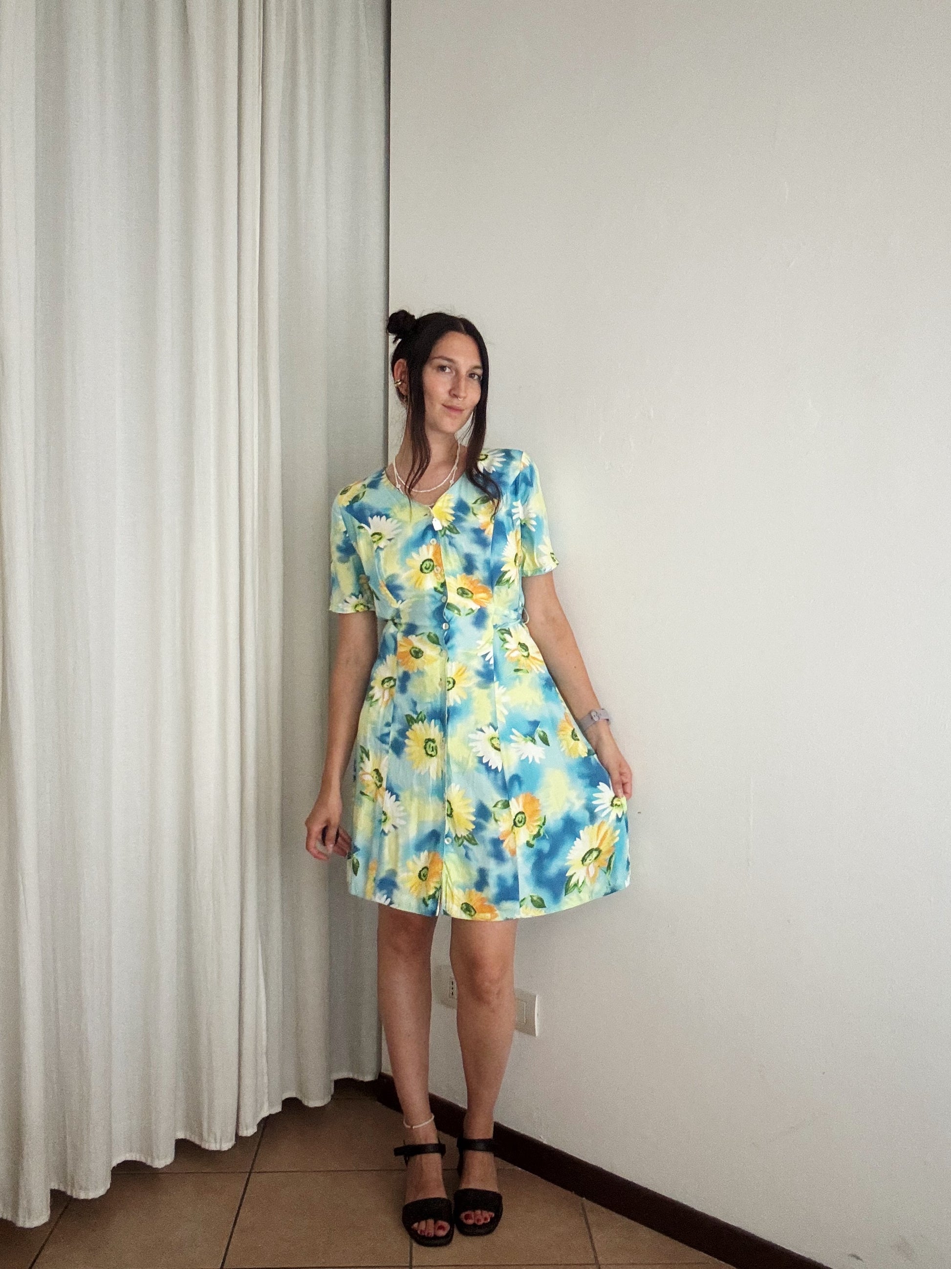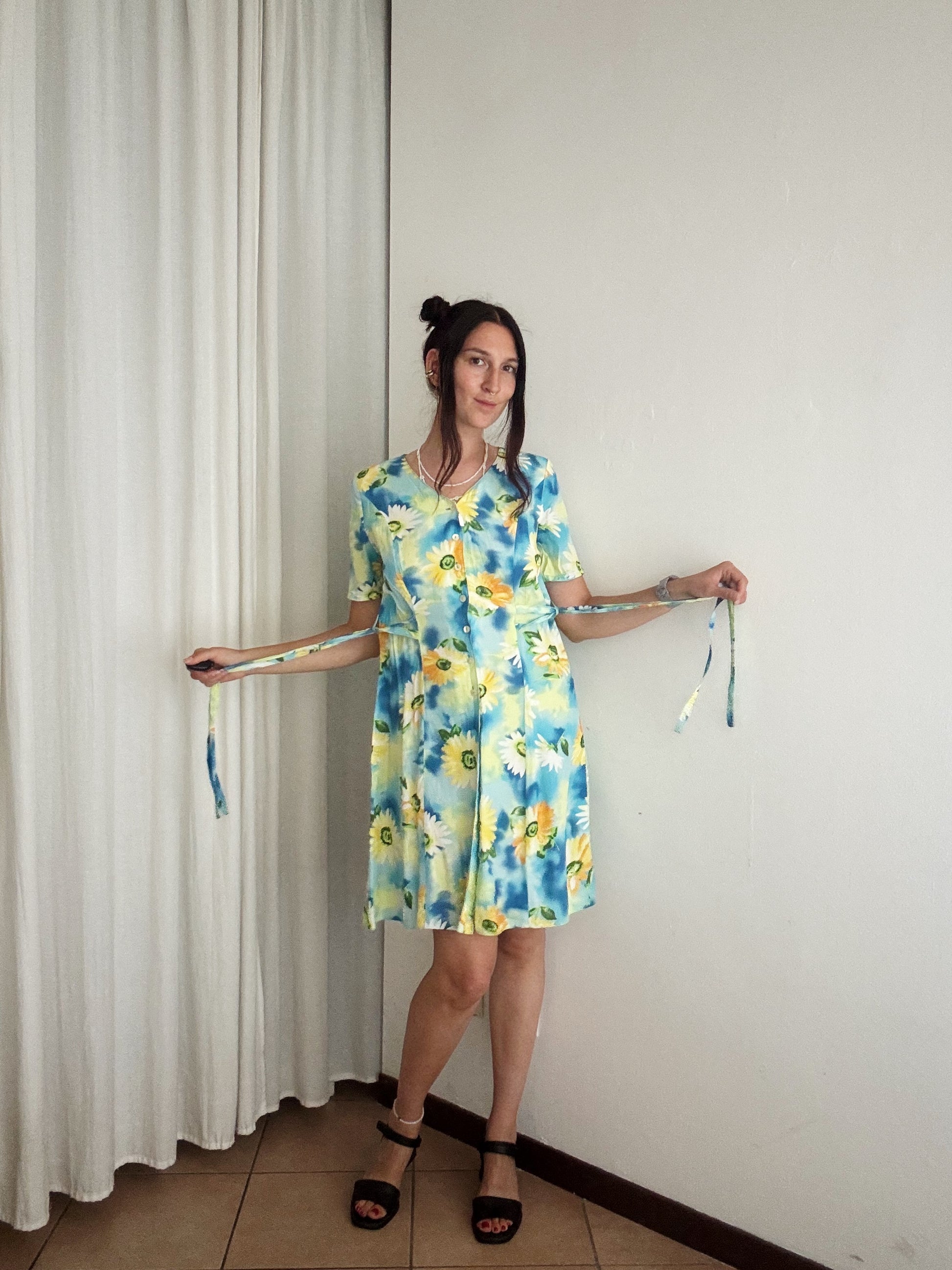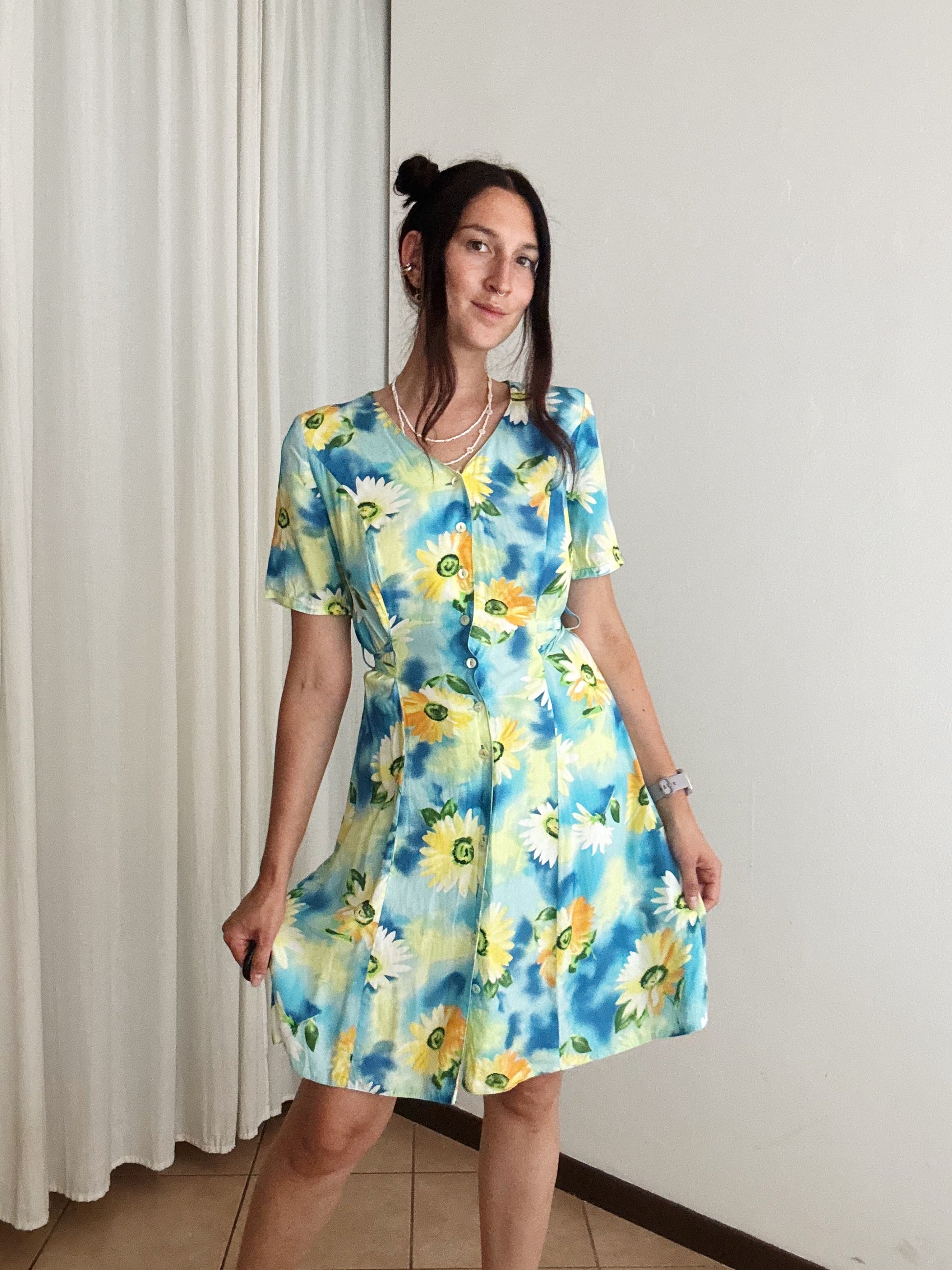 Abito vintage azzurro verde e giallo con girasoli. Veste taglia L. Misure: spalle 40, ascelle 50, punto vita 52, fianchi circa 60, lunghezza 97. In fresca viscosa