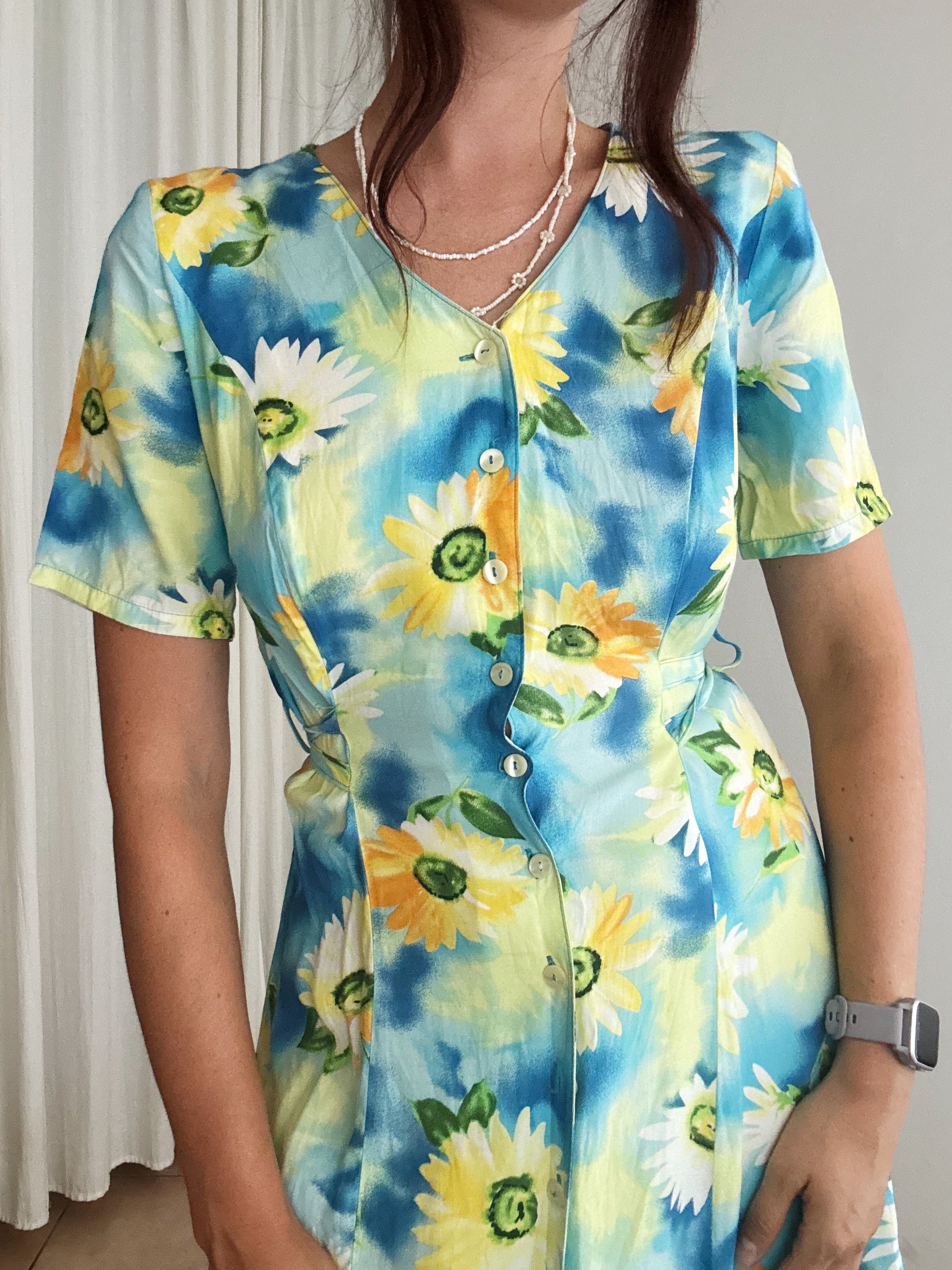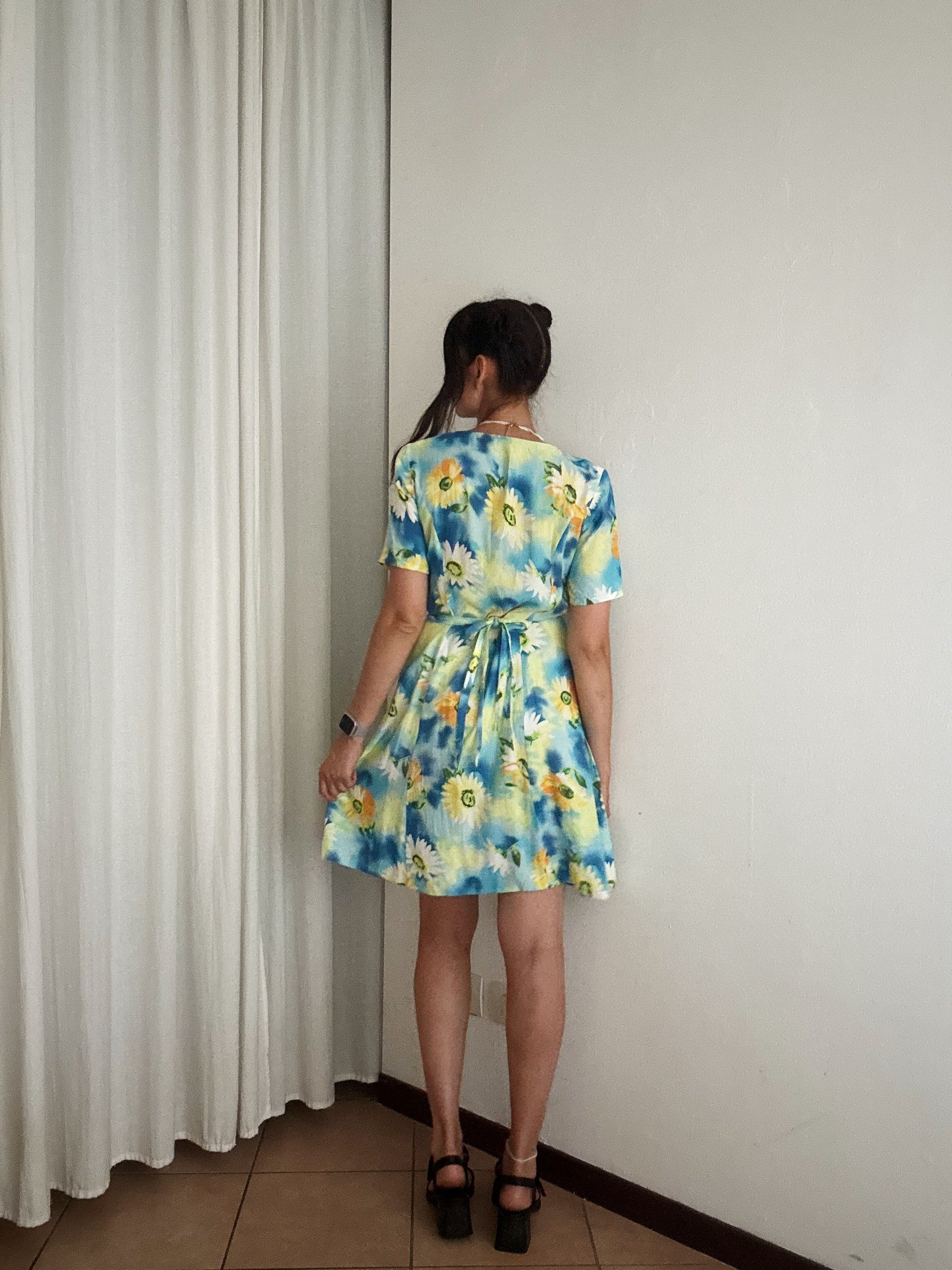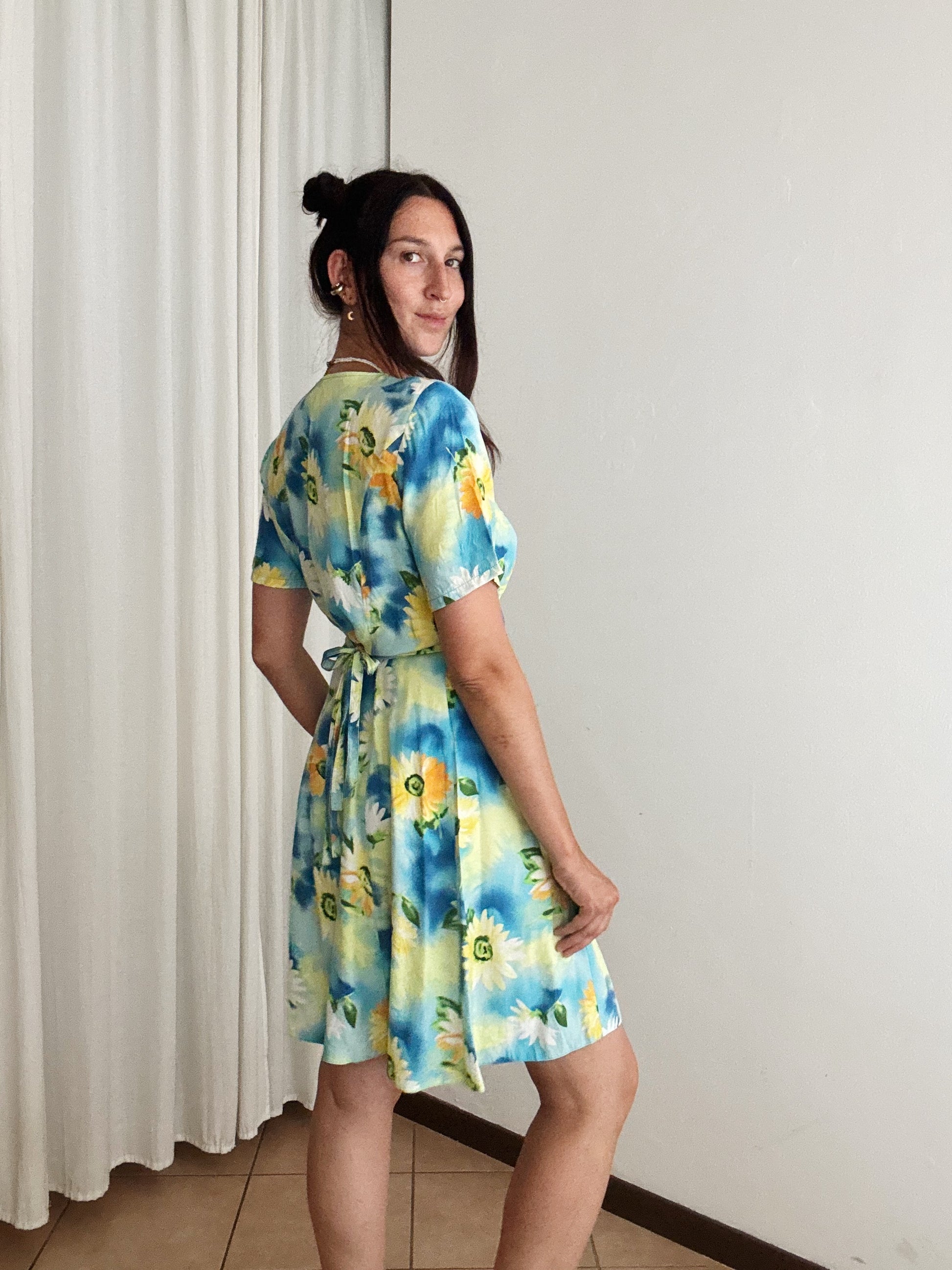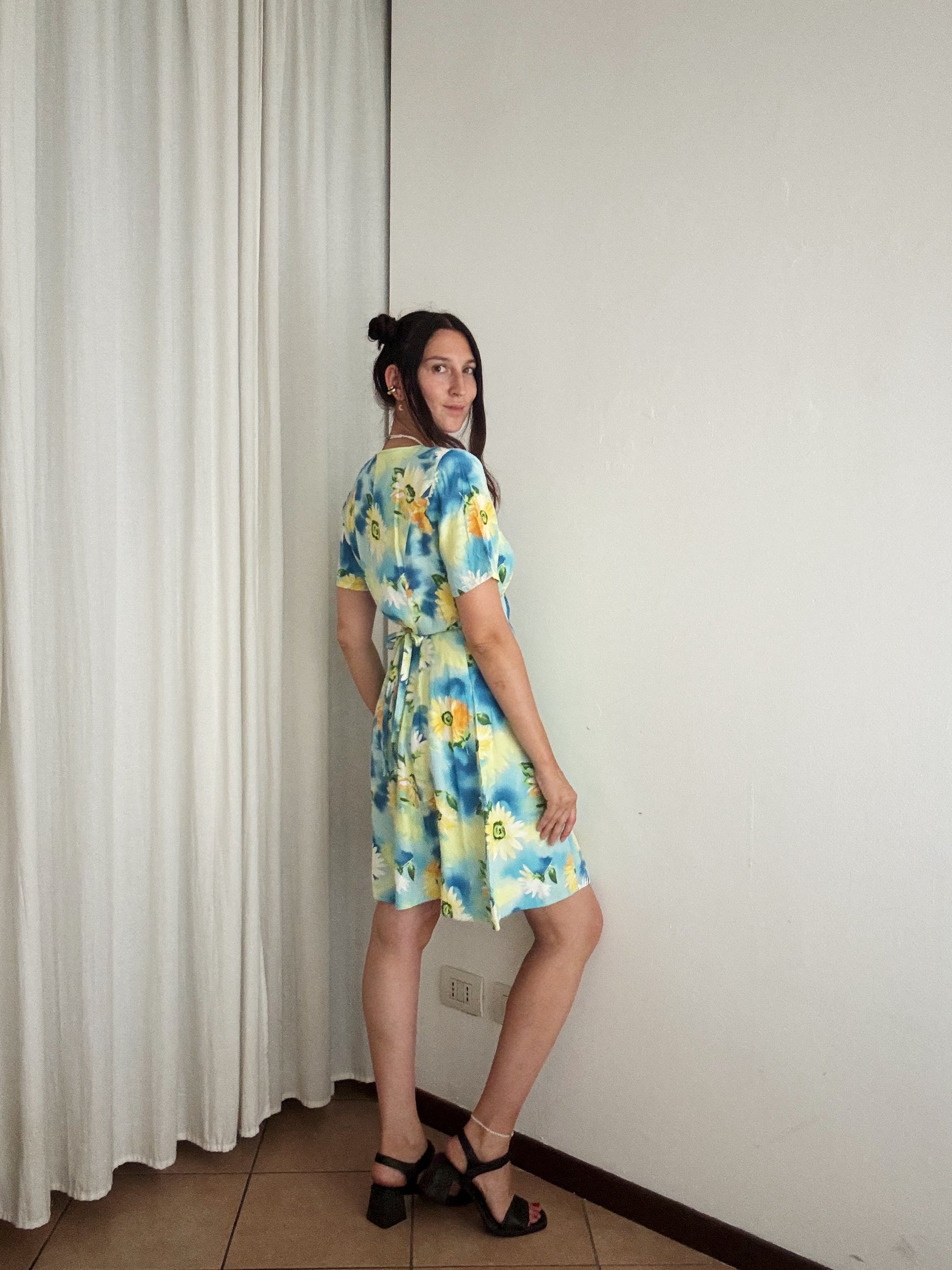 Abito vintage azzurro verde e giallo con girasoli. Veste taglia L. Misure: spalle 40, ascelle 50, punto vita 52, fianchi circa 60, lunghezza 97. In fresca viscosa