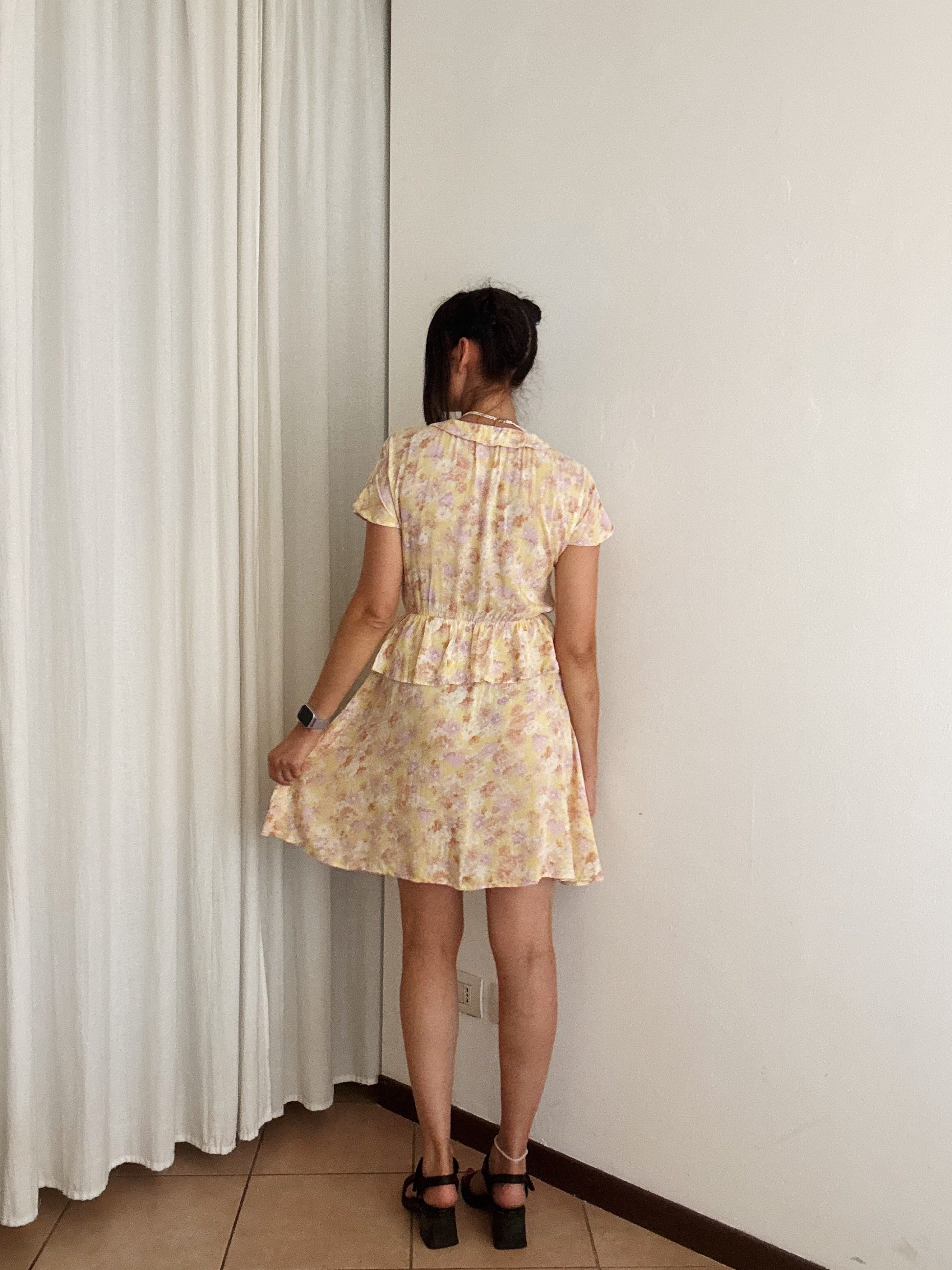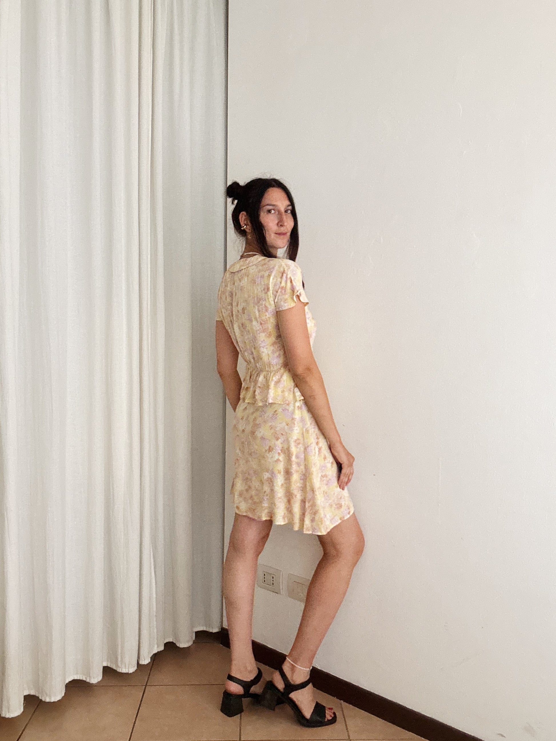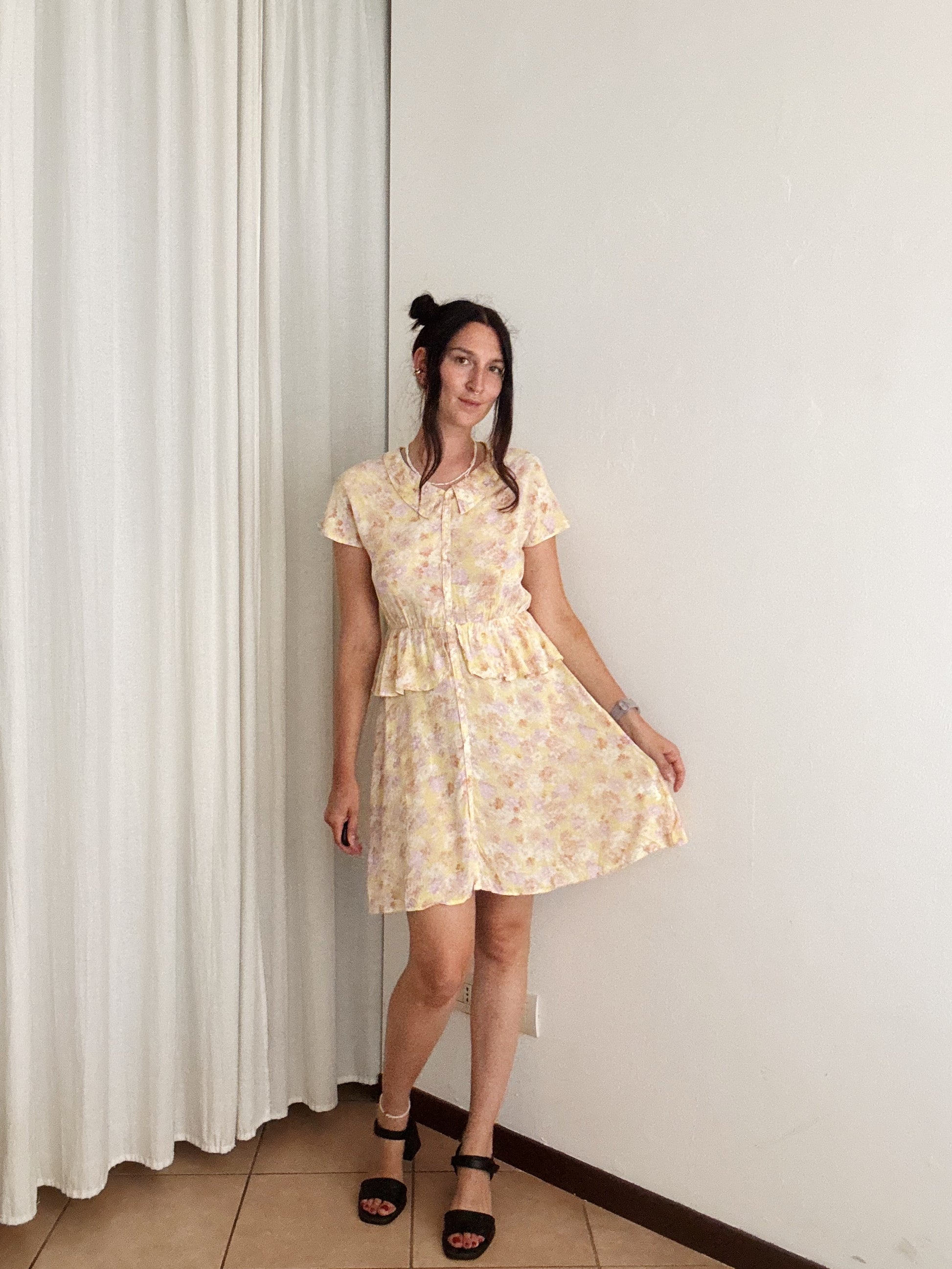 Abito vintage giallino con fila di bottoni centrali. Veste taglia 40/42. Misure: ascelle 45, punto vita 35, lunghezza 92. In fresca viscosa