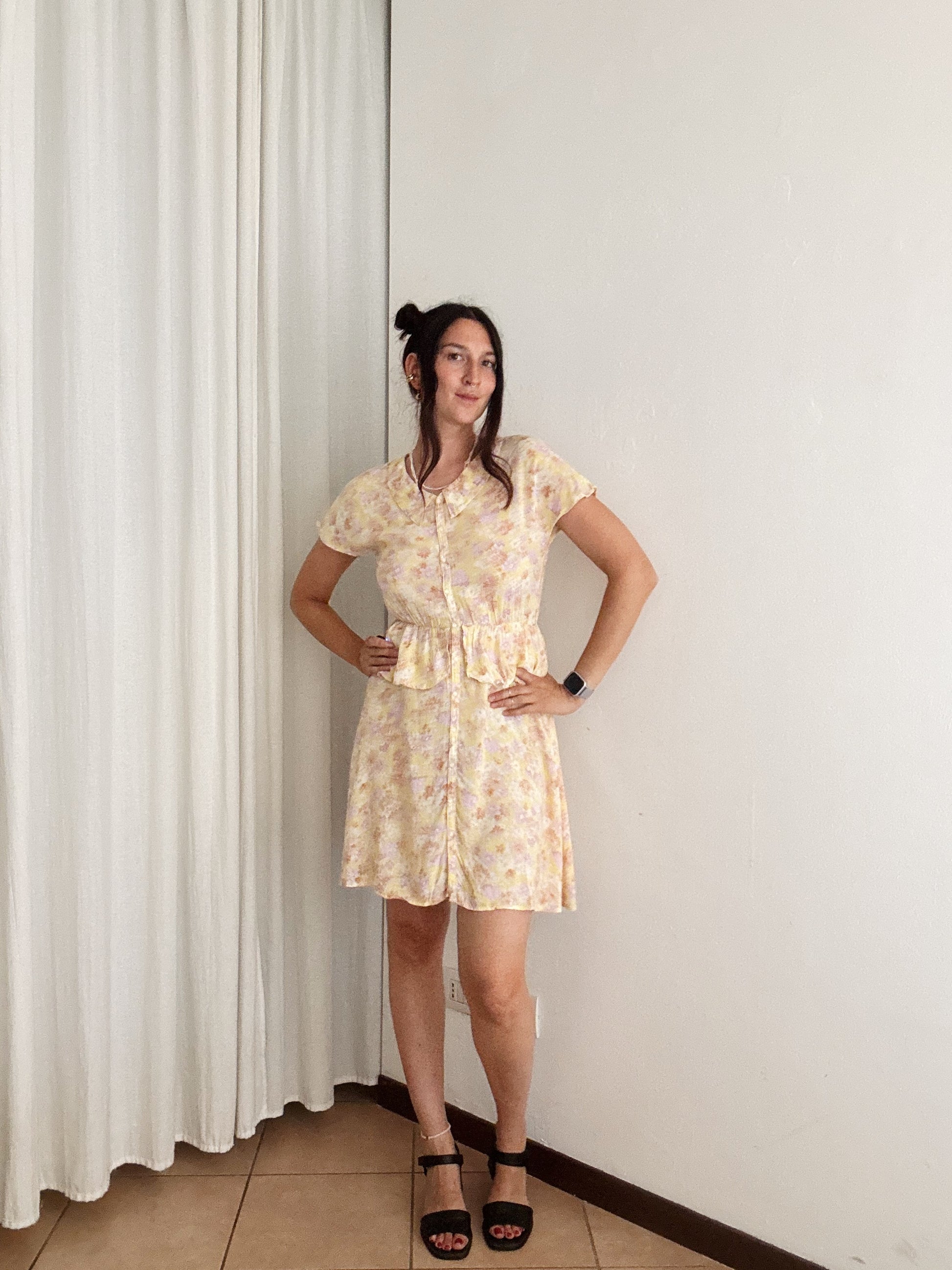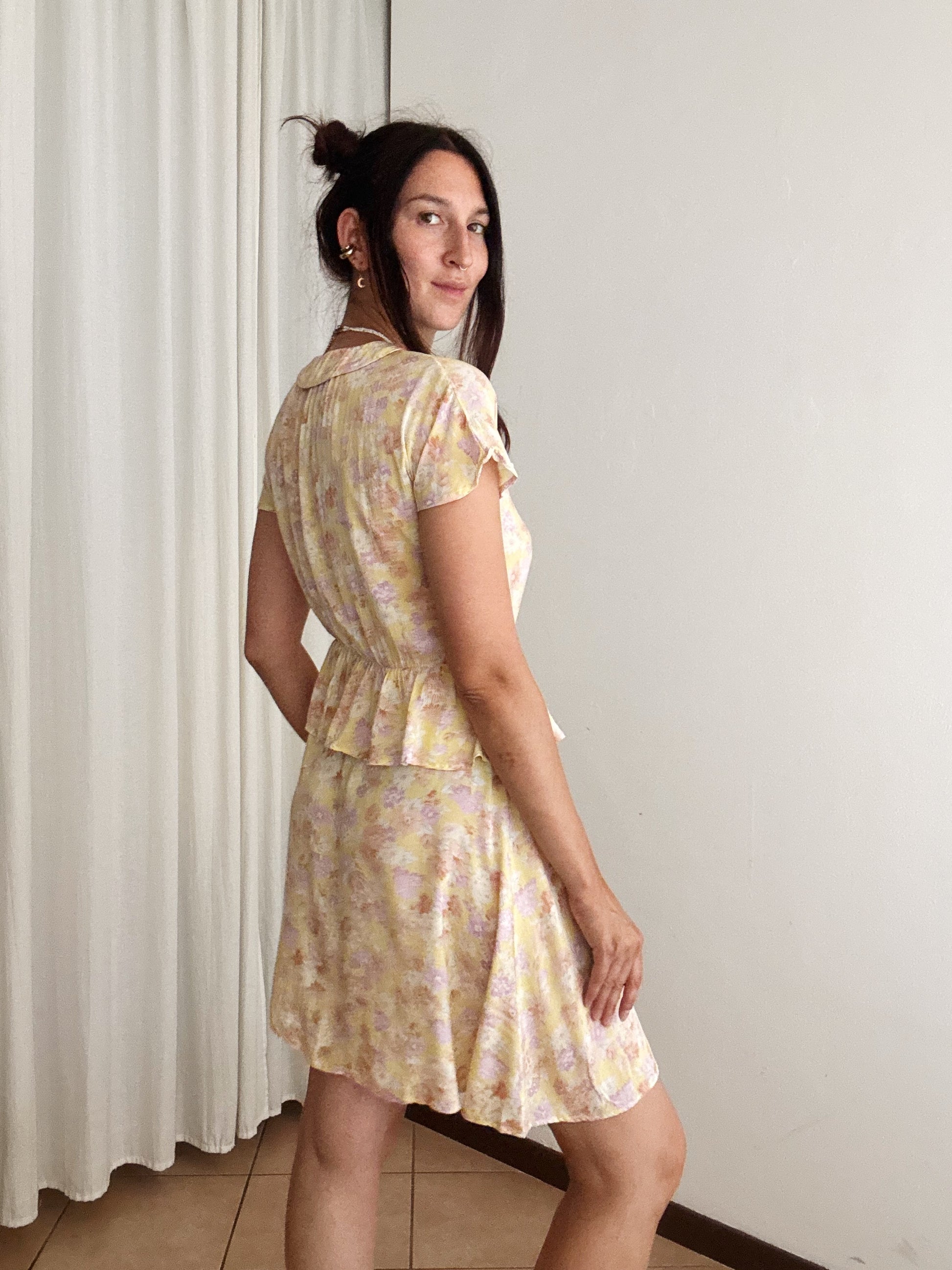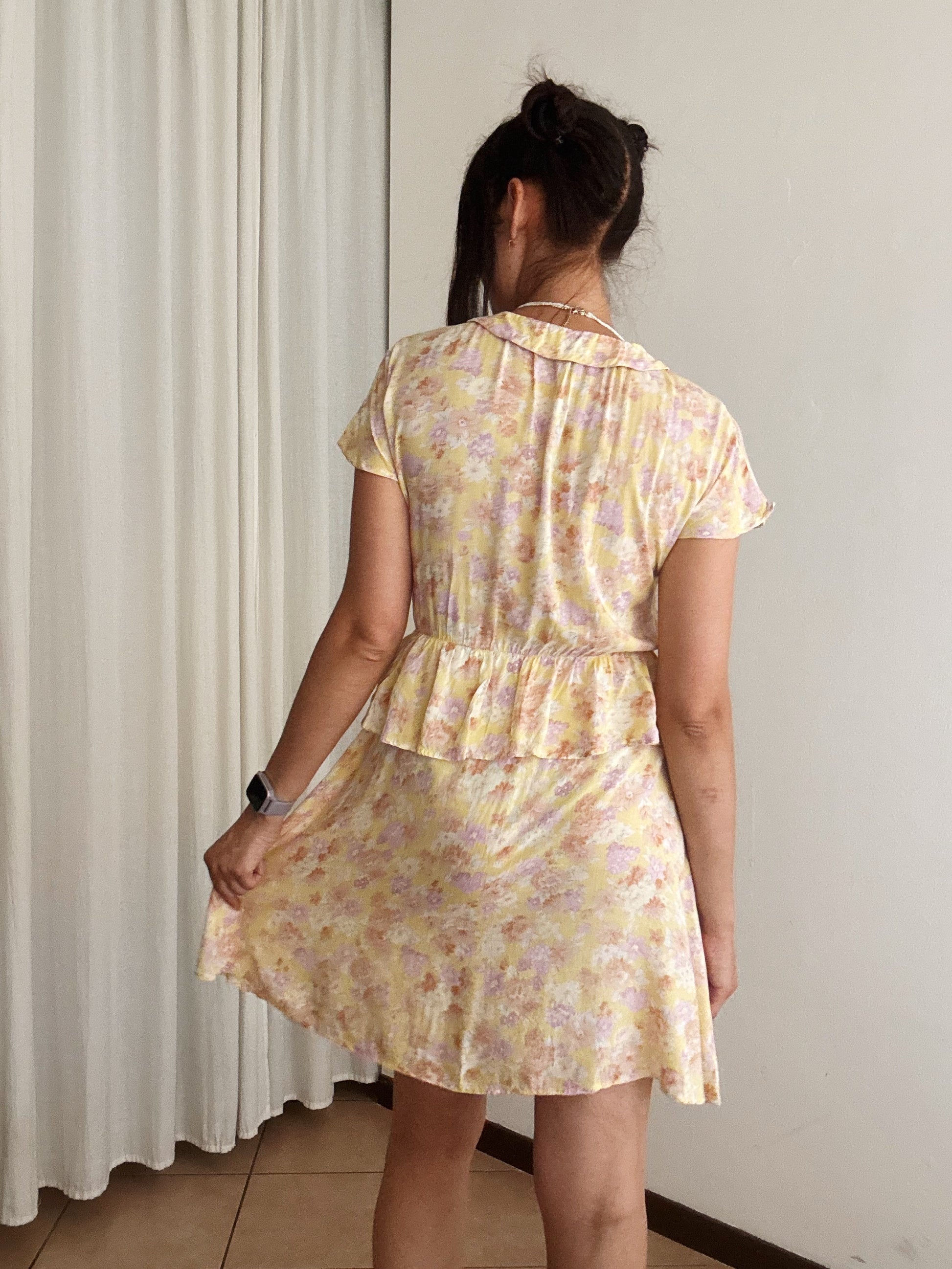 Abito vintage giallino con fila di bottoni centrali. Veste taglia 40/42. Misure: ascelle 45, punto vita 35, lunghezza 92. In fresca viscosa