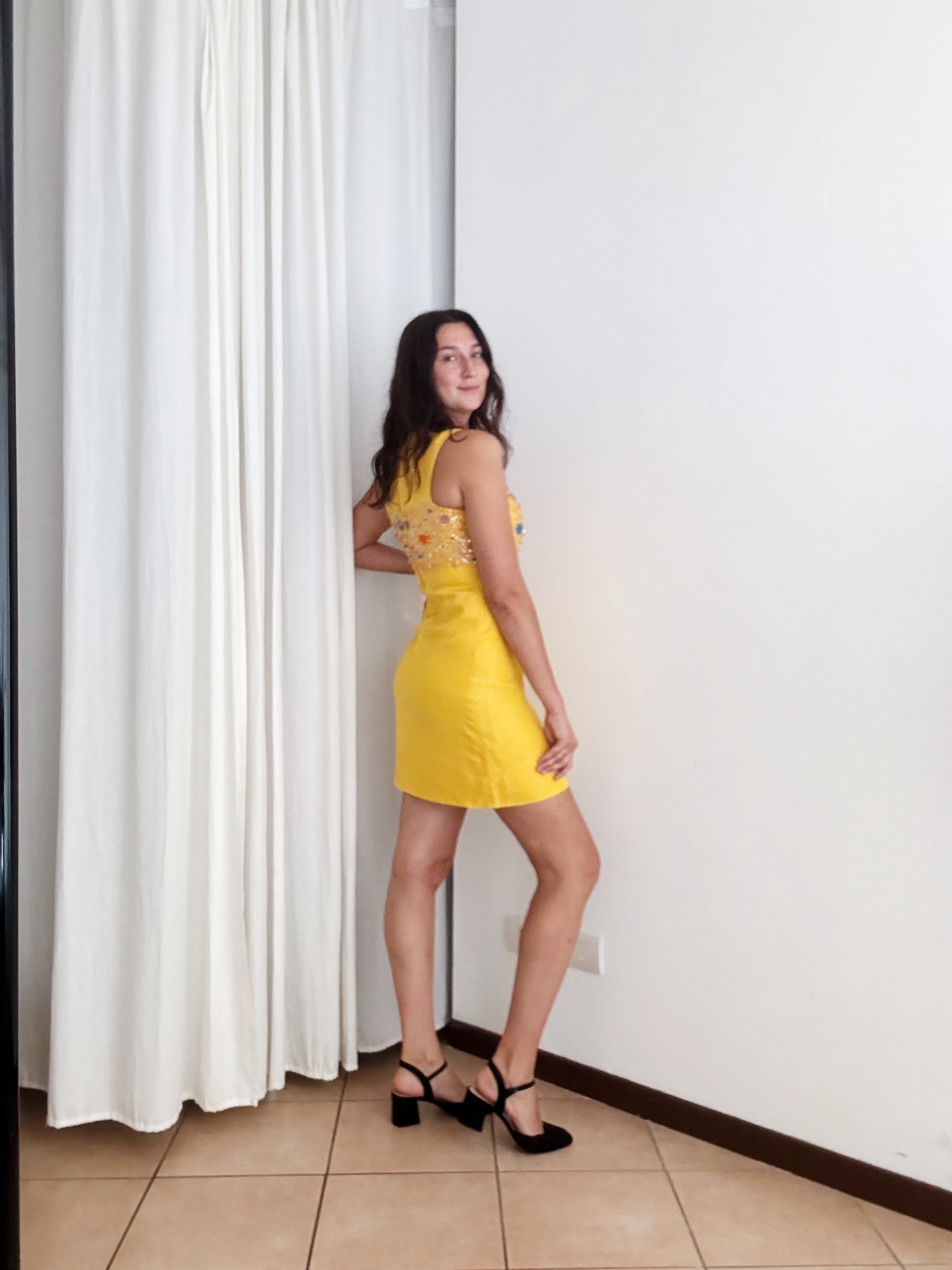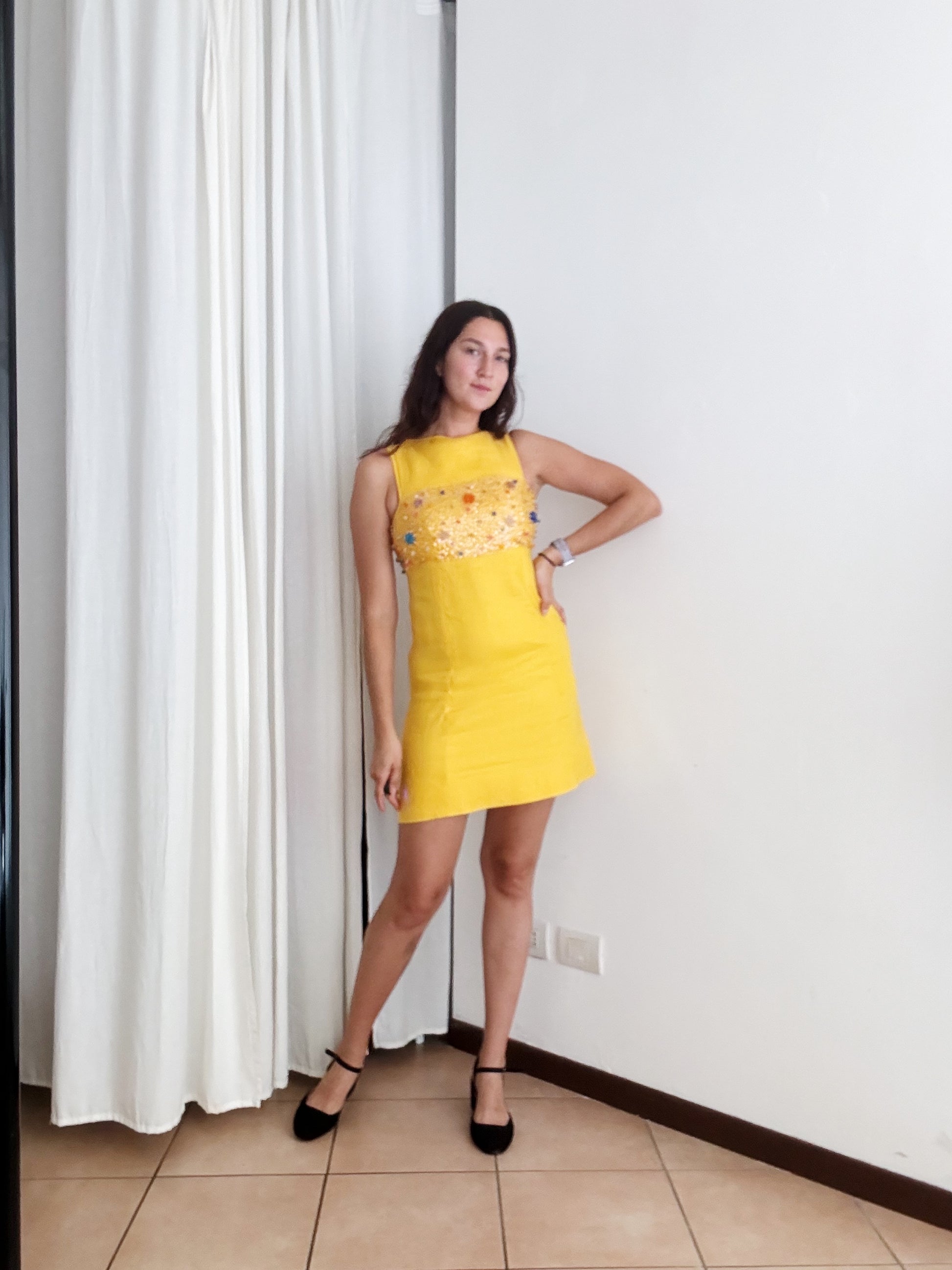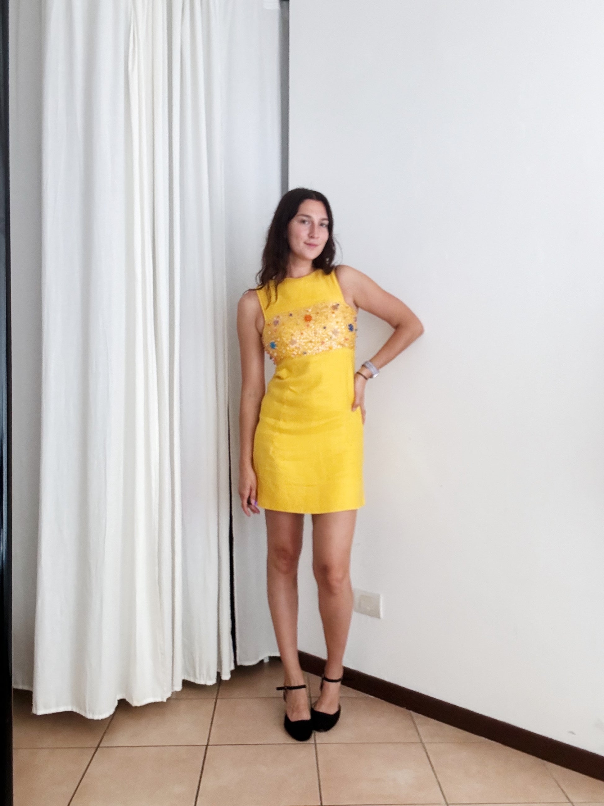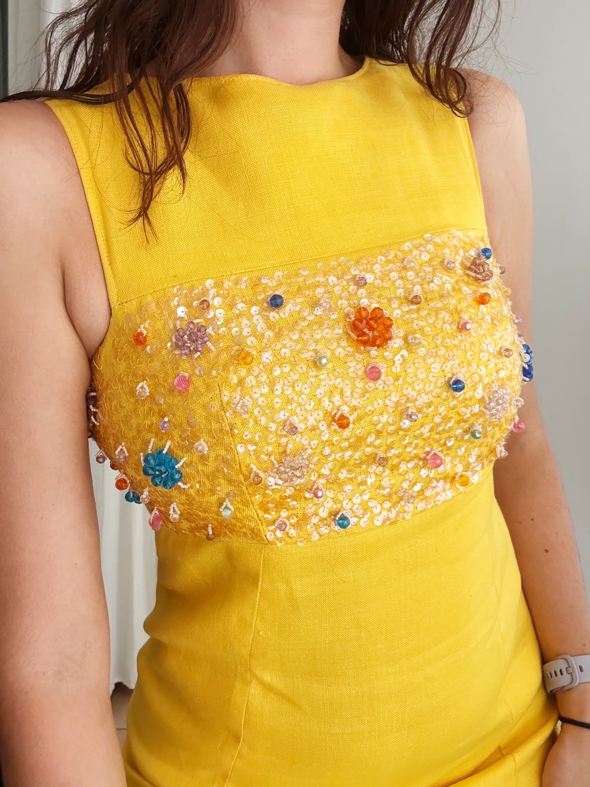Abito vintage sartoriale giallo con perline e paillettes. Taglia 42 in puro lino. Misure: ascelle 42, vita 38, fianchi circa 48, lunghezza 86.