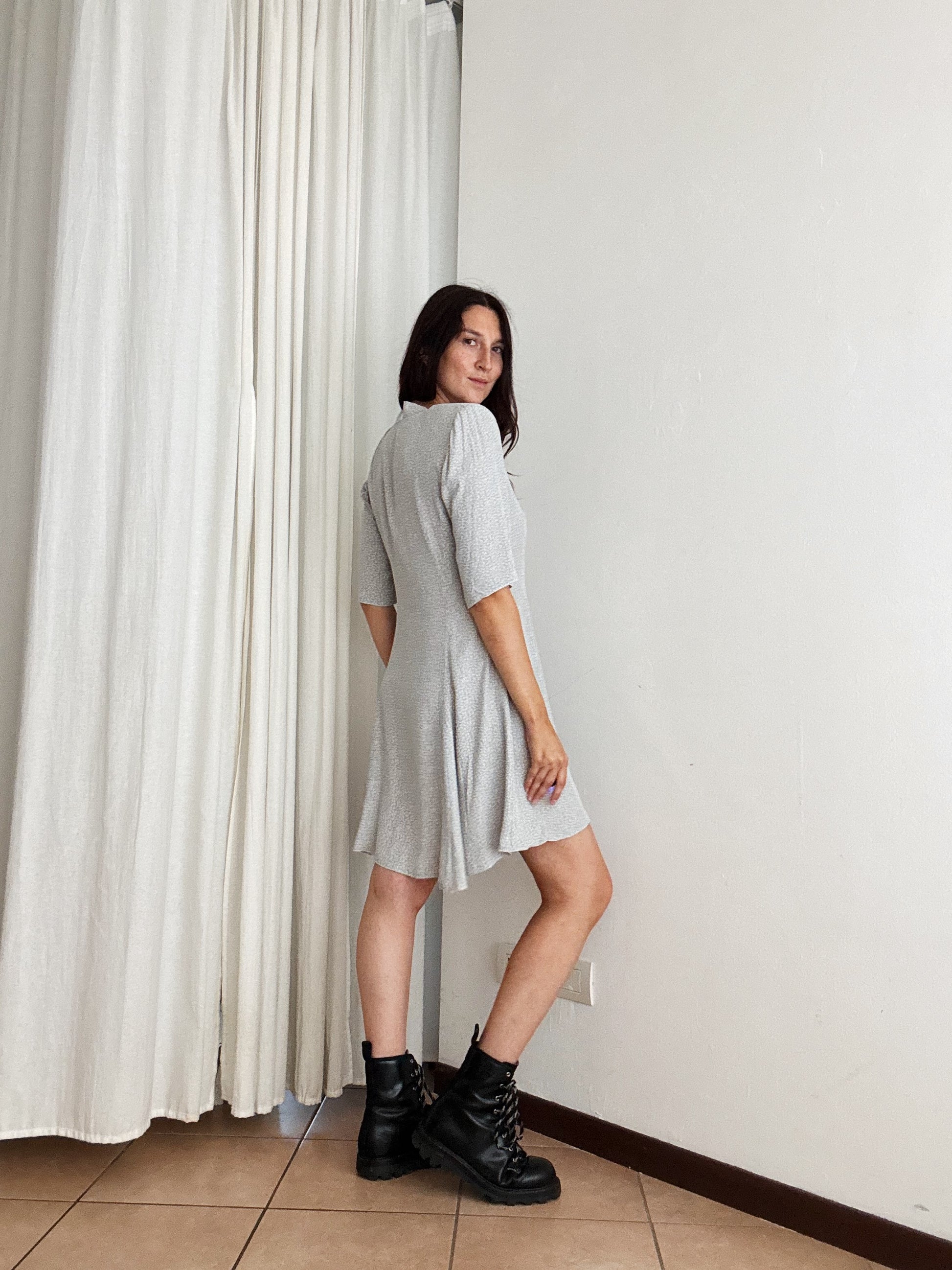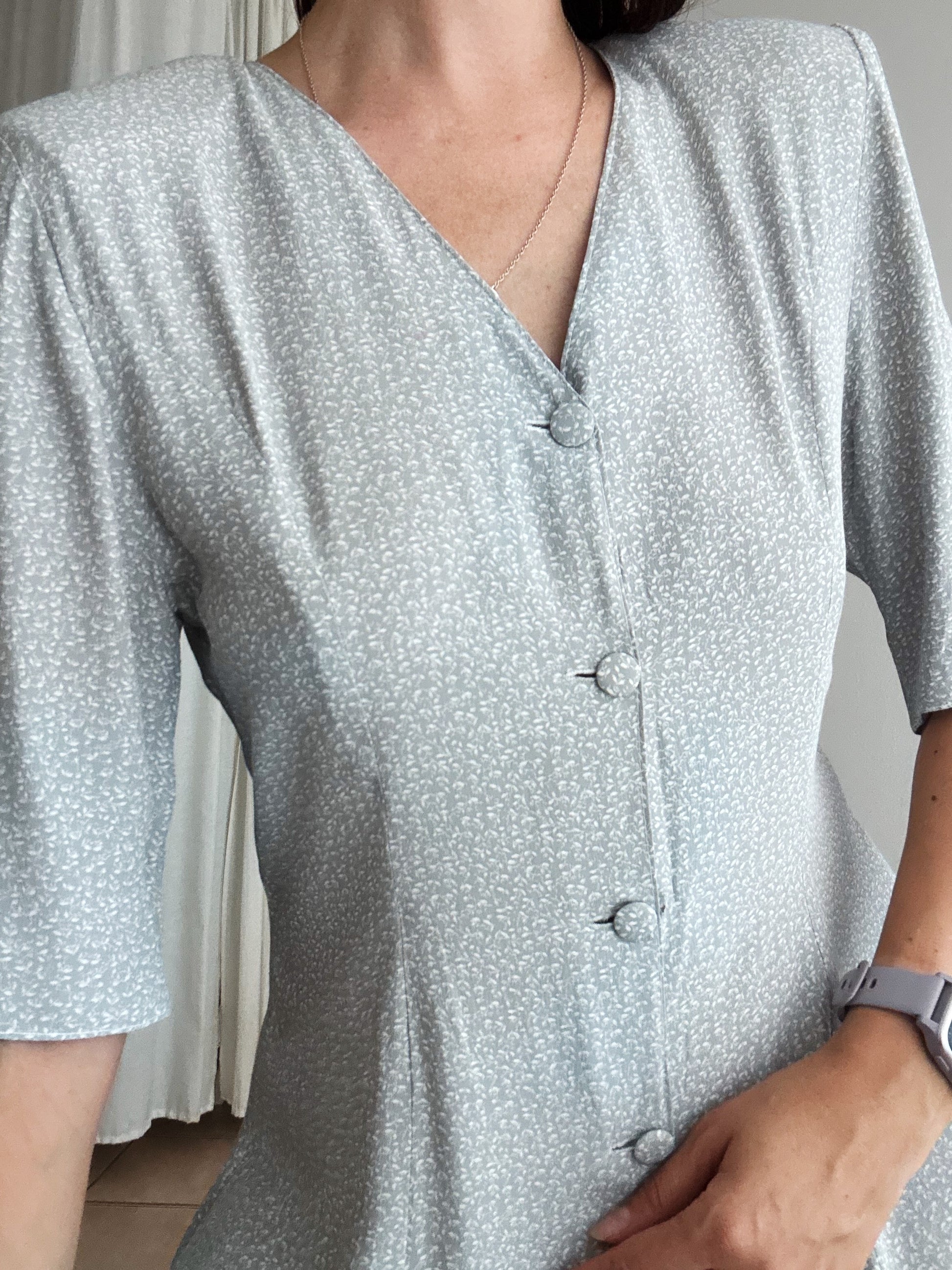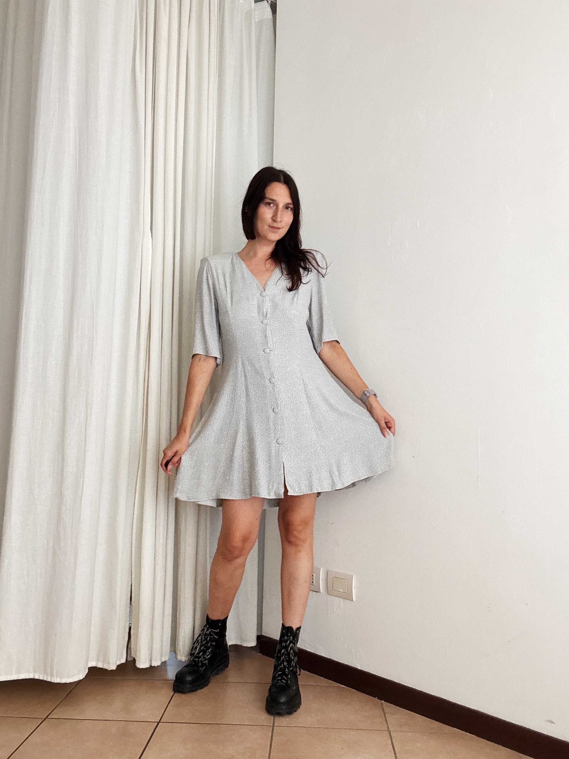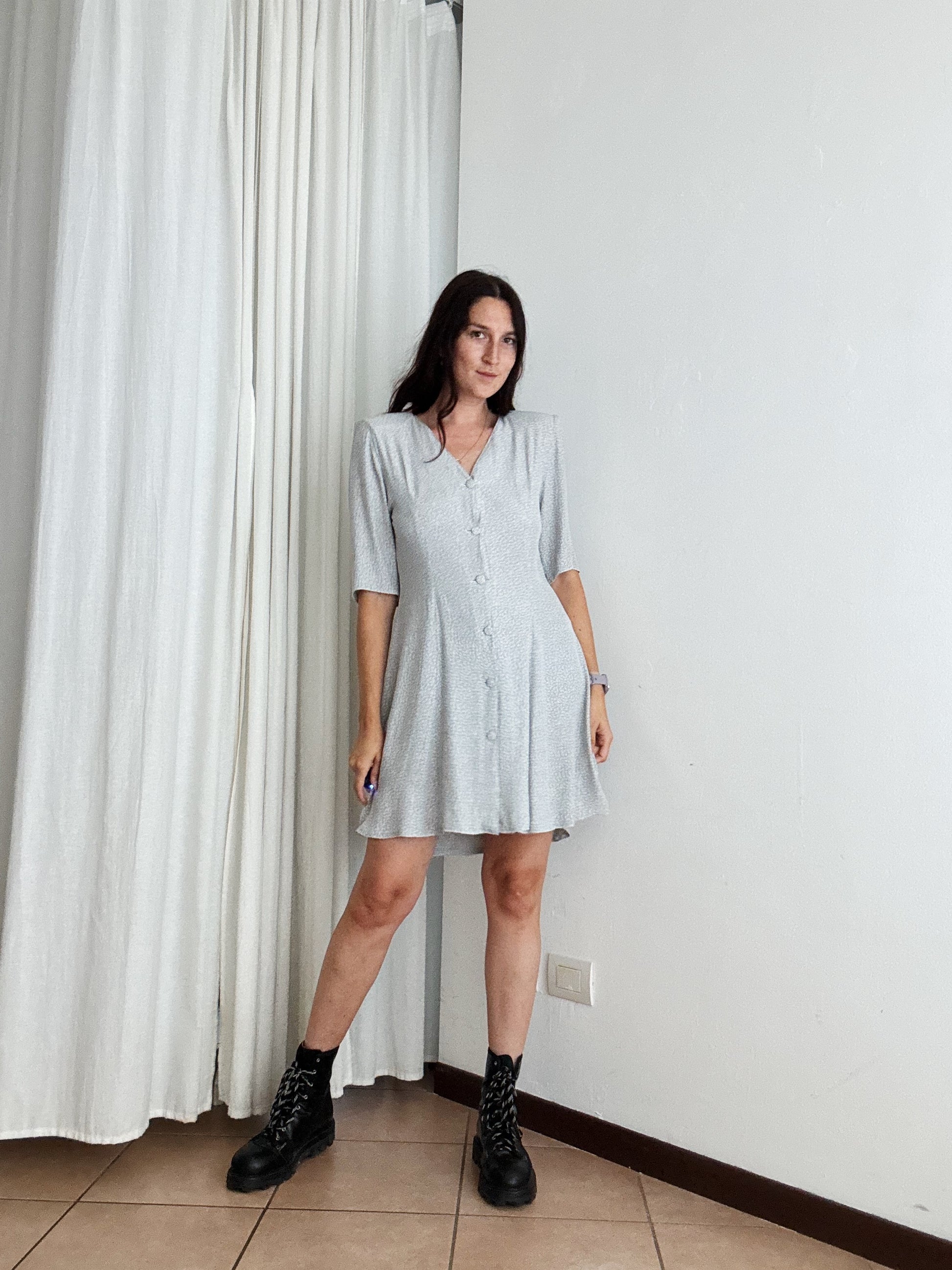 Abito vintage grigino con fiorellini, taglia M. Fila di bottoni davanti. Misure: spalle 41, ascelle 49, vita 42, lunghezza 90