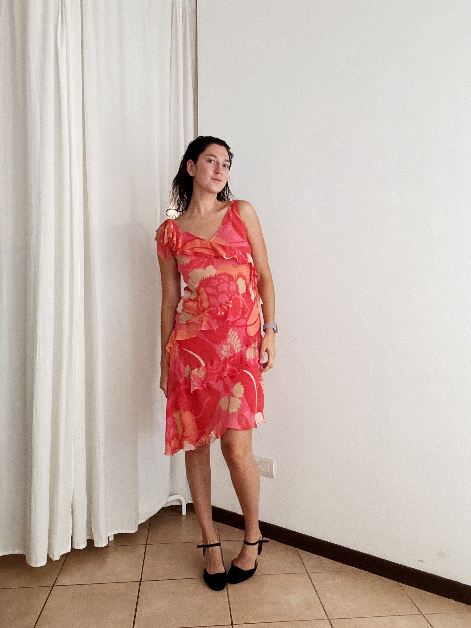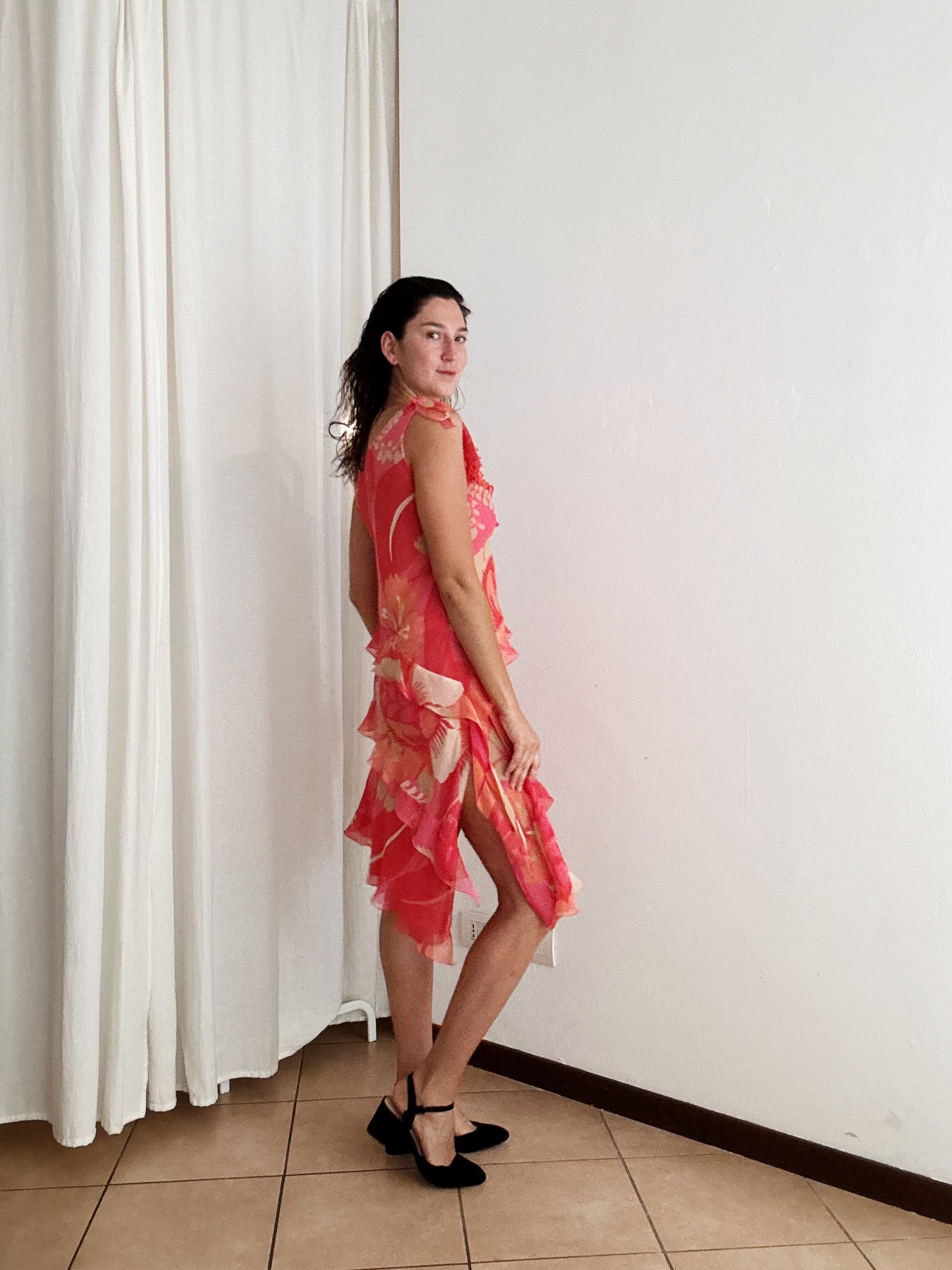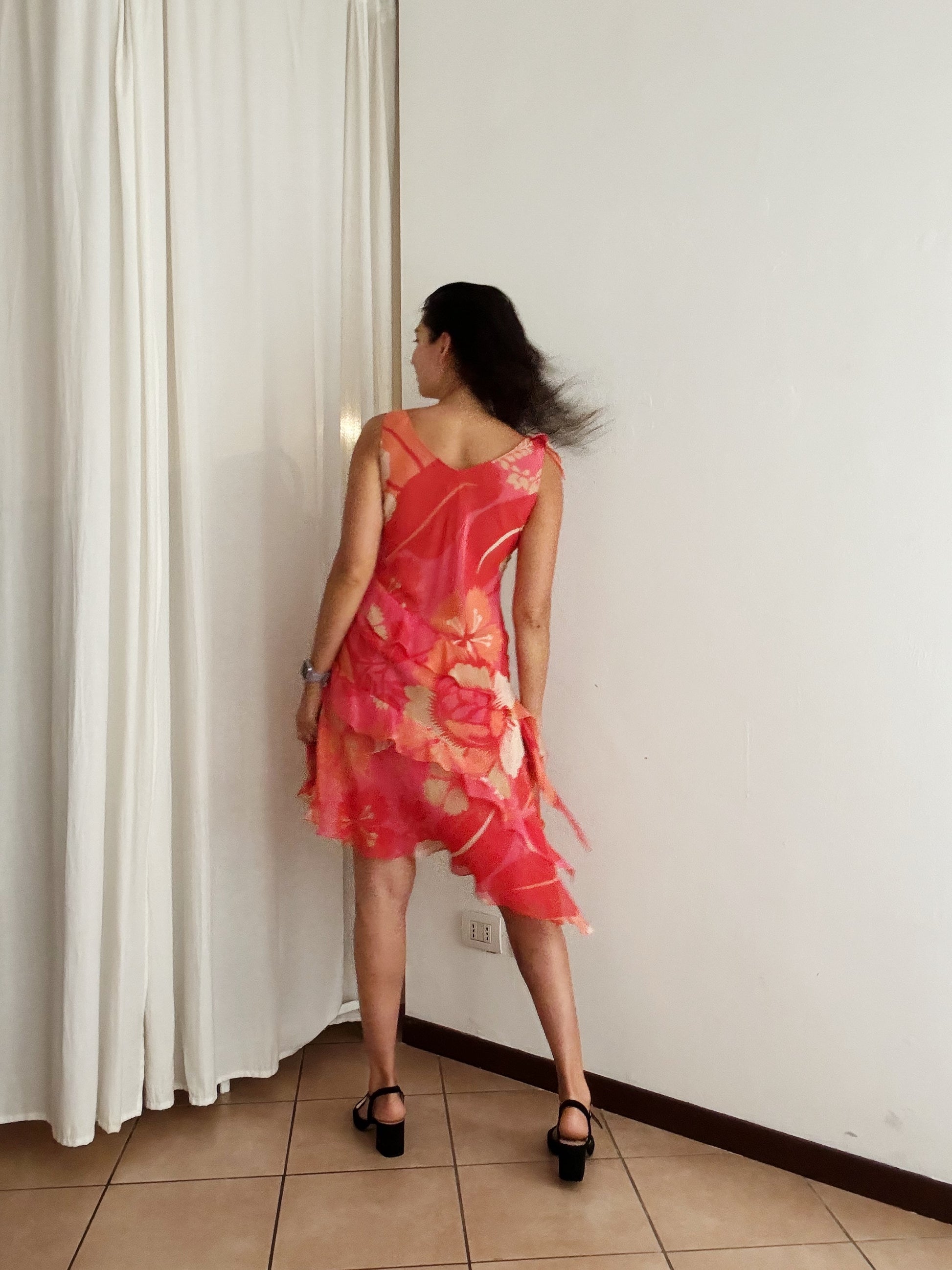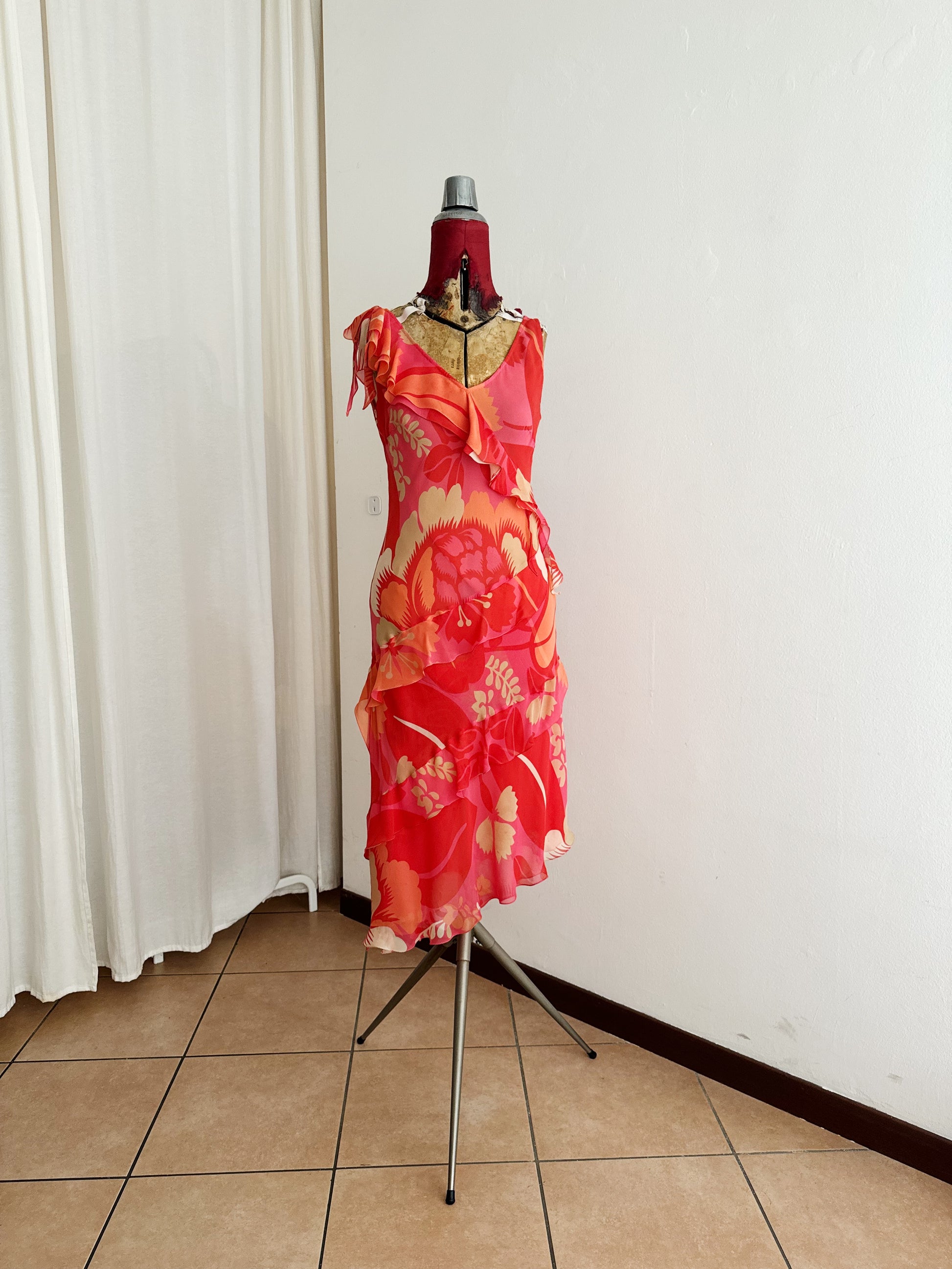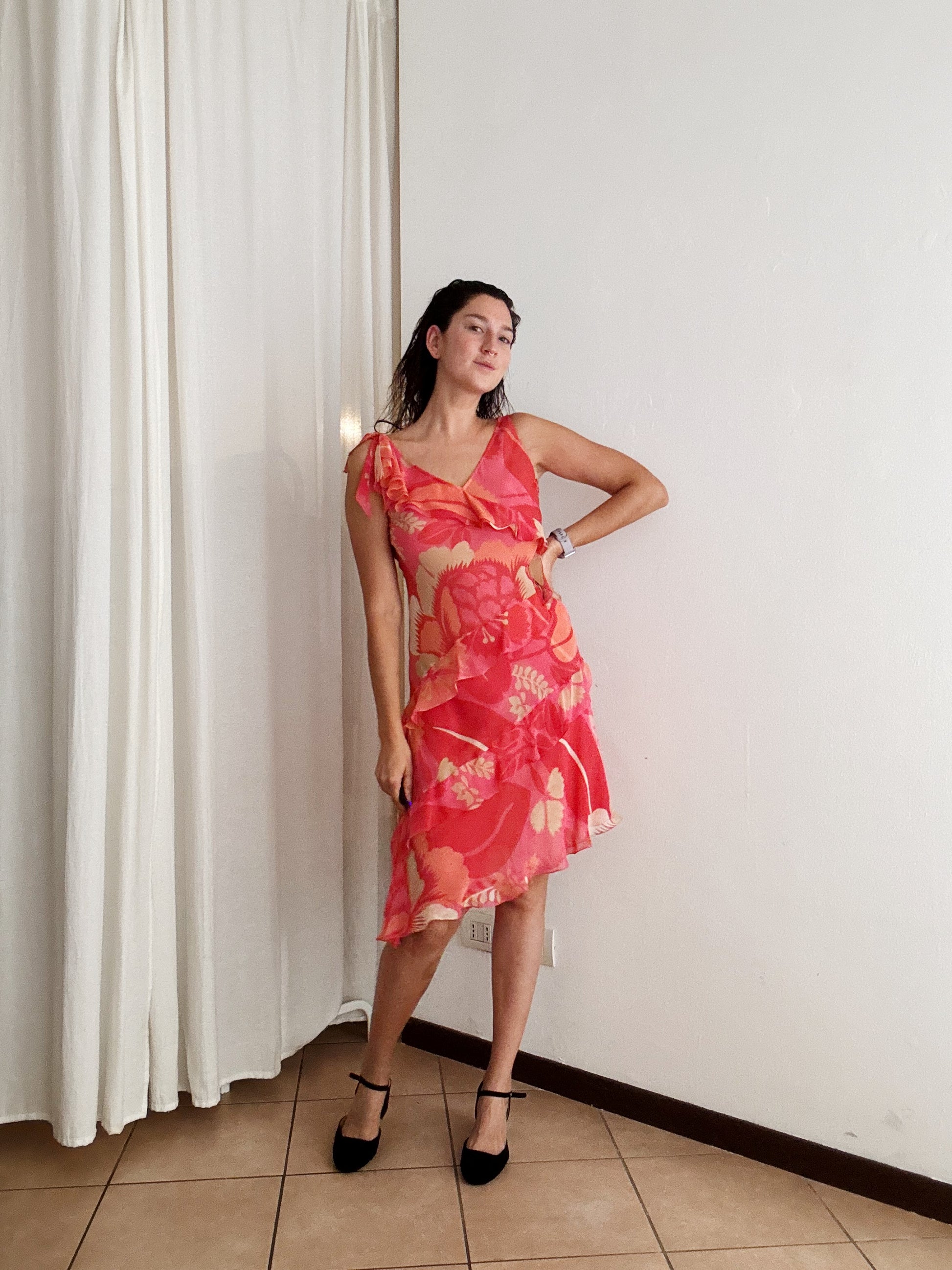 Abito firmato Laurel in 100% seta color corallo con stampa floreale e rouches. Taglio asimmetrico con spacchi laterali. Taglia 38 ma veste bene anche una 40.
