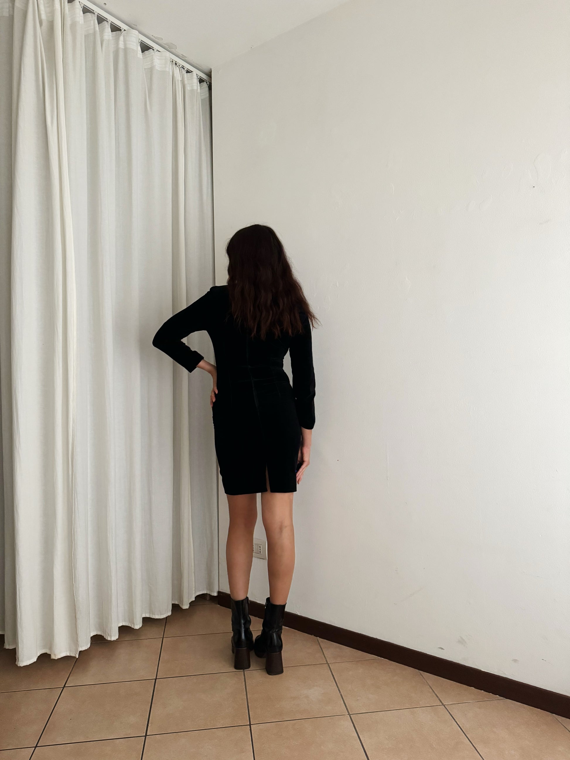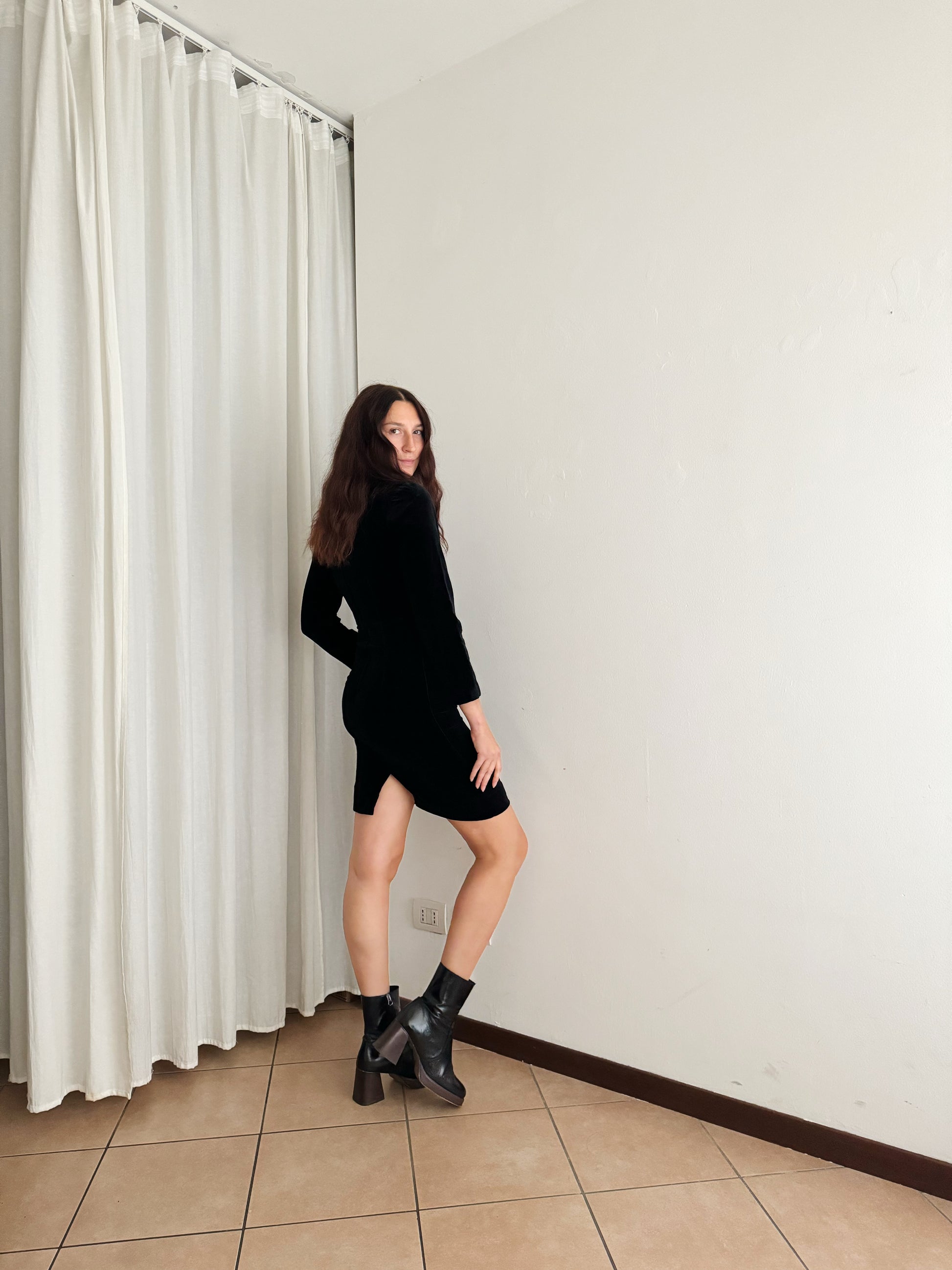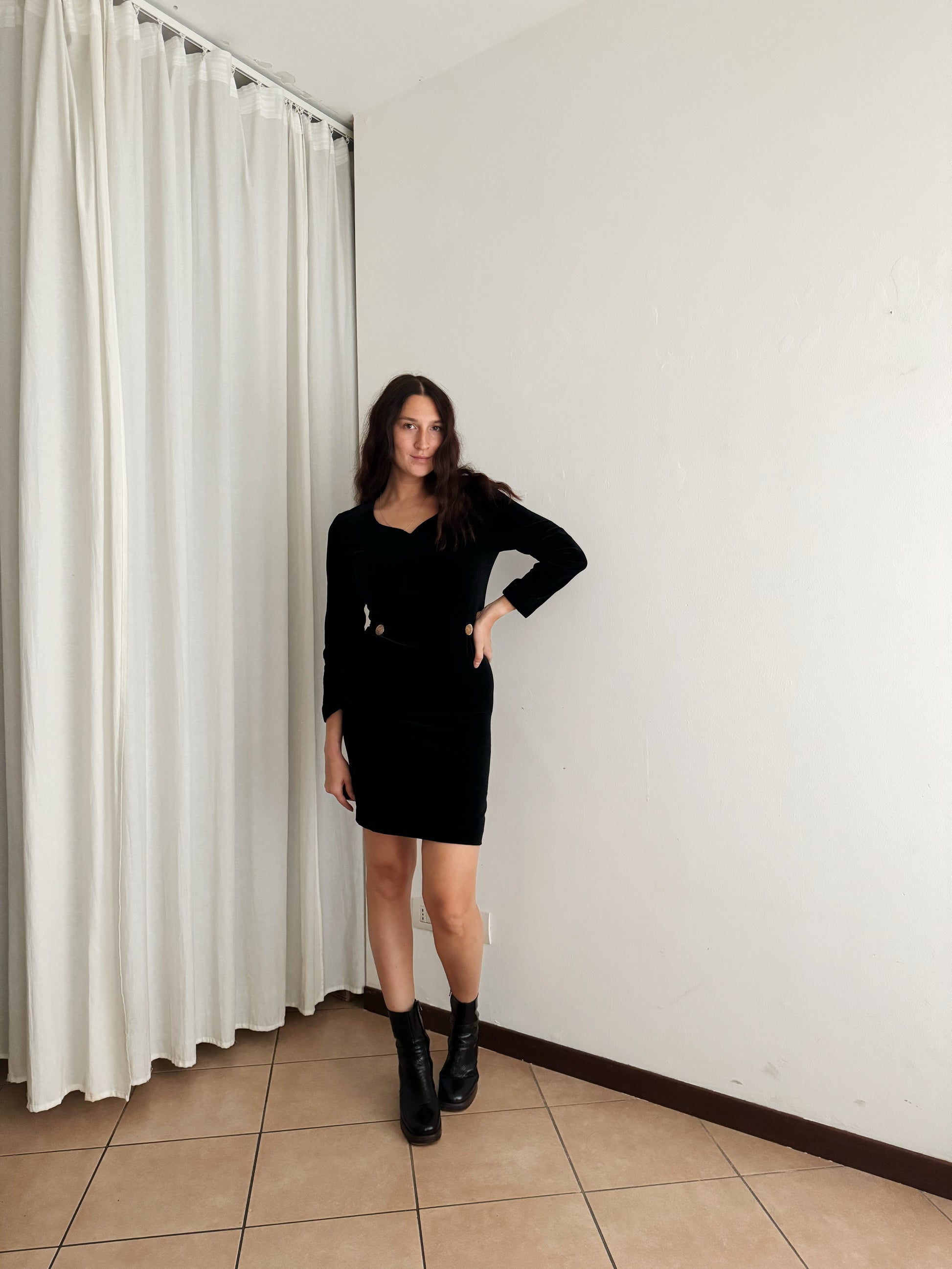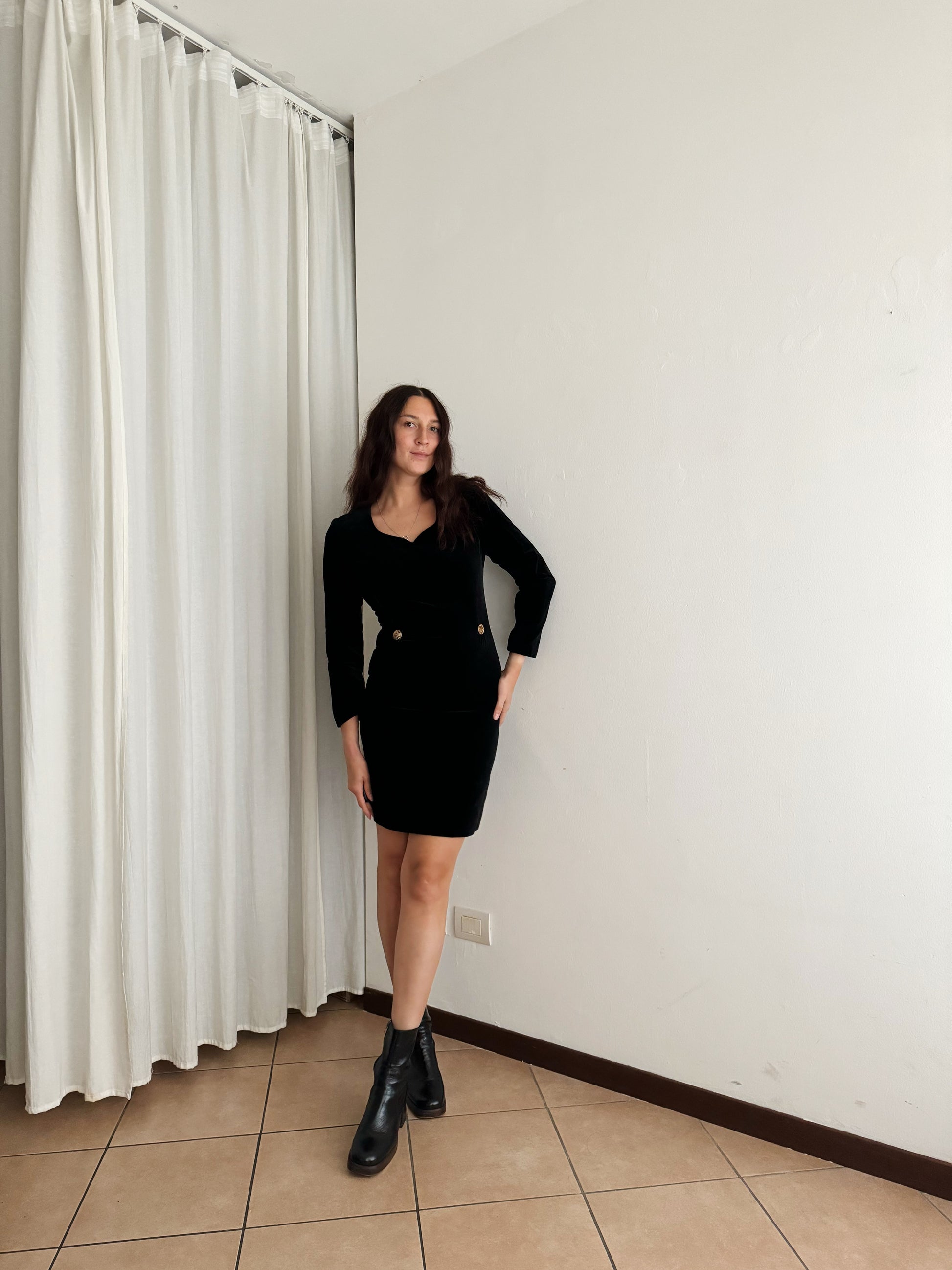 Abito vintage in velluto nero a manica lunga con scollo a cuore, bottoni gioiello dorati, taglia 40. Misure: spalle 40, ascelle 46, maniche 54, vita 37, fianchi circa 45, lunghezza 92.