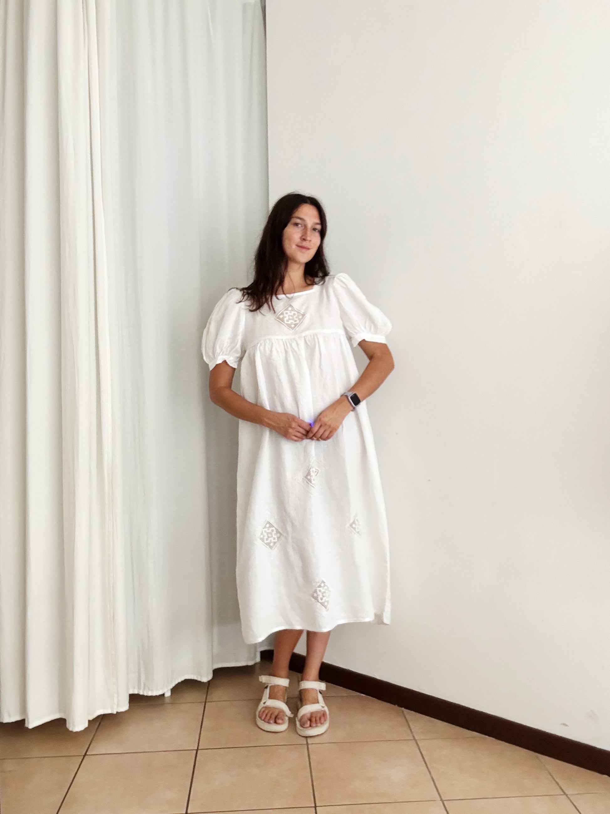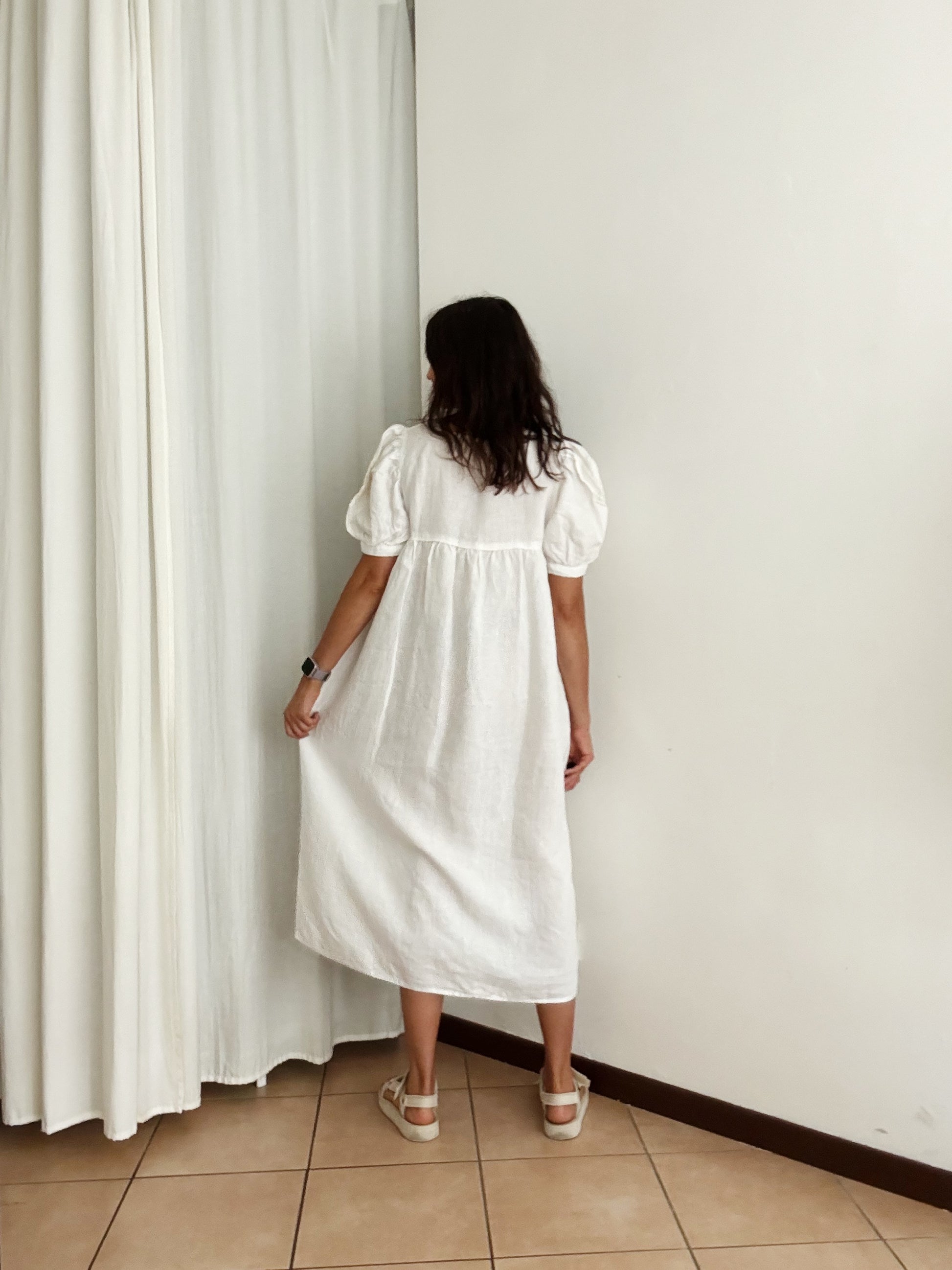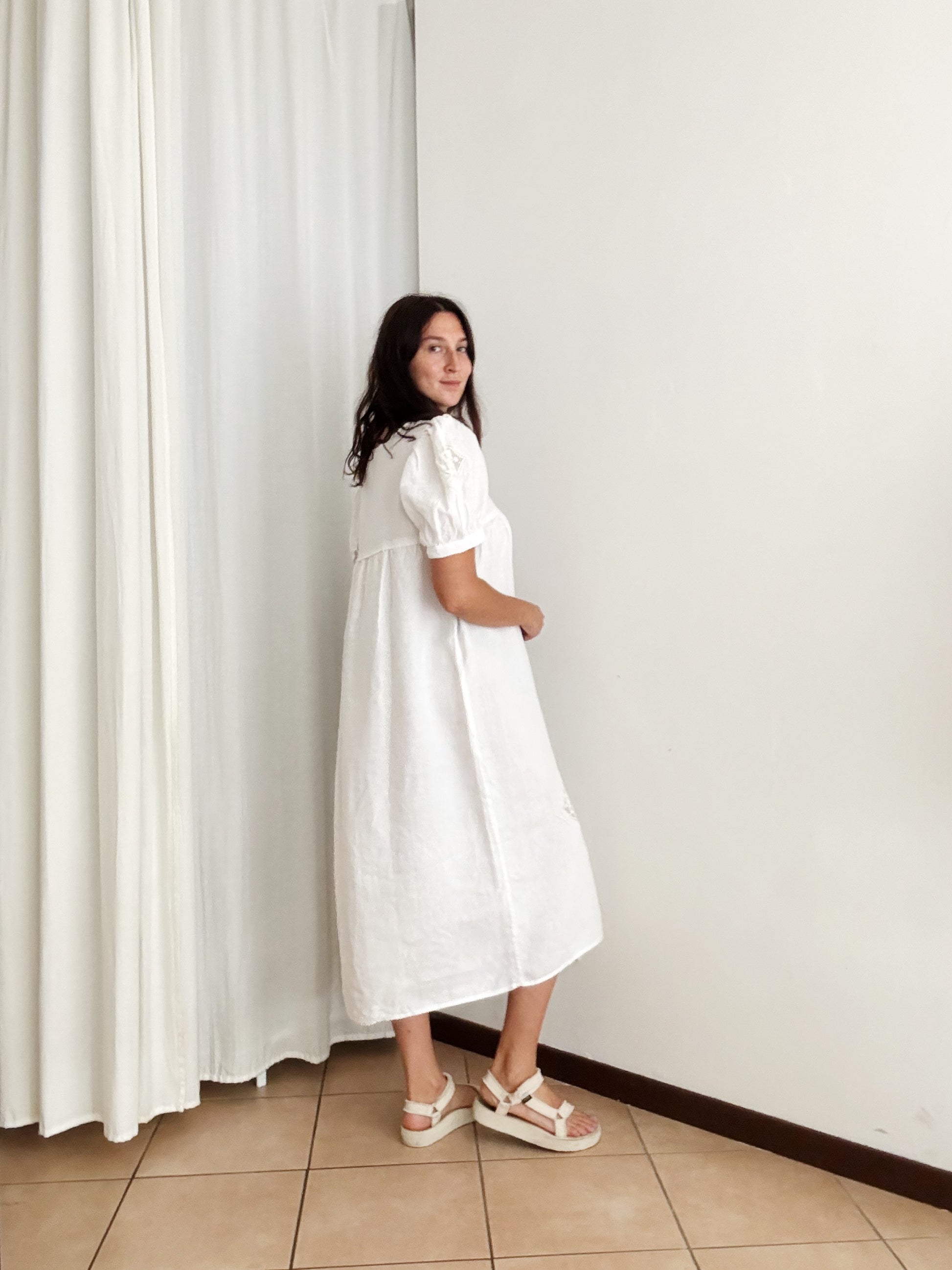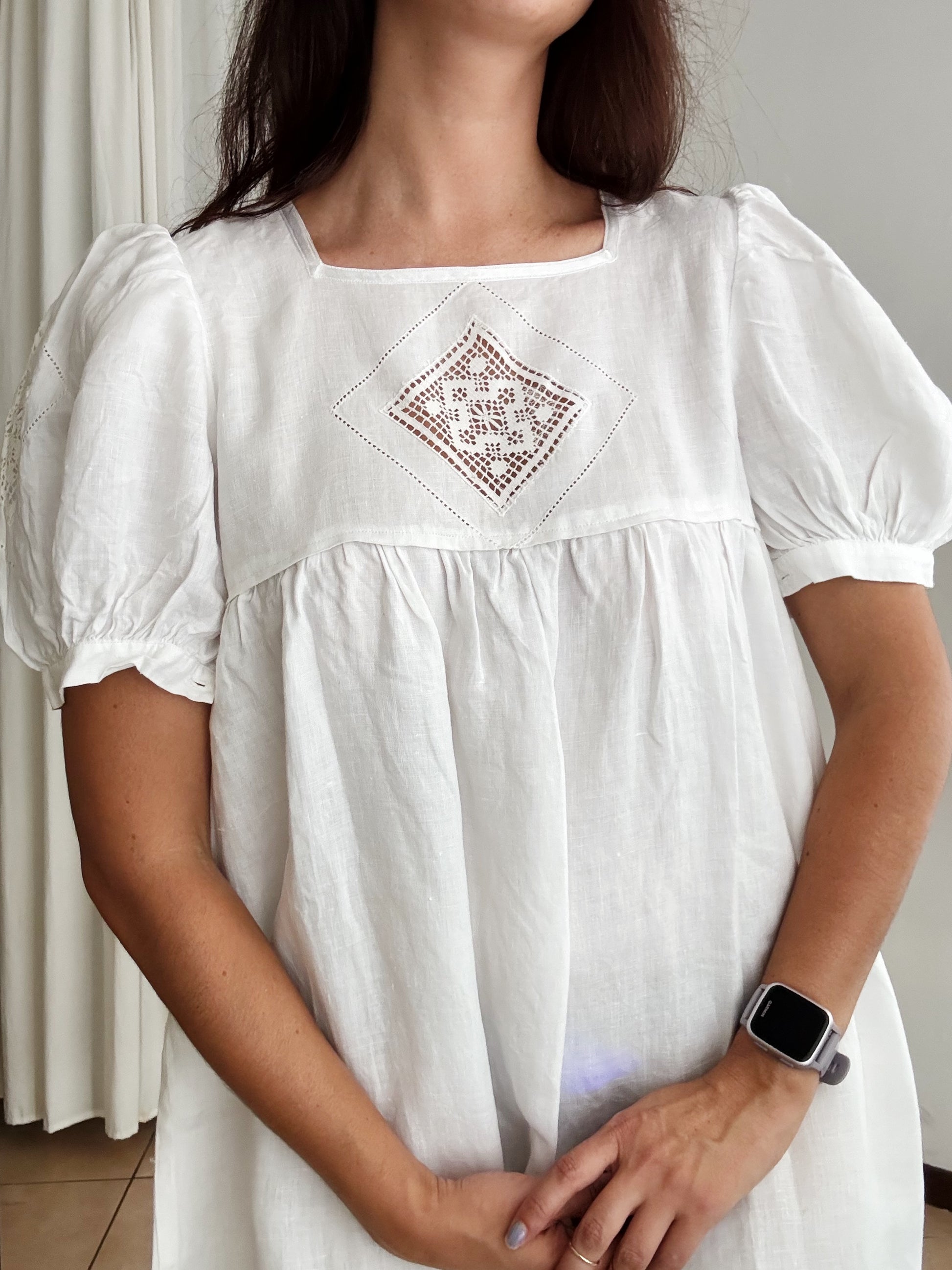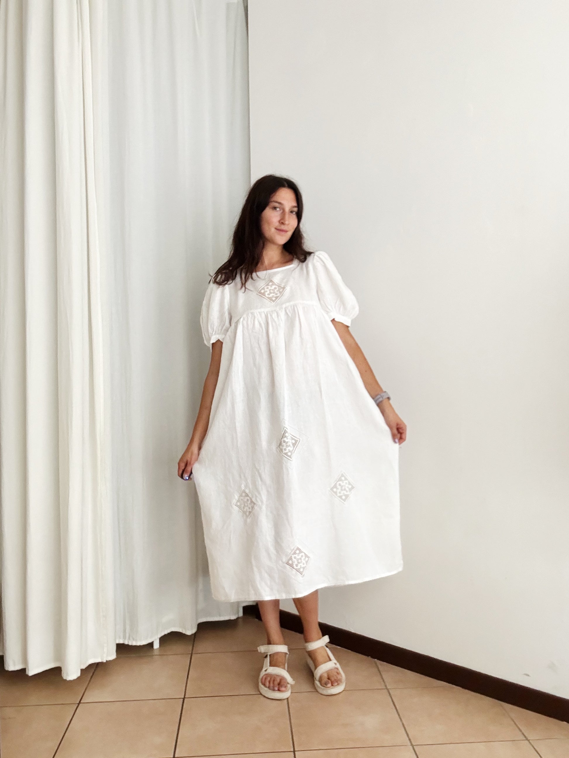 Abito vintage bianco in lino, lungo e voluminoso con manichette a palloncino. Sartoriale con inserti in crochet. Veste taglia M/L. Misure: spalle 37, ascelle 47, lunghezza 118