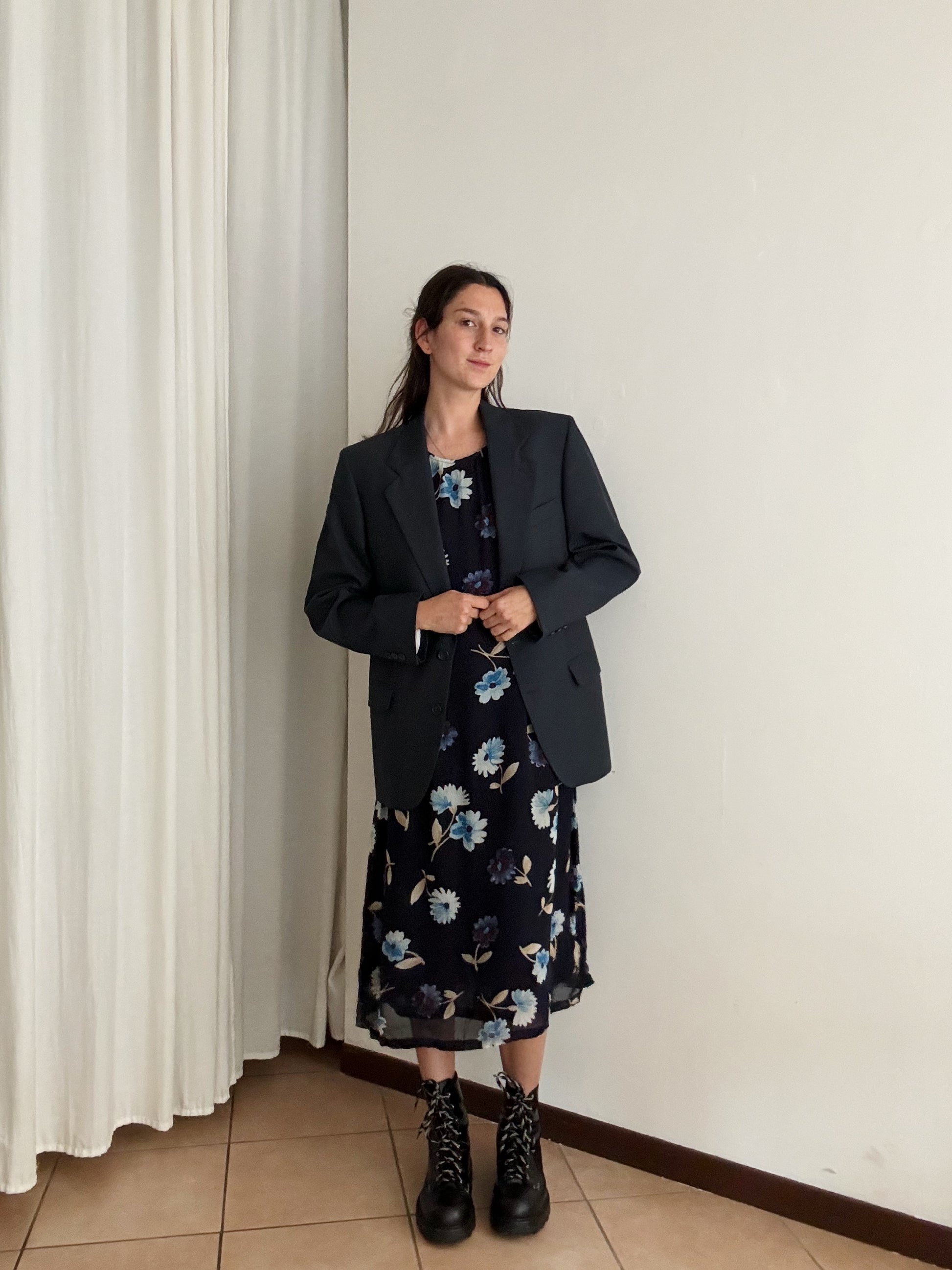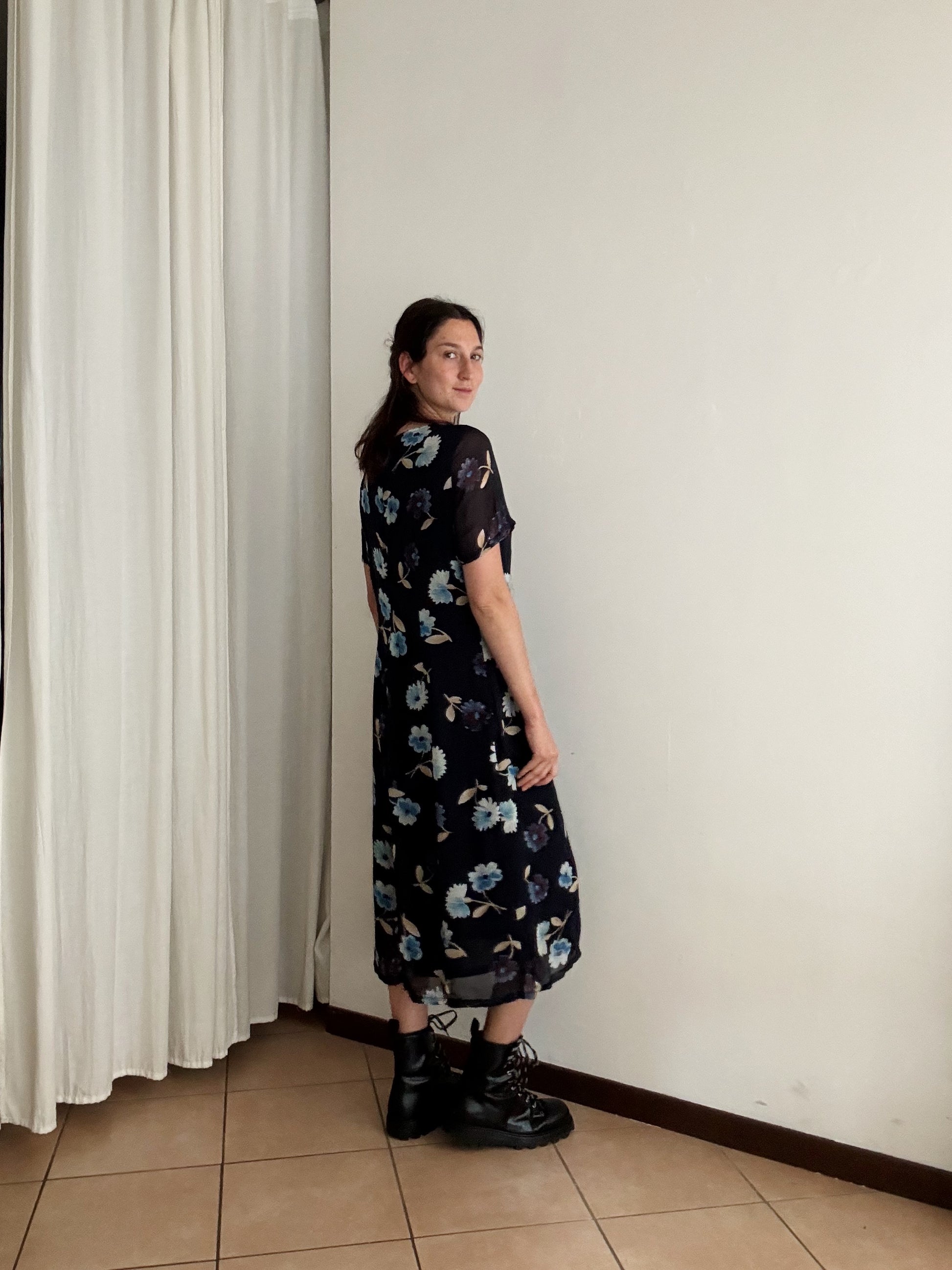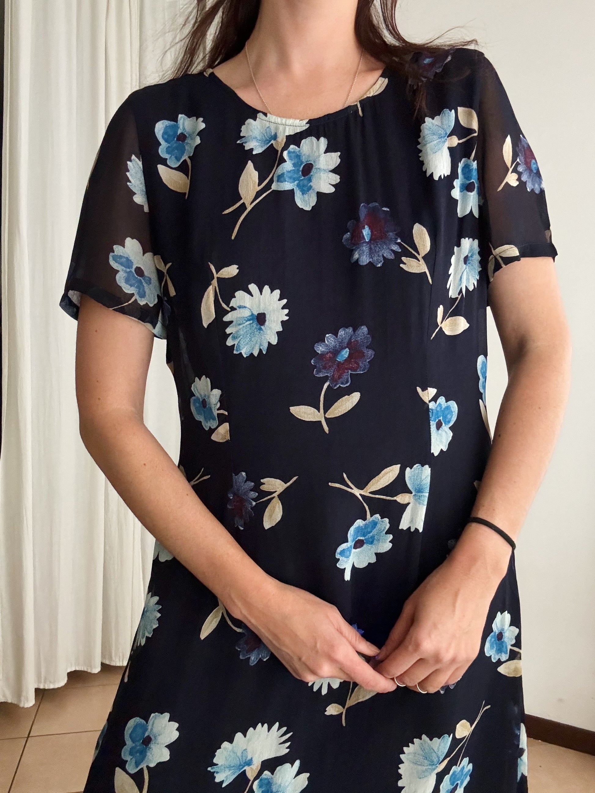 Abito lungo blu floreale. Taglia 46. 100% viscosa made in Italy. Misure: spalle 42, ascelle 53, fianchi circa 57, lunghezza 119