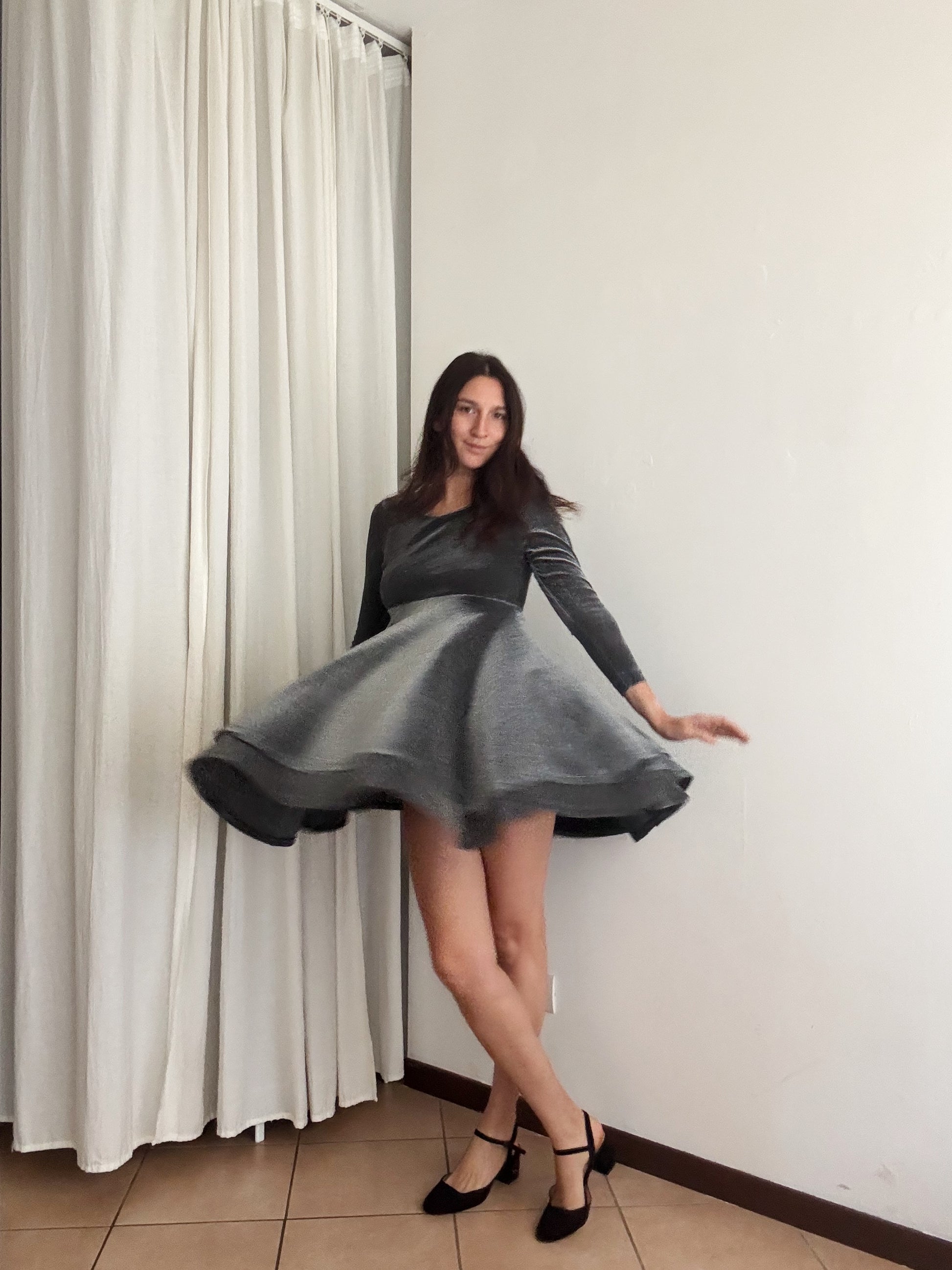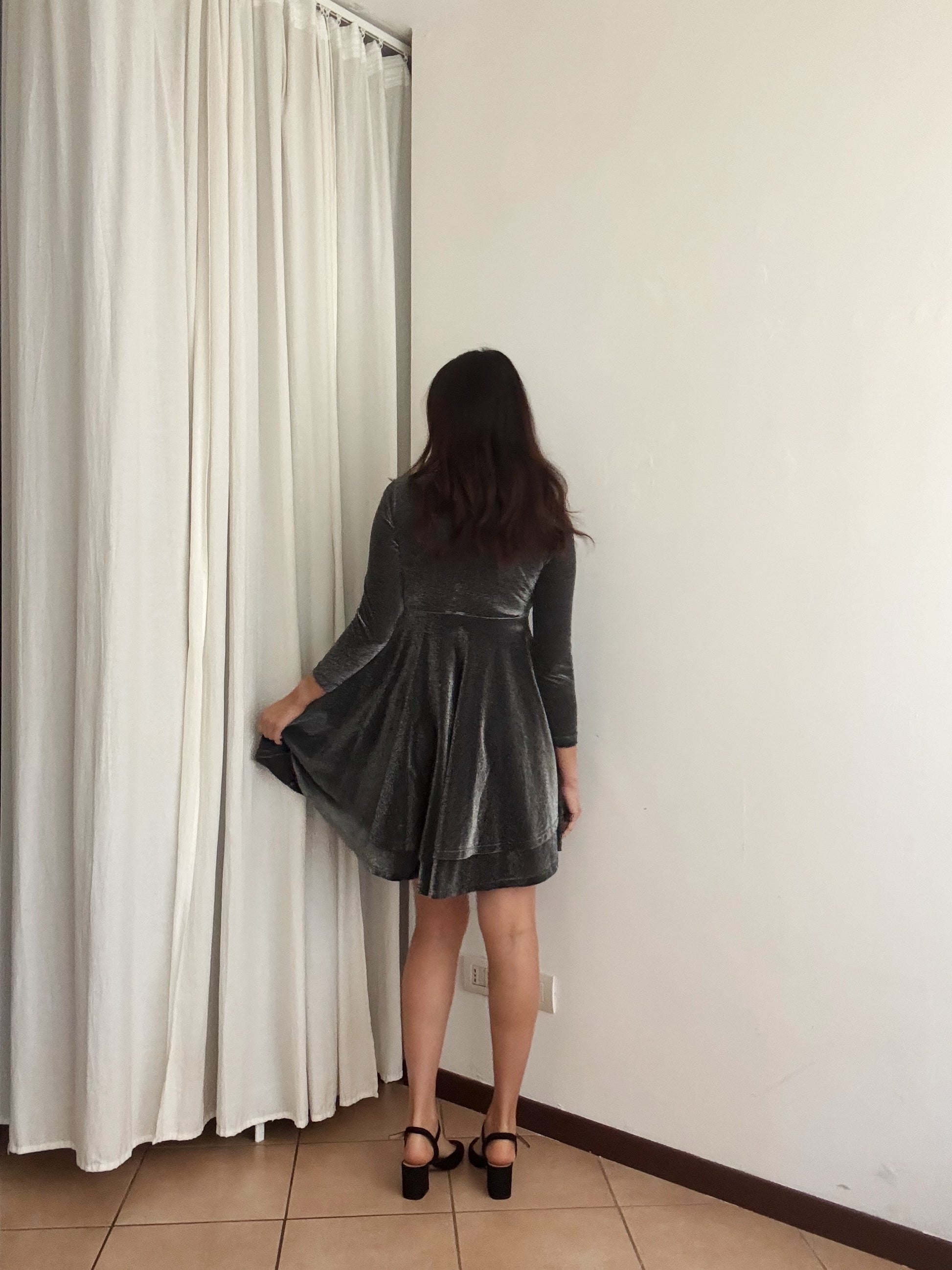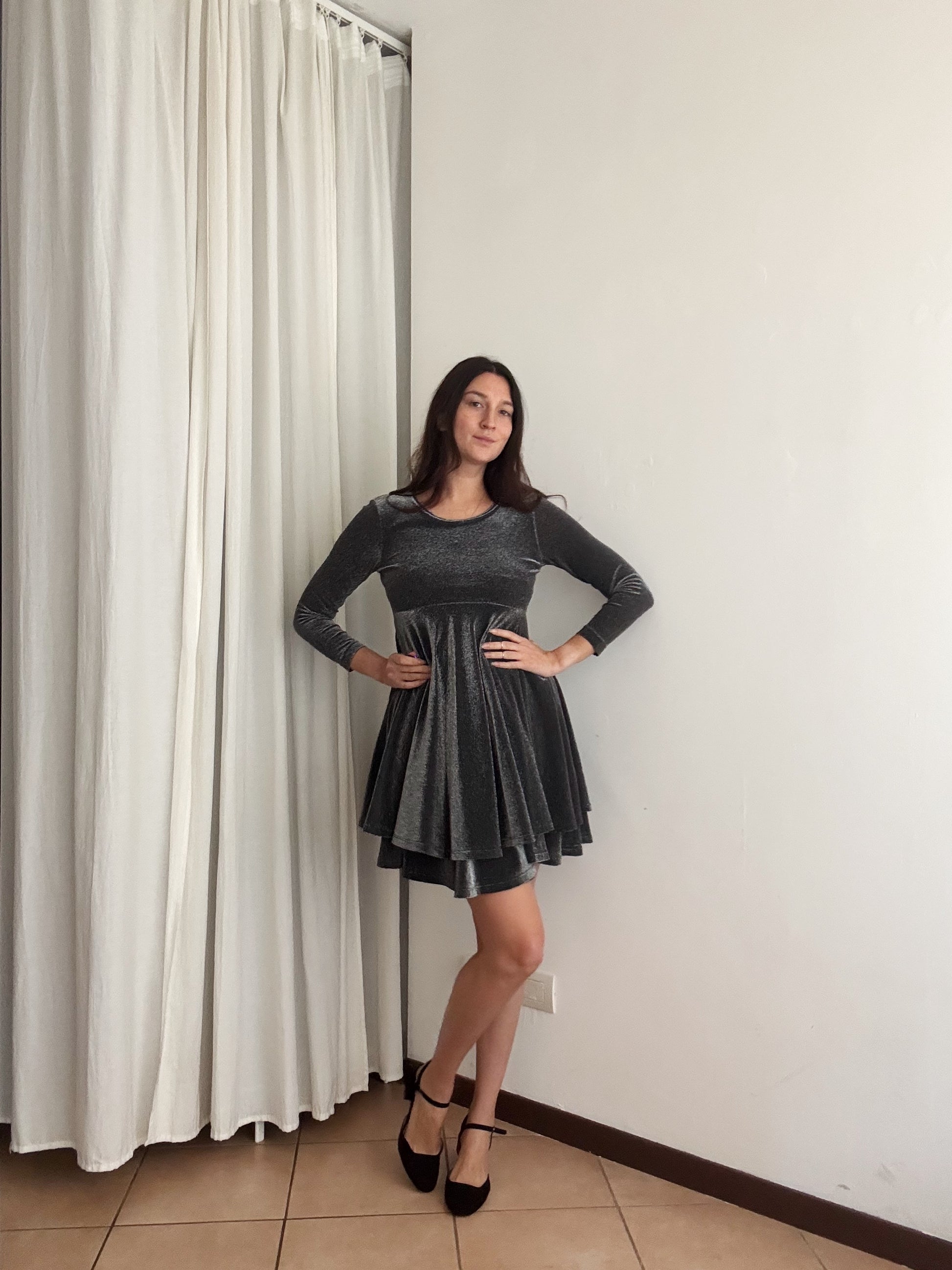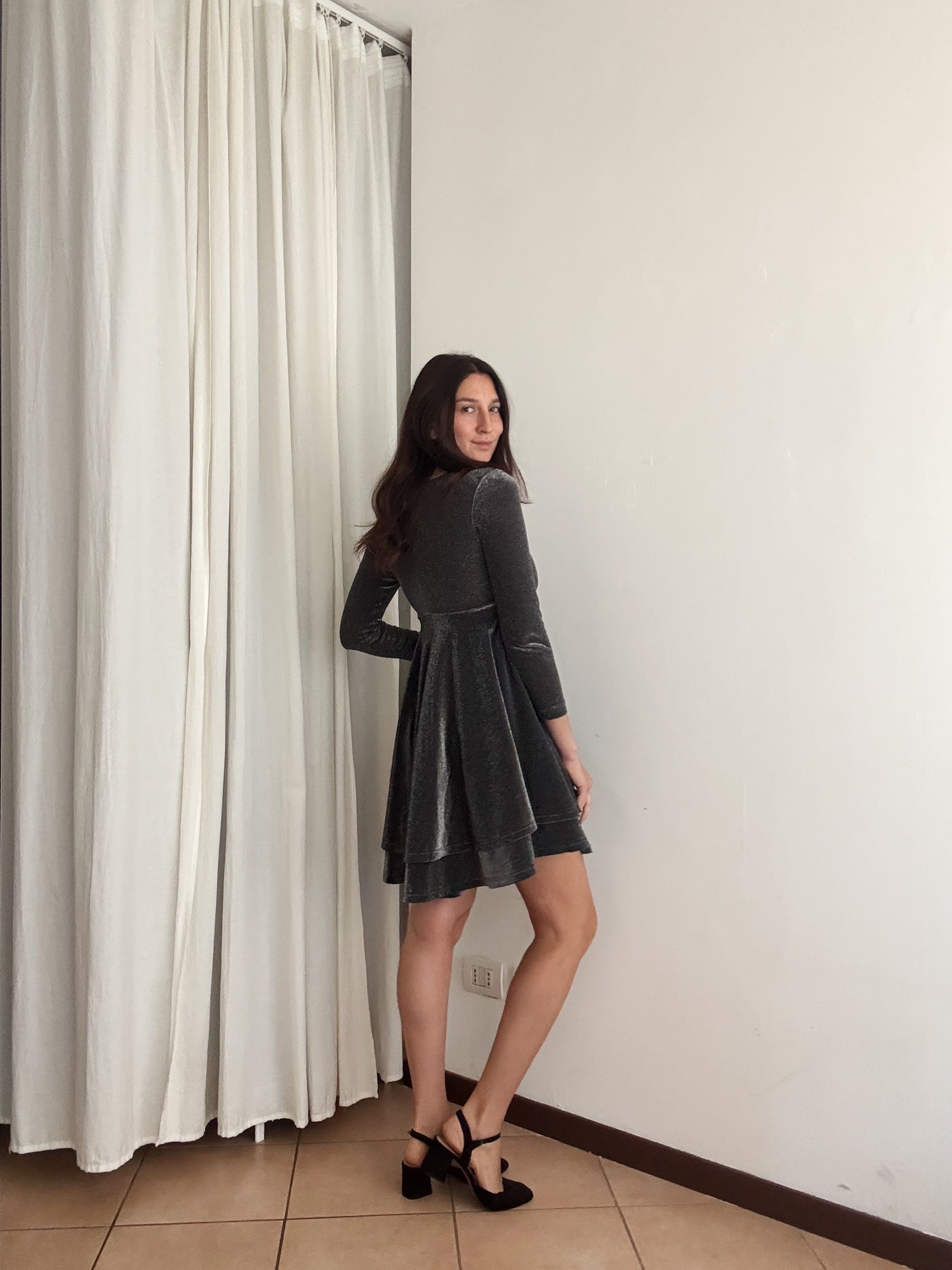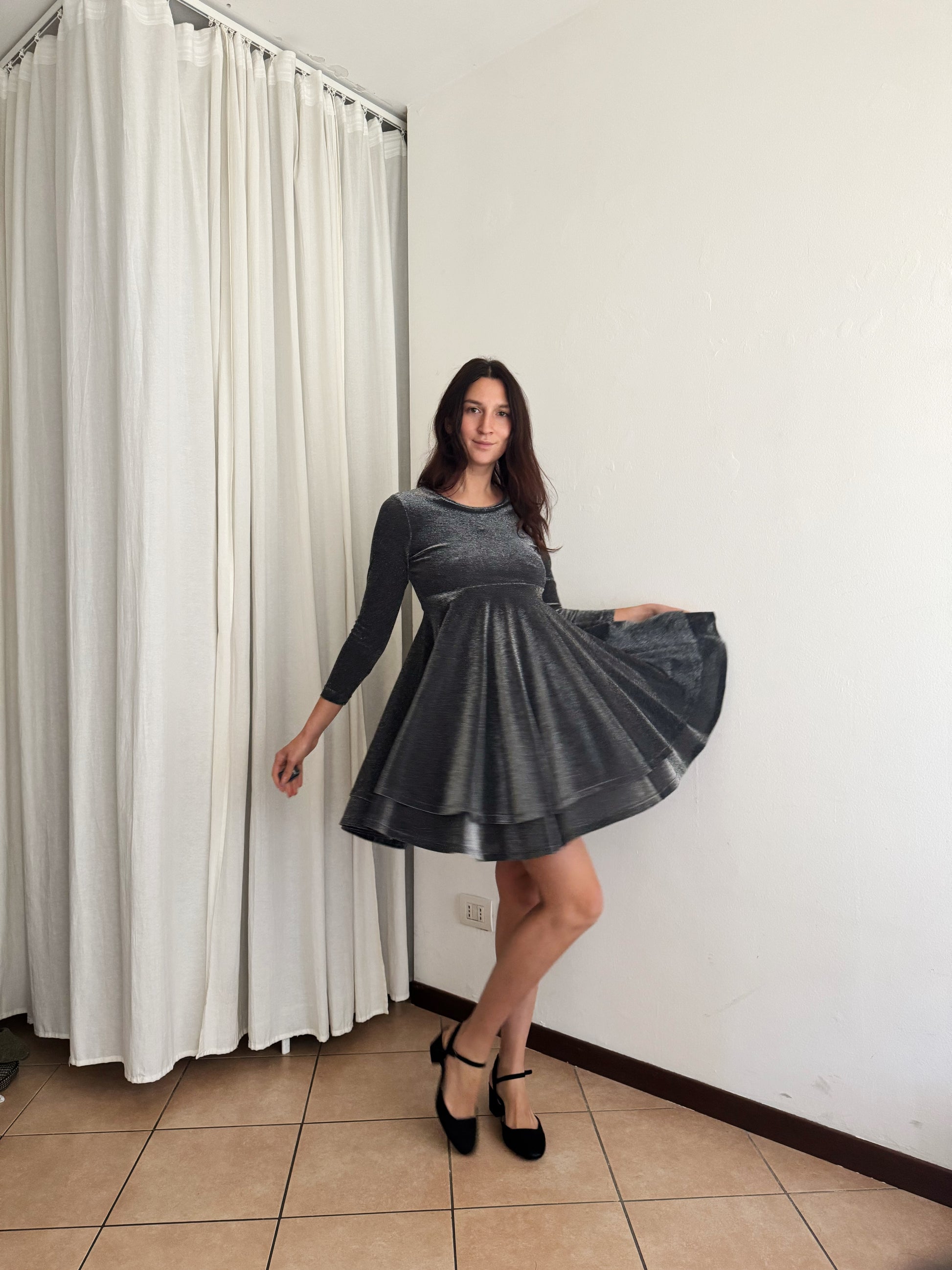 Abito in lurex argentato, veste taglia S e queste le sue misure da steso, considerando che il tessuto è elasticizzato: spalle 36, ascelle 43, vita 35, maniche 51, lunghezza 91