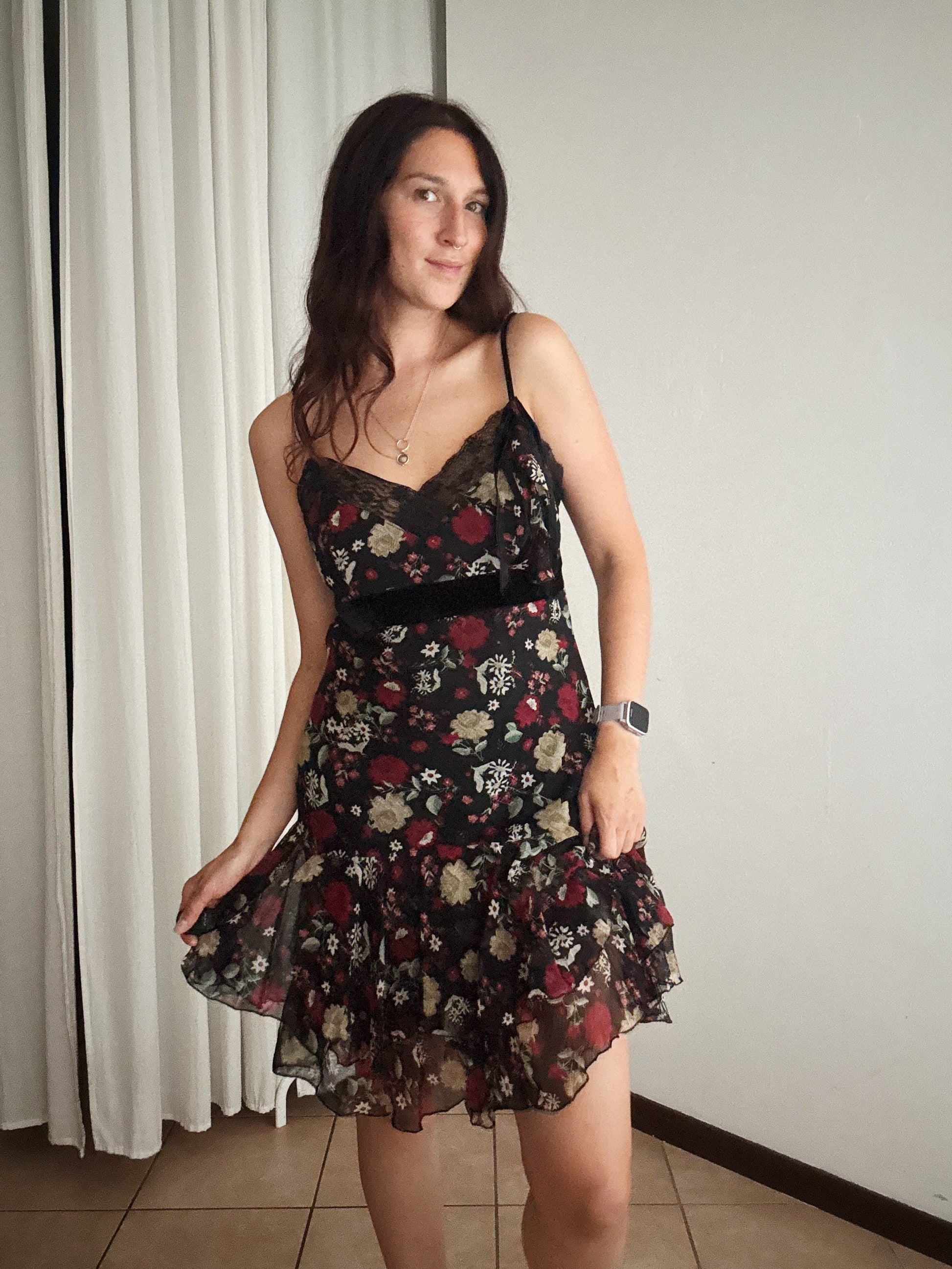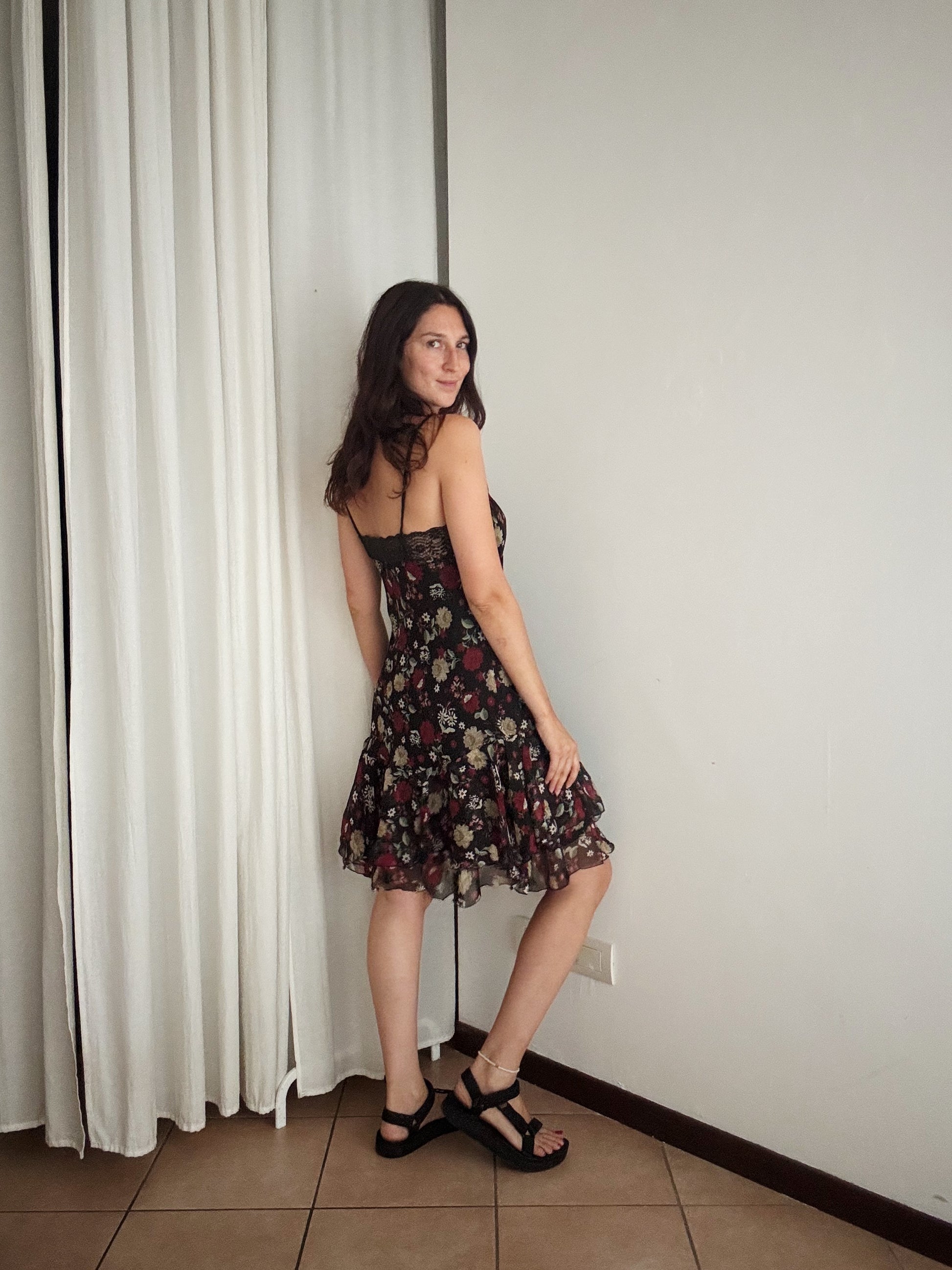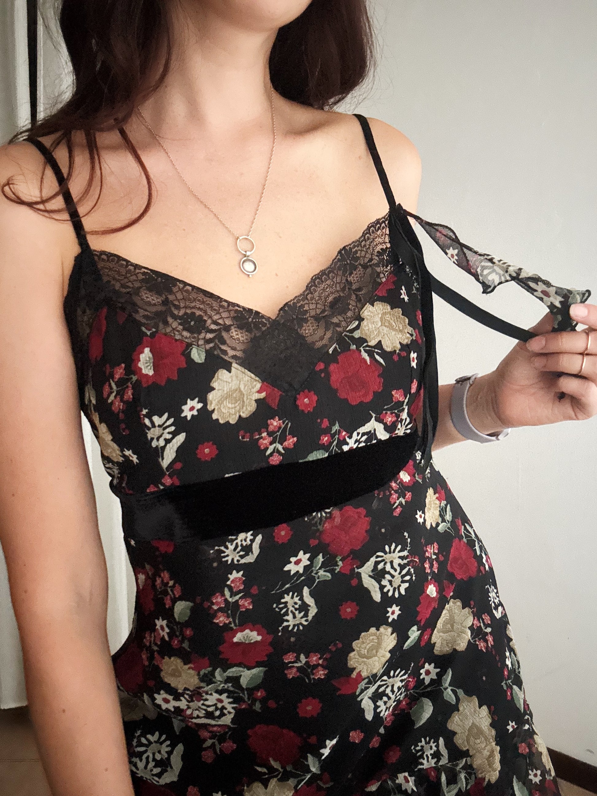Abito nero floreale. Veste taglia M in poliestere setificato. Misure: ascelle 43, vita 40, fianchi circa 50, lunghezza 95