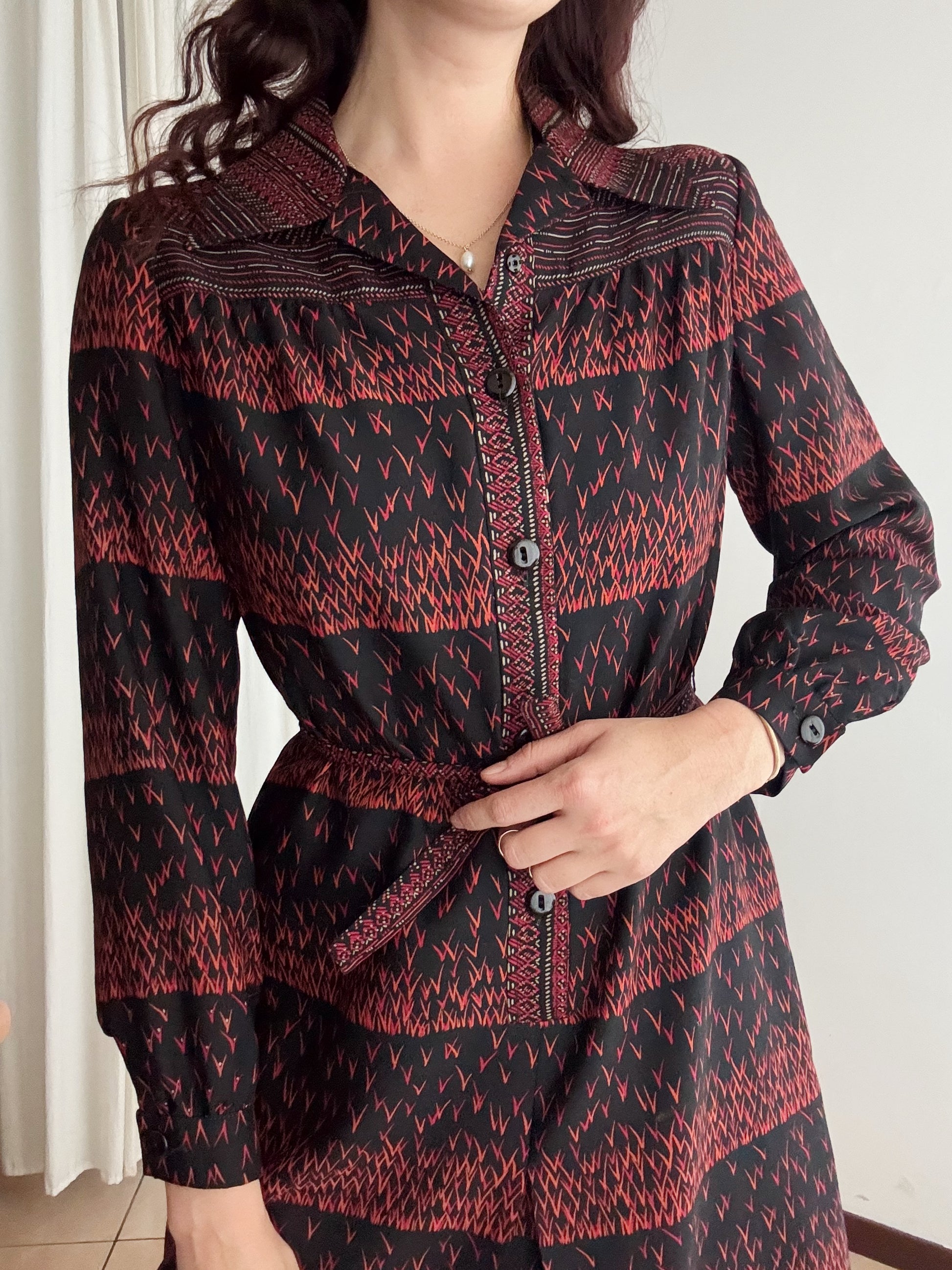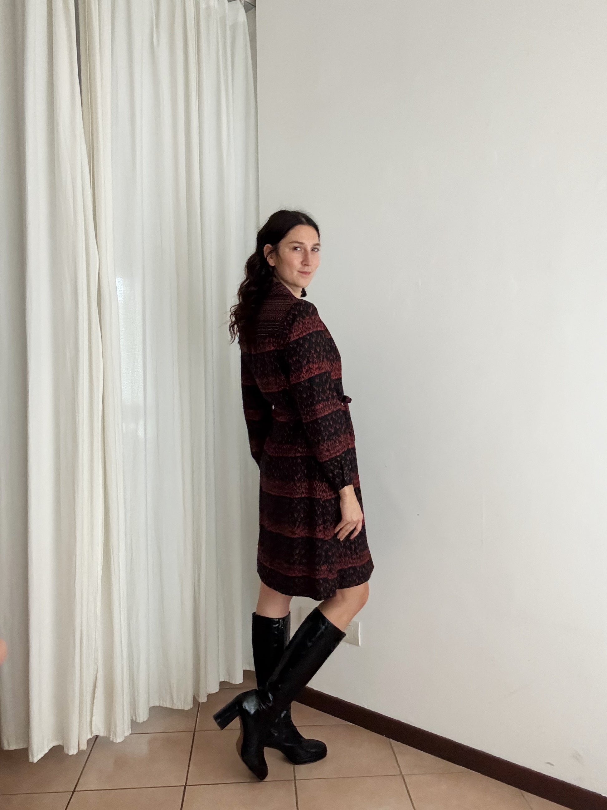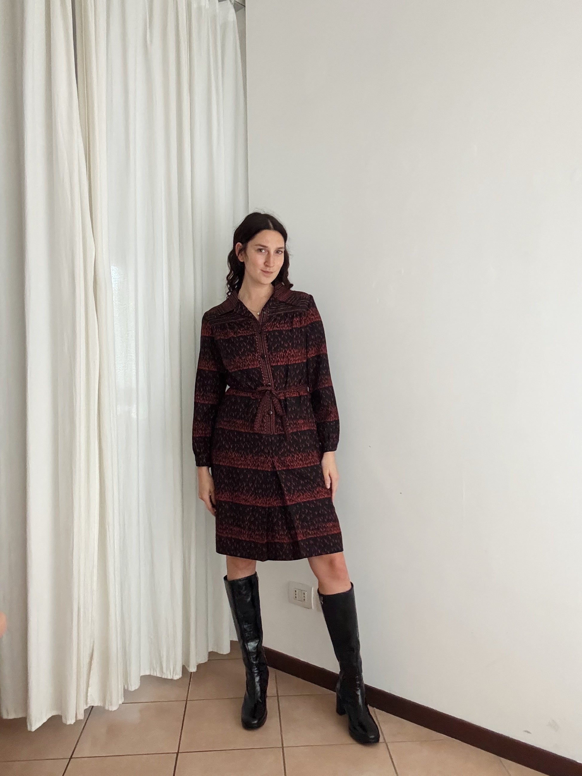 Abito vintage in nero e rosso, taglia non riportata ma consiglio a 42/44. Misure da steso: spalle 39, ascelle 49, maniche 58, lunghezza 100. in vita si stringe a piacere con il cinturino