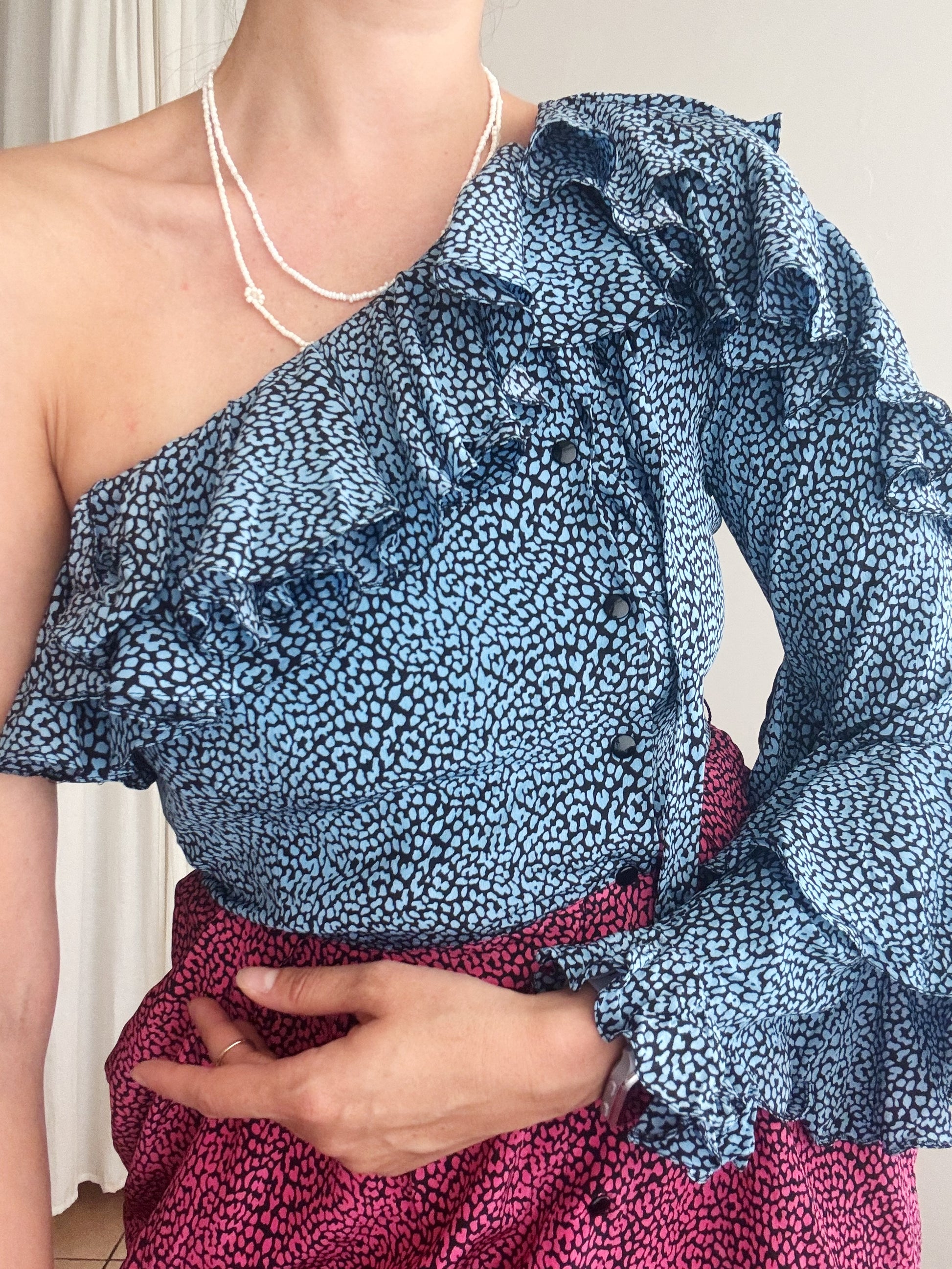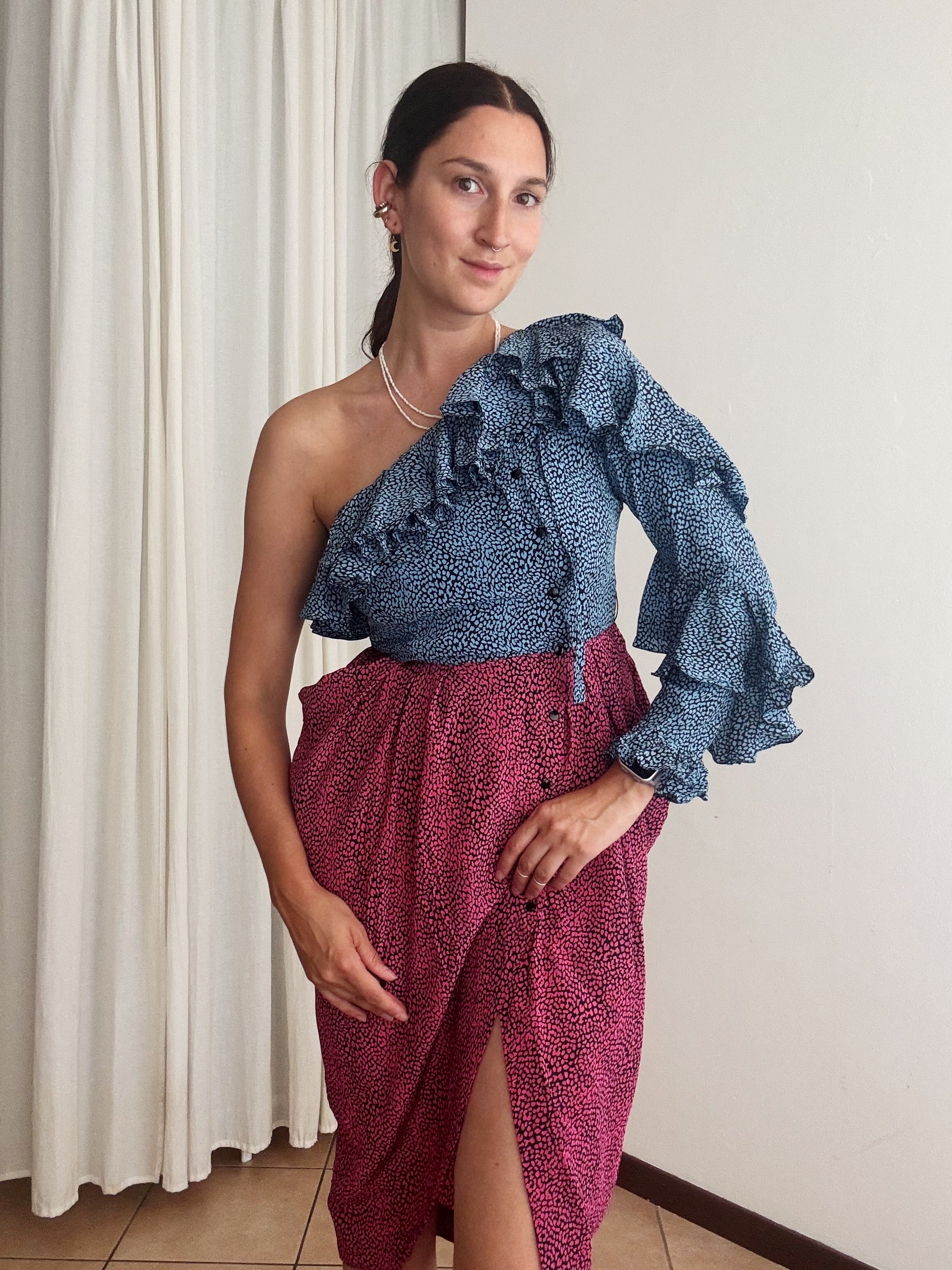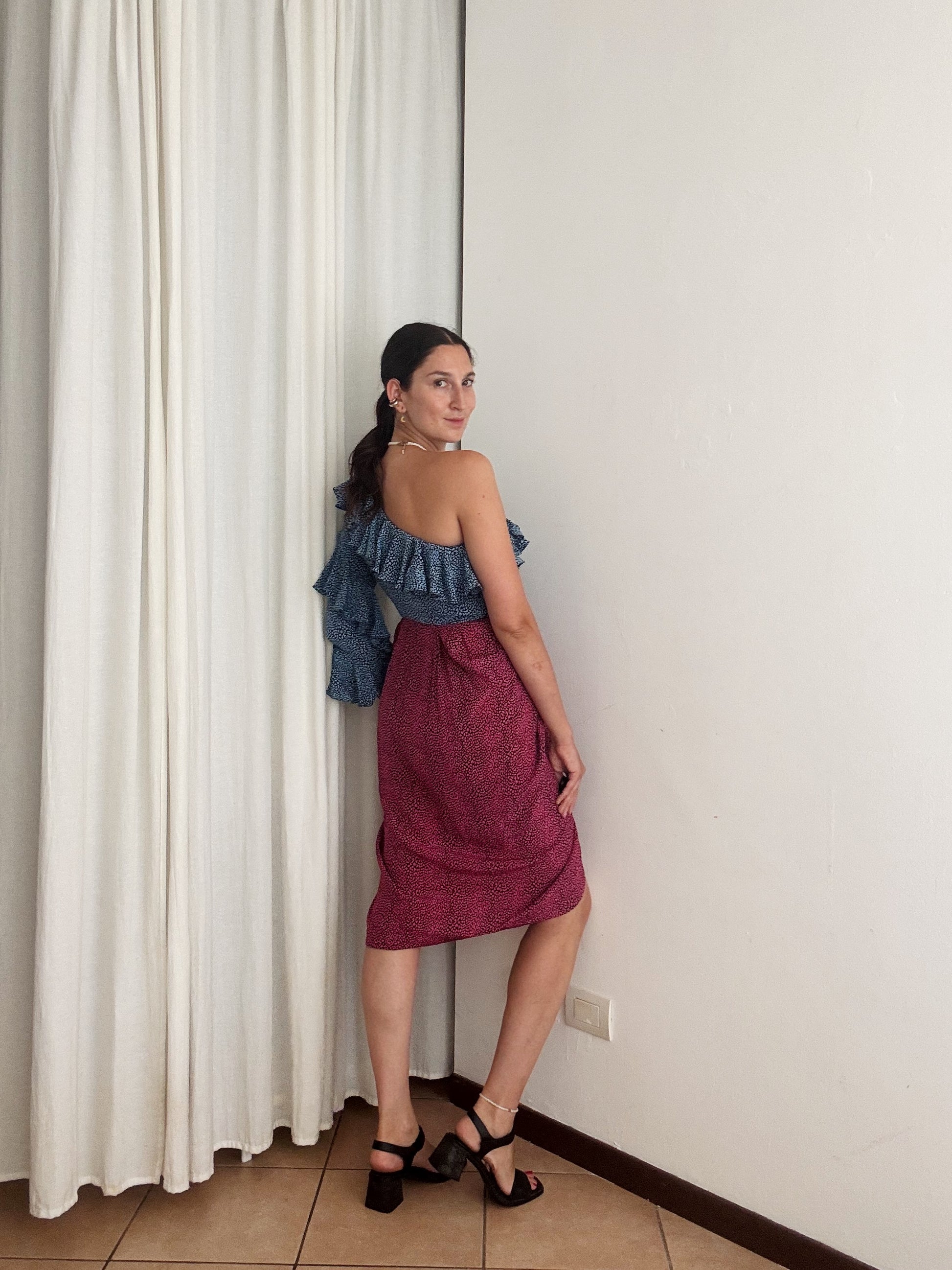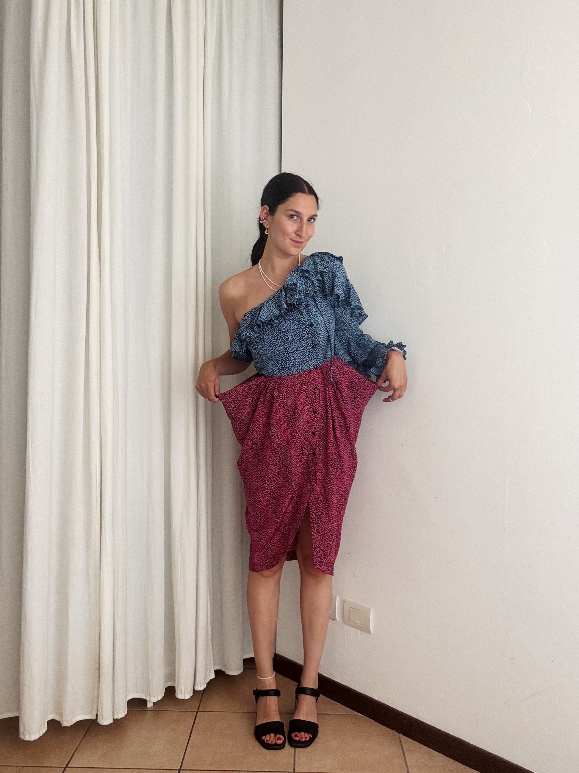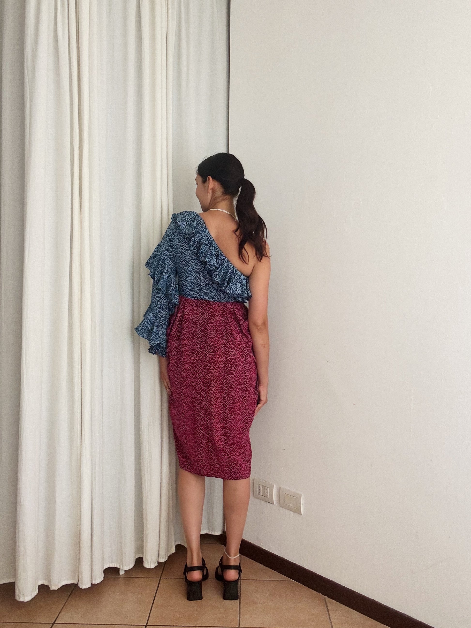 Abito in 100% seta taglia 40, smarchiato ma l’etichetta interna riporta l’appartenenza al gruppo Aeffe quindi potrebbe trattarsi di un capo Moschino. Monospalla con rouches e chiusura a portafoglio. Misure: ascelle 43, vita 33, lunghezza 105