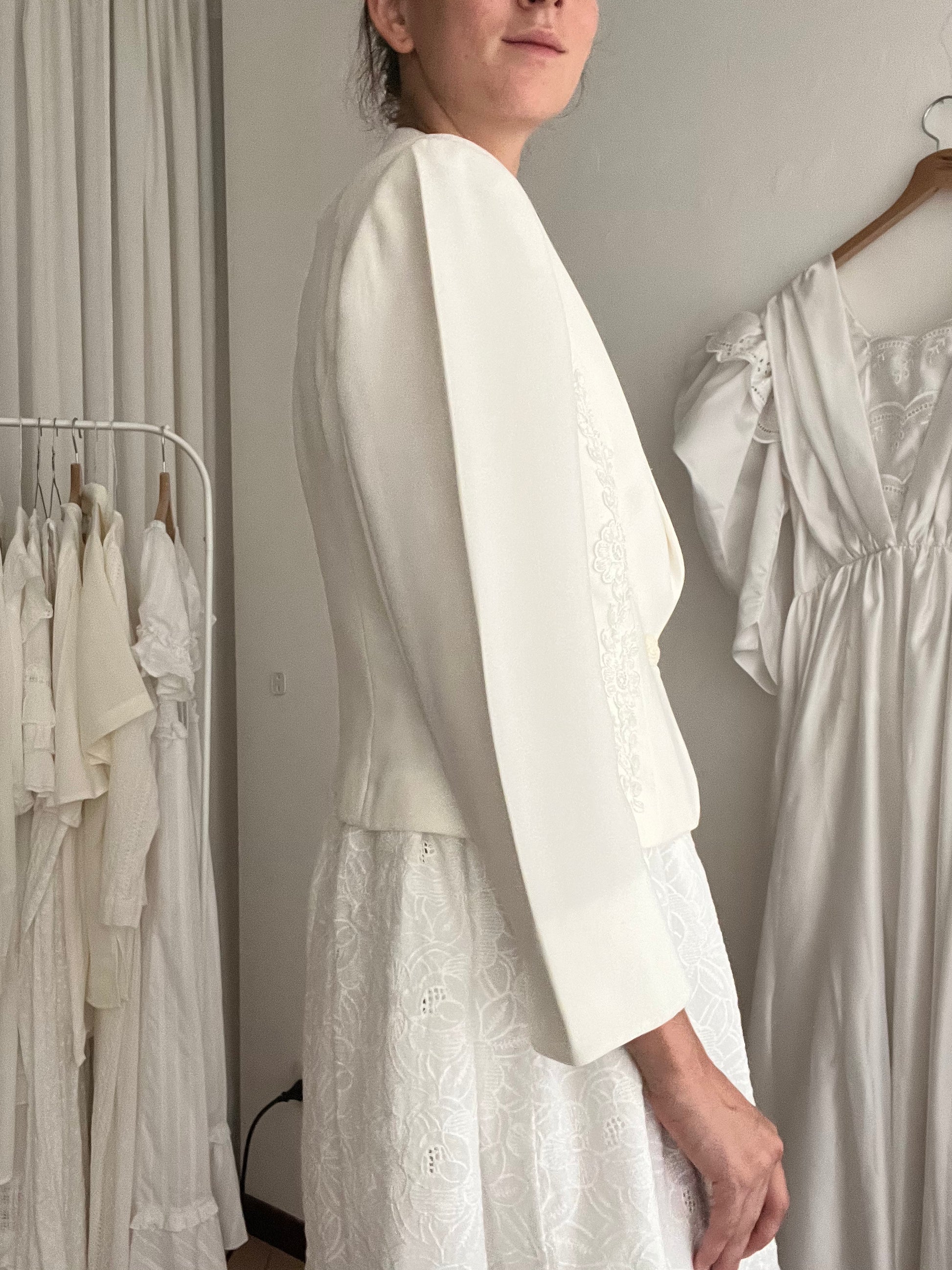 Blazer vintage bianco taglia 42 con ricami in perline sul davanti. Spalle 41, ascelle 48, maniche 57, lunghezza 57