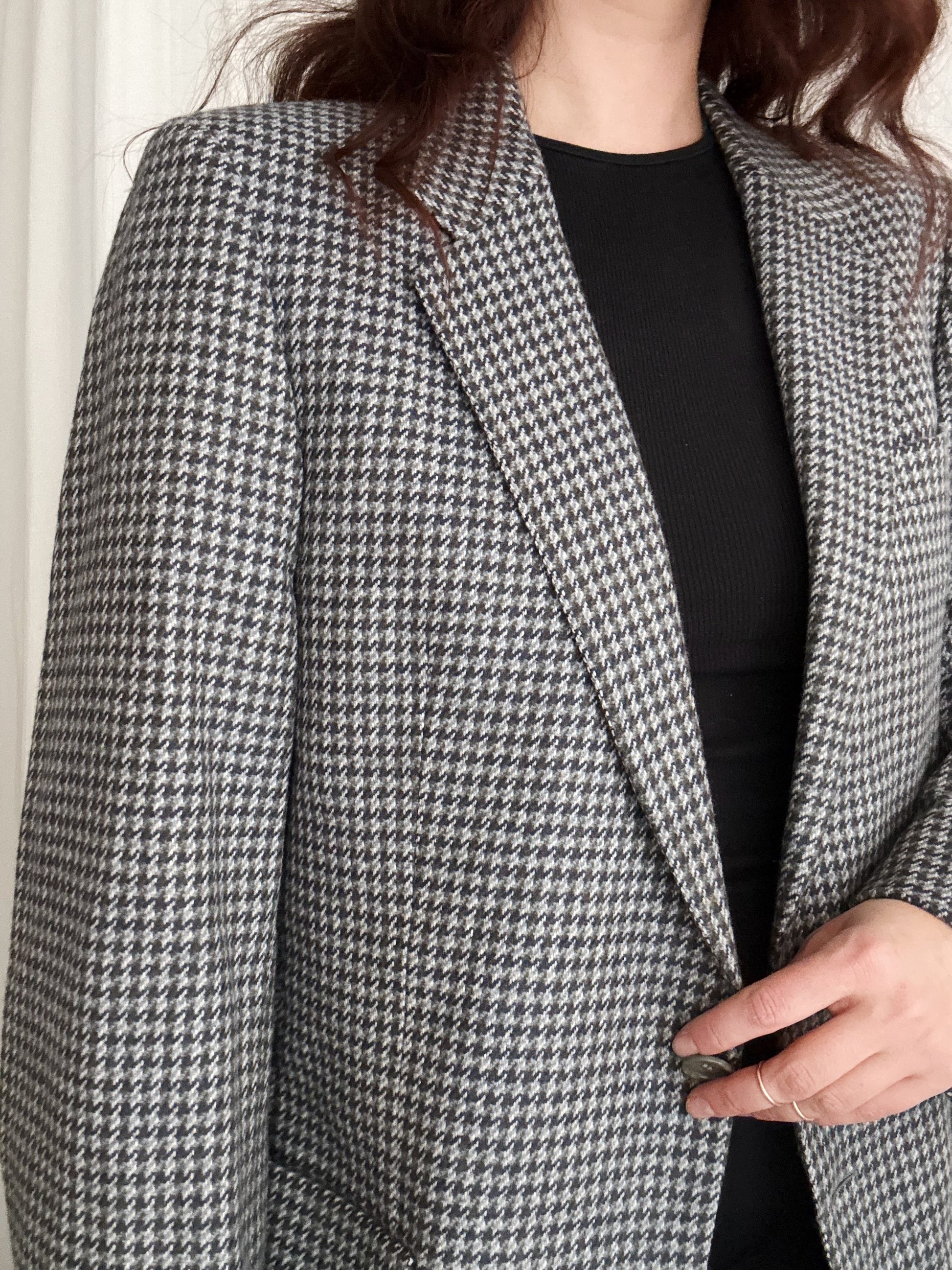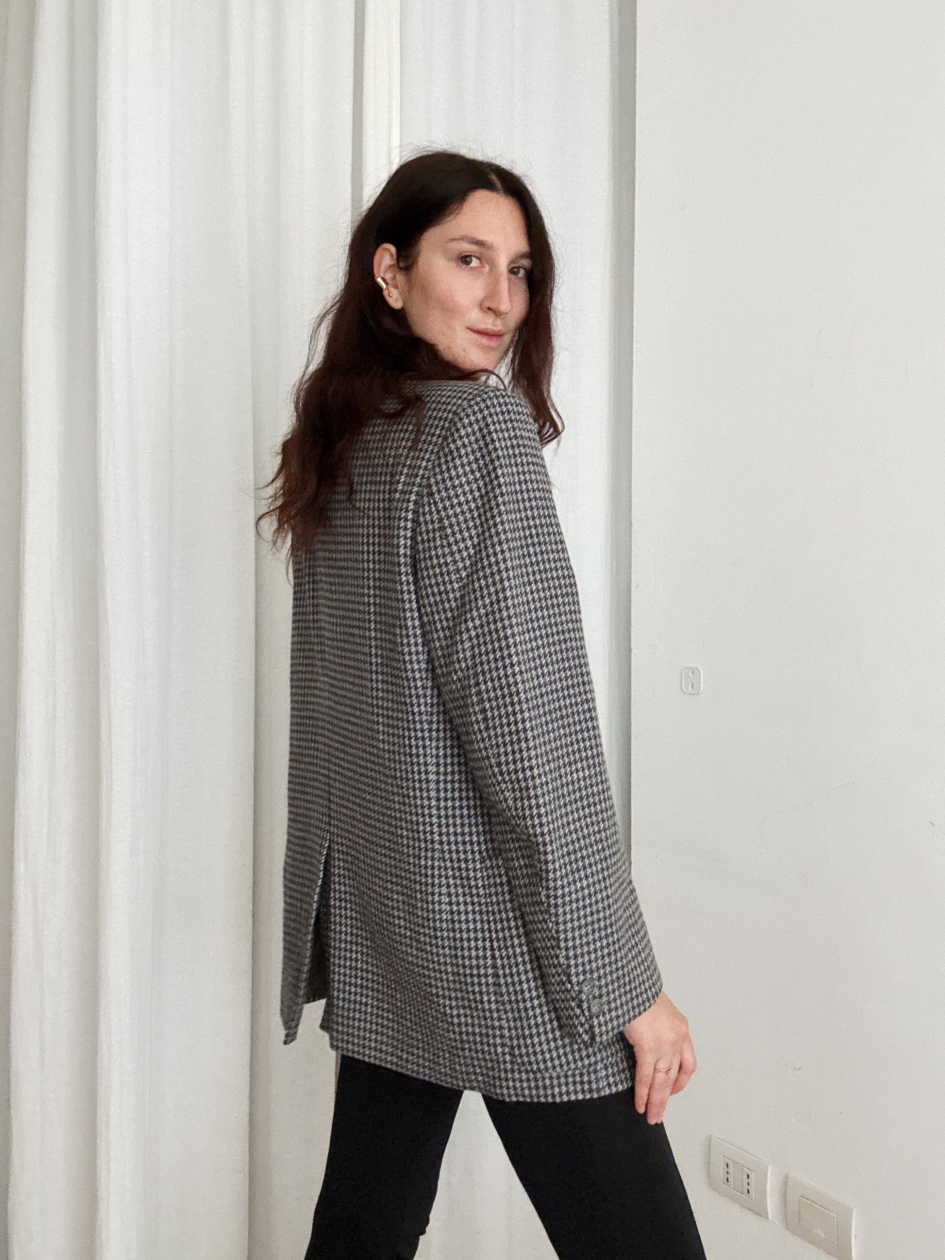 Blazer vintage motivo pied de poule grigio e blu, nasce da uomo, veste taglia L. Misure: spalle 44, ascelle 53, maniche 62, lunghezza 78