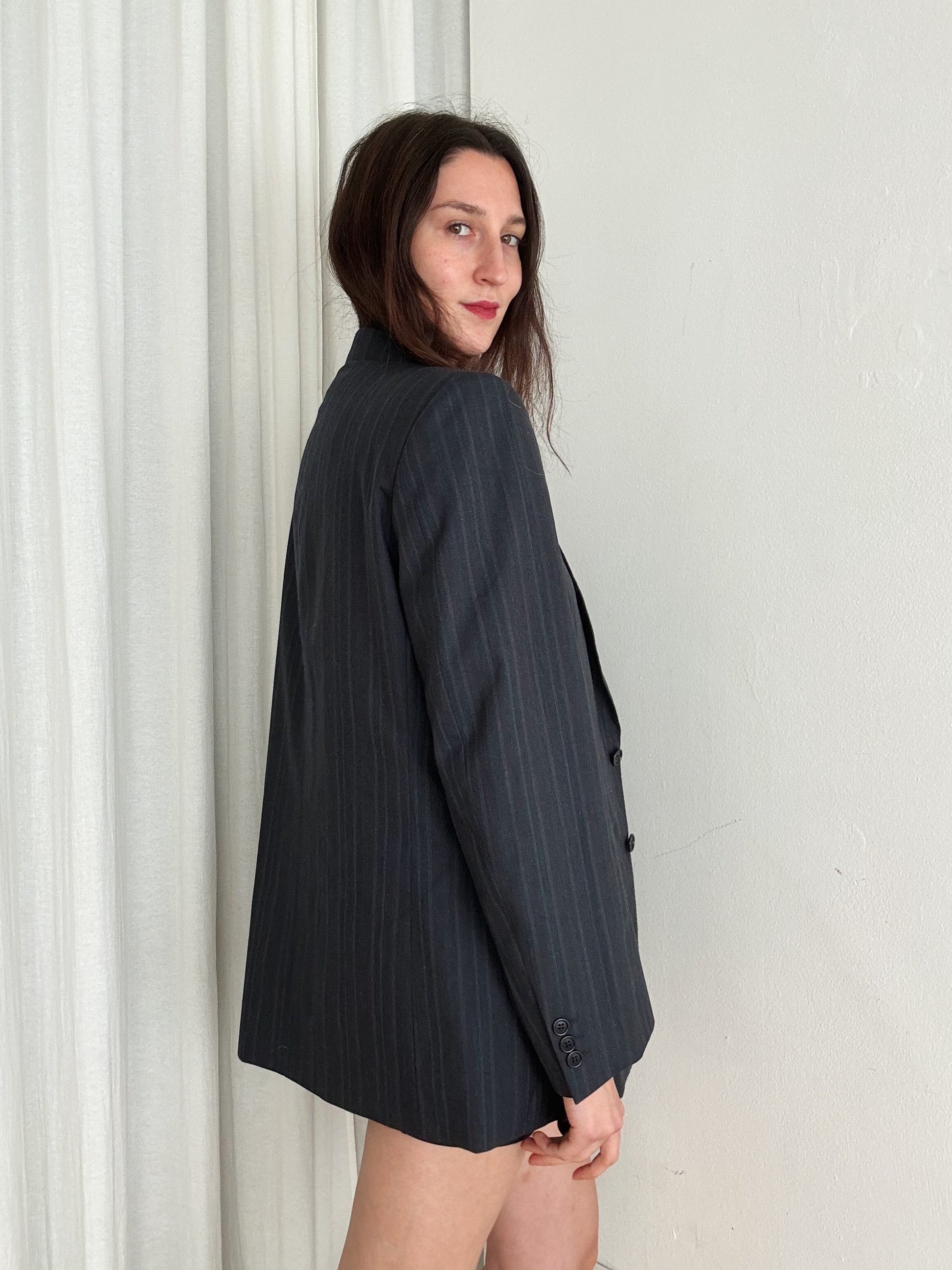 Blazer vintage blu a righe in lana, nasce da uomo, taglia non riportata ma veste fino a una L. Misure: spalle 43, ascelle 55, maniche 64, lunghezza 78