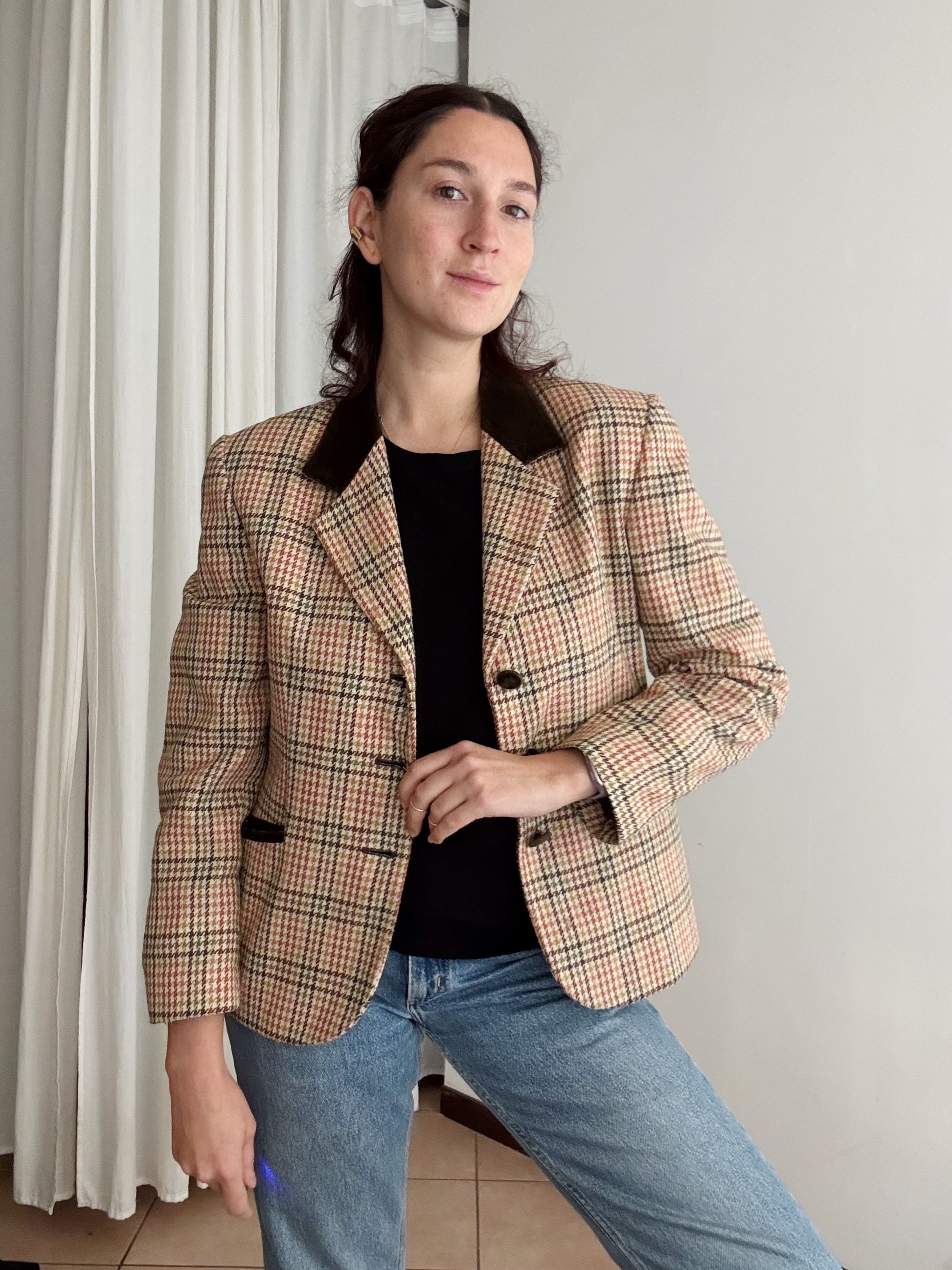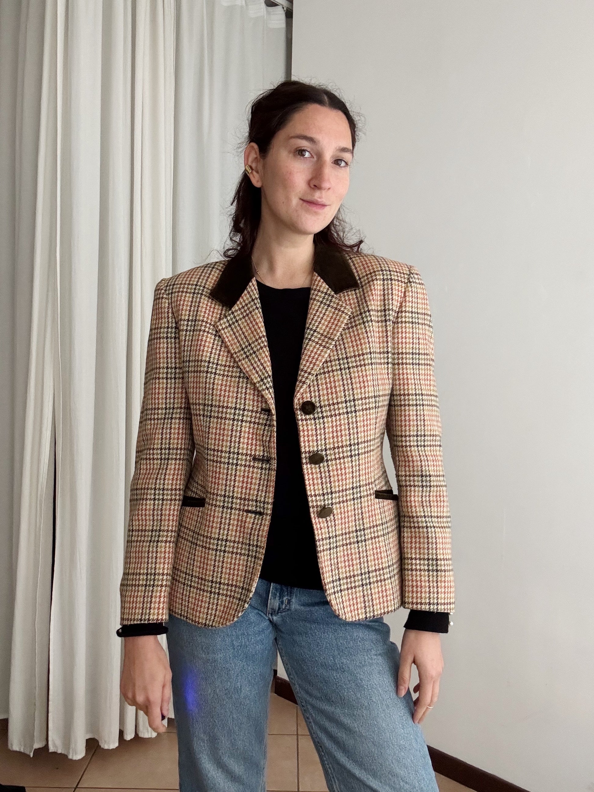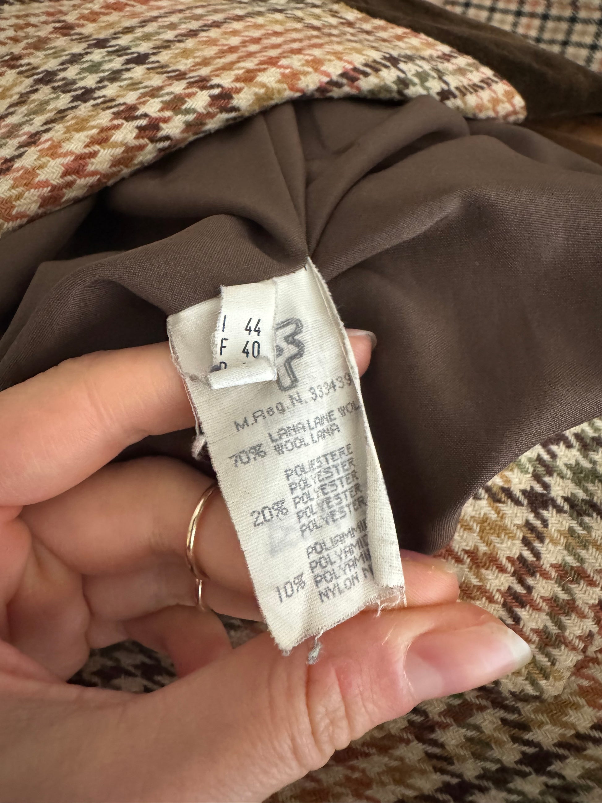 Blazer vintage nei toni del marrone con stampa pied de poule. taglia 44 in misto lana. Misure: spalle 43, ascelle 50, maniche 59, lunghezza 63.