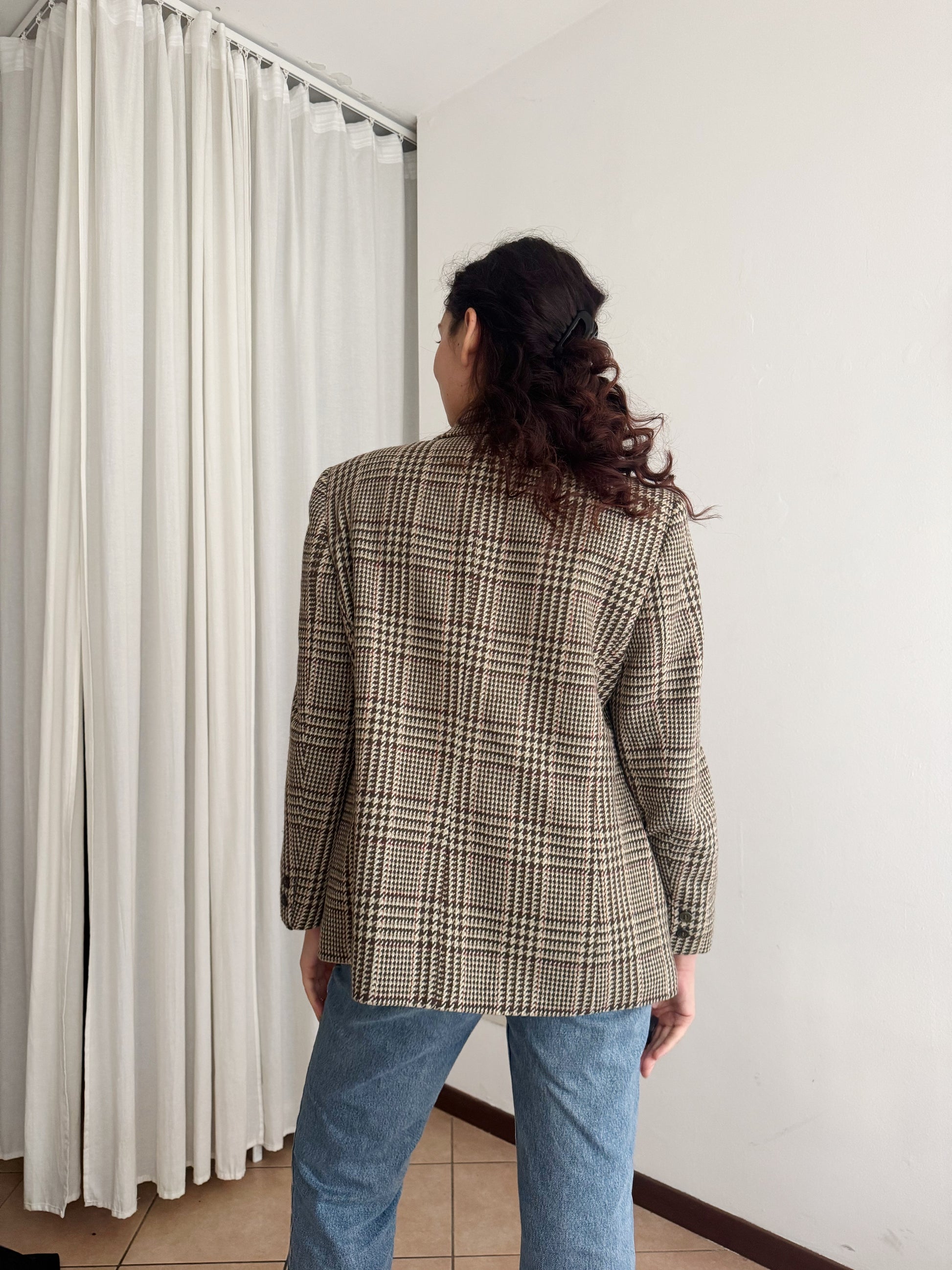 Blazer vintage Elena Mirò nei toni del marrone con stampa pied de poule. Taglia 44 in misto lana. Misure: spalle 44, ascelle 53, maniche 59, lunghezza 70.