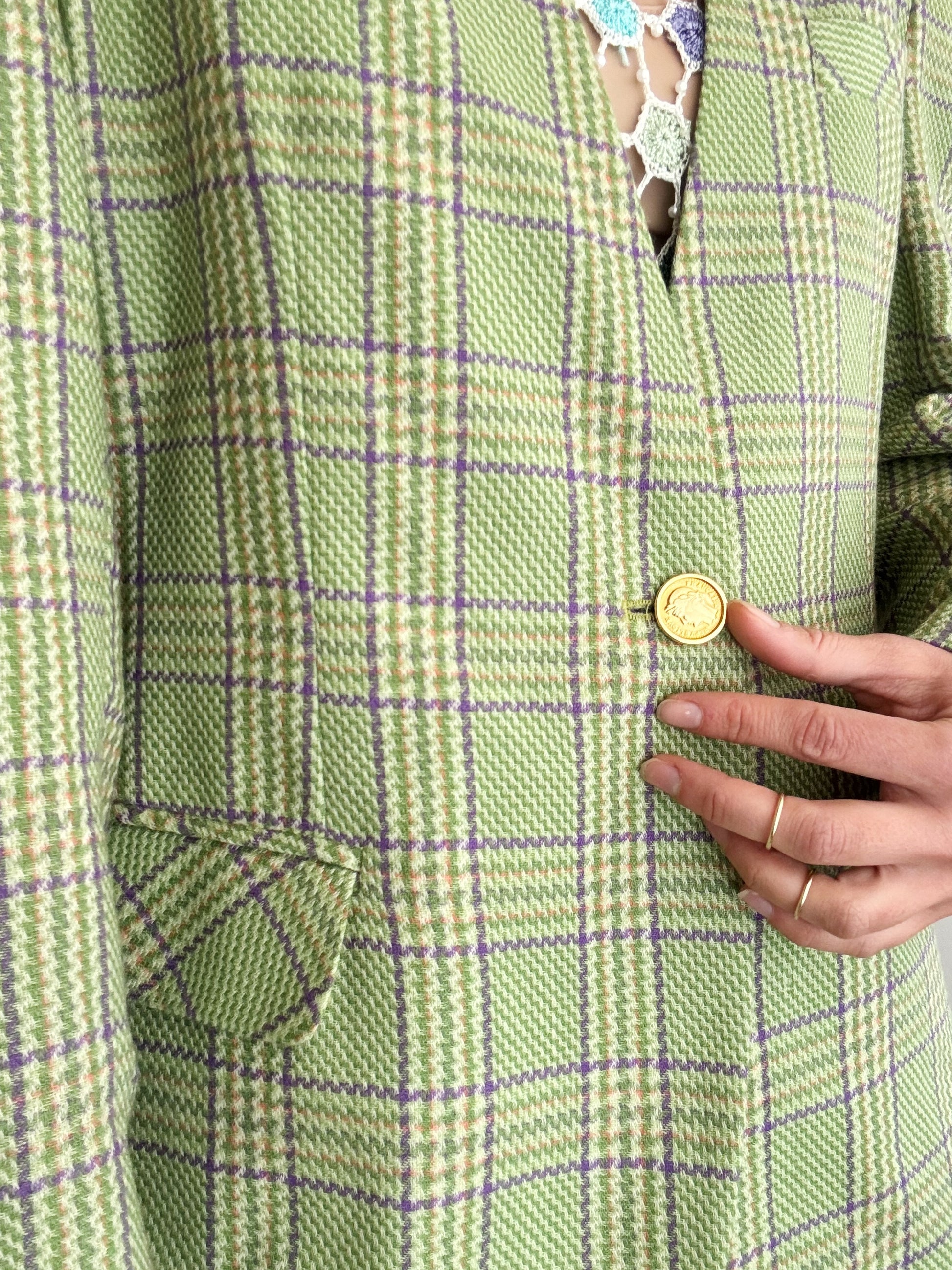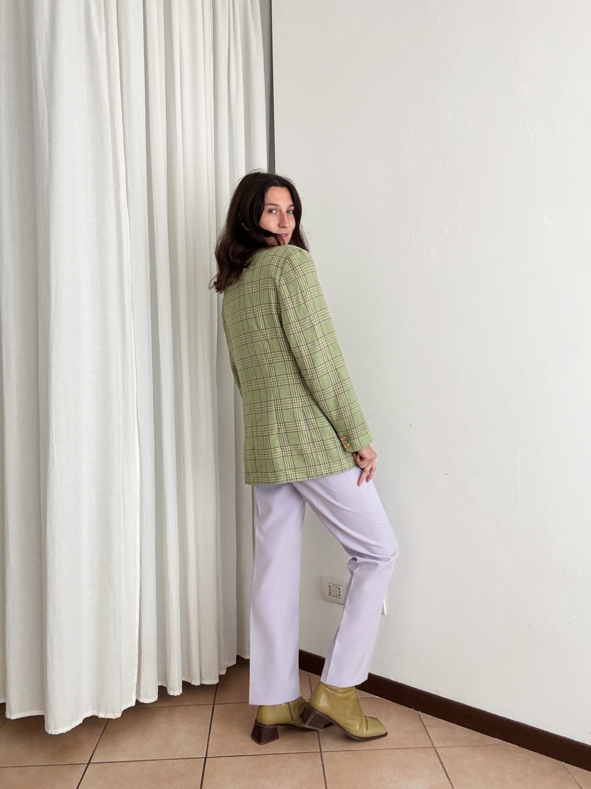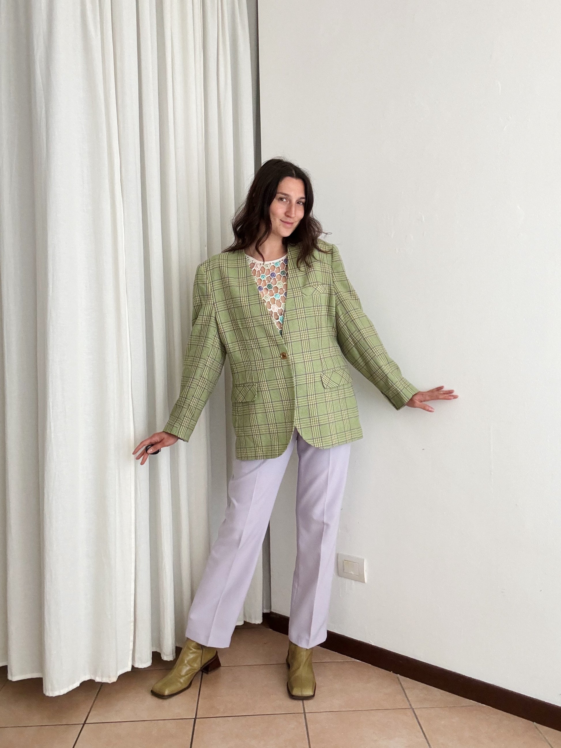 Blazer vintage verde con linee viola, riporta taglia48. 100% lino. Spalle 46, ascelle 53, maniche 60, lunghezza 76. Segnalo tessuto leggermente consumato in un punto ma non si nota da indossato