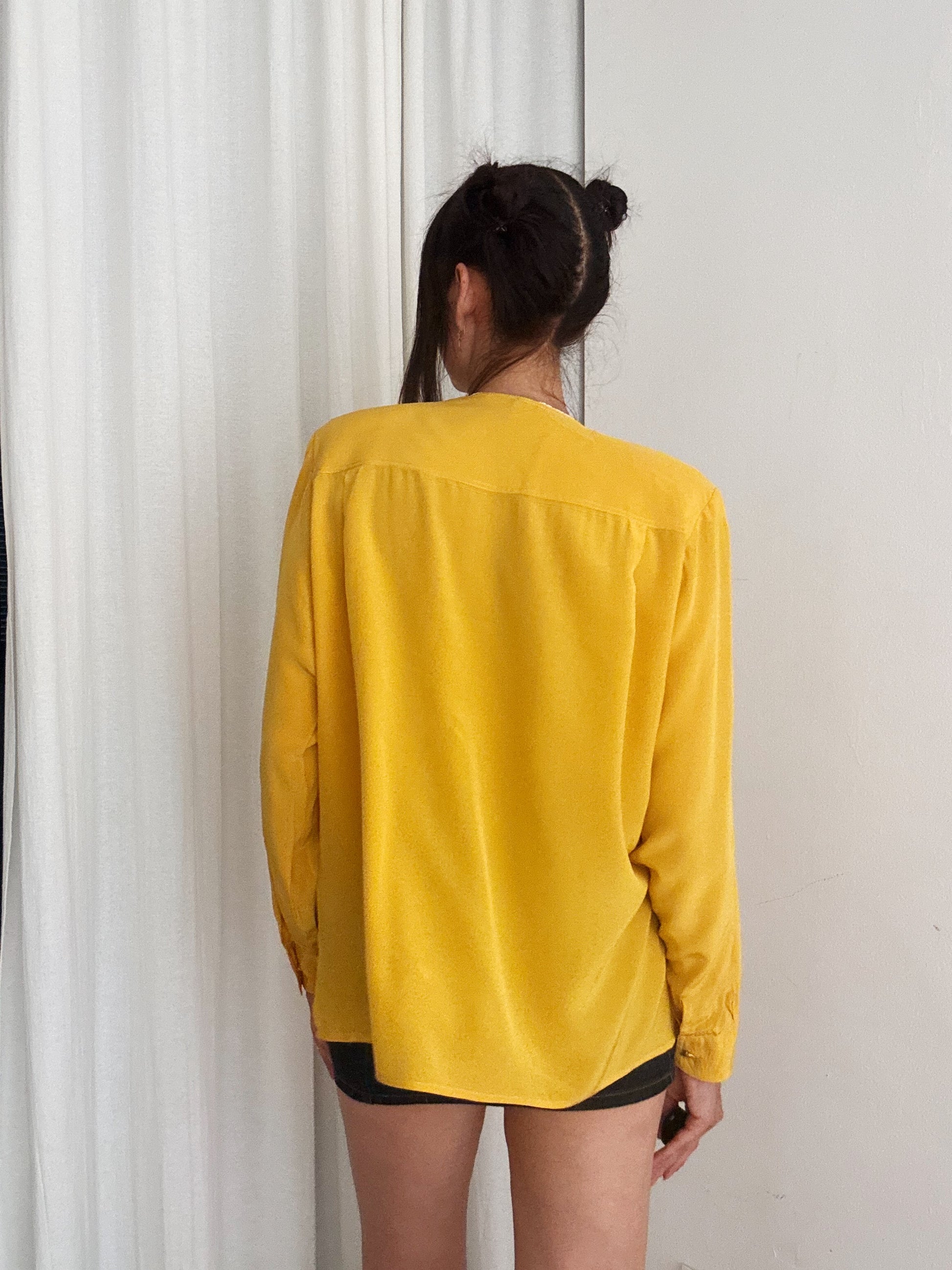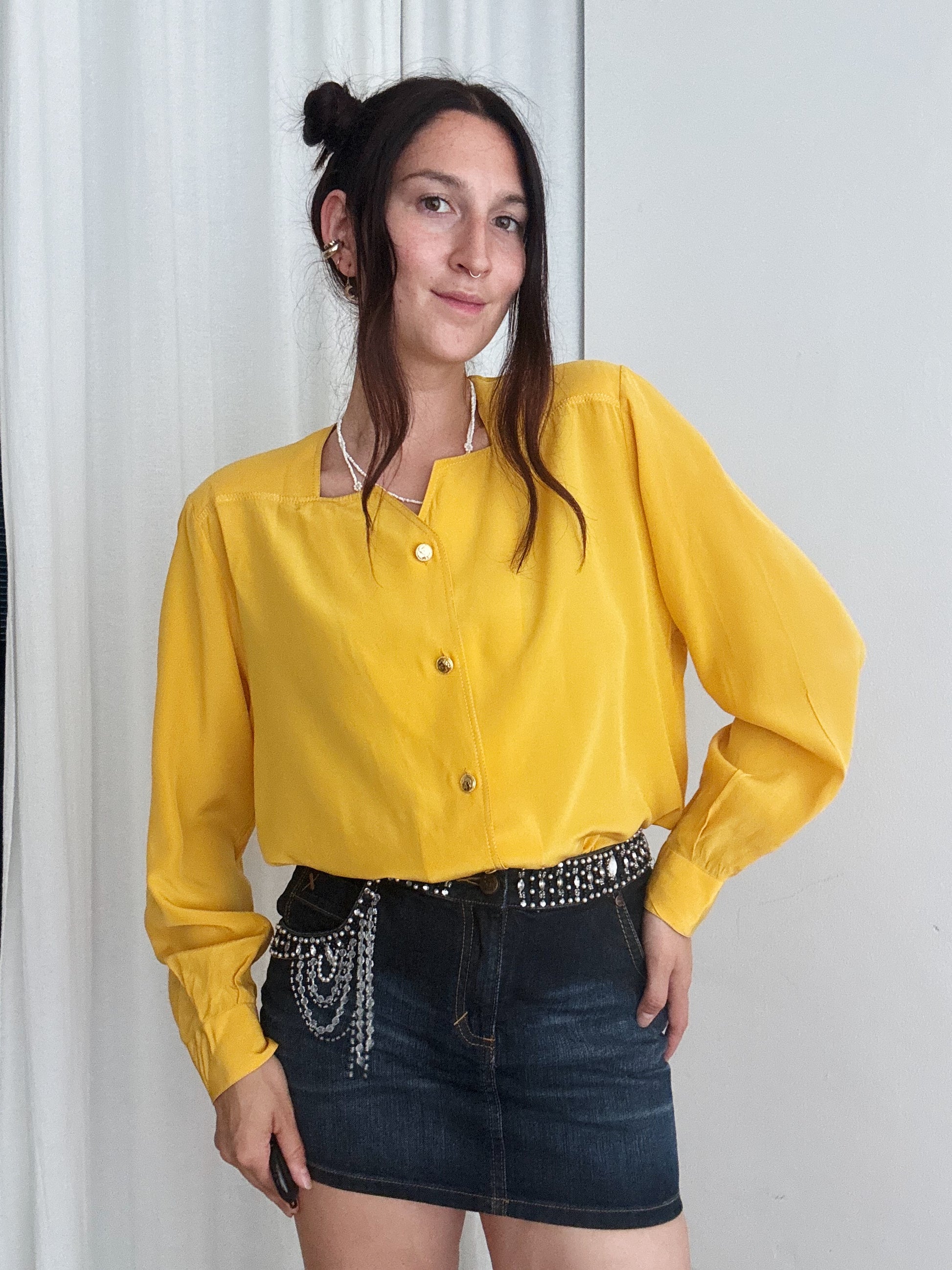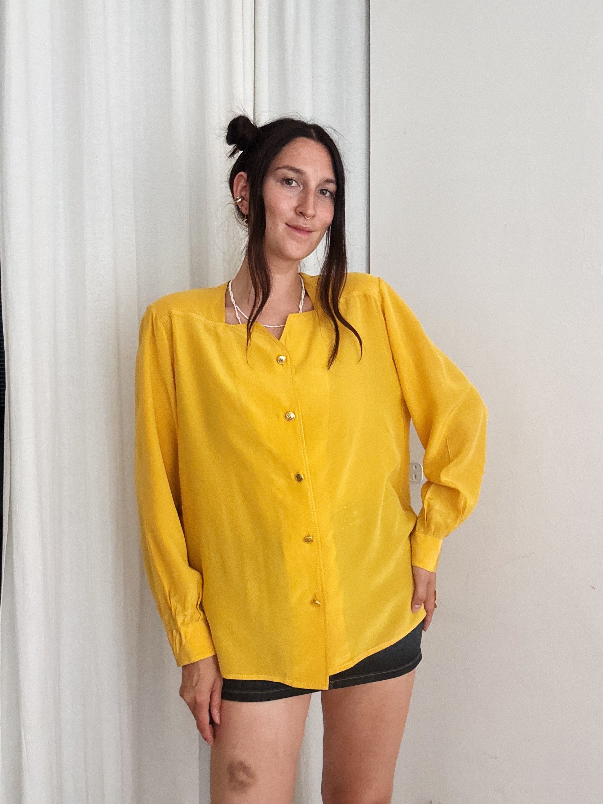 Camicia vintage in seta gialla taglia 46, bottoni dorati. Misure: spalle 45, ascelle 61, maniche 58, lunghezza 67