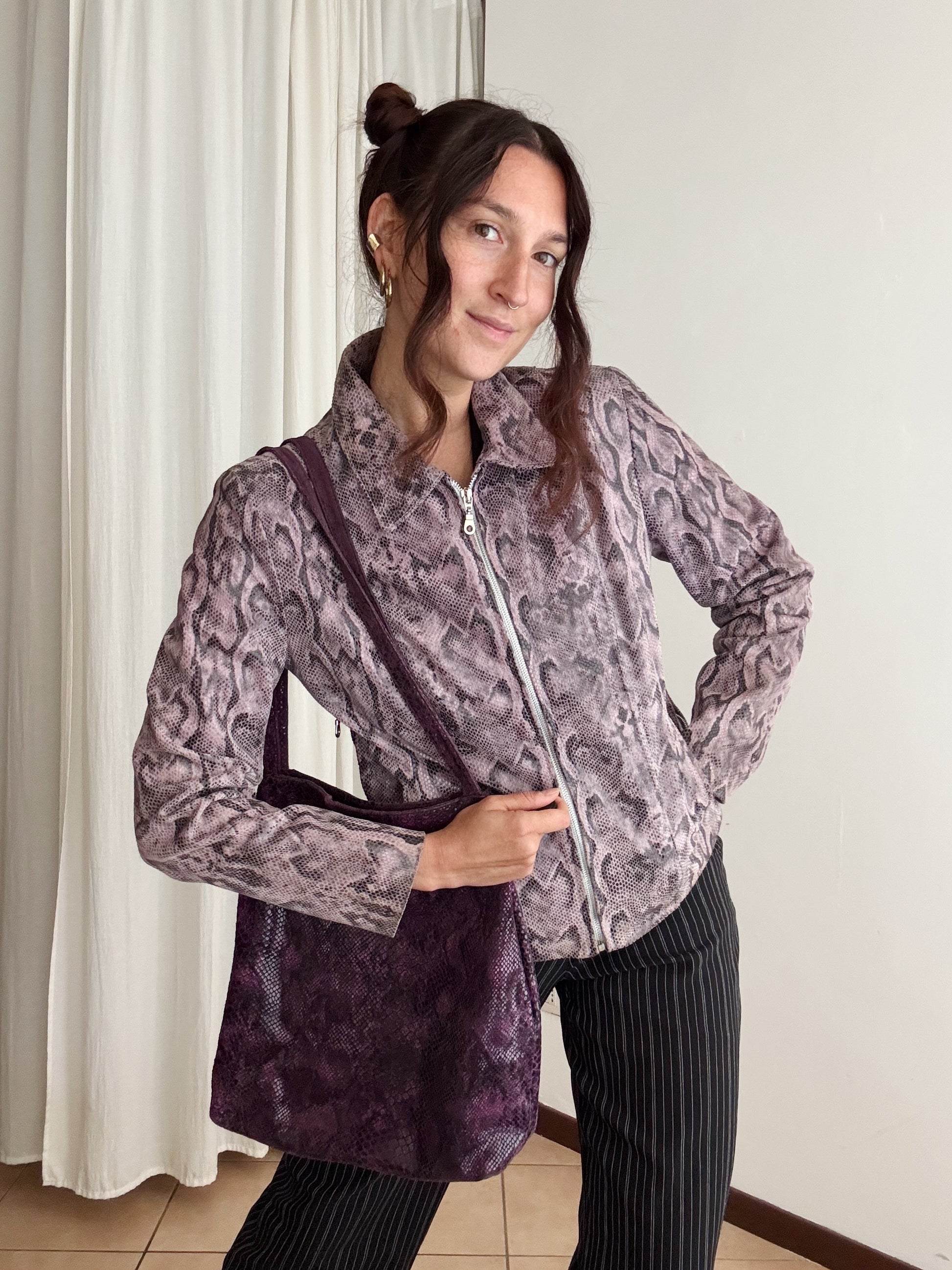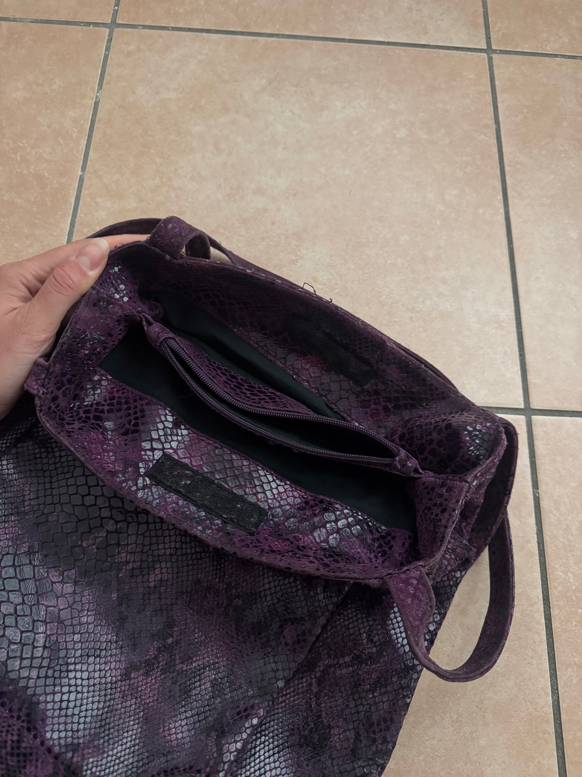 Borsa vintage viola in pelle vera con stampa serpente. Condizione 7/10, manca la zip della tasca interna e il velcro della taschina esterna si è staccato. Si presenta comunque bene
