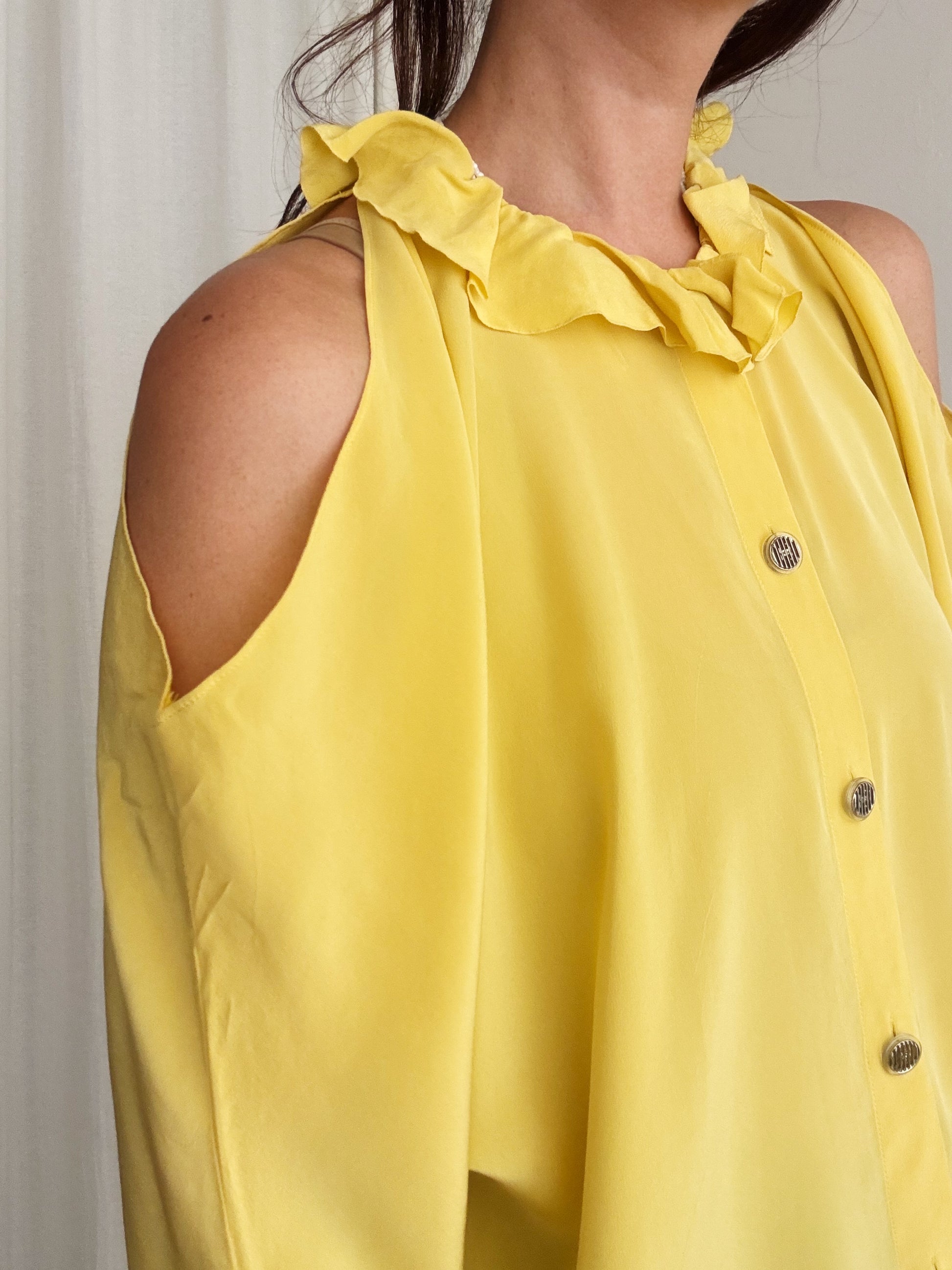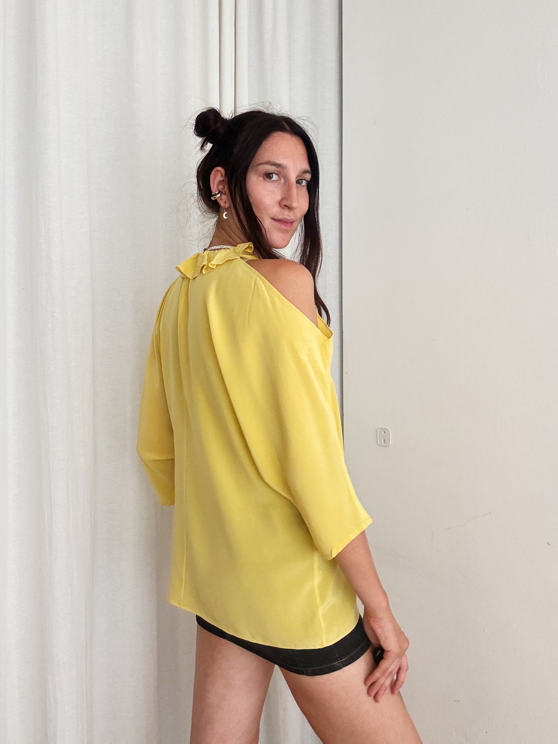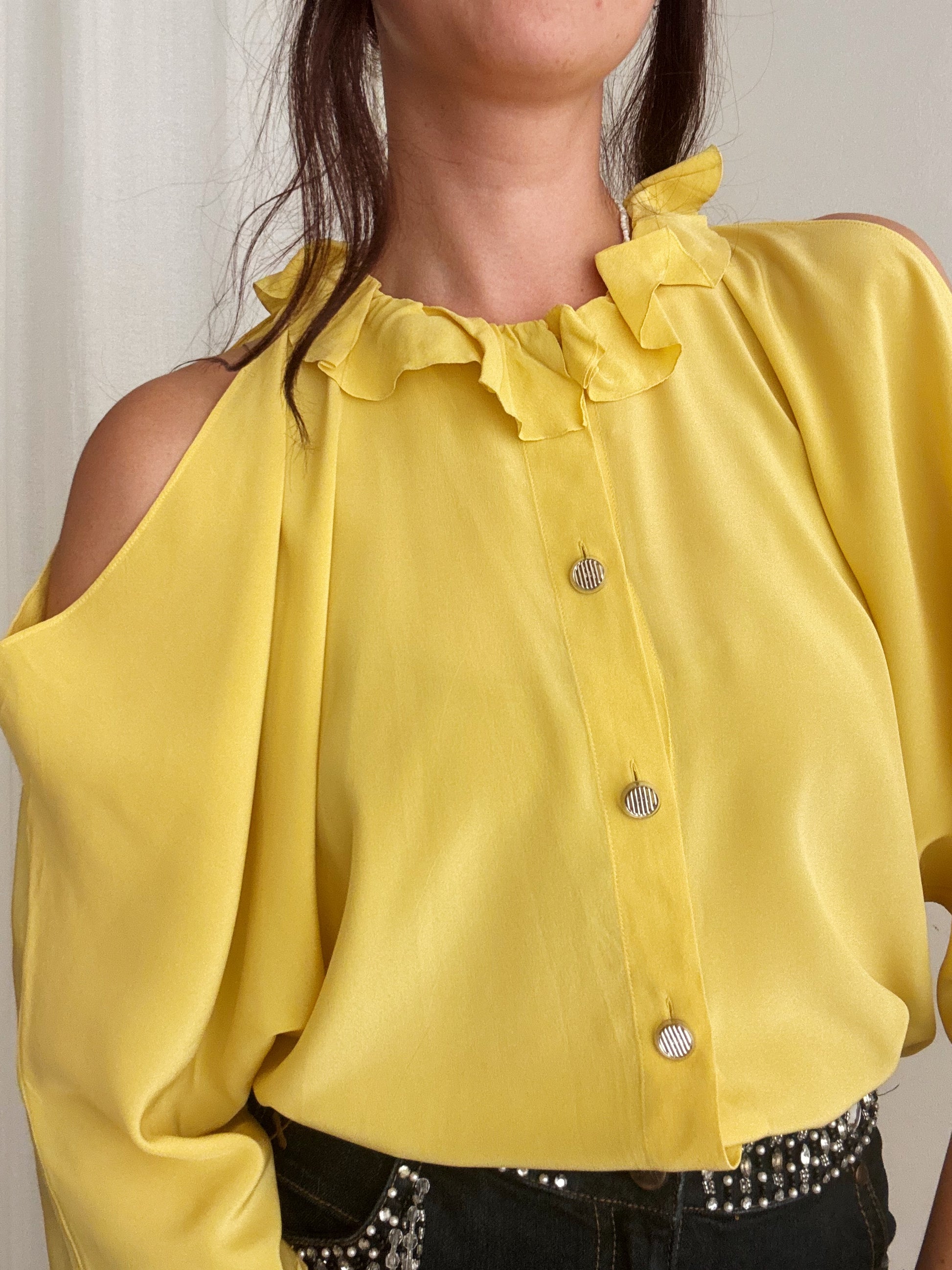 Camicia vintage in seta gialla con spalle scoperte e touches sul colletto. Taglia non riportata ma direi che veste fino a una L. Misure: ascelle circa 58, lunghezza 66
