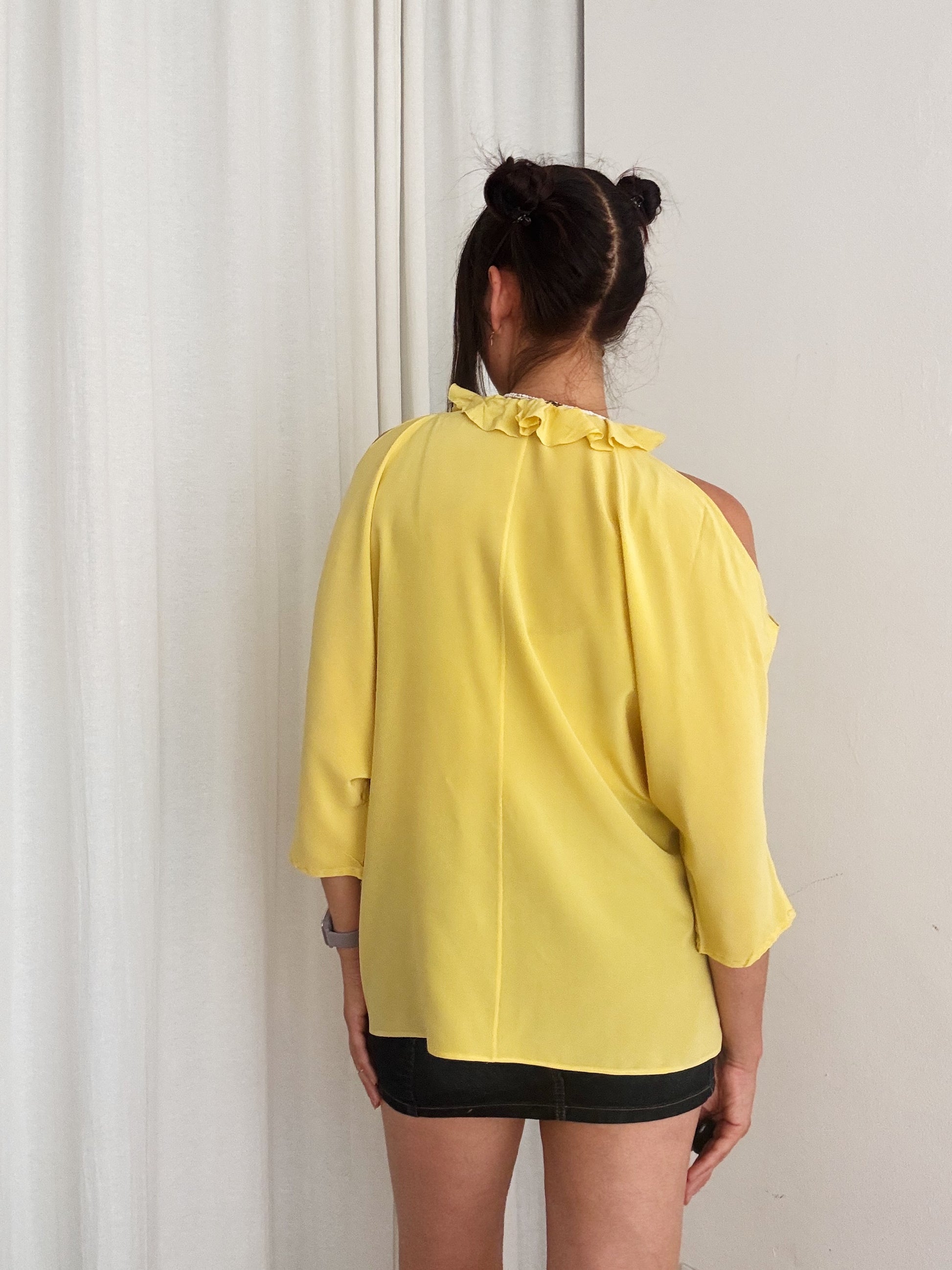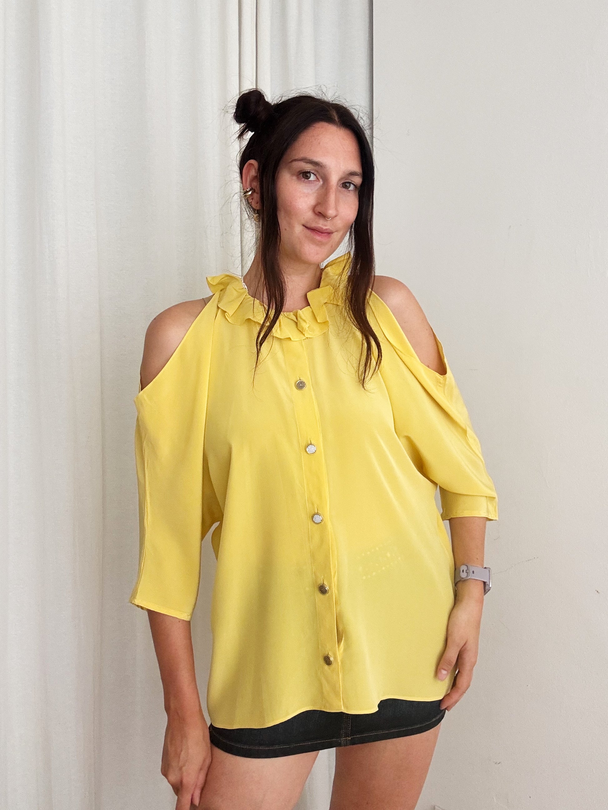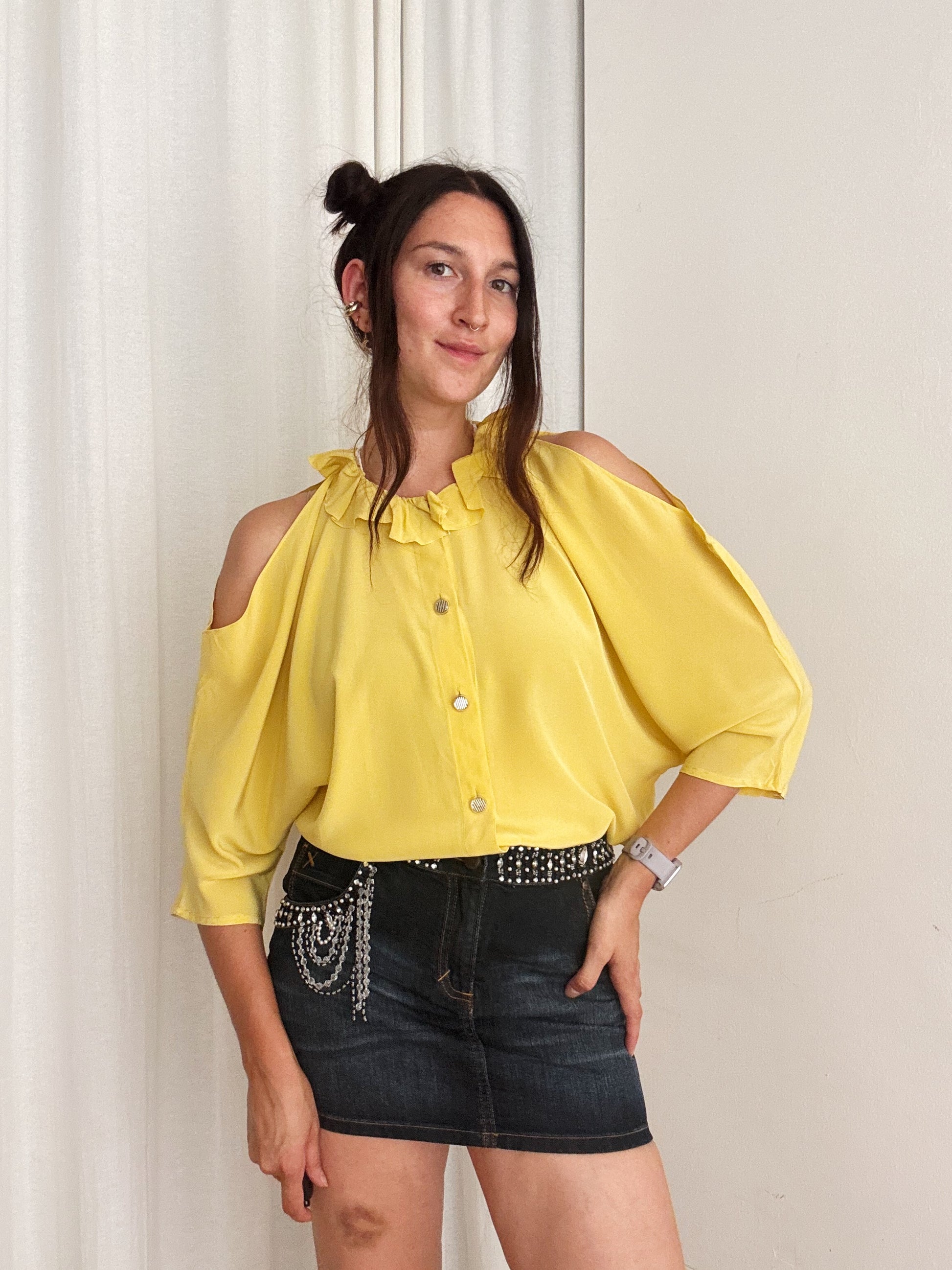 Camicia vintage in seta gialla con spalle scoperte e touches sul colletto. Taglia non riportata ma direi che veste fino a una L. Misure: ascelle circa 58, lunghezza 66