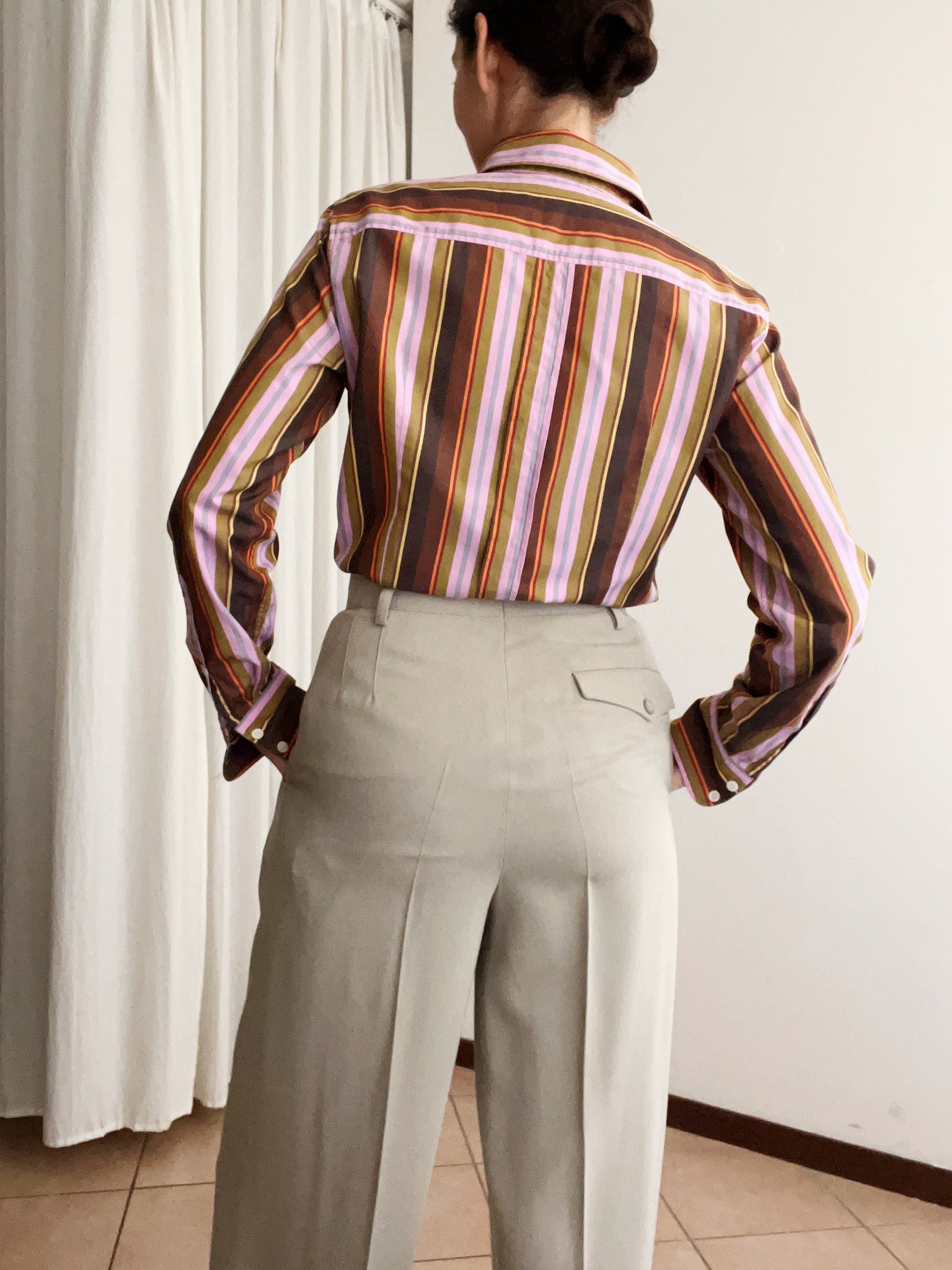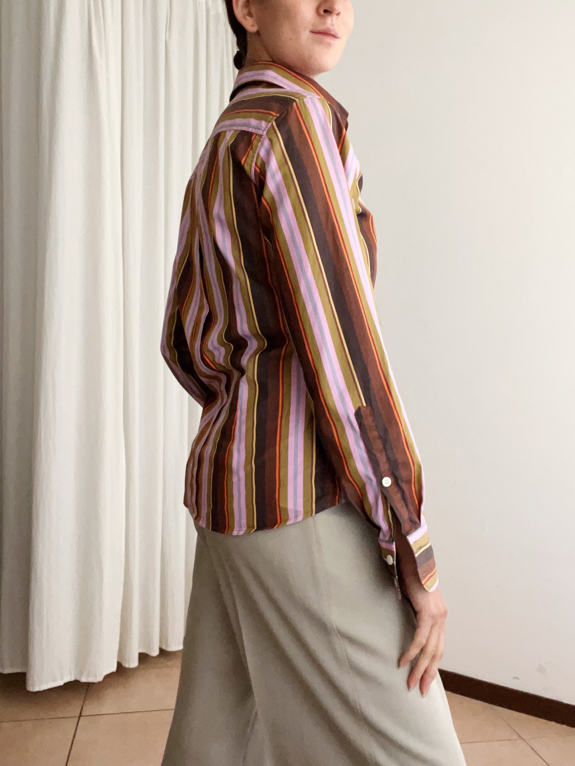 Camicia Bogner a righe nei toni del lilla e marrone in 100% corone. Taglia 40 tedesca quindi 44 italiana. Misure: spalle 42, ascelle 49, maniche 62, lunghezza 65. Prezzo nuova 275€