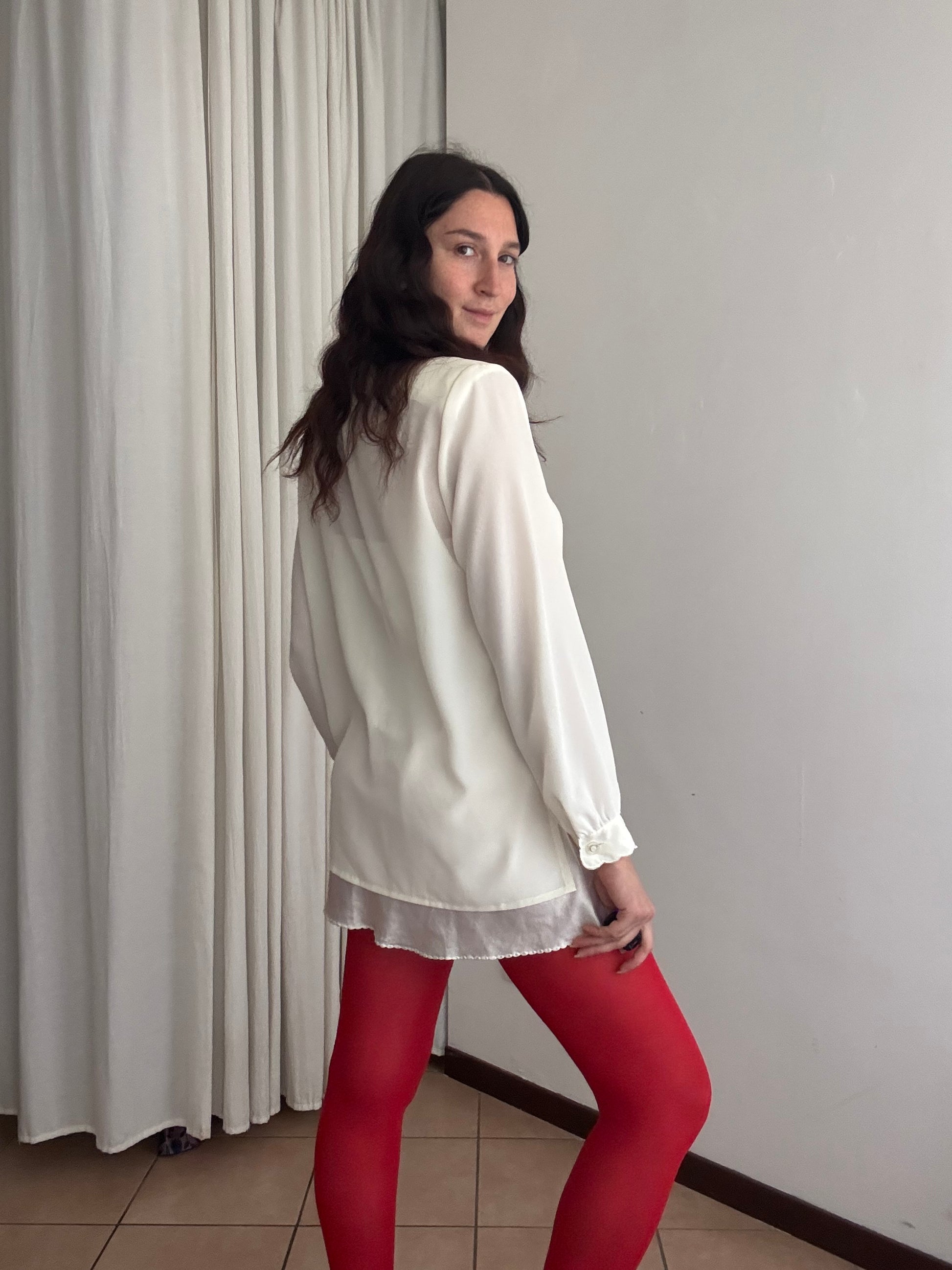 Camicia vintage bianca con farfalle ricamate, taglia riportata 42/44. Misure: spalle 40, ascelle 53, maniche 61, lunghezza 72. Ad alcuni bottoni manca il centro in madreperla (vedi ultima foto)