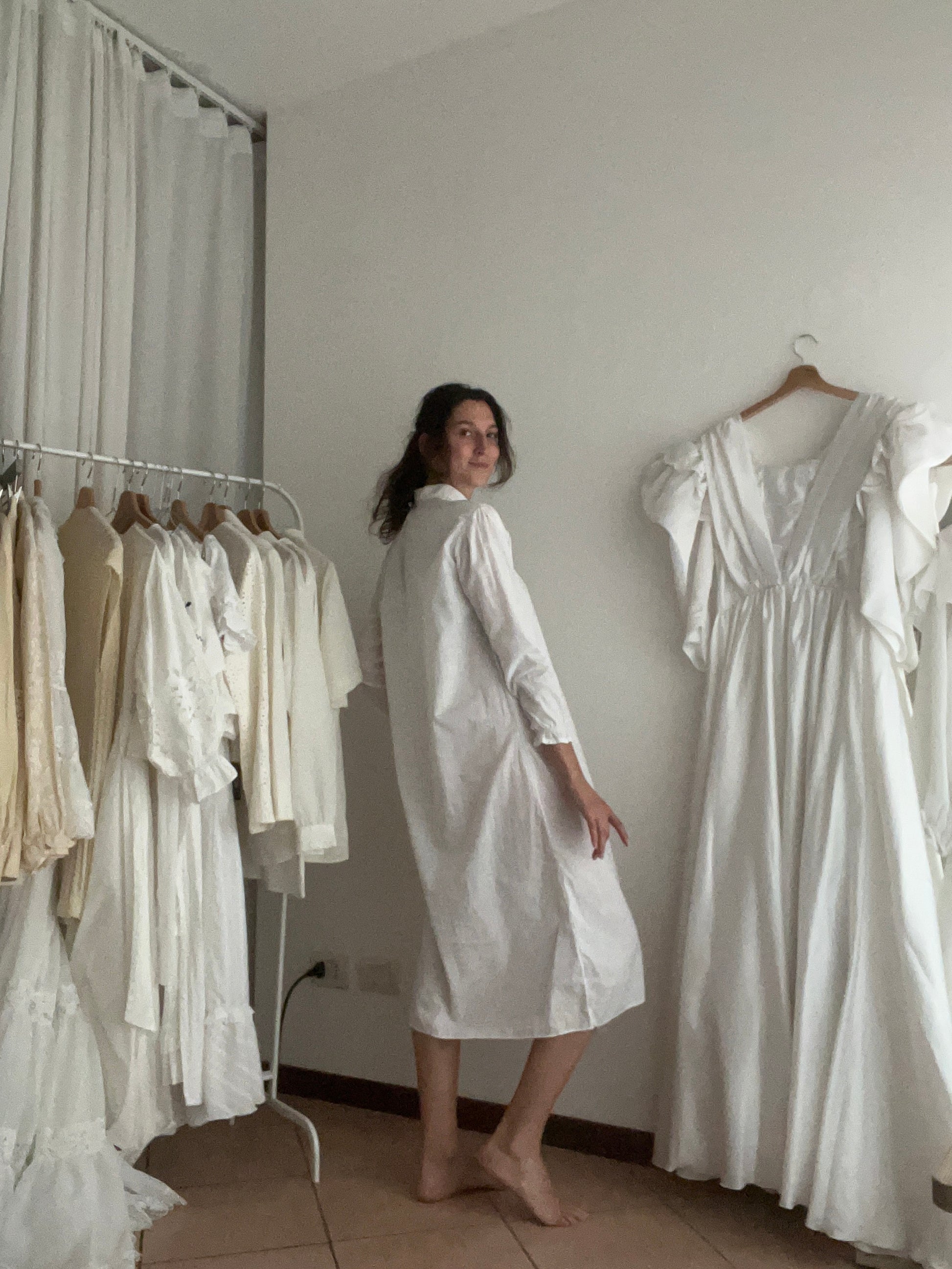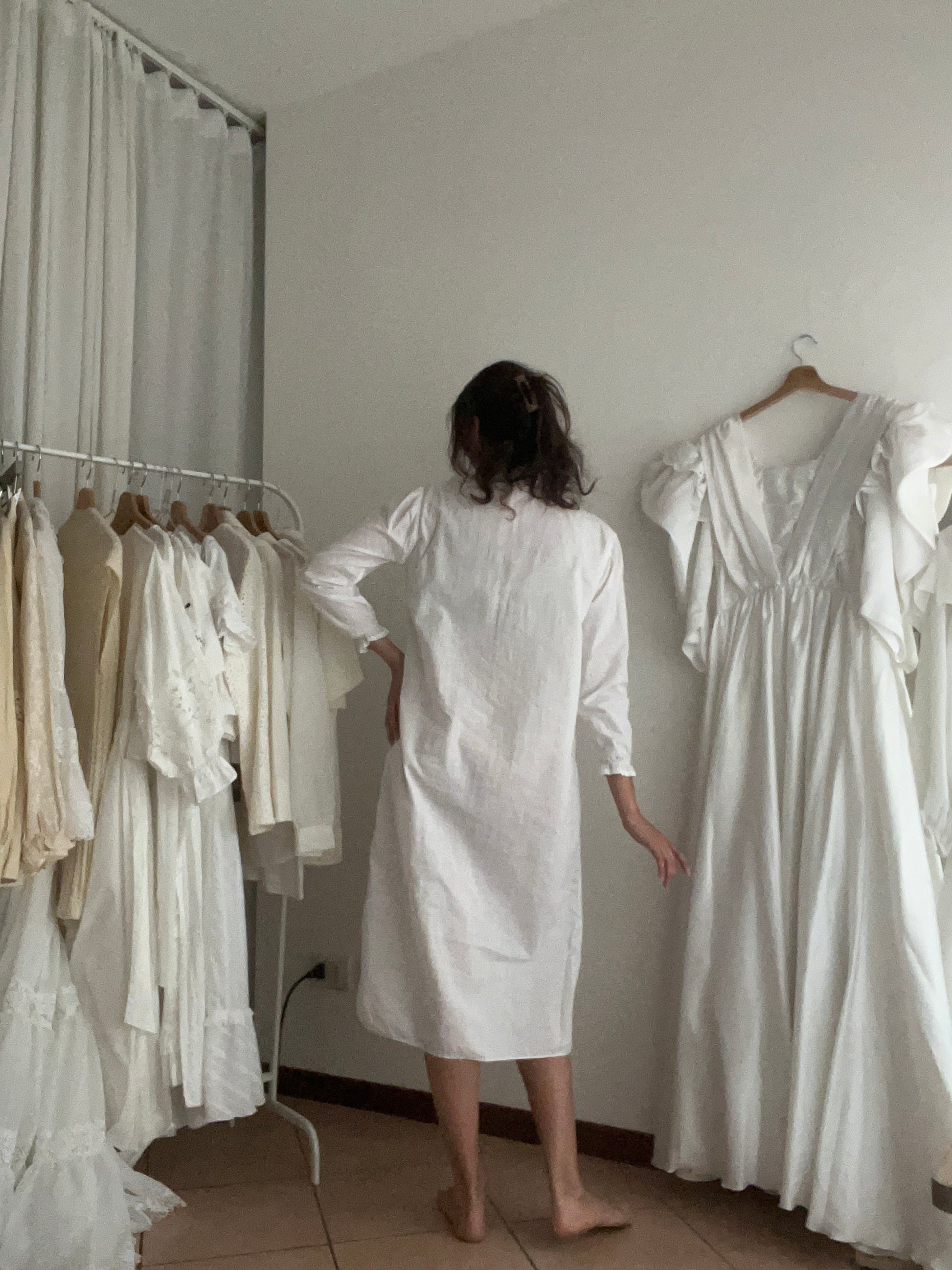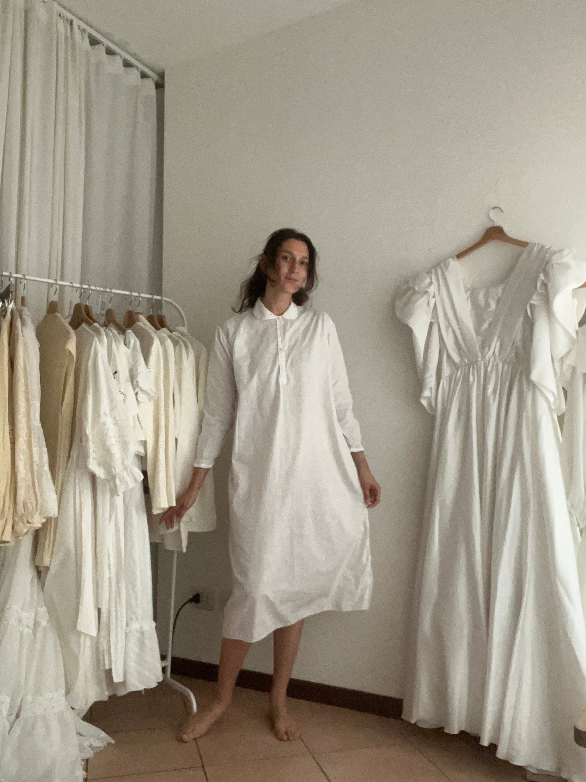 Camicia da notte vintage, veste fino a una taglia M. Bianca con fiorellini ricamati e pizzi. Misure: spalle 42, ascelle 54, lunghezza 100. Macchietta nel retro del collo causata dalla colla dell’etichetta + lineette rosse sul davanti, difetto di fabbrica. 65% cotone