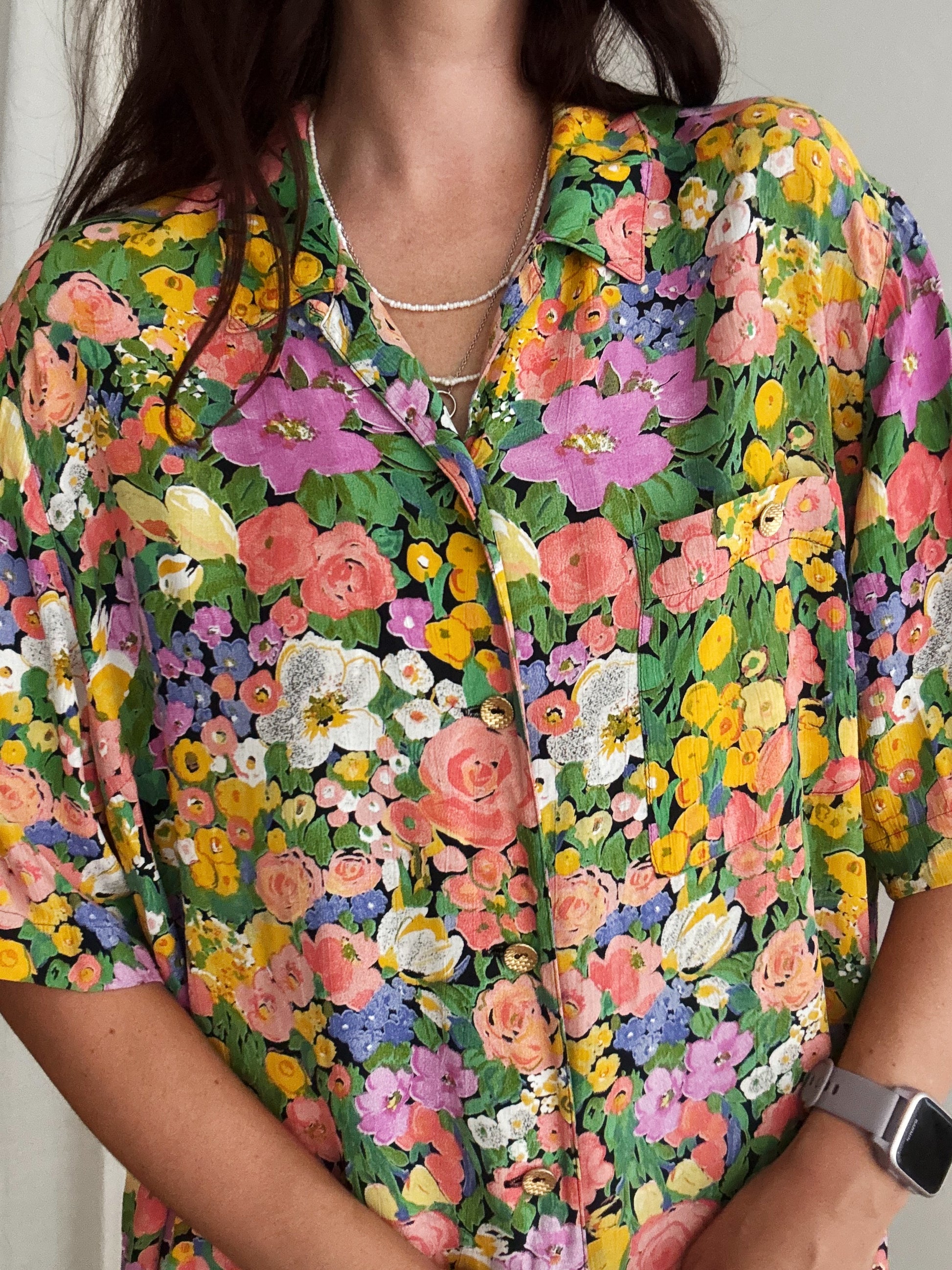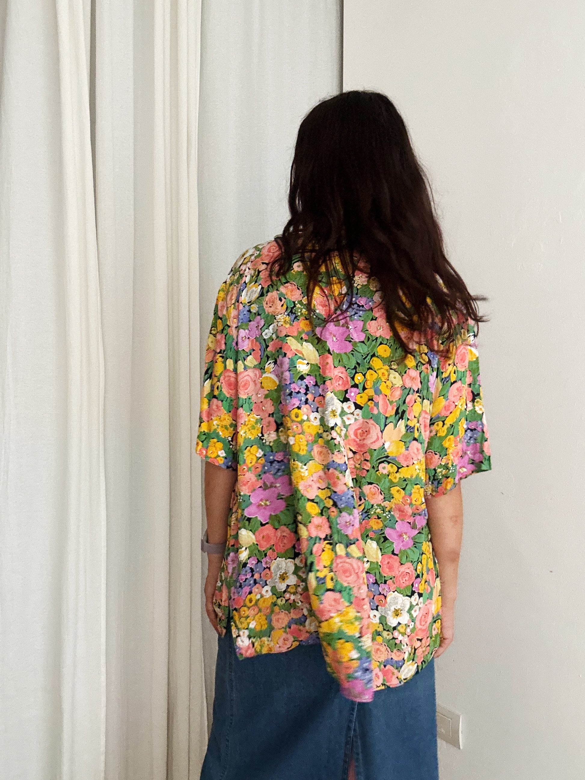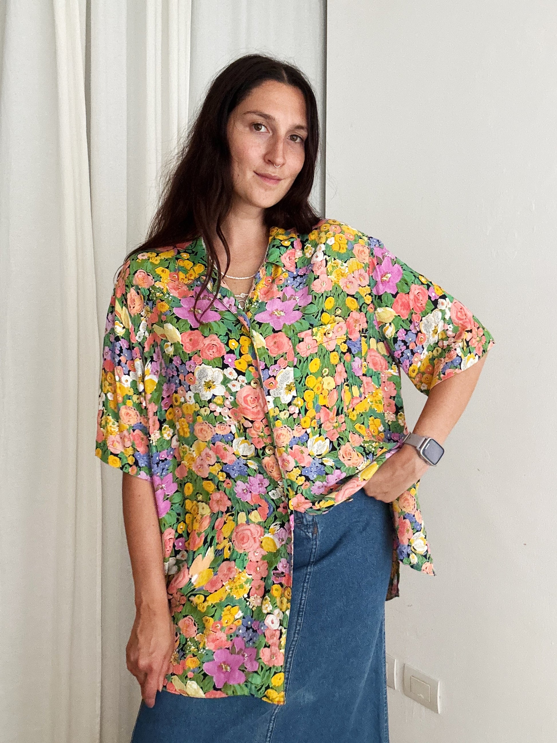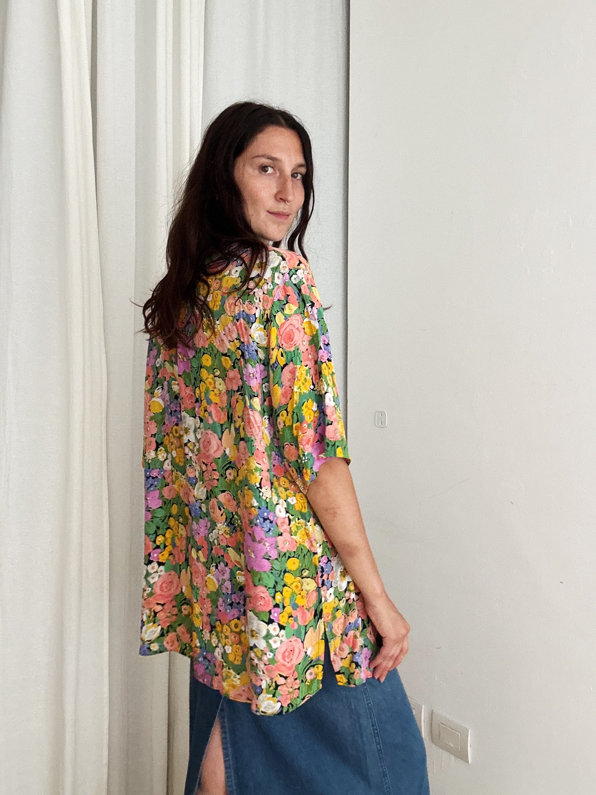 Camicia vintage floreale in viscosa taglia 48. Spalle 48, ascelle 62, lunghezza 78.