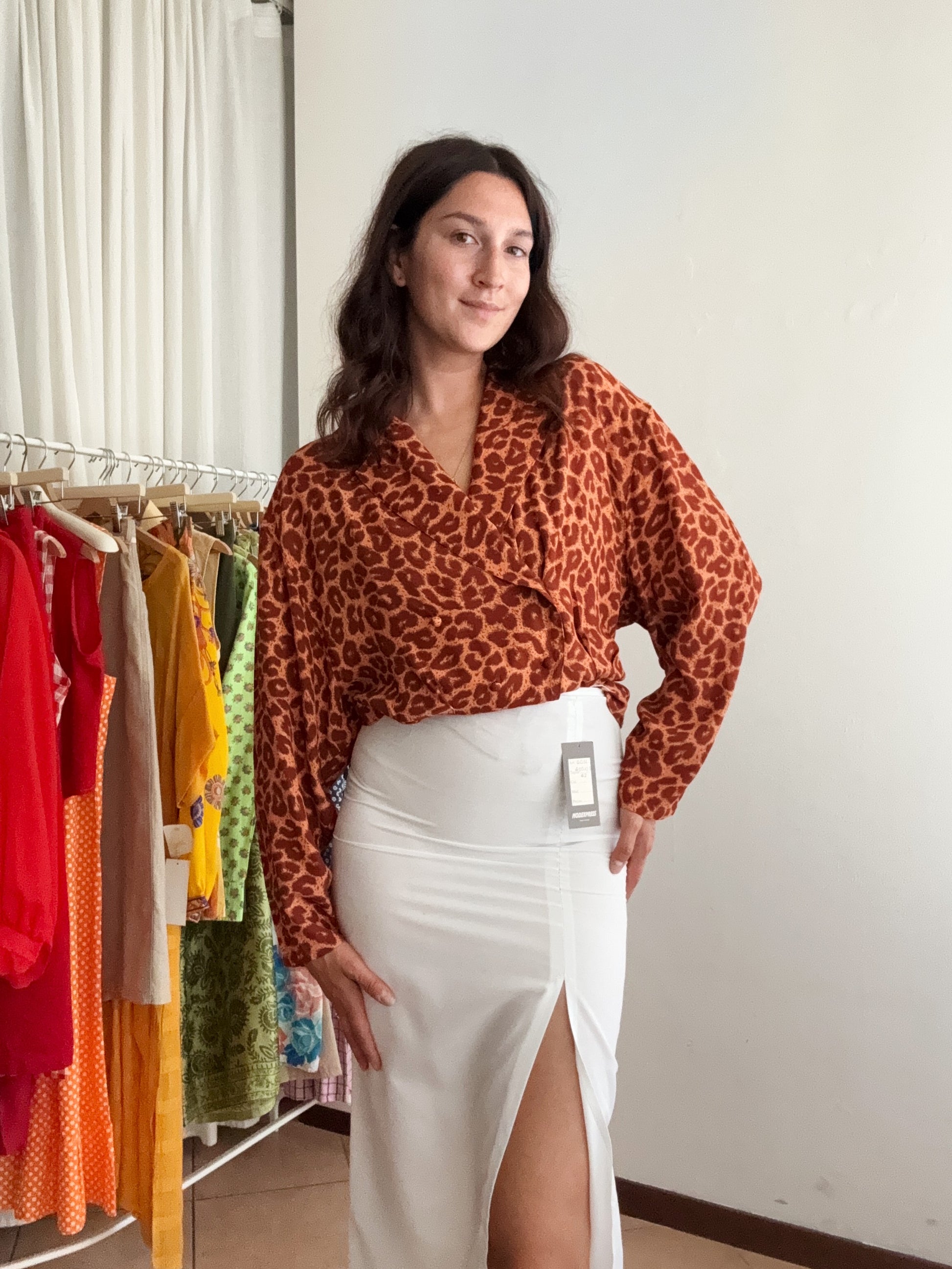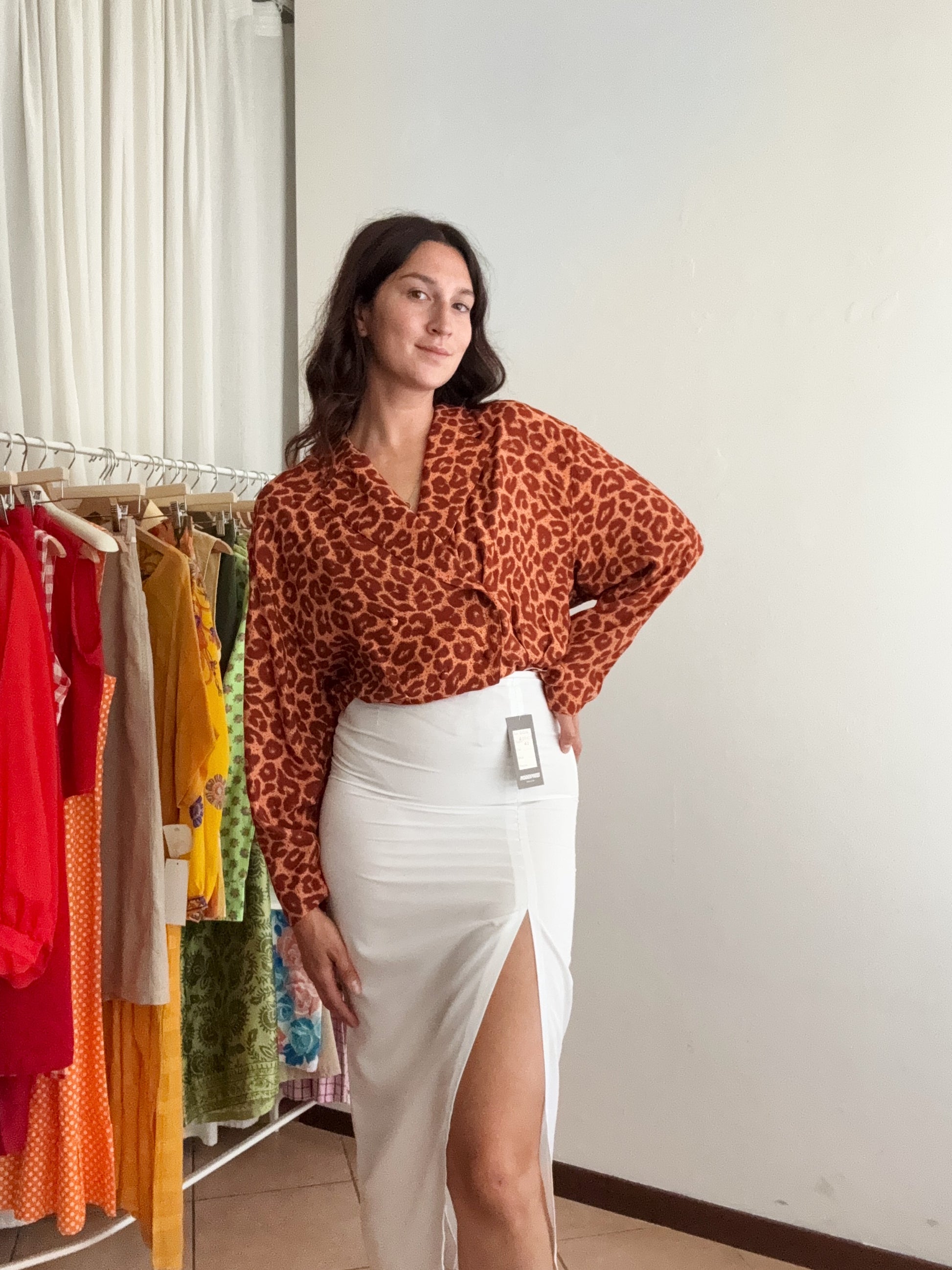 Camicia vintage arancione con stampa leopardata. Taglia 6, veste fino a una L/XL. Misure: spalle 53, ascelle 57. In vita si regola a piacere con i laccetti posteriori
