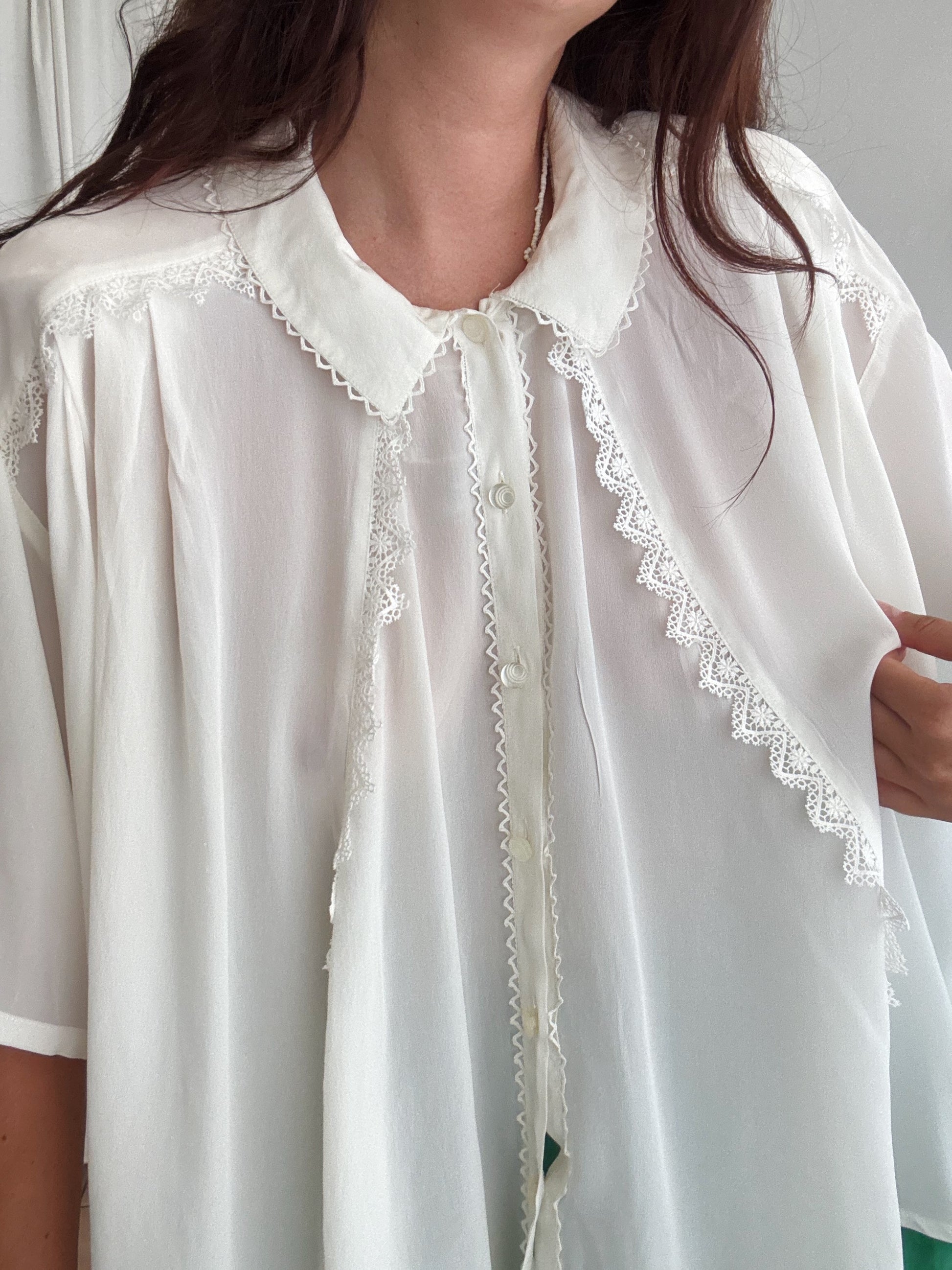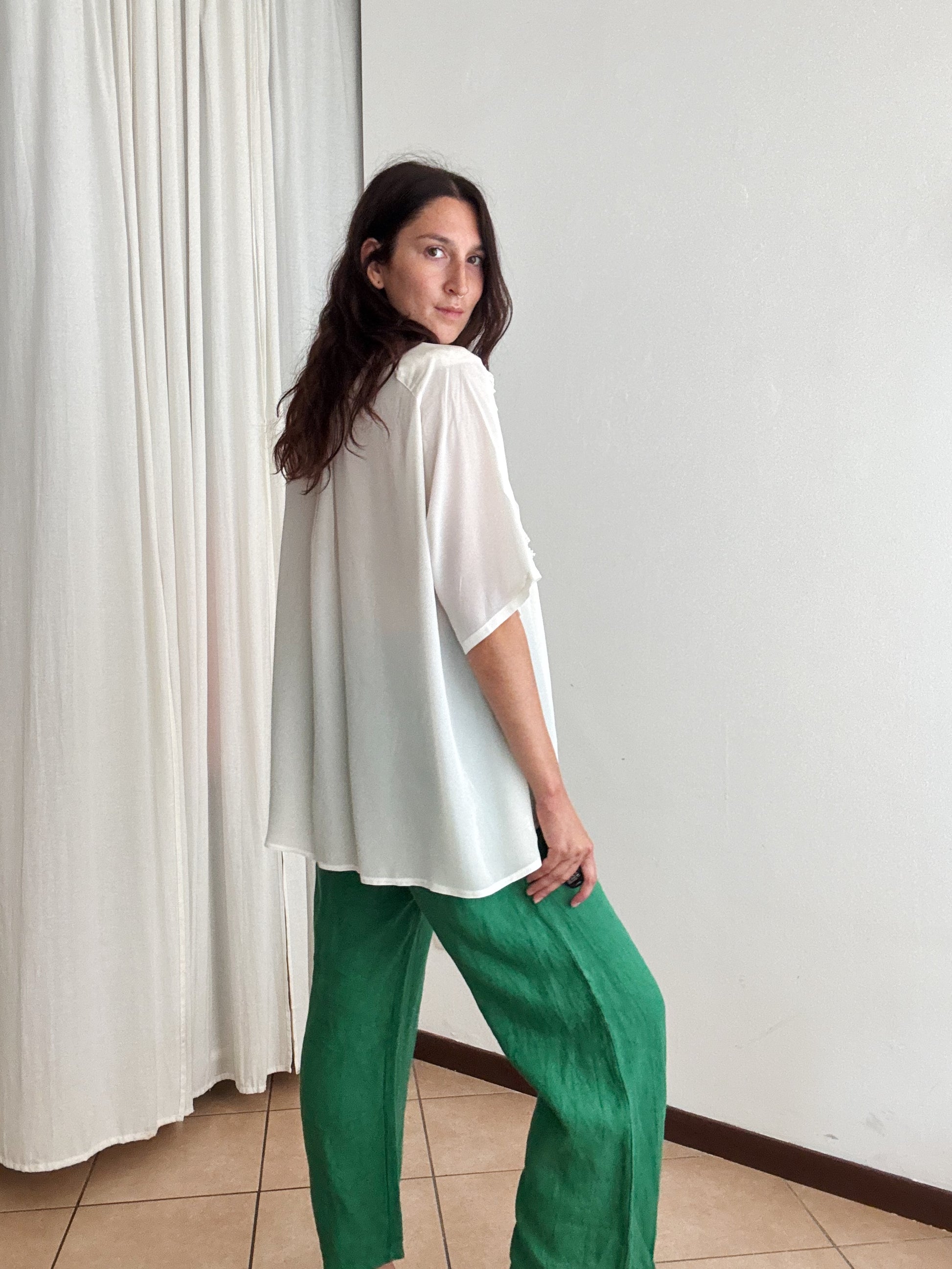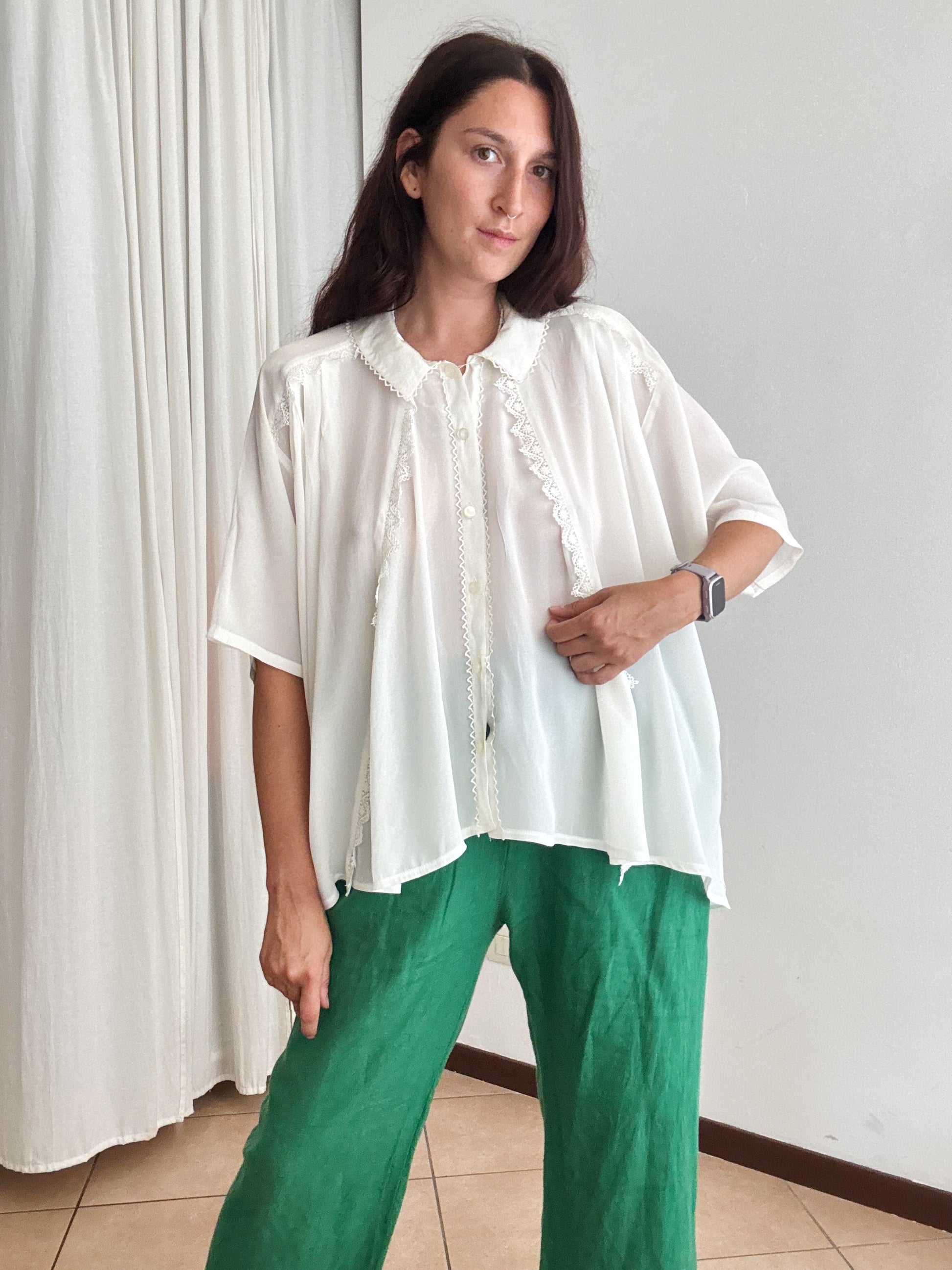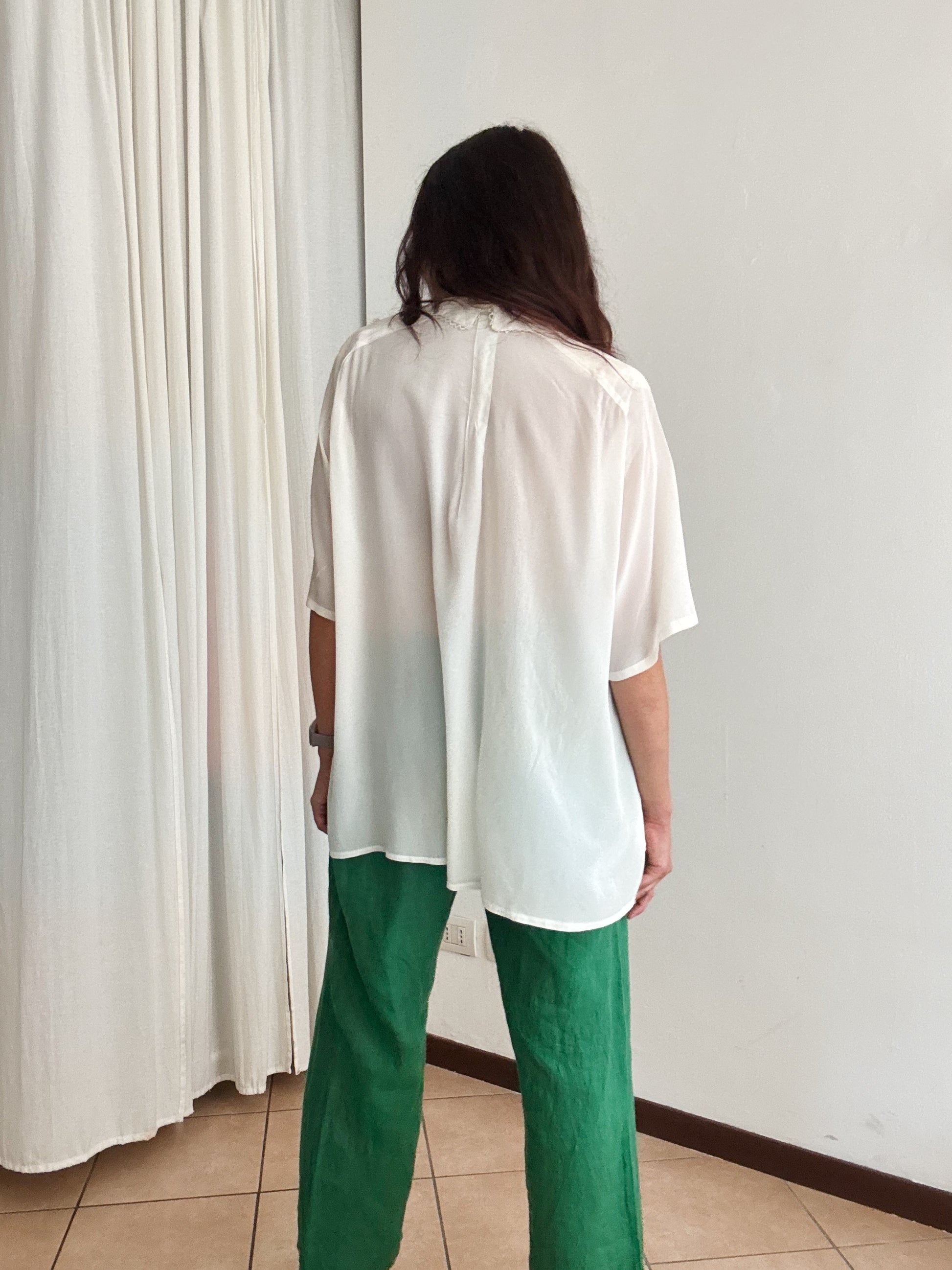Camicia vintage in misto seta bianca, veste taglia XL ed è super ampia. Misure: ascelle 75, lunghezza 65