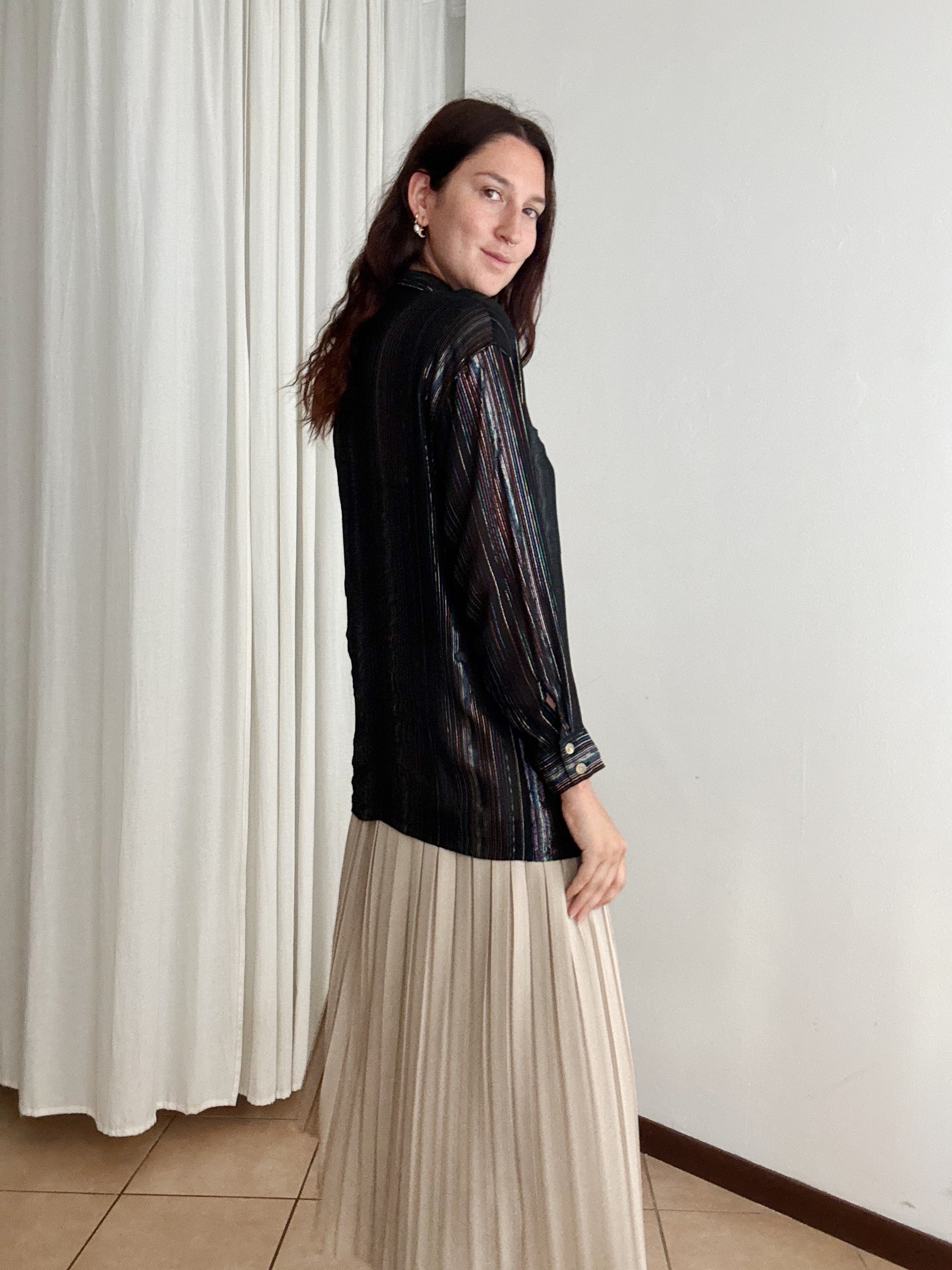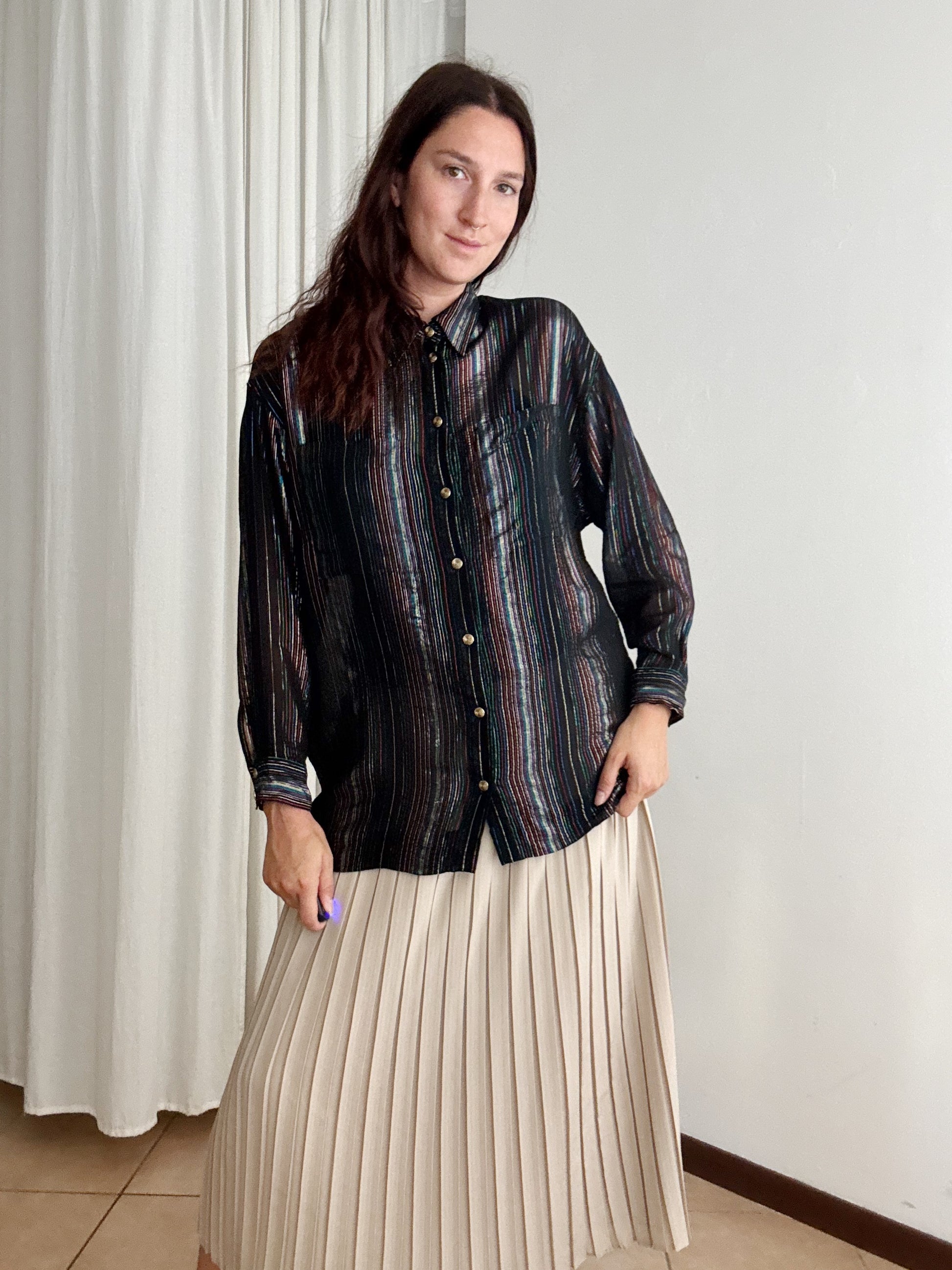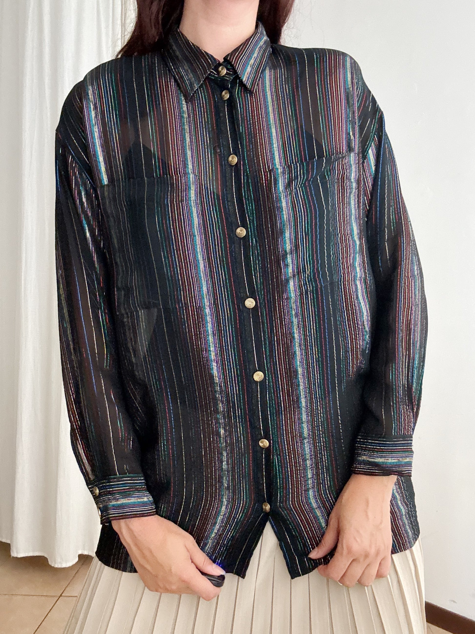 Camicia vintage nera semi trasparente con fili in lurex colorati, taglia 44 ovvero 48 italiana. Misure: spalle 51, ascelle 56, maniche 50, lunghezza 72.