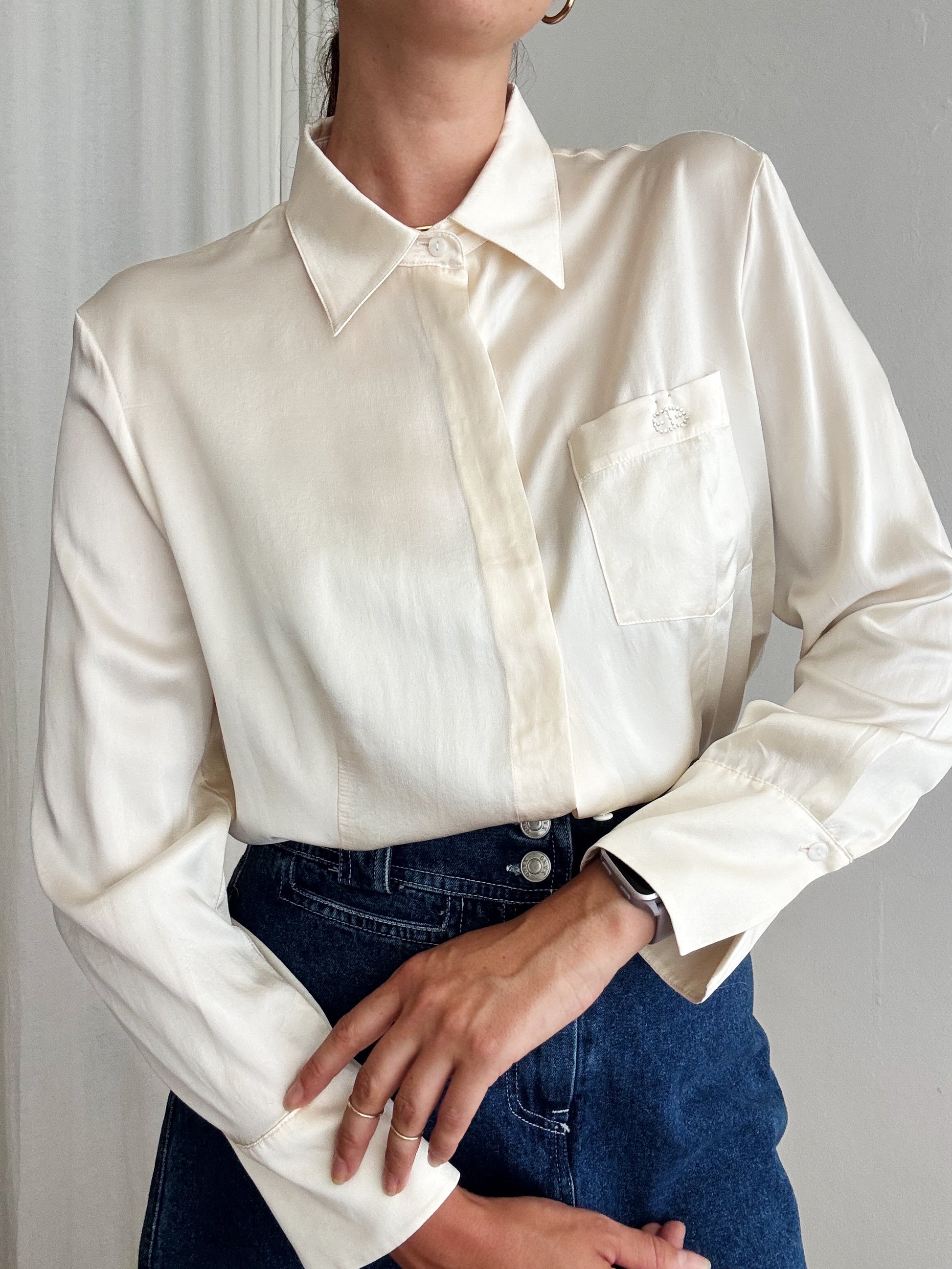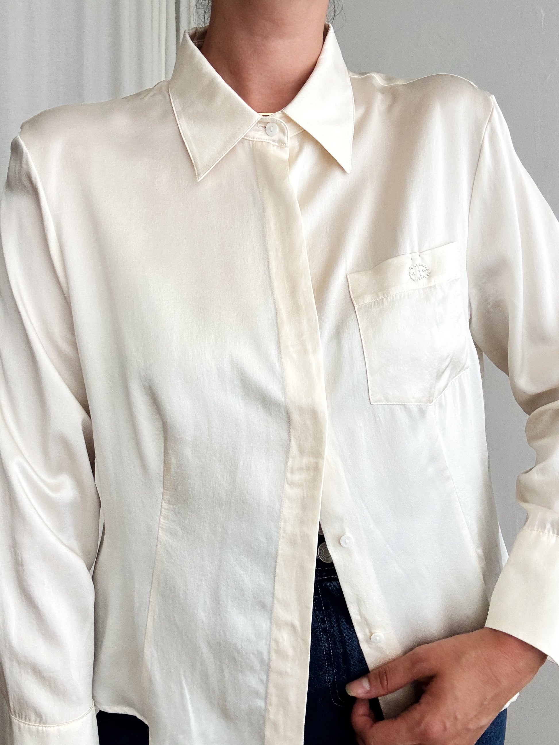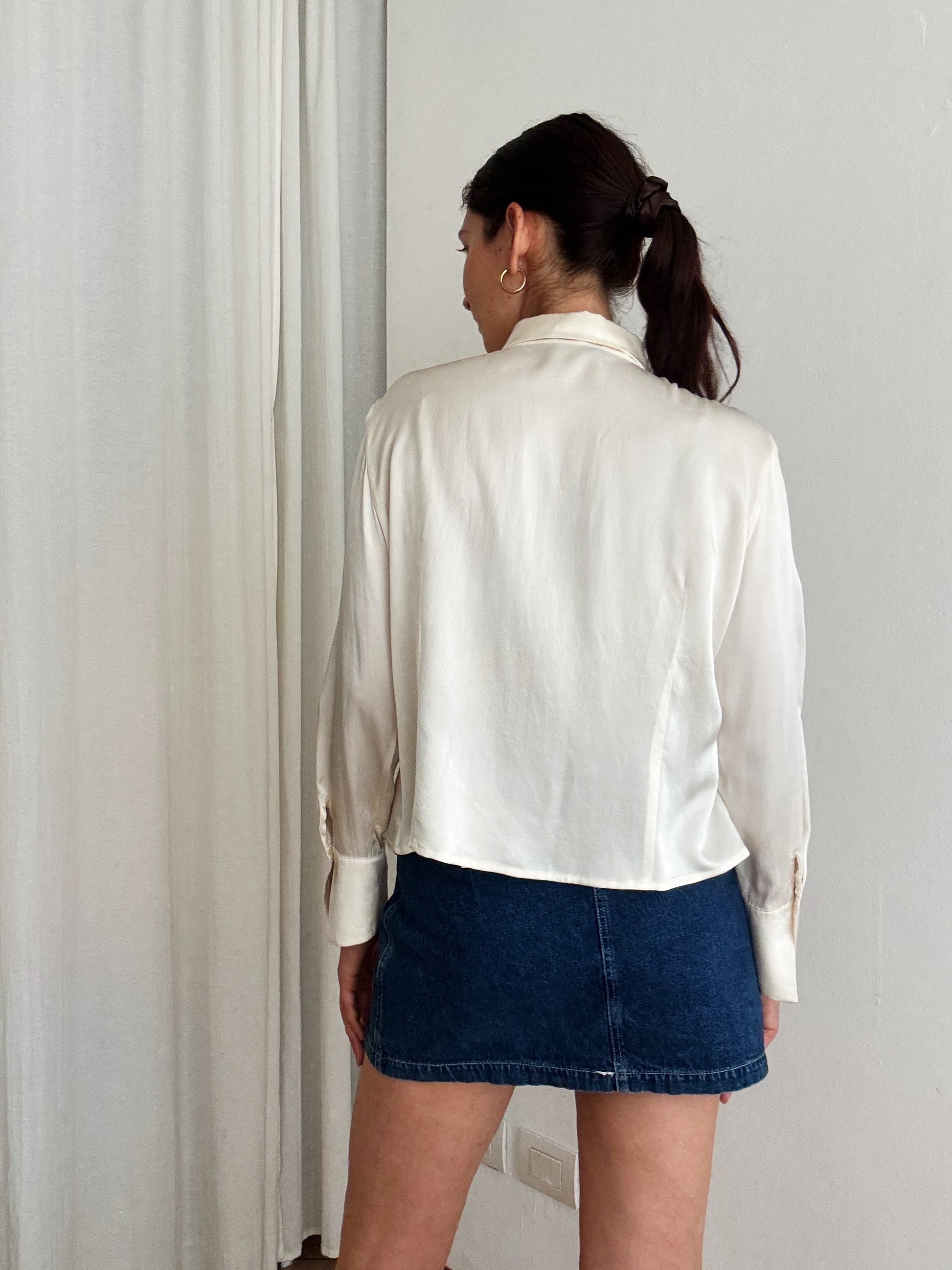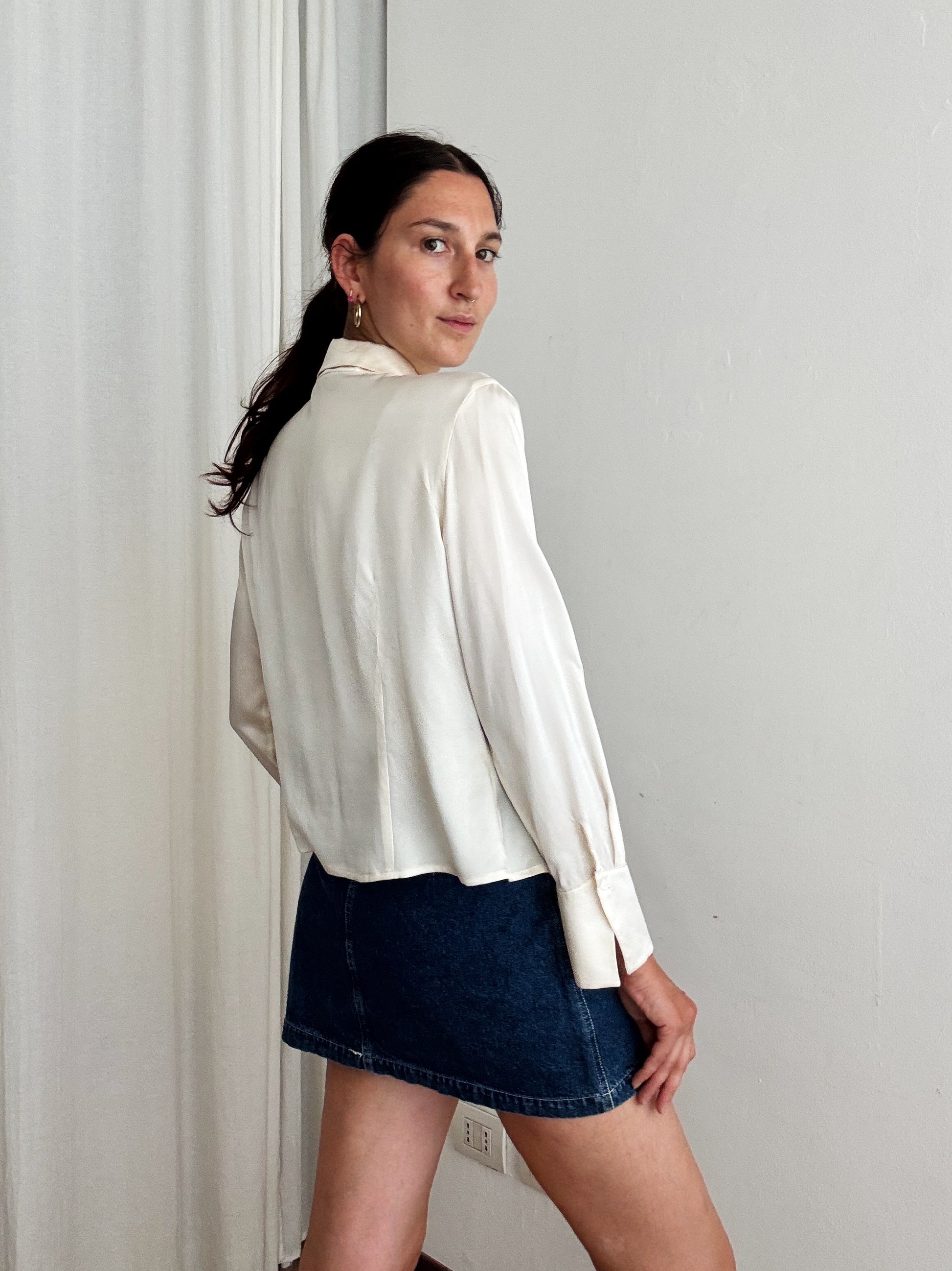 Camicia vintage in raso di seta bianca, riporta taglia 50 ma per me veste meno. Consiglio a una L massimo. Misure: spalle 44, ascelle 54, maniche 57, lunghezza 58.