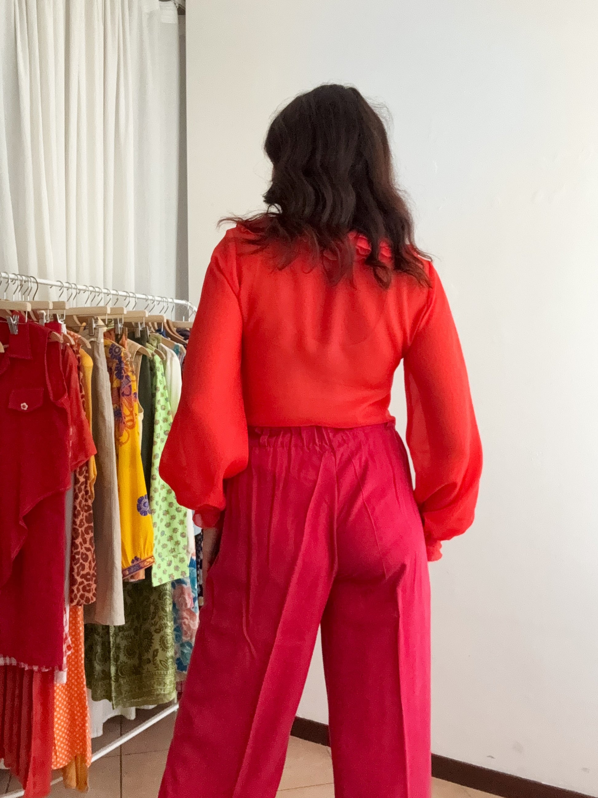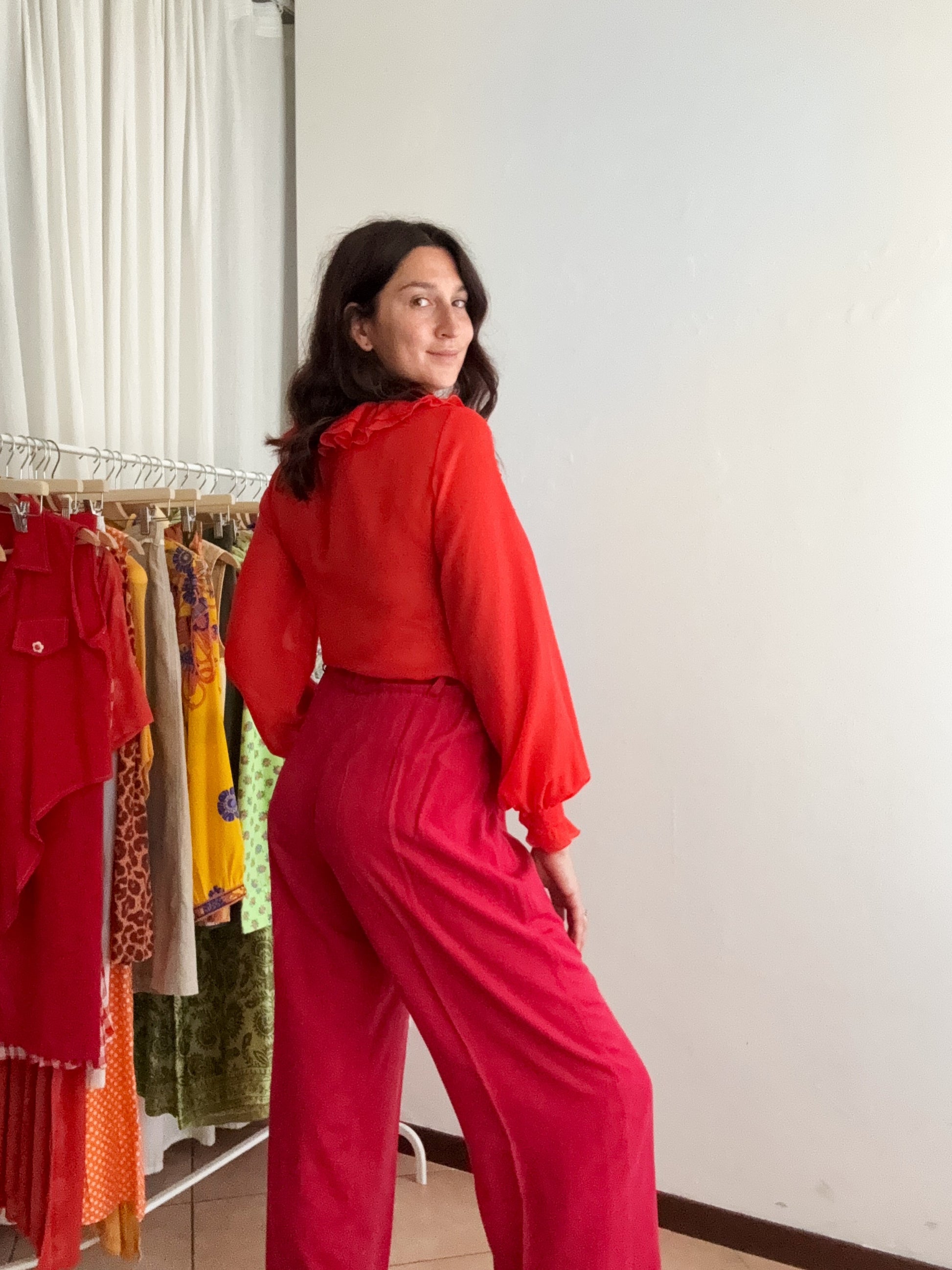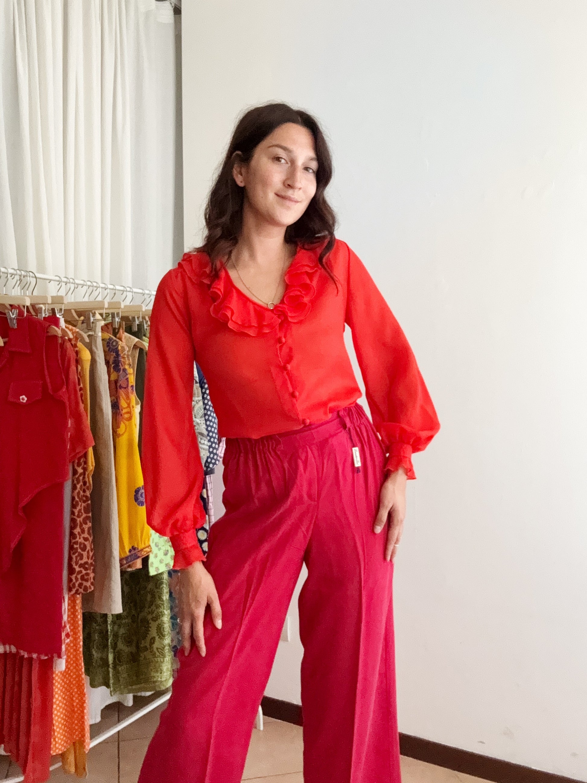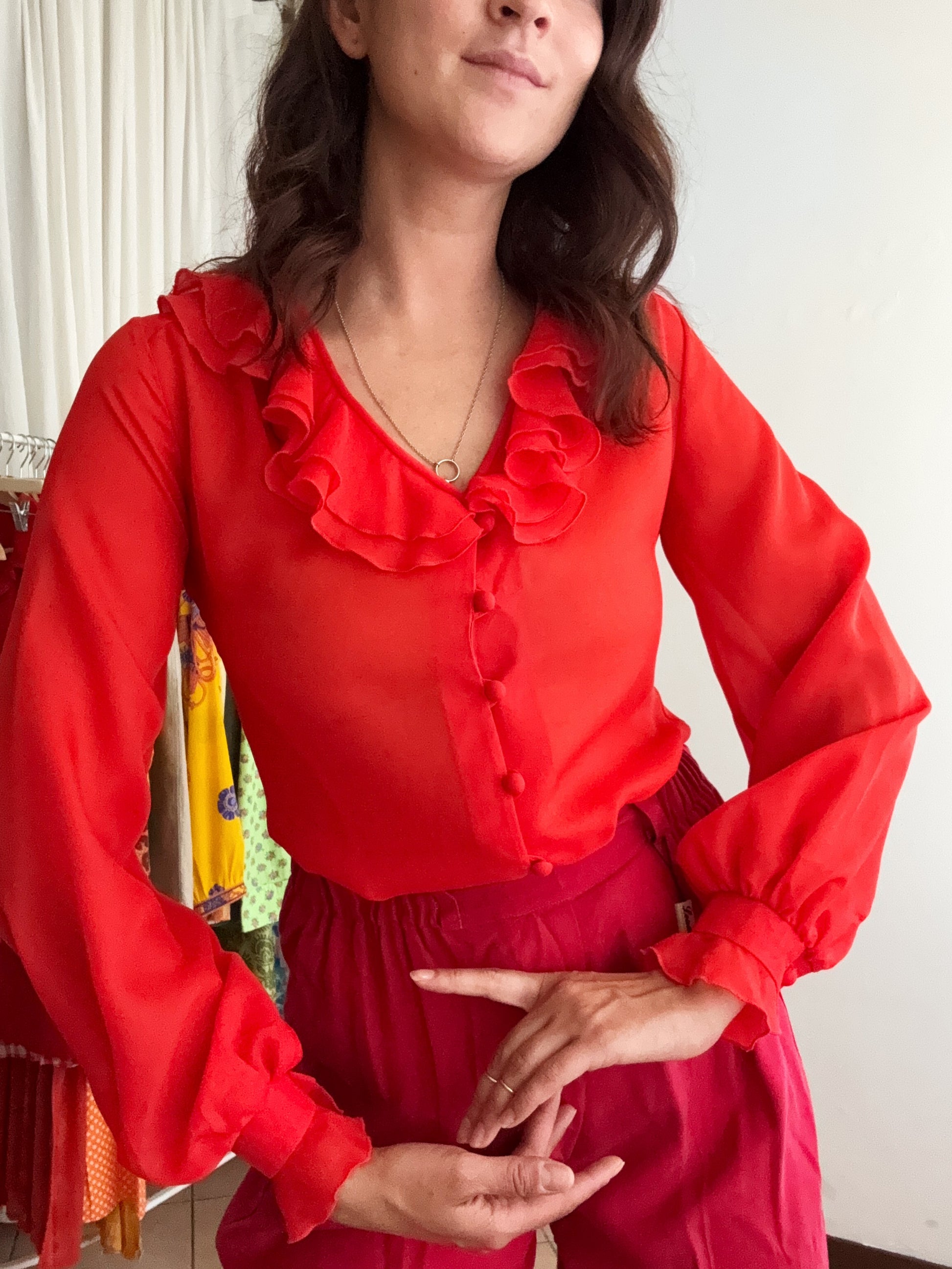 Camicia vintage rossa trasparente con rouches e maniche a sbuffo. Taglia 36, veste S. Misure: spalle 36, ascelle 46, maniche 62, lunghezza 60