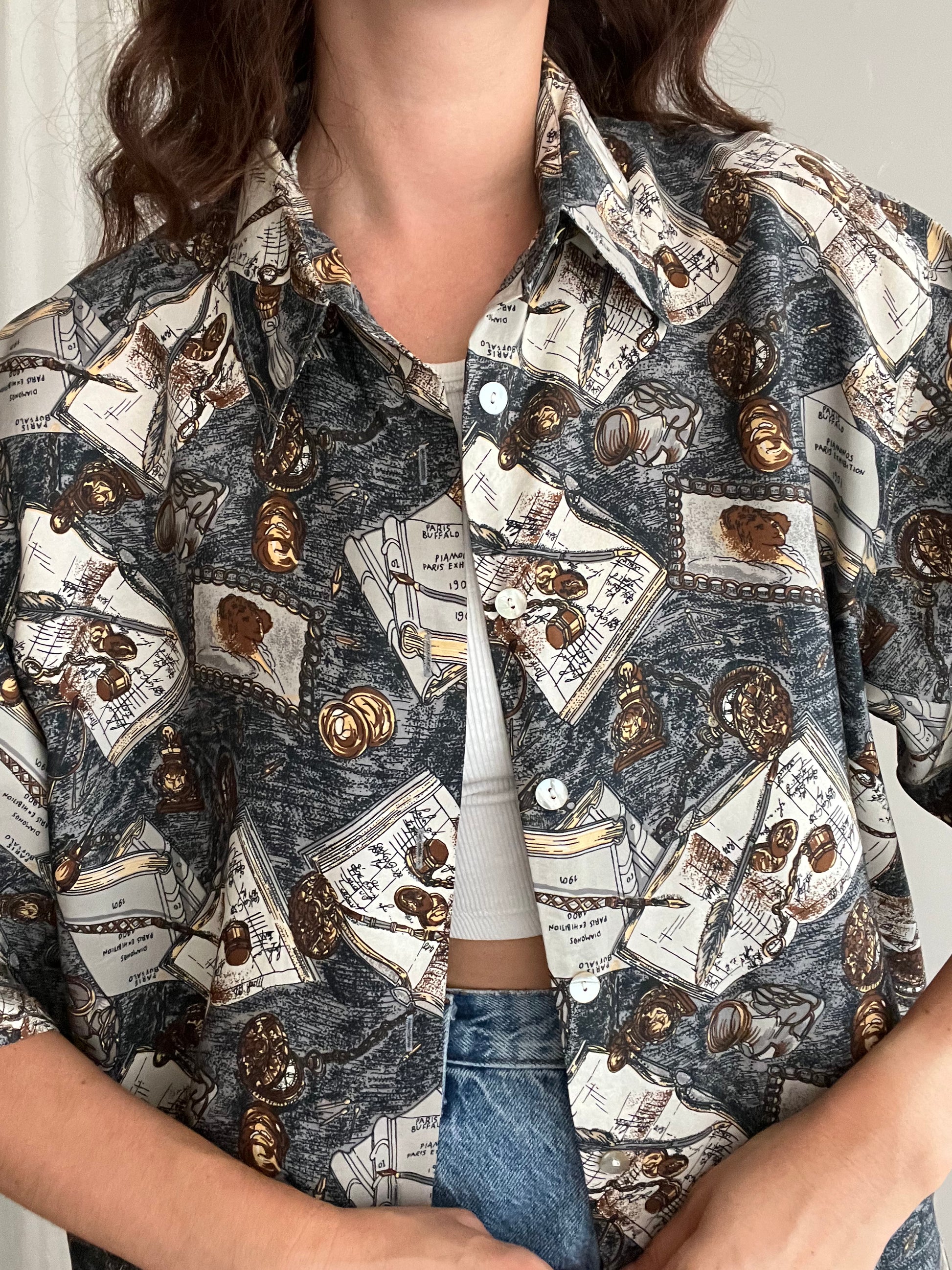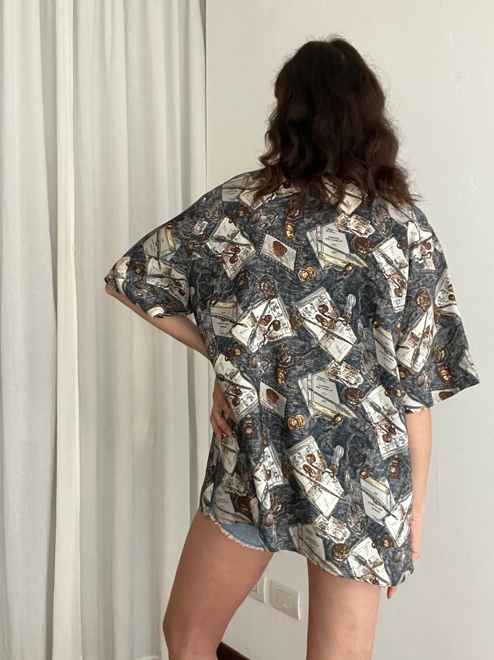 Camicia vintage in seta grigia con motivi di libri. Taglia 44. Misure: spalle 49, ascelle 61, lunghezza 73.