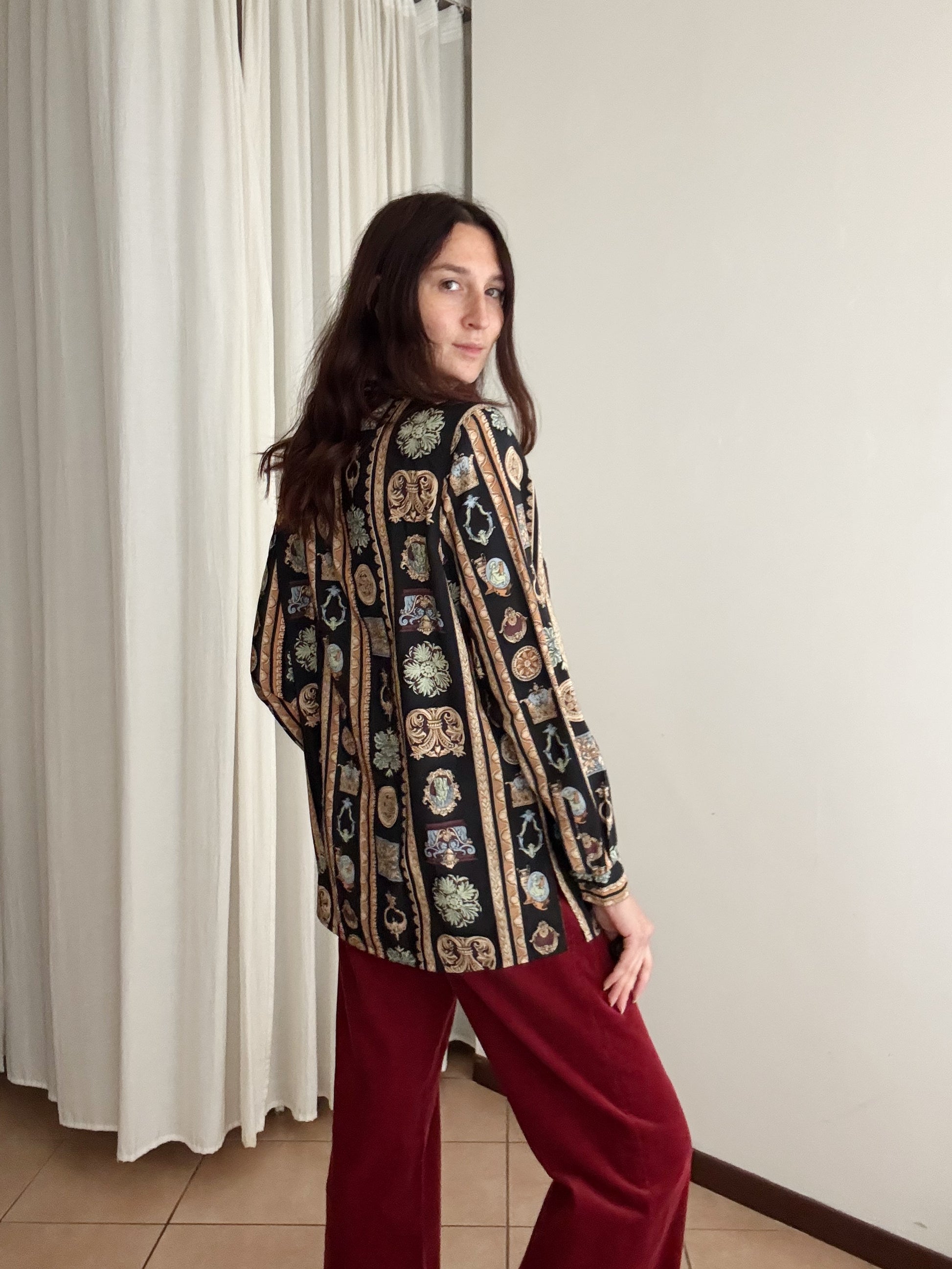 Camicia vintage con stampa taglia 48. Misure: spalle 43, ascelle 58, maniche 60, lunghezza 74