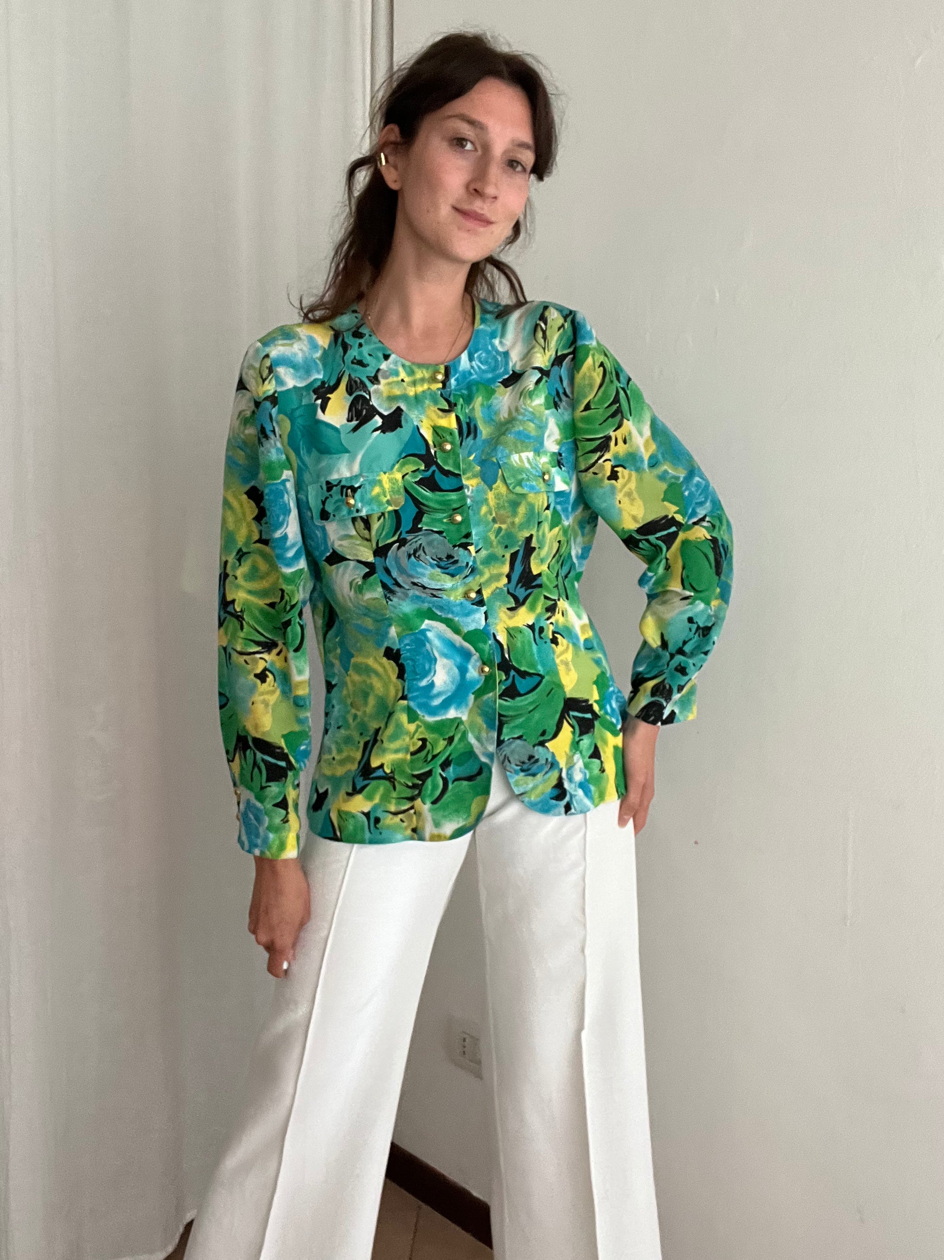 Camicia vintage verde con fiori stilizzati e bottoni dorati. Taglia 46. Misure: spalle 40, ascelle 51, maniche 58, lunghezza 63. 100% pes setificato