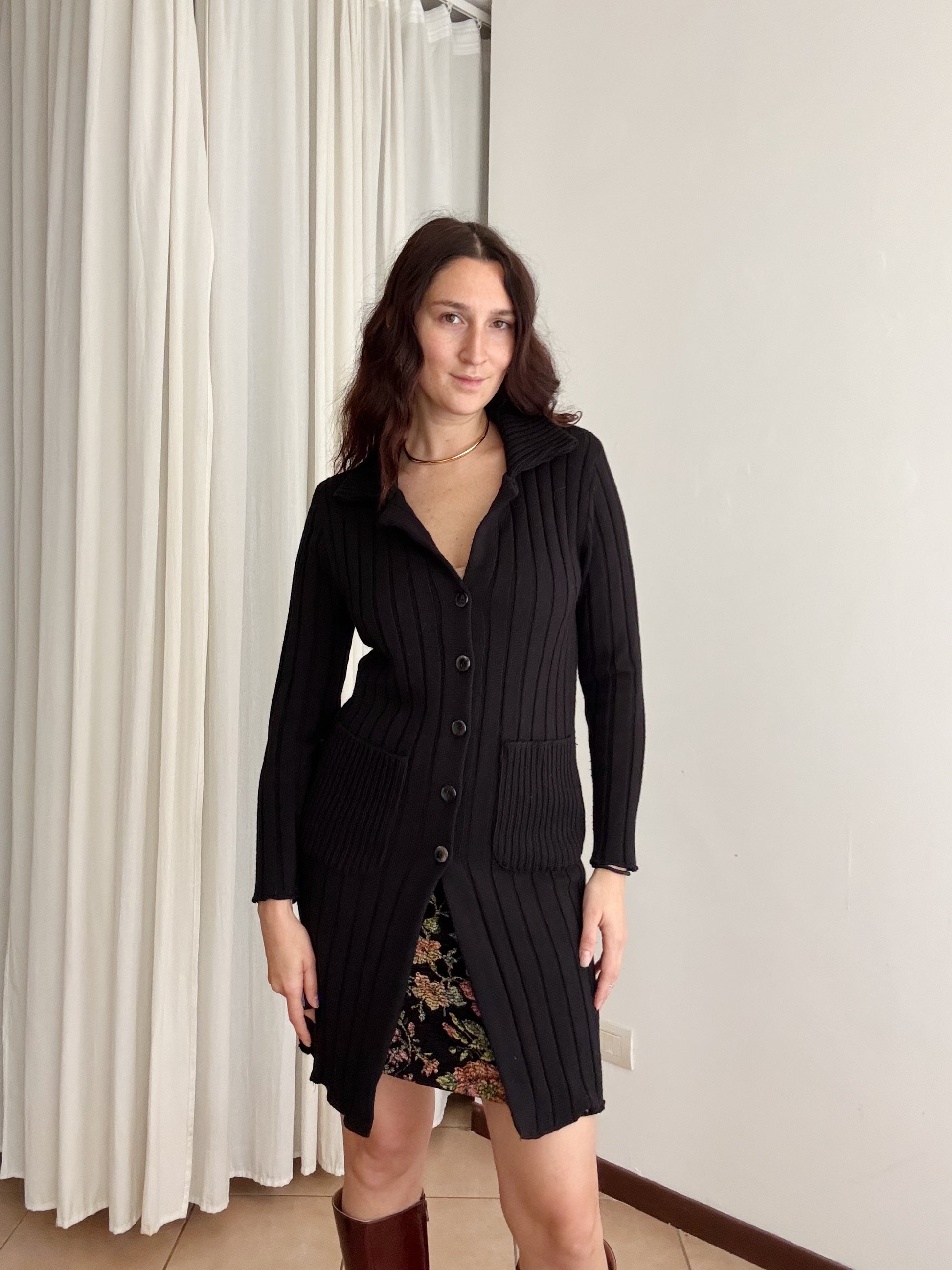 Maglione vintage nero in 100% lana taglia S firmato Nadine. Misure: spalle 40, ascelle 43, maniche 58, lunghezza 91.