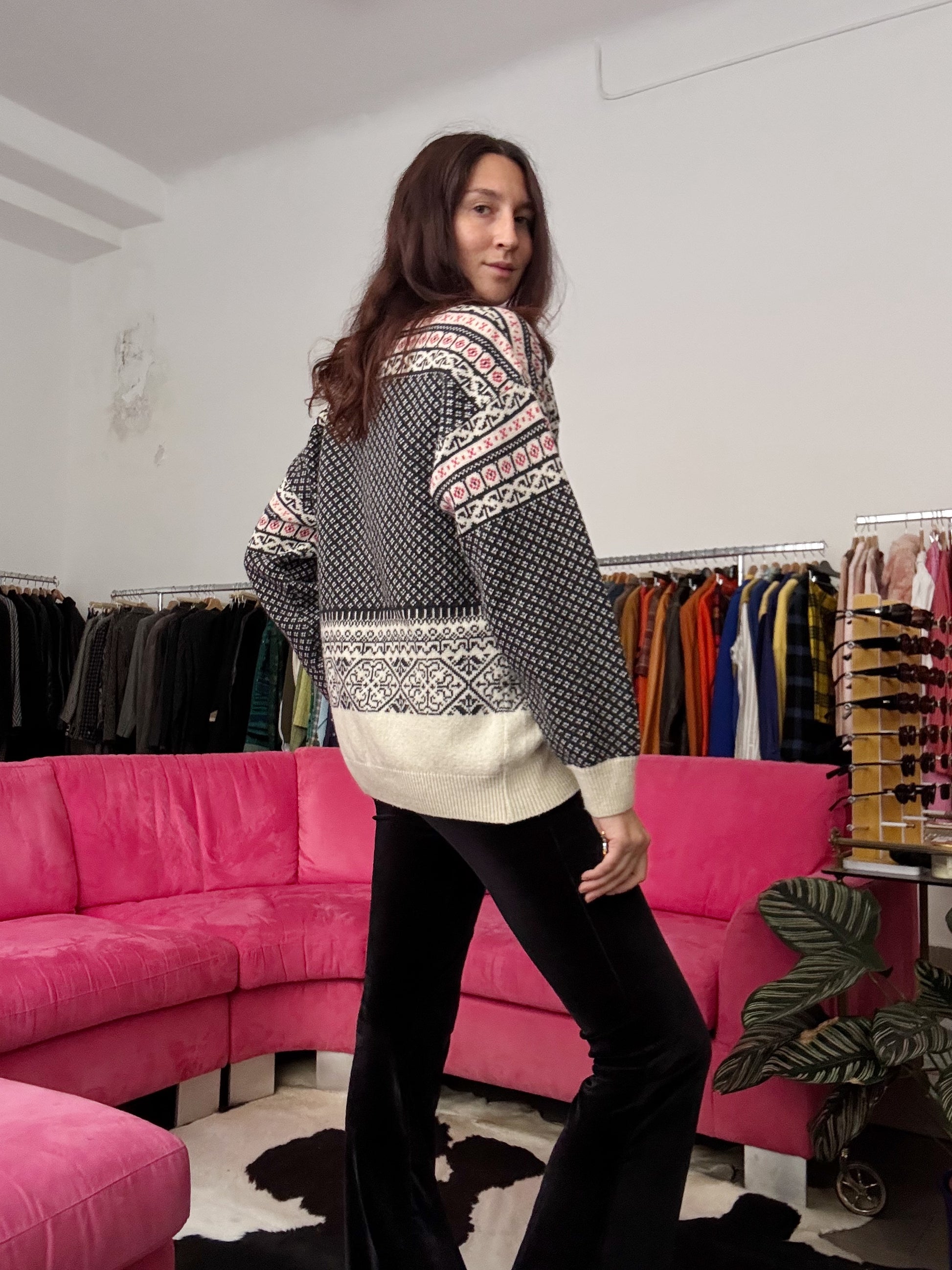 Maglione stile norvegese firmato Think Pink, taglia 46 unisex. Misure: spalle 56, ascelle 58, maniche 50, lunghezza 64. Composizione non riportata ma sicuramente lana
