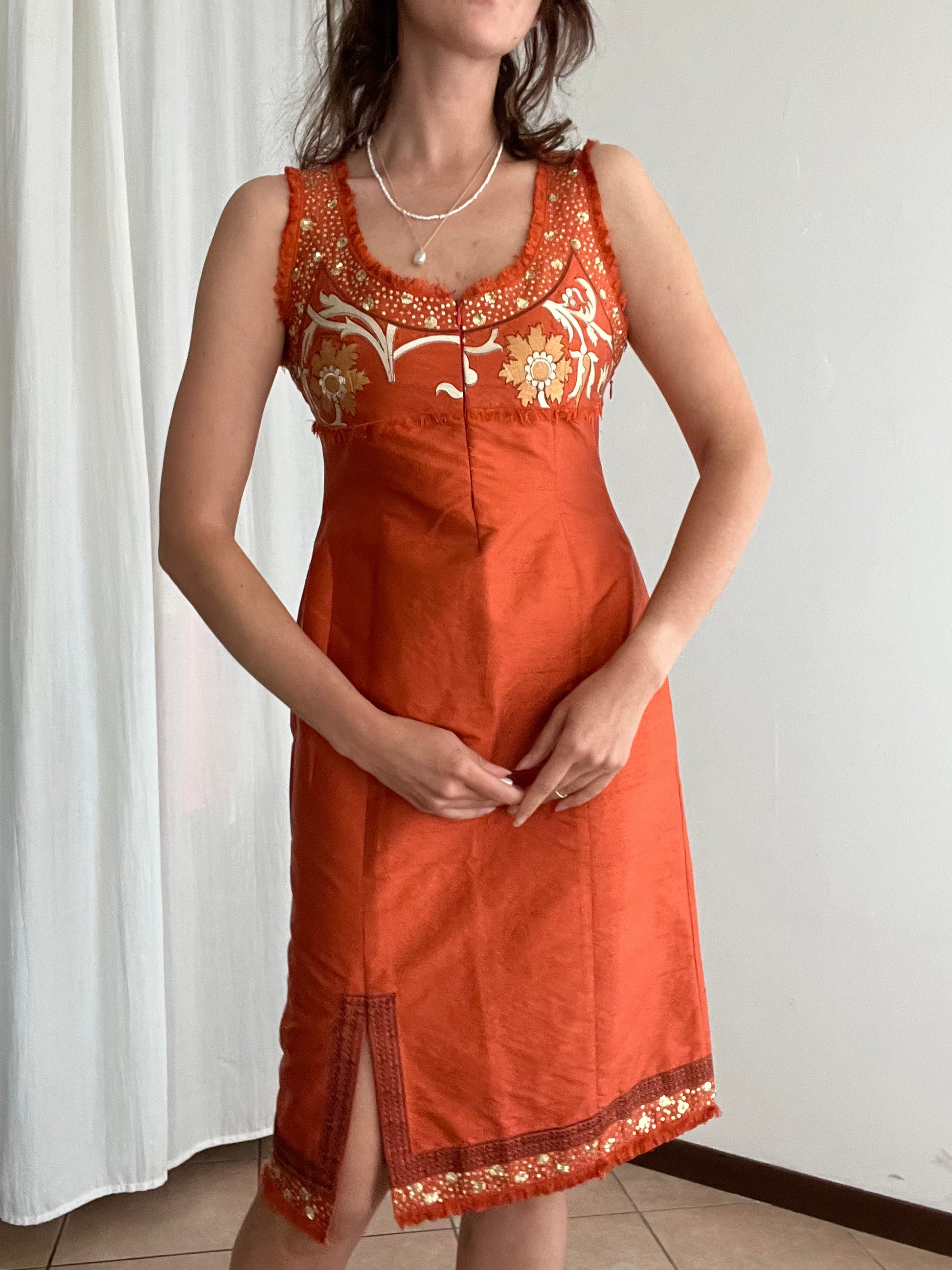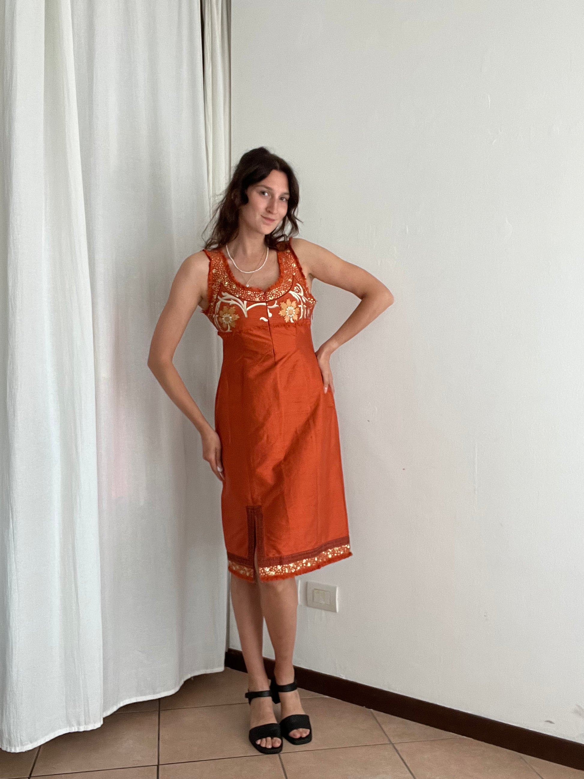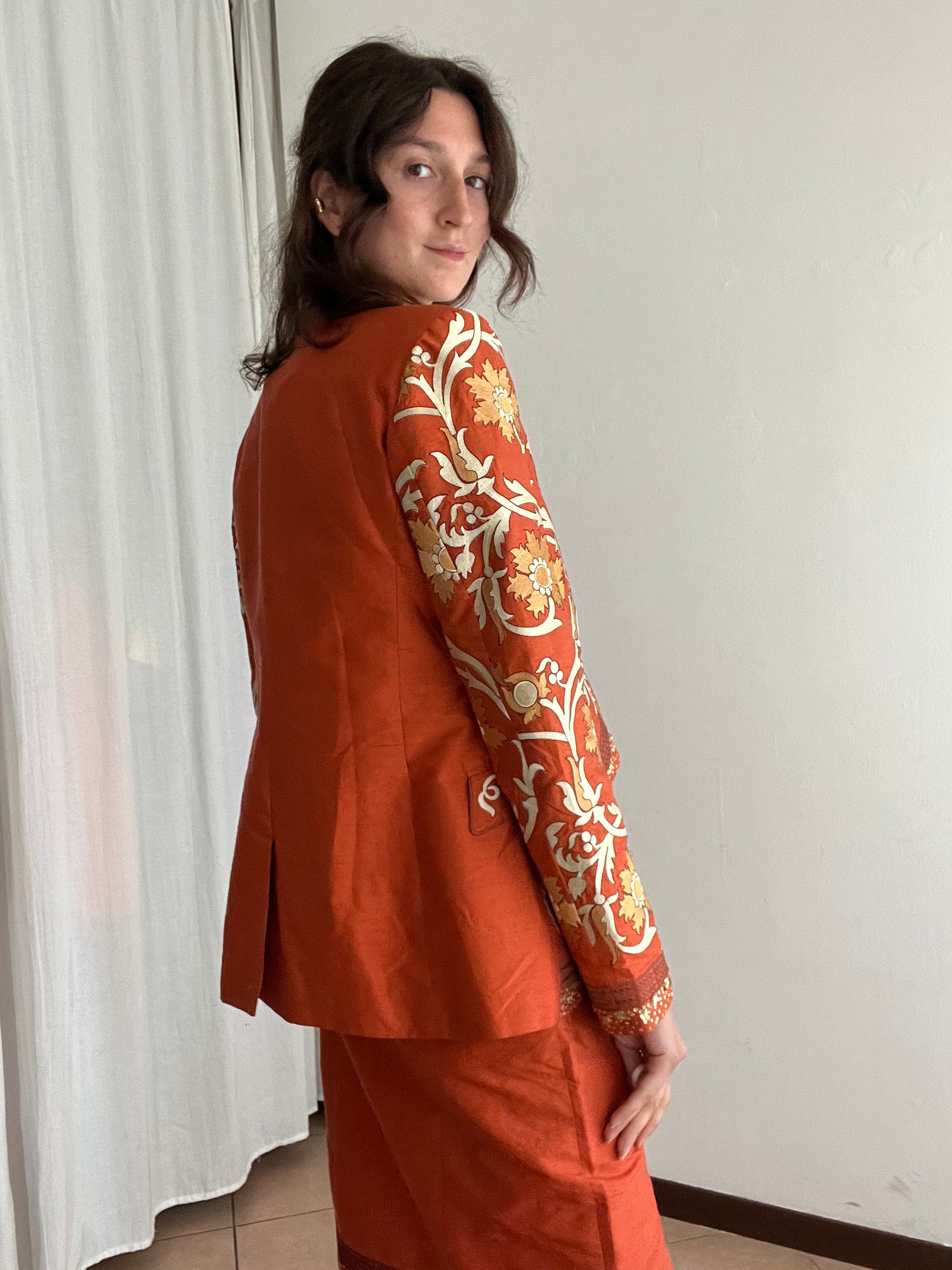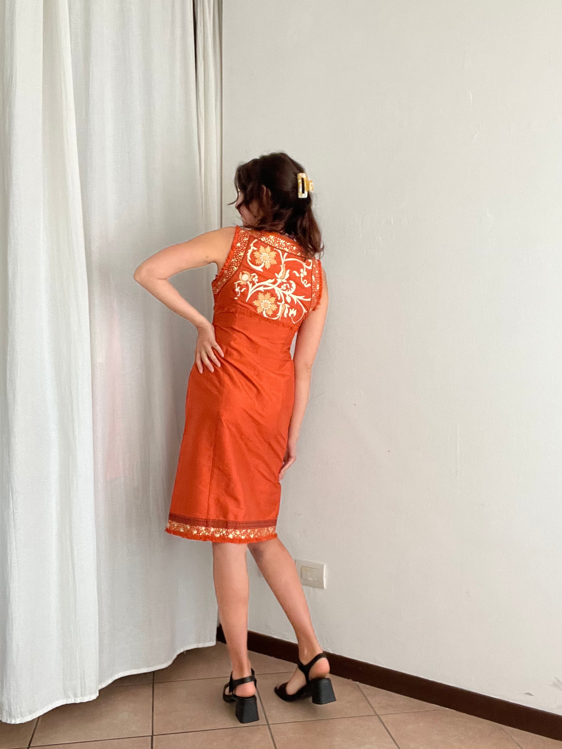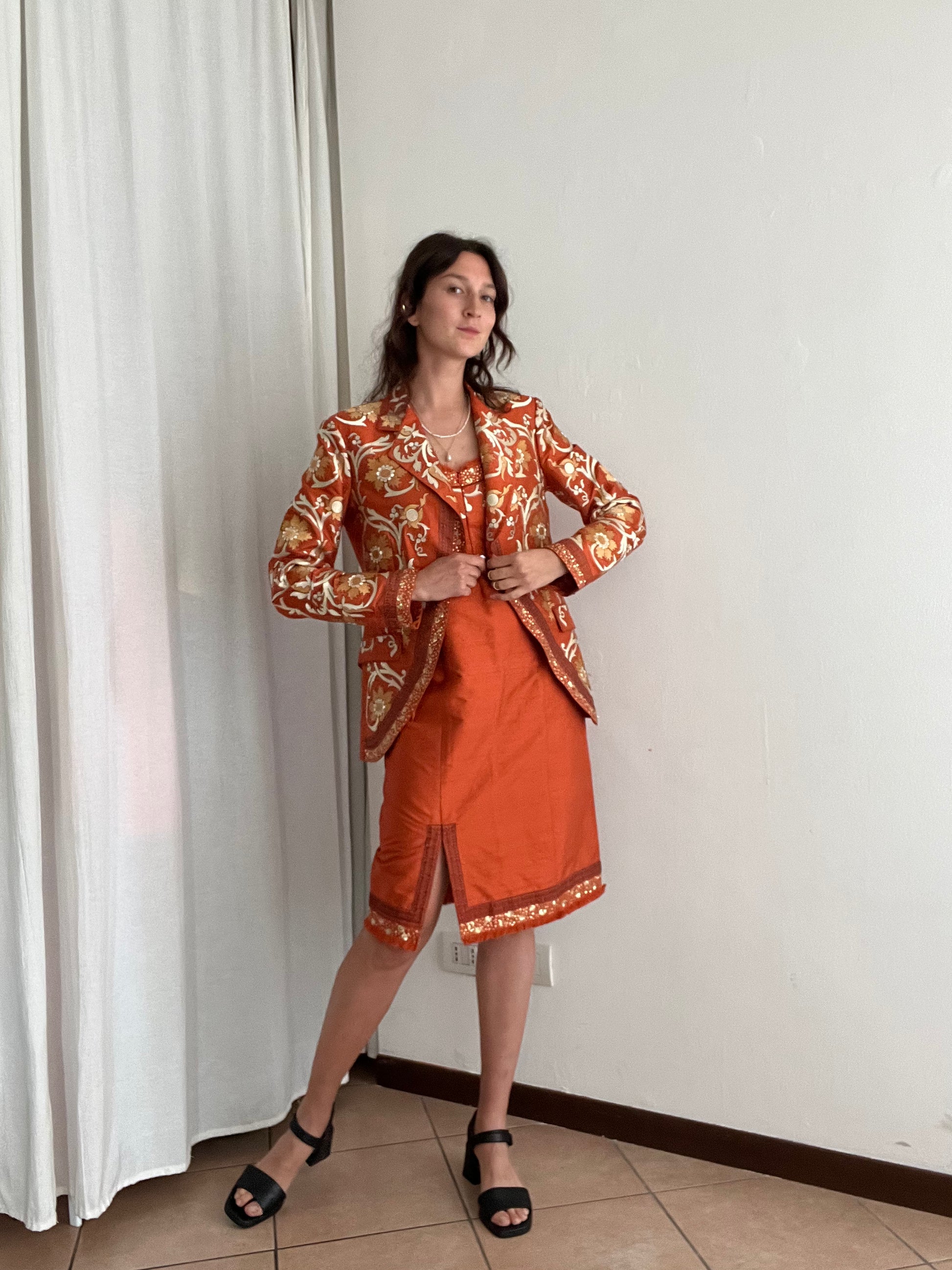 Completo arancione 100% seta composto da abito e blazer. Taglia 42 con ricami floreali e paillettes oro. Misure blazer: spalle 41, ascelle 48, maniche 63, lunghezza 70. Abito: ascelle 44, vita 37, fianchi circa 50, lunghezza 101.