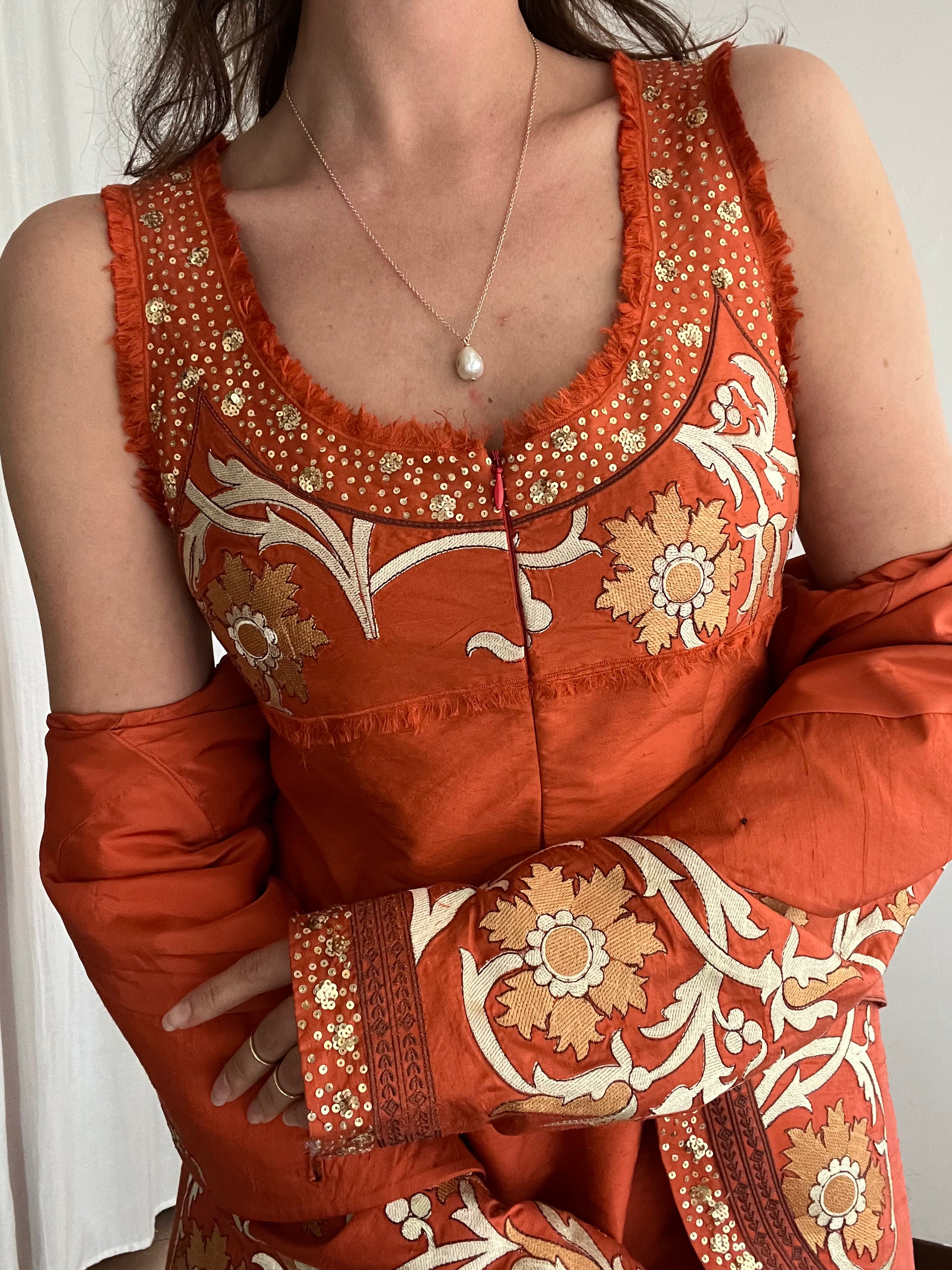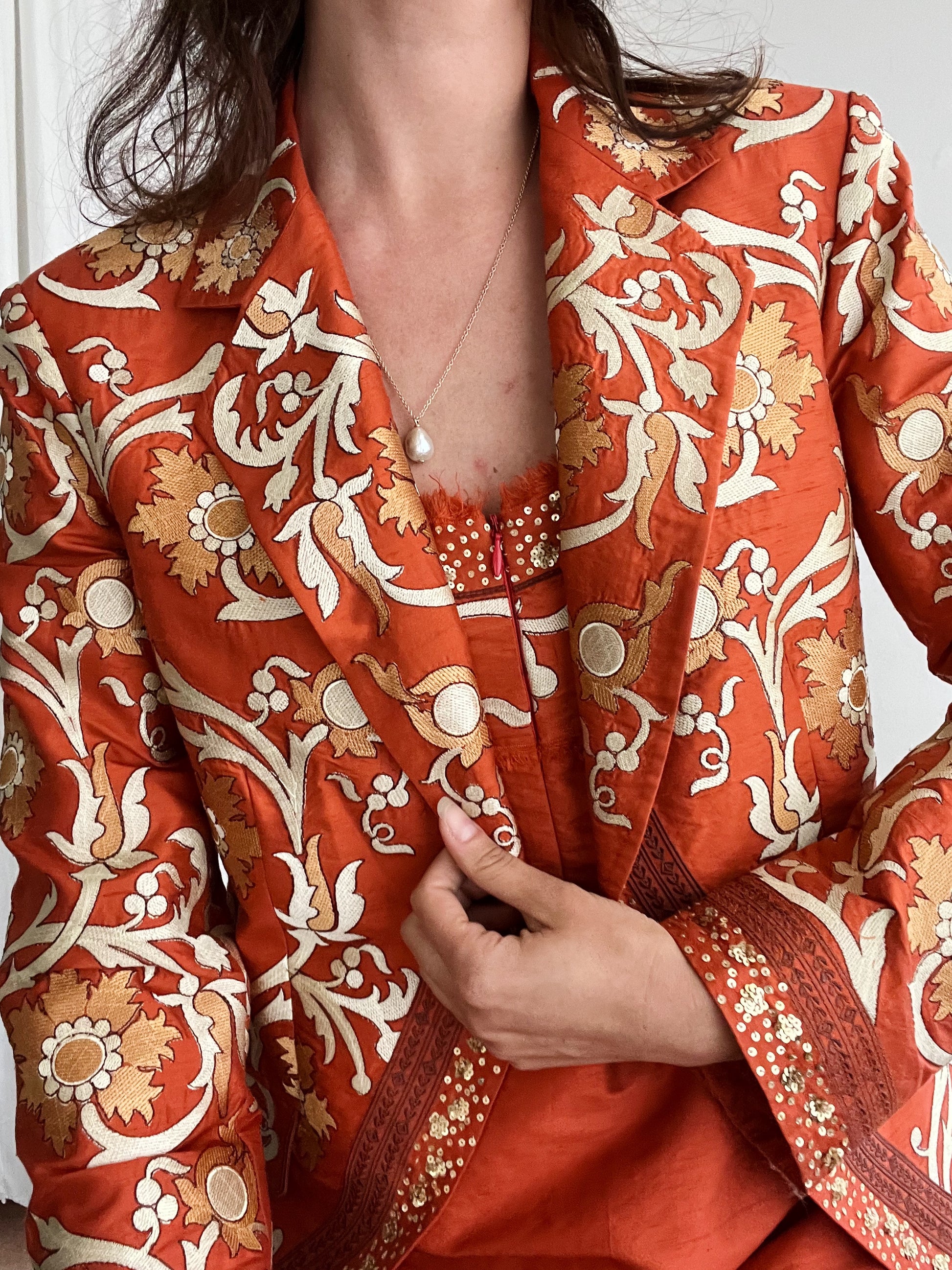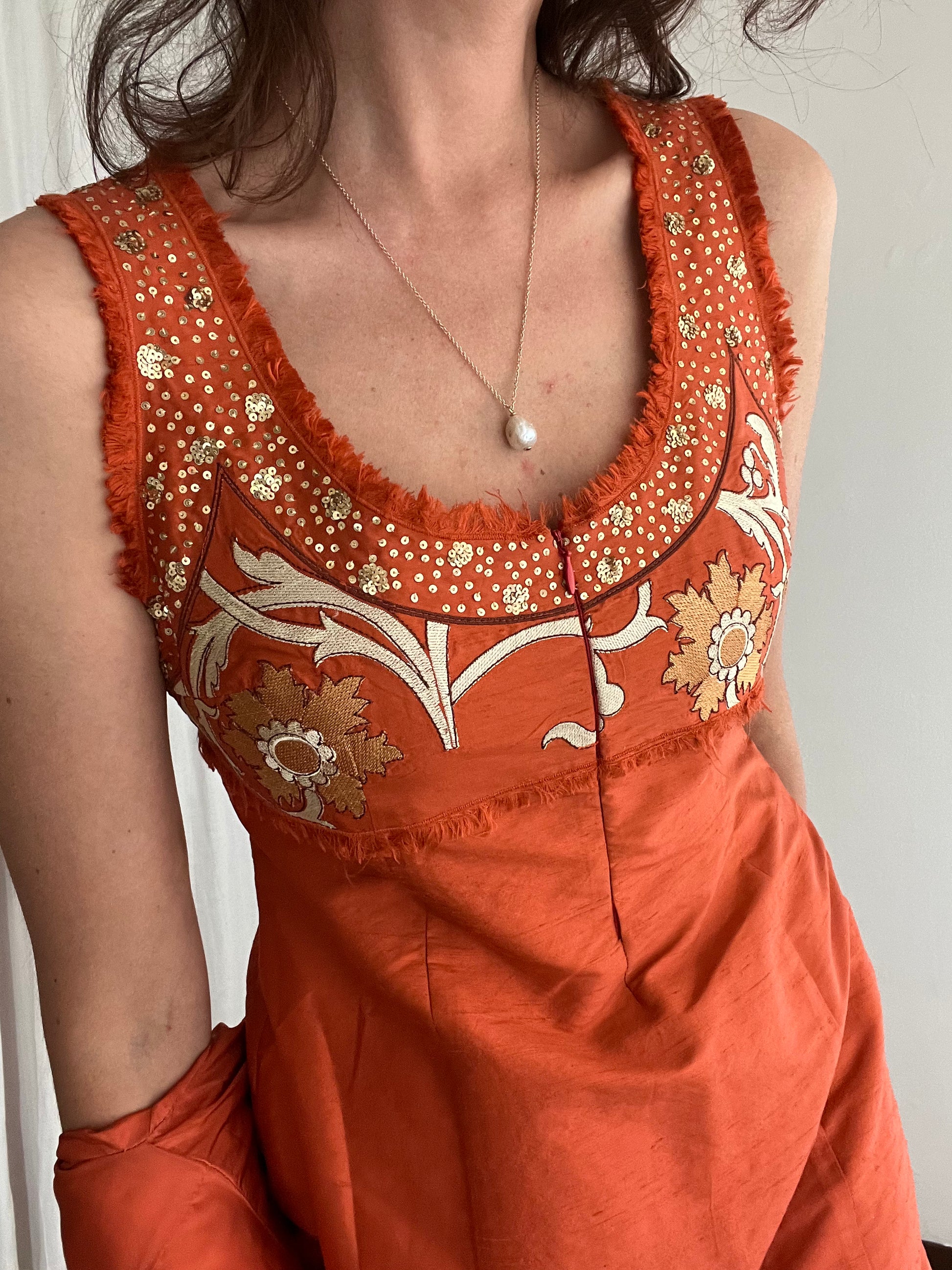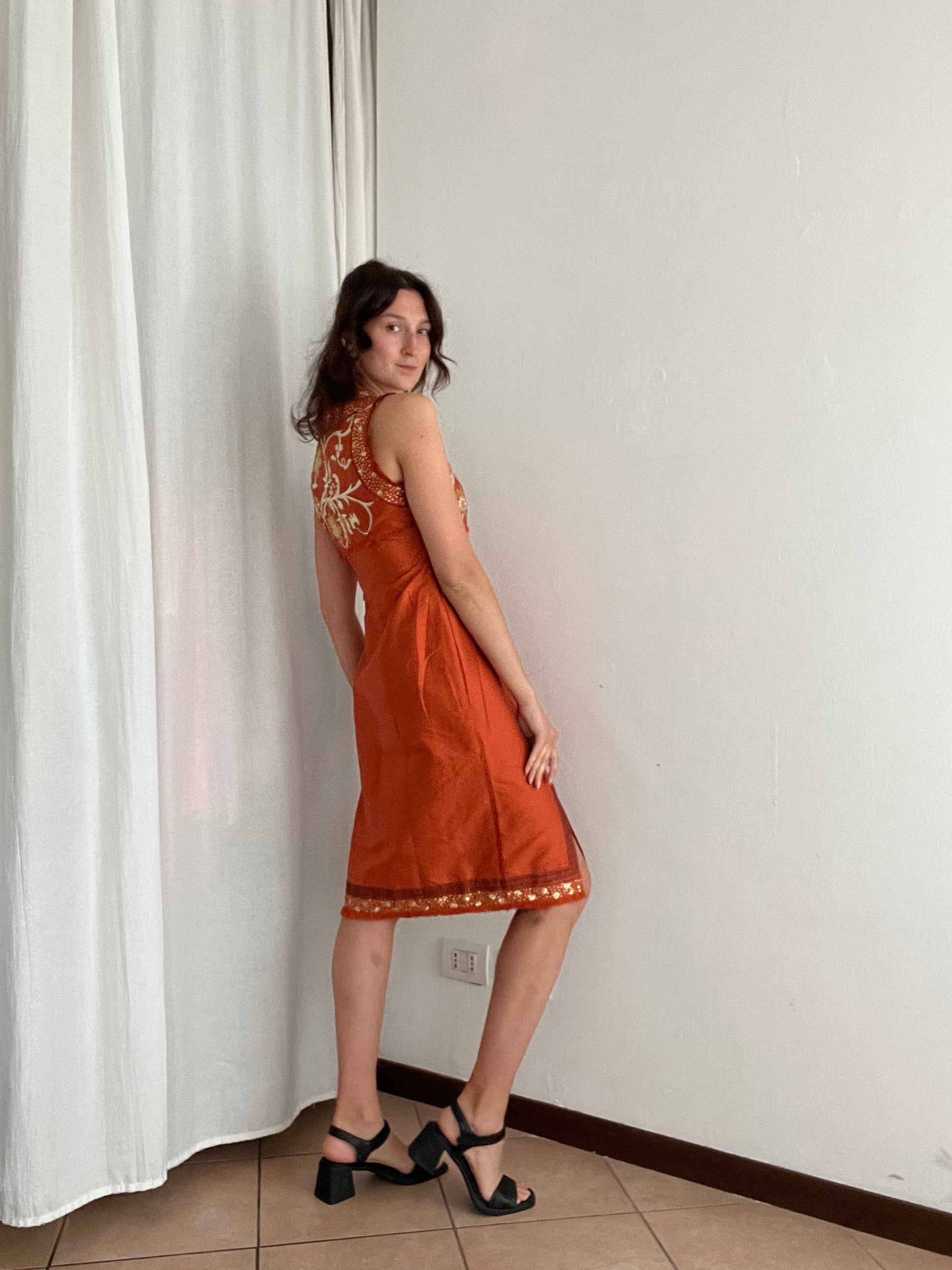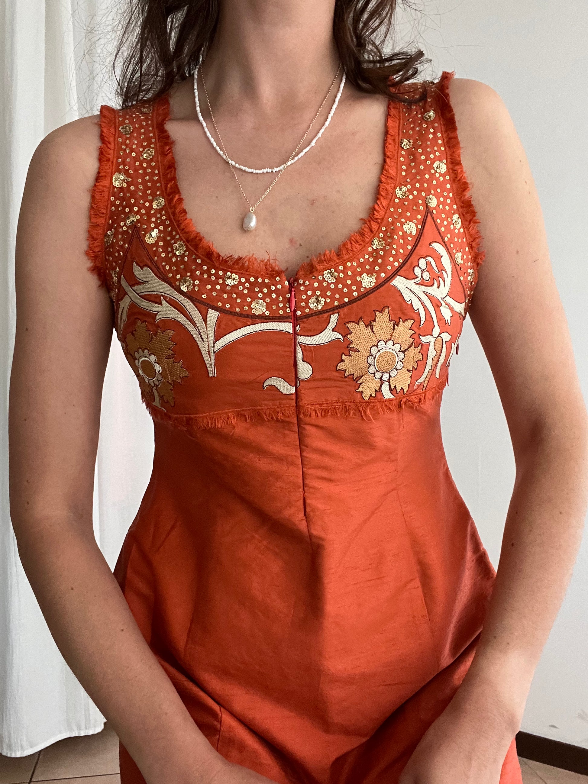 Completo arancione 100% seta composto da abito e blazer. Taglia 42 con ricami floreali e paillettes oro. Misure blazer: spalle 41, ascelle 48, maniche 63, lunghezza 70. Abito: ascelle 44, vita 37, fianchi circa 50, lunghezza 101.