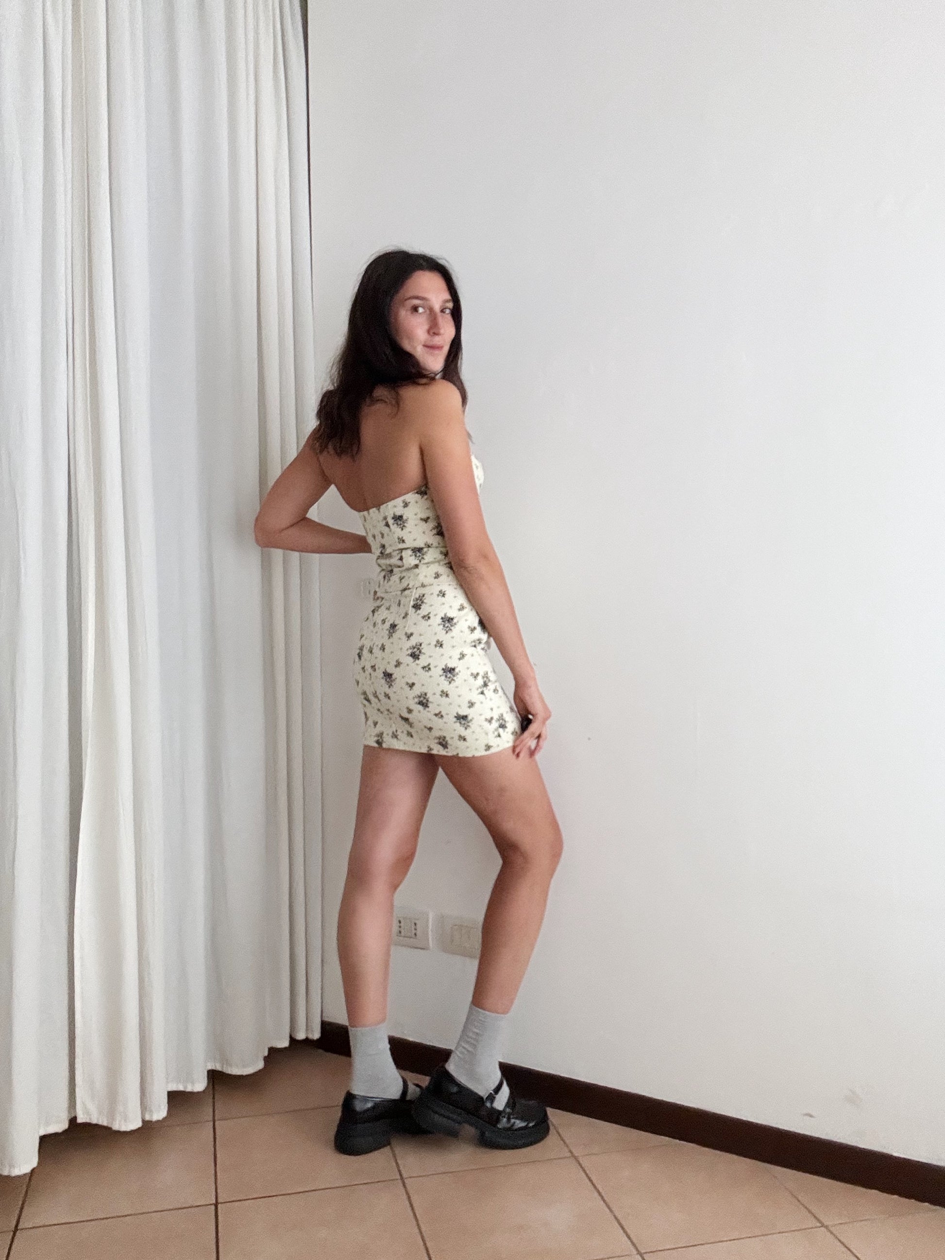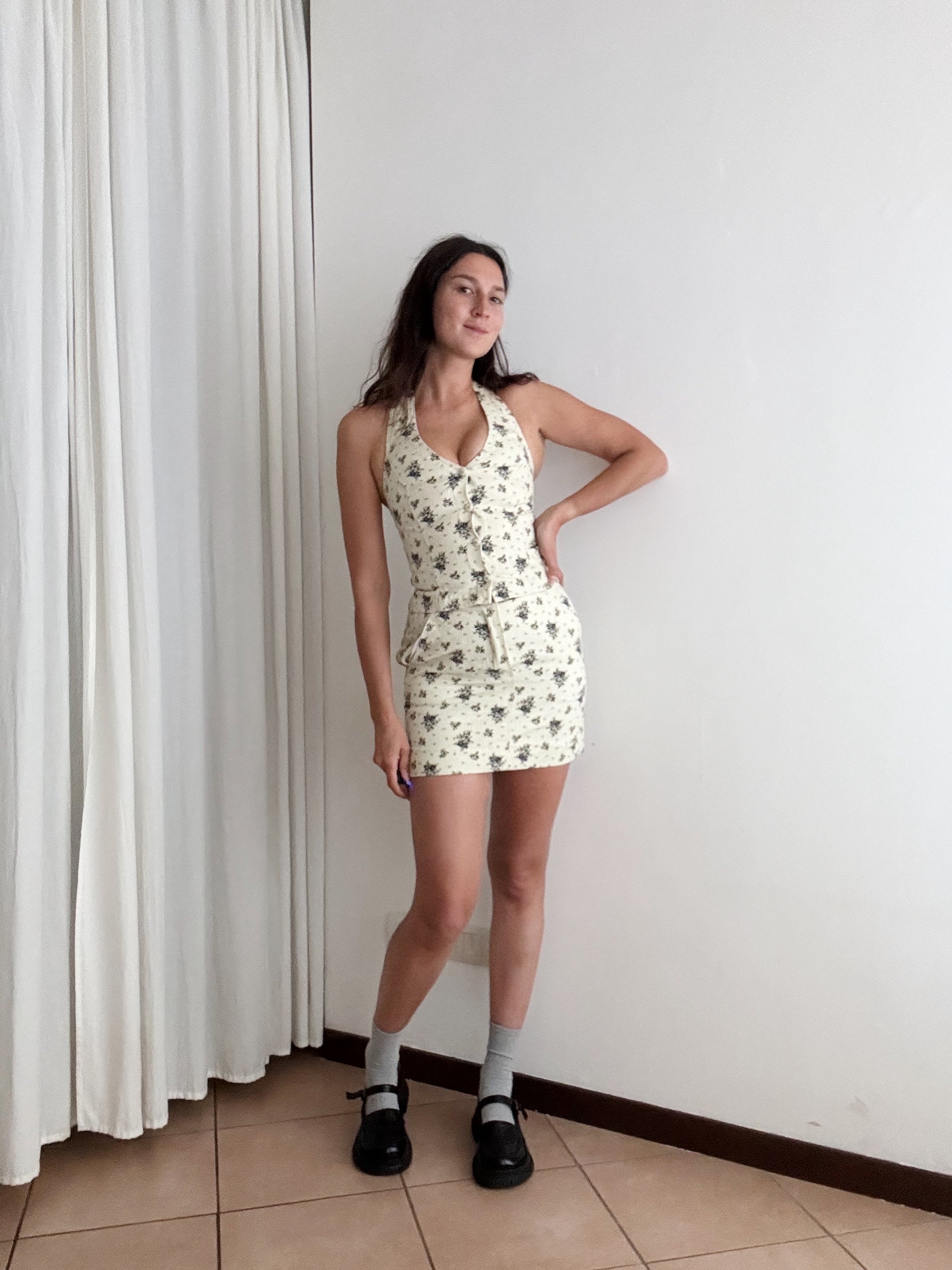 Completo vintage beige con fiorellini, composto da gonna a vita alta e top che si allaccia sul davanti. Veste taglia XS. Tessuto denim leggero. Misure: vita gonna 33, lunghezza 38. Top: ascelle 36 cm