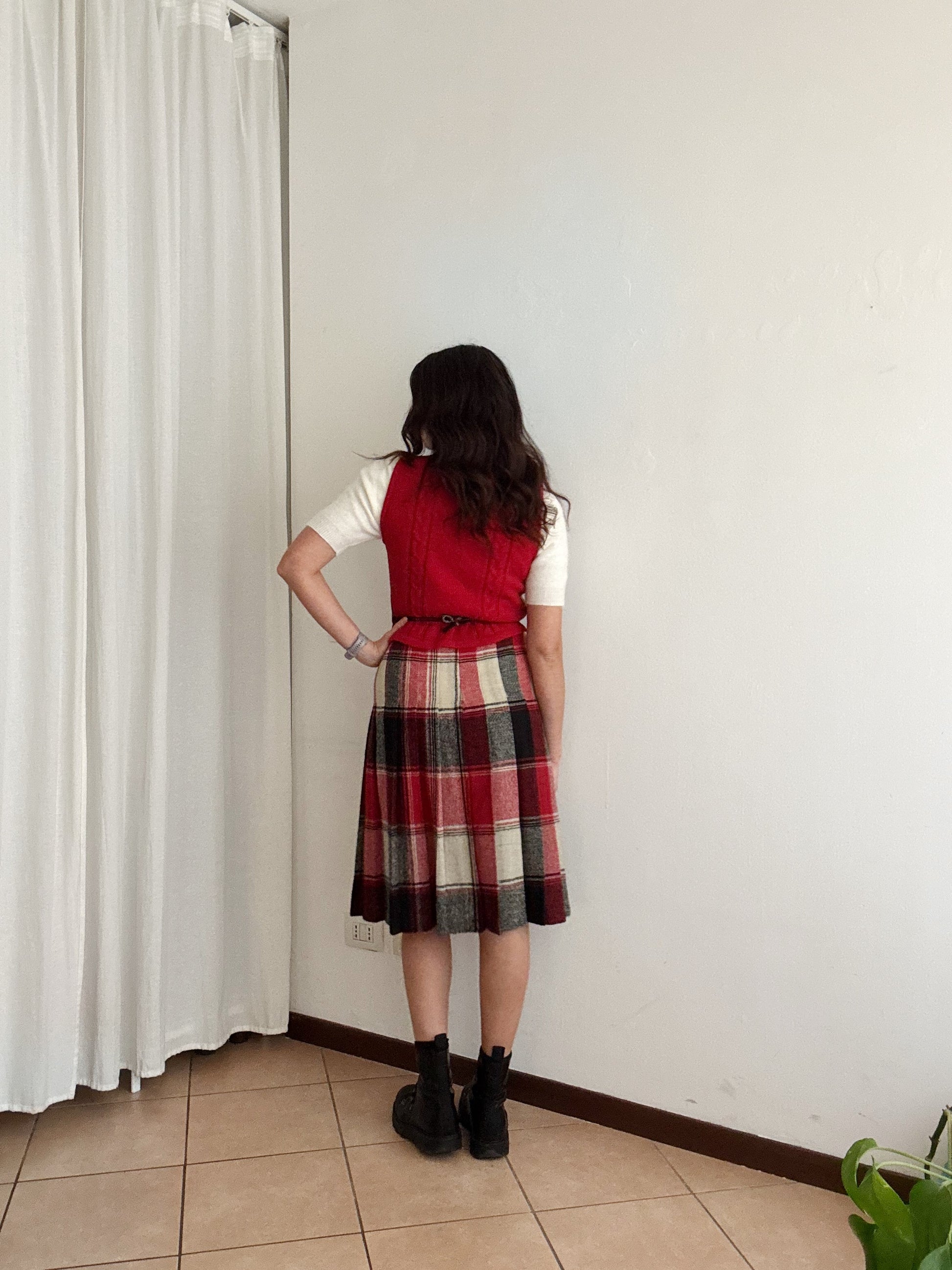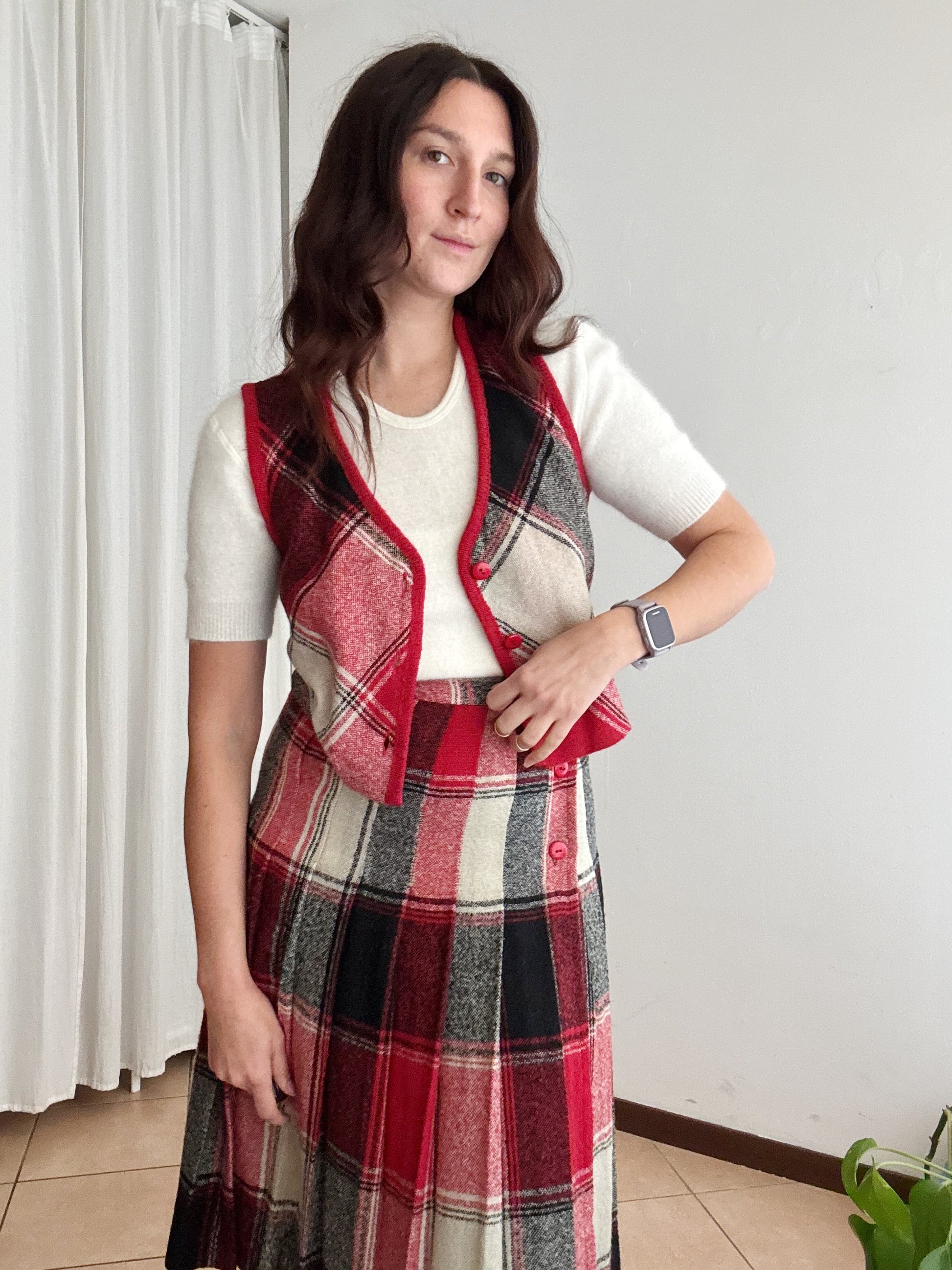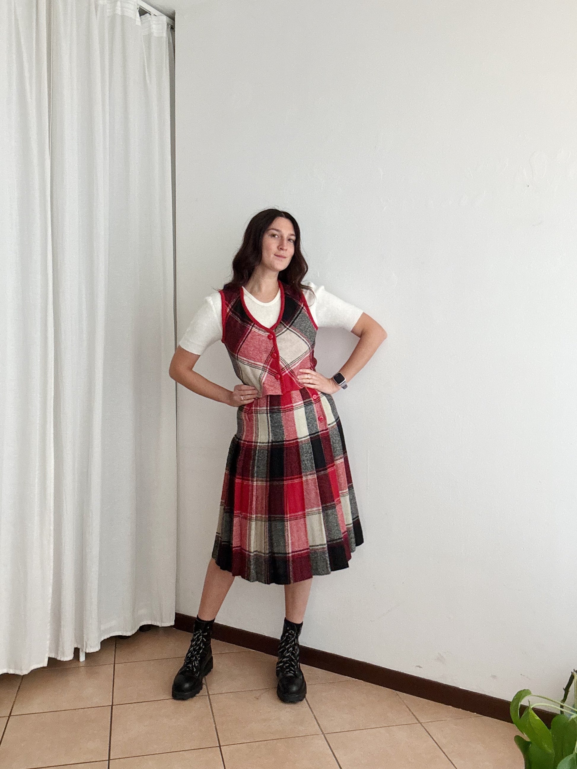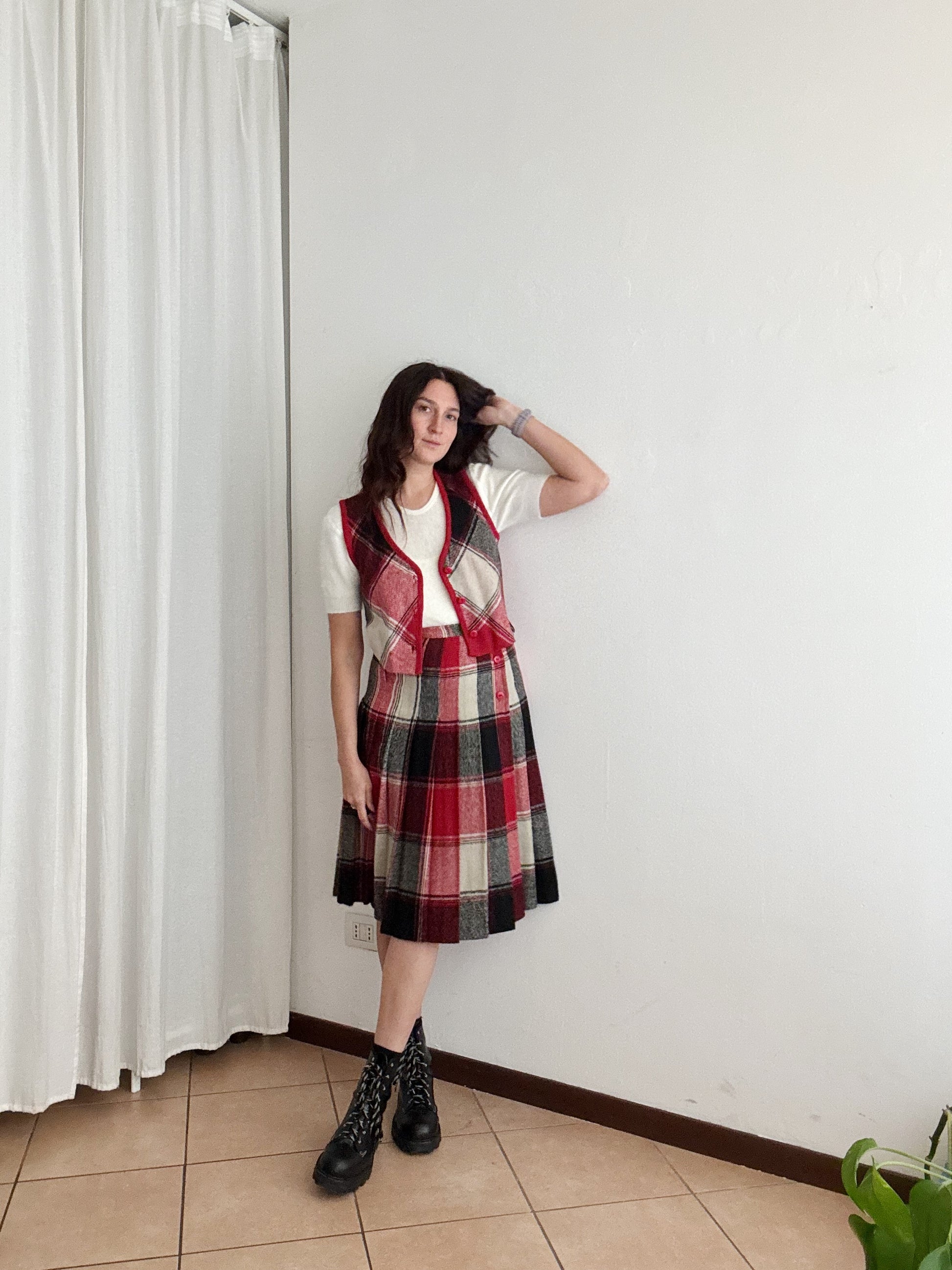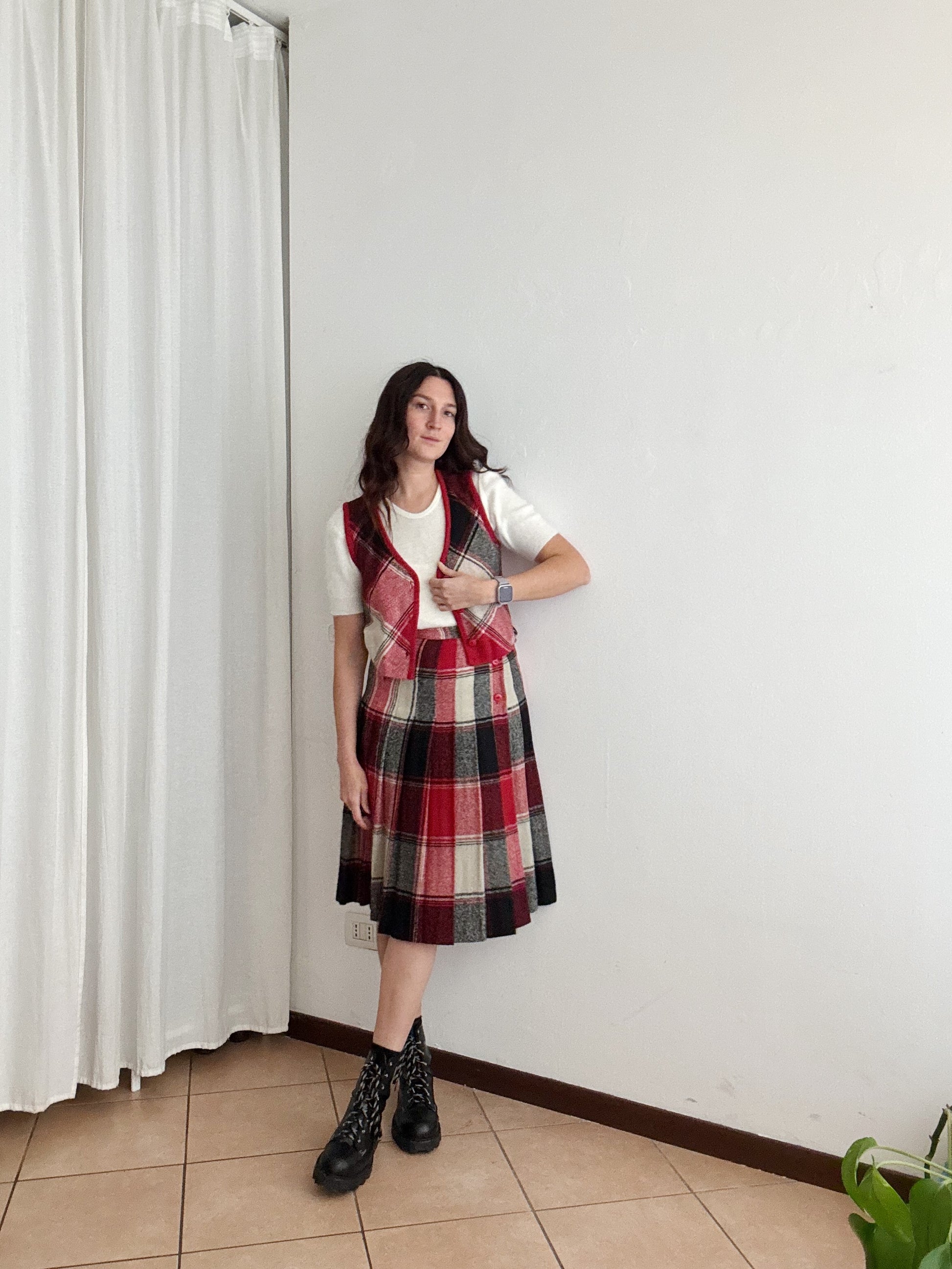 Gonna vintage taglia 42 ma veste massimo 40. Vita vita 34, lunghezza 70. Buono stato generale anche se il bianco non risulta particolarmente brillante. Gilet venduto