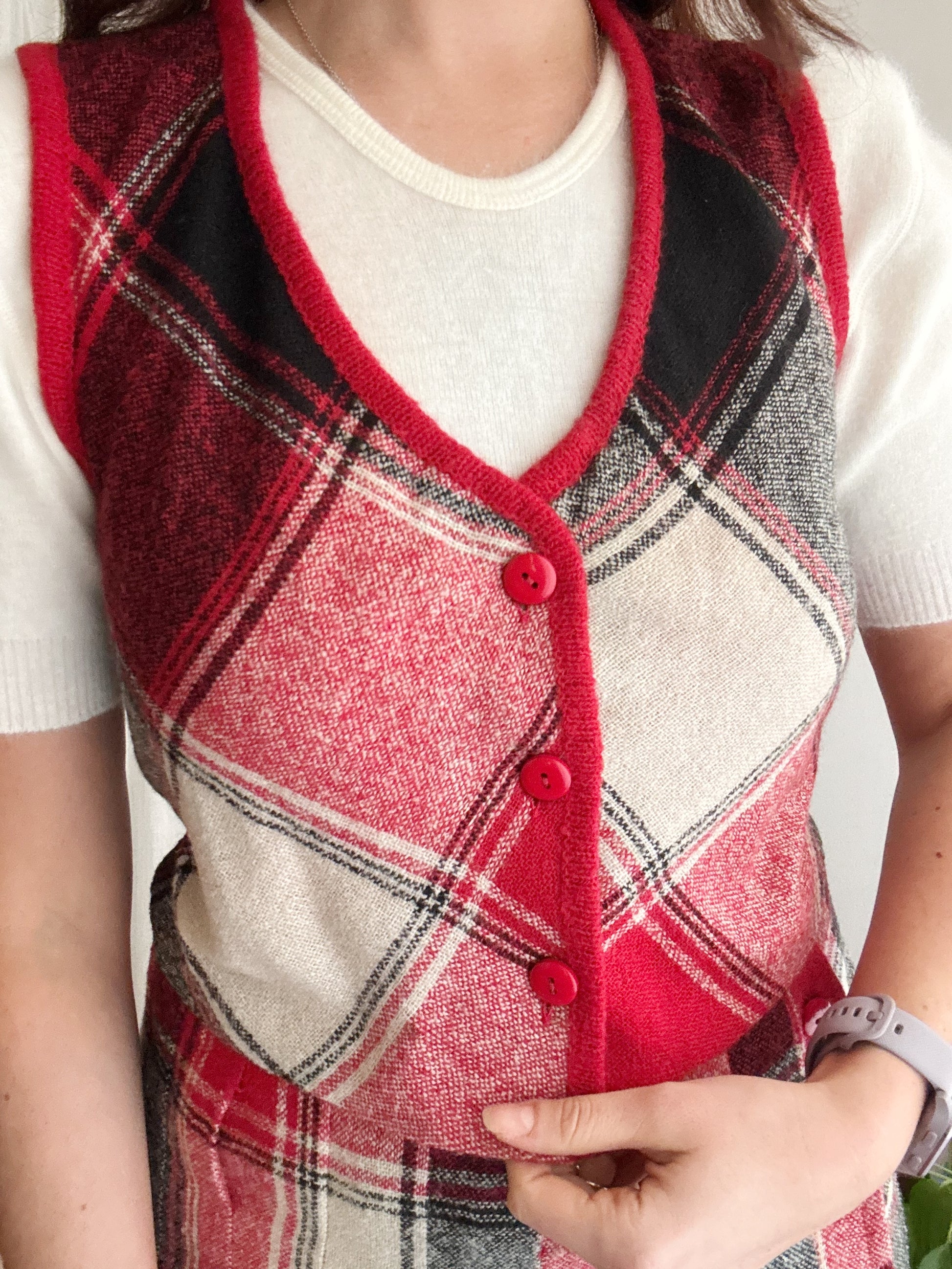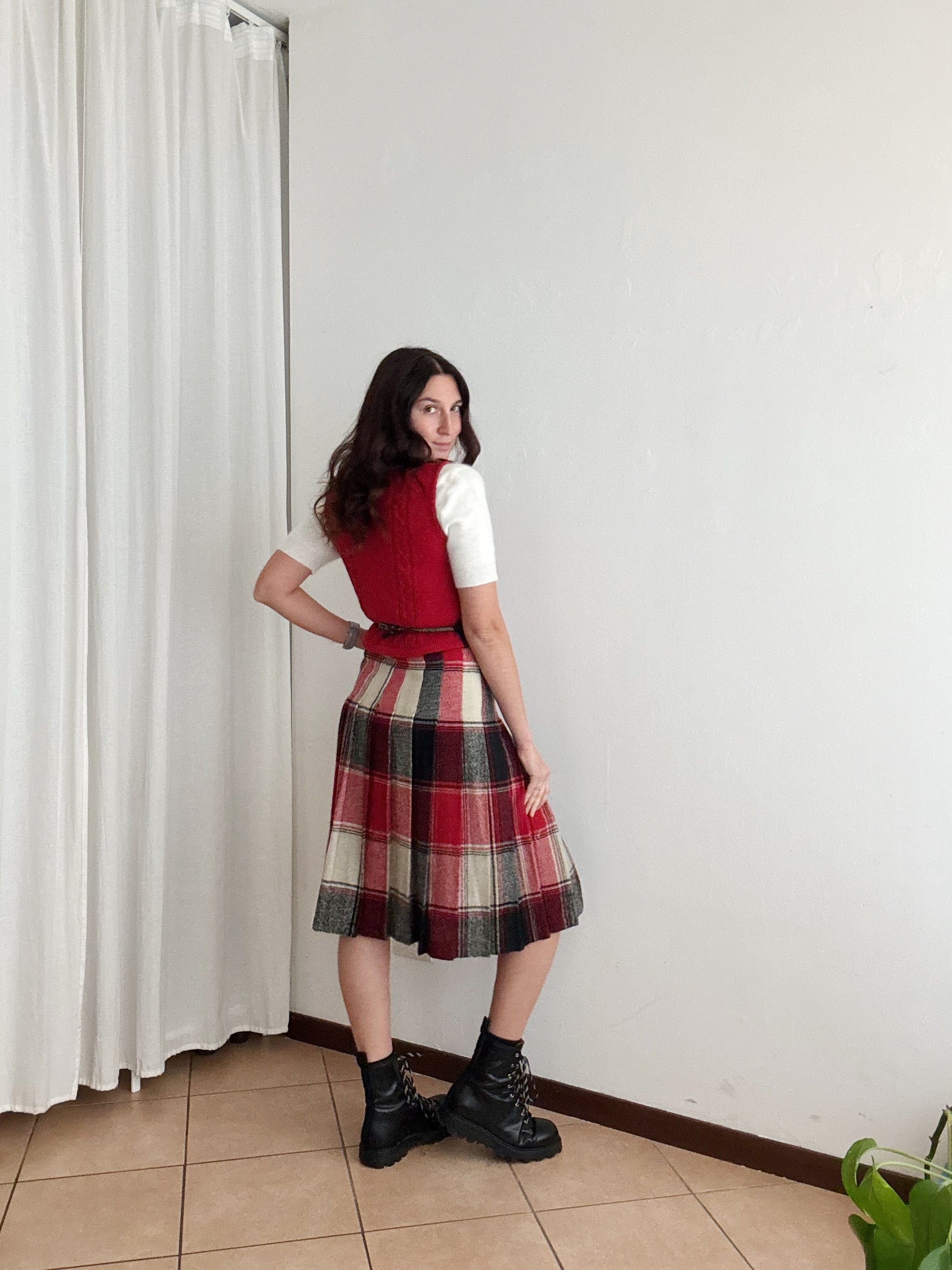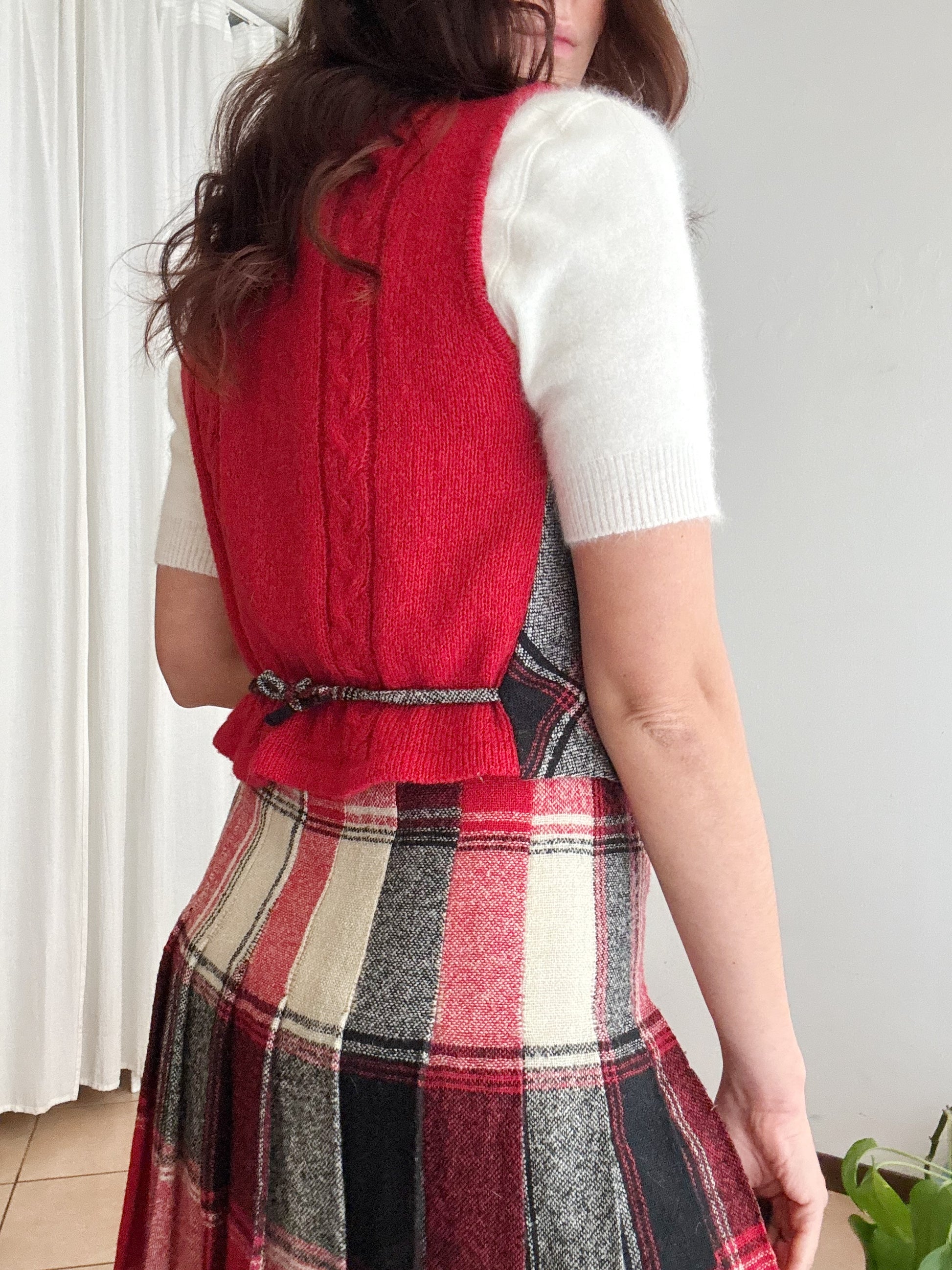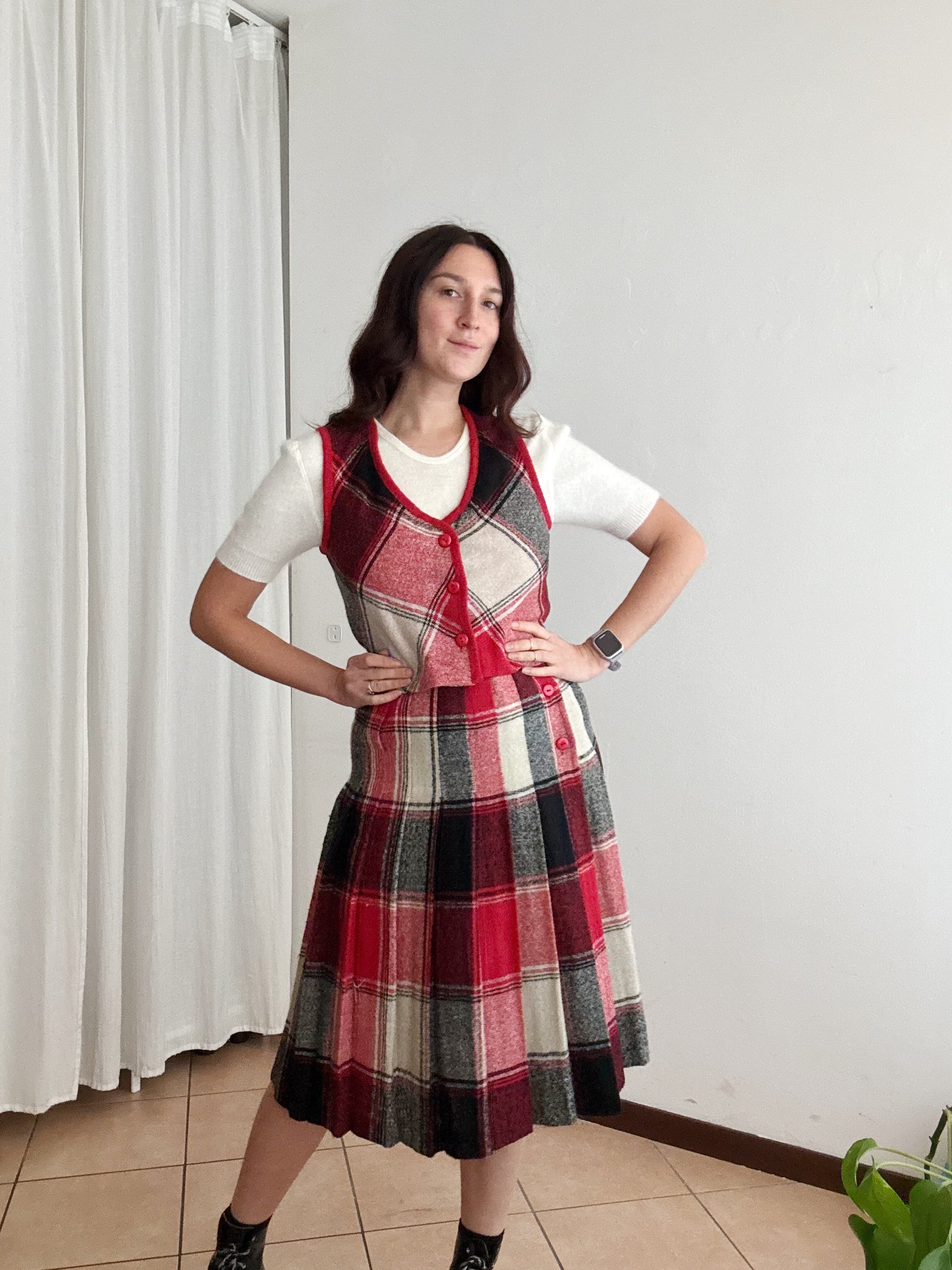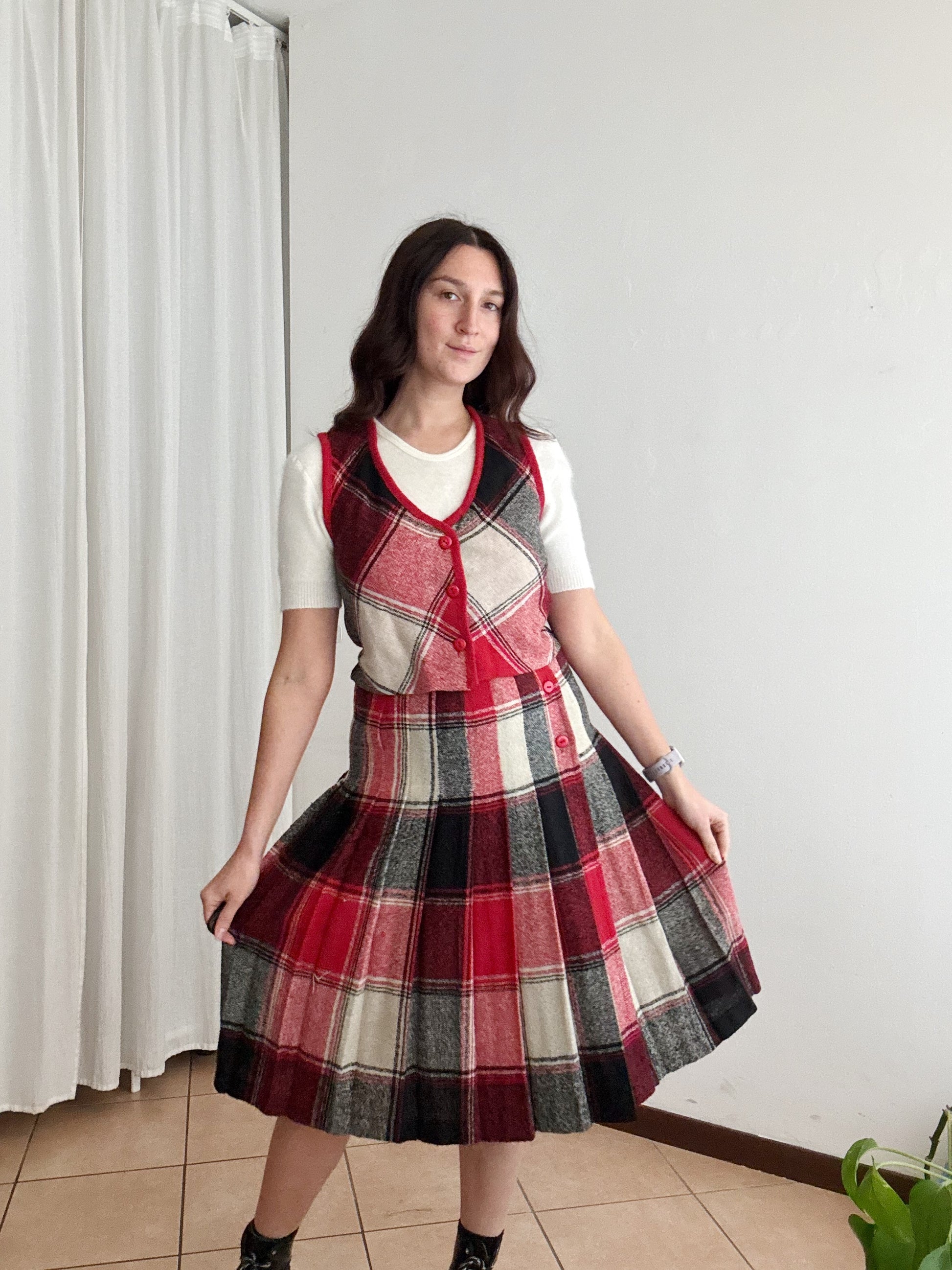 Gonna vintage taglia 42 ma veste massimo 40. Vita vita 34, lunghezza 70. Buono stato generale anche se il bianco non risulta particolarmente brillante. Gilet venduto
