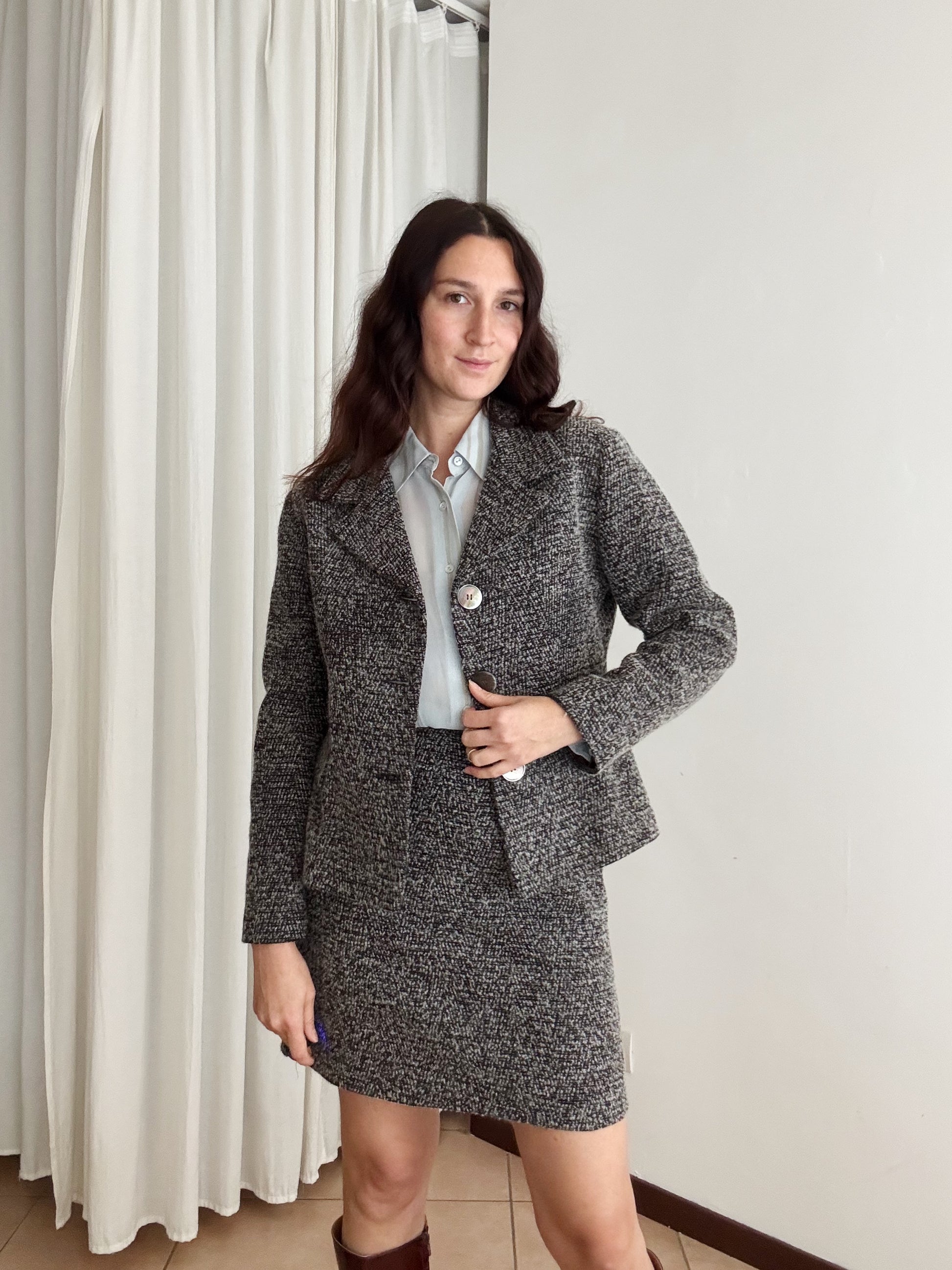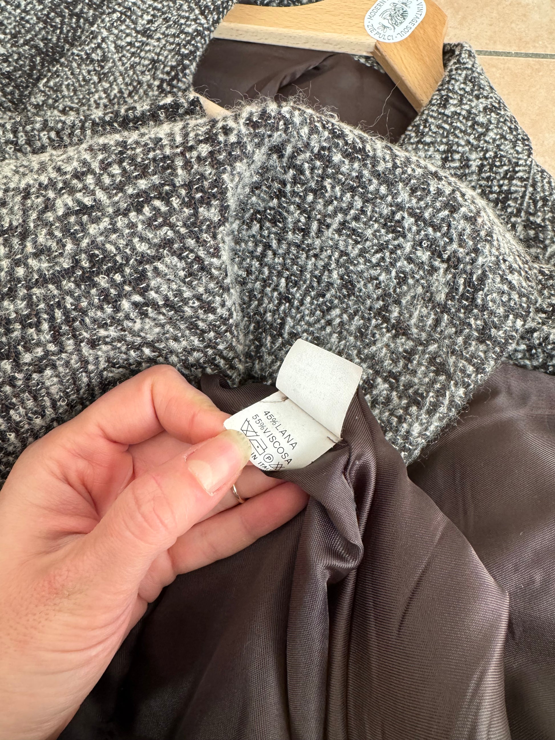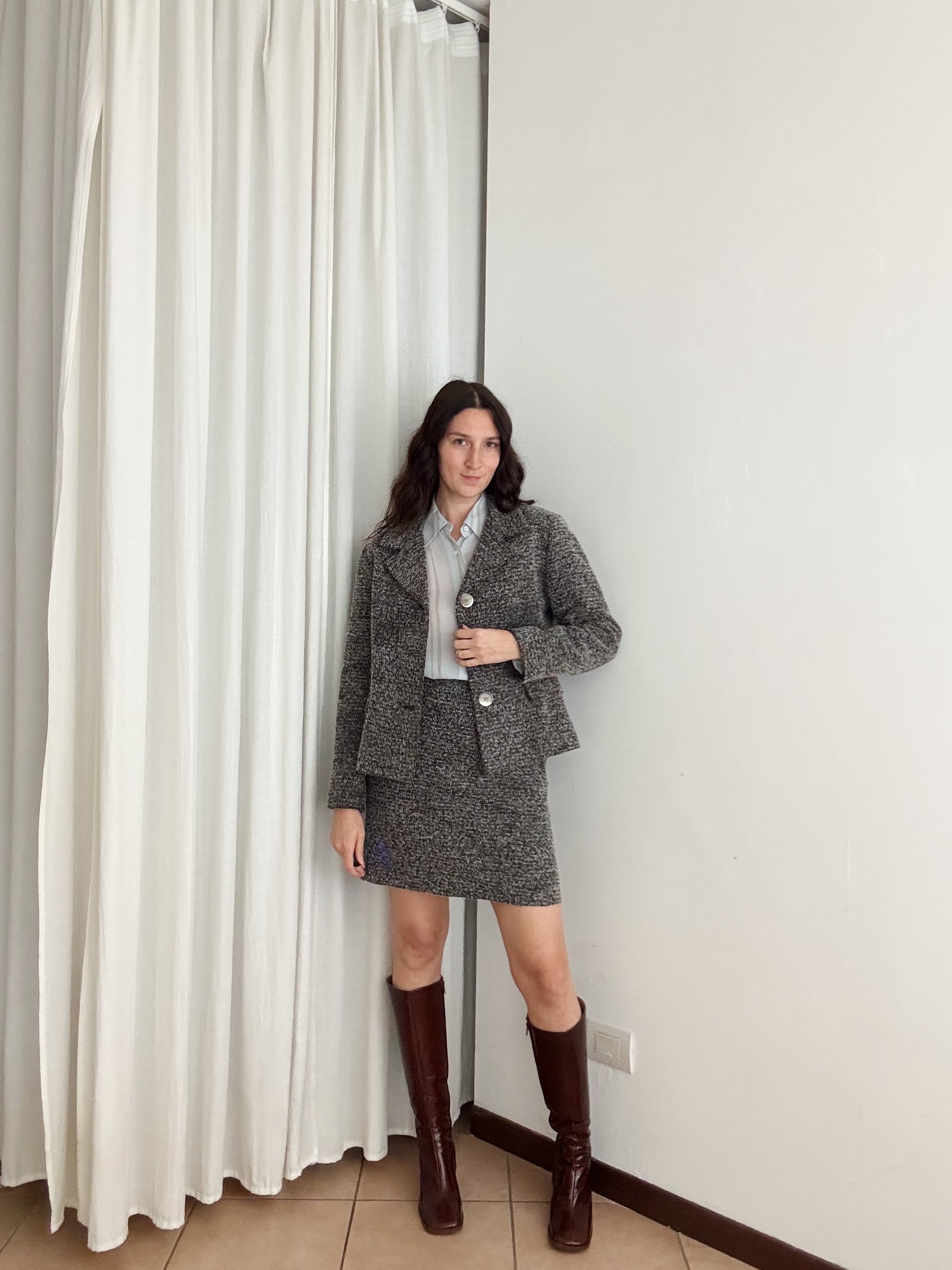 Completo vintage grigia in misto lana. Riporta taglia L ma lo consiglio a una 42 massimo. Misure: spalle 43, ascelle 49, maniche 59, lunghezza blazer 60. Gonna vita 36, fianchi circa 49, lunghezza 49. Composizione nell’ultima foto
