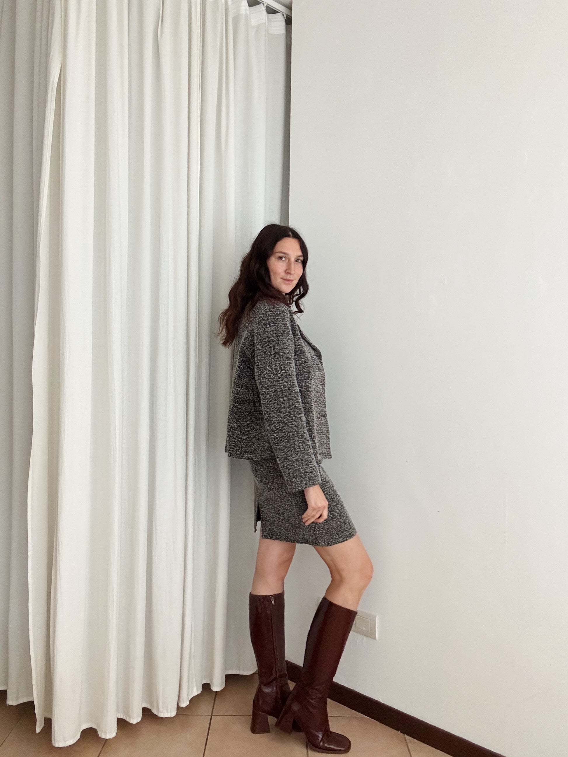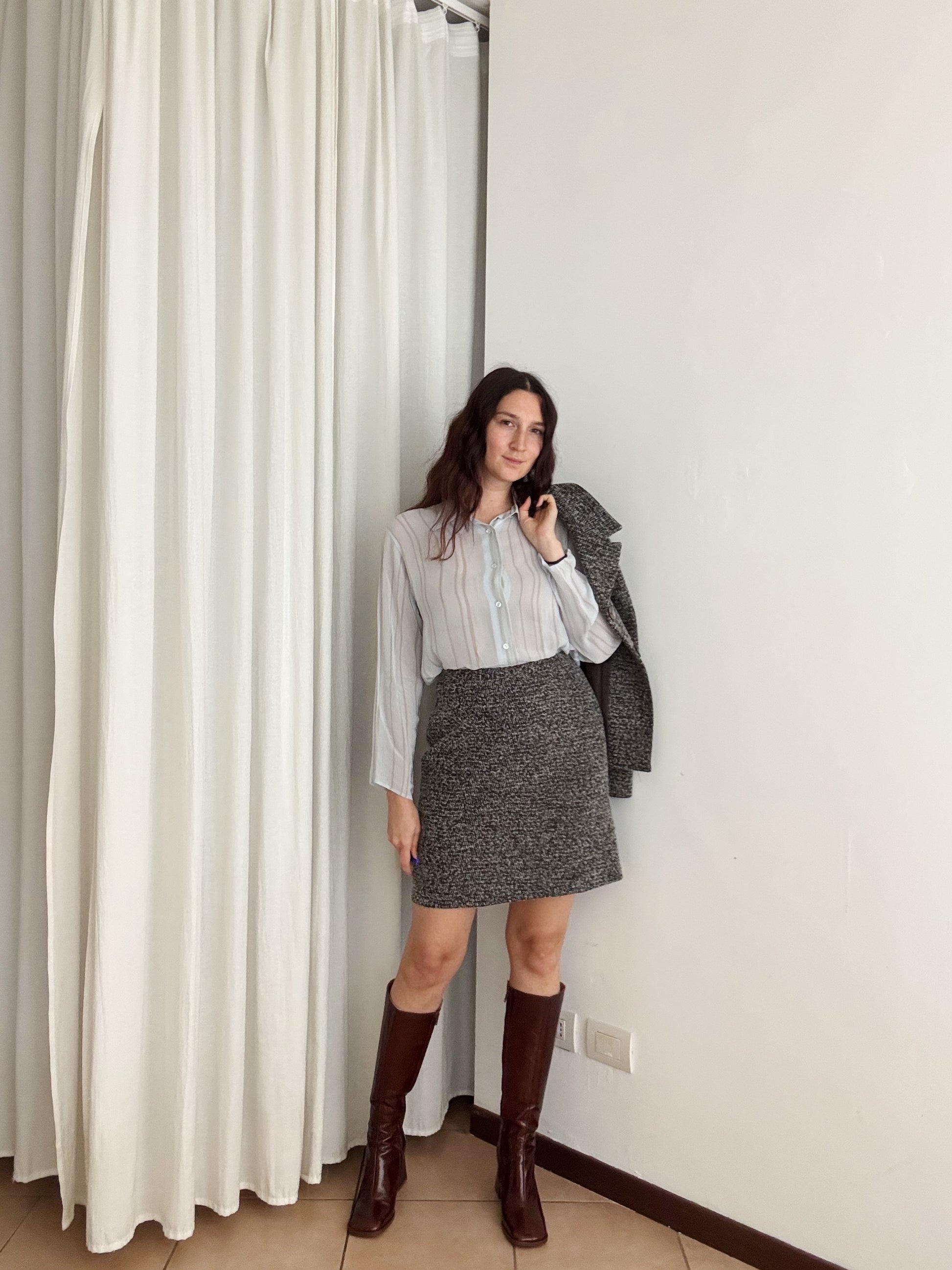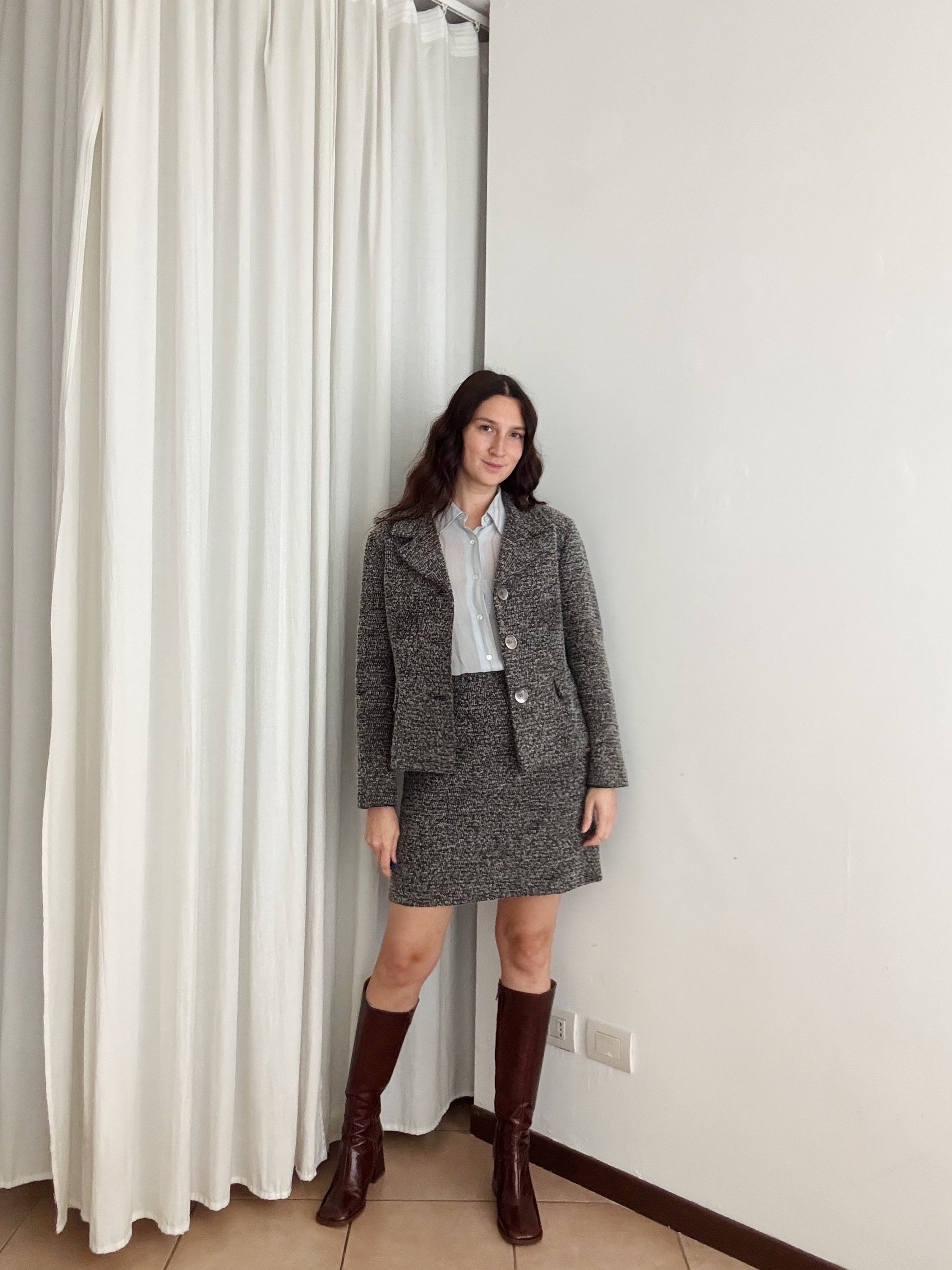 Completo vintage grigia in misto lana. Riporta taglia L ma lo consiglio a una 42 massimo. Misure: spalle 43, ascelle 49, maniche 59, lunghezza blazer 60. Gonna vita 36, fianchi circa 49, lunghezza 49. Composizione nell’ultima foto