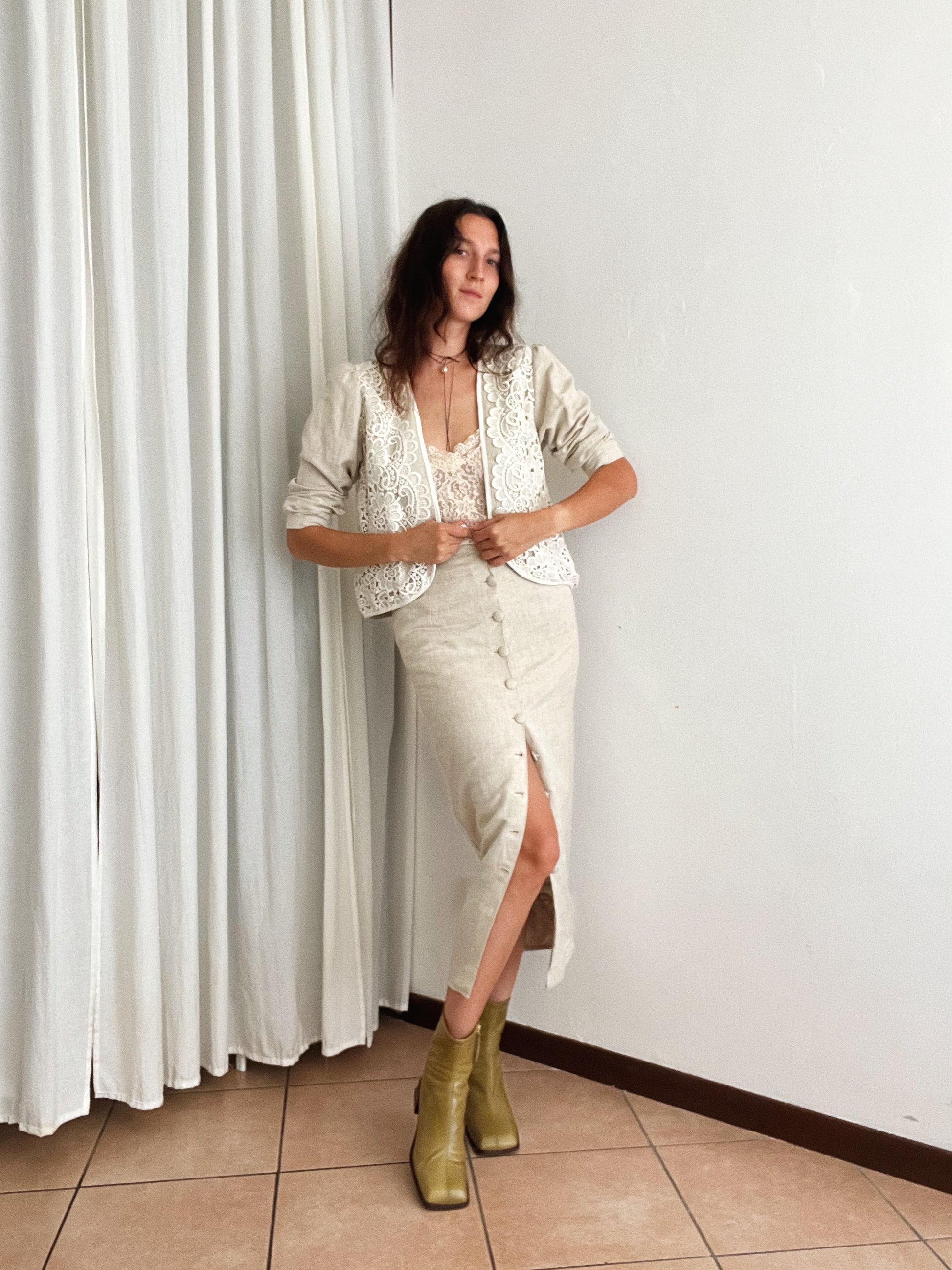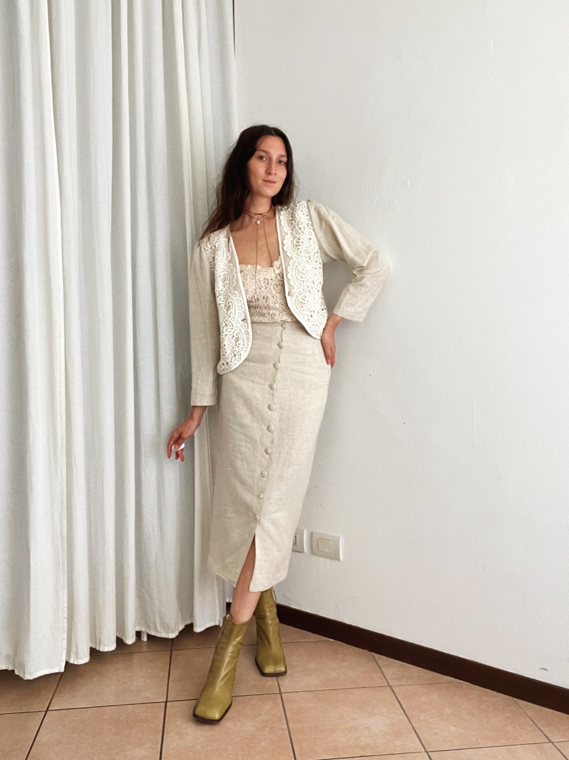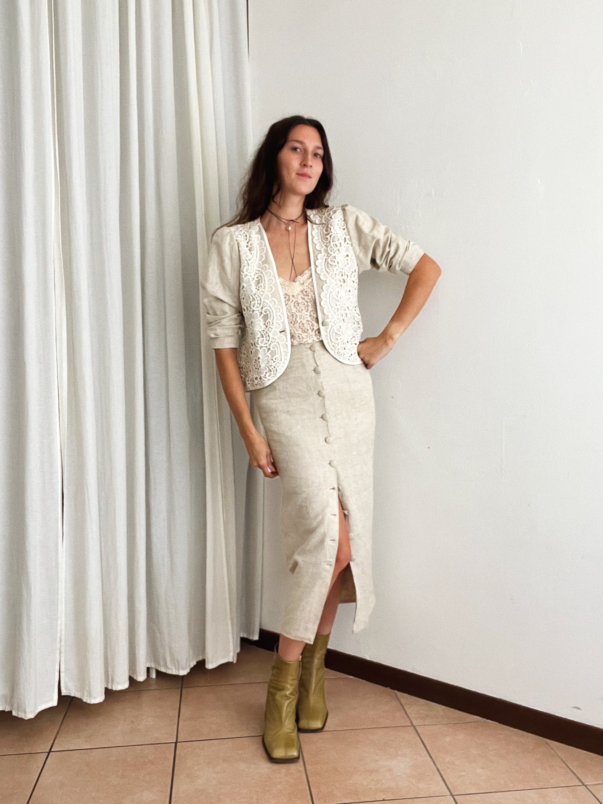 Gonna vintage sartoriale, in tessuto che direi è in lino con inserti in pizzo con bottoni centrali . Veste taglia M. Misure: vita 36, fianchi circa 47, lunghezza 83.