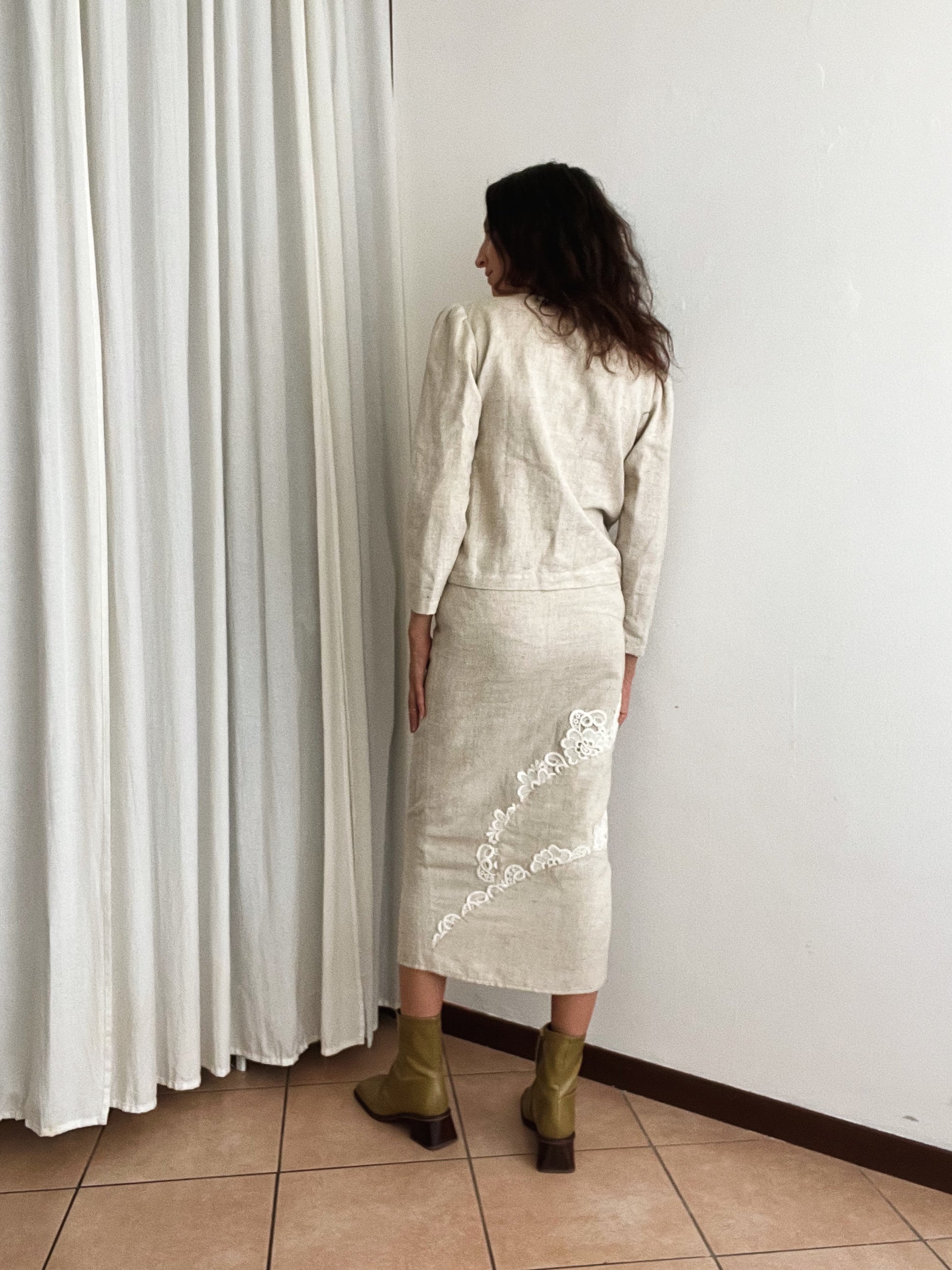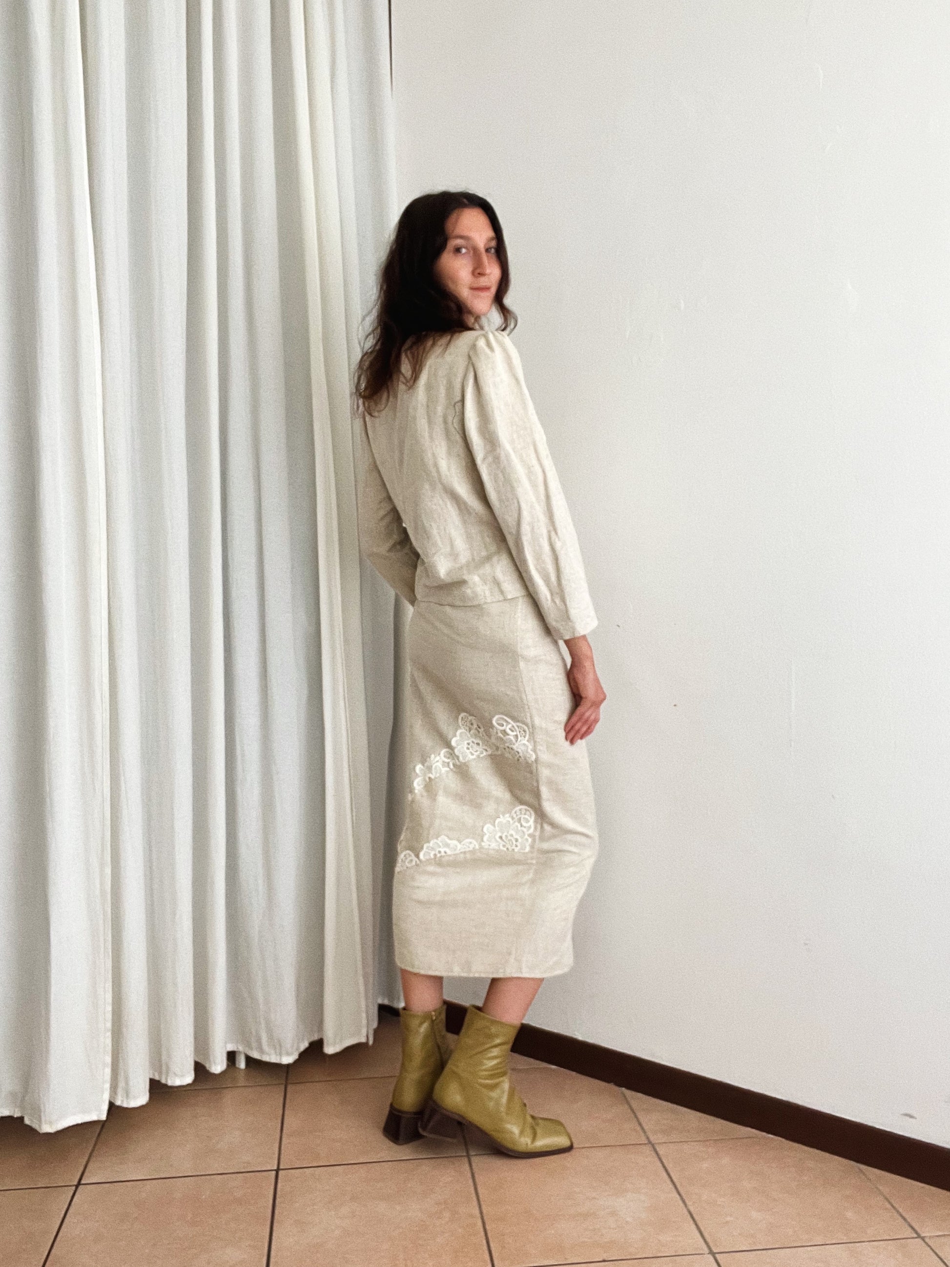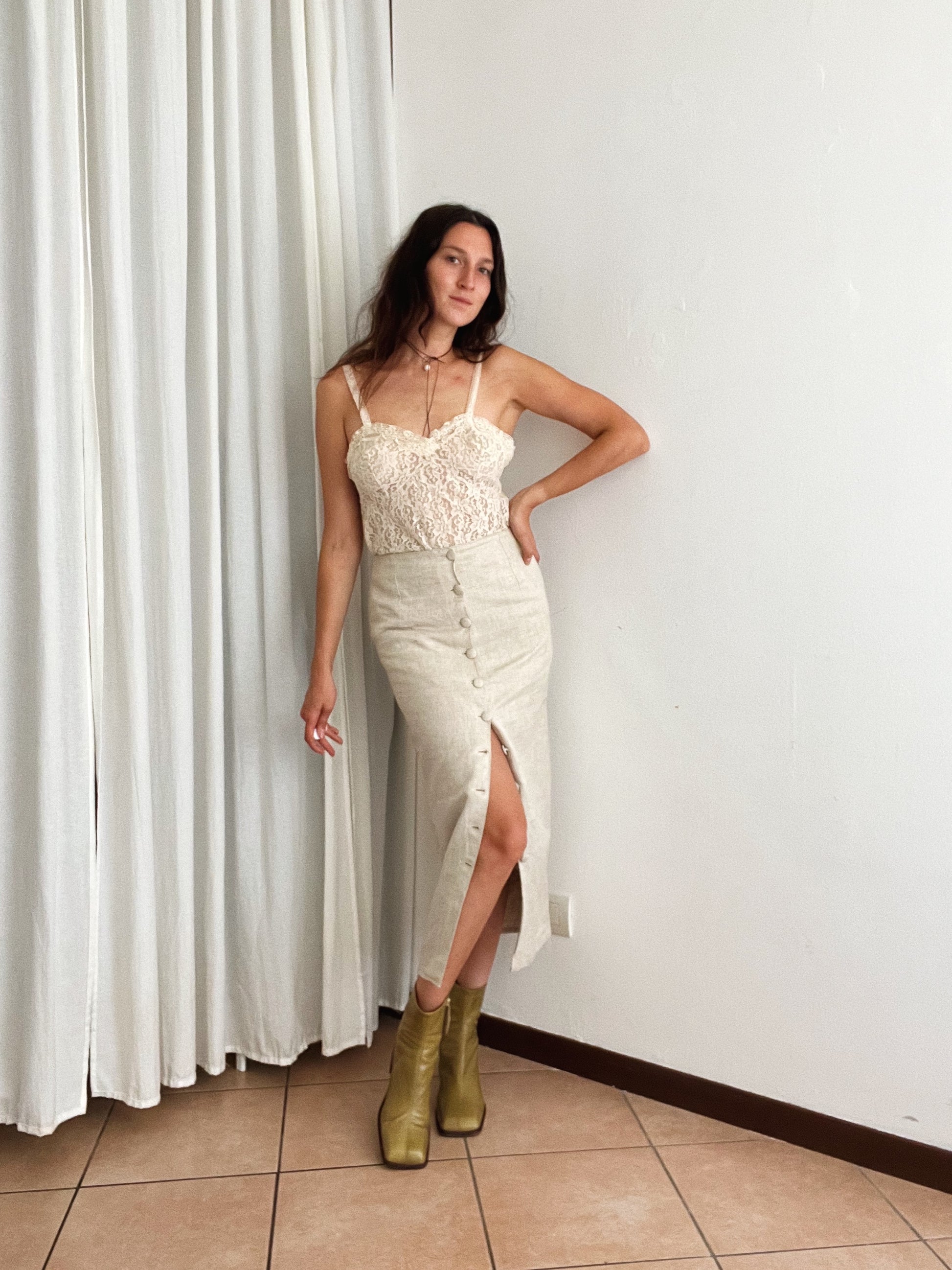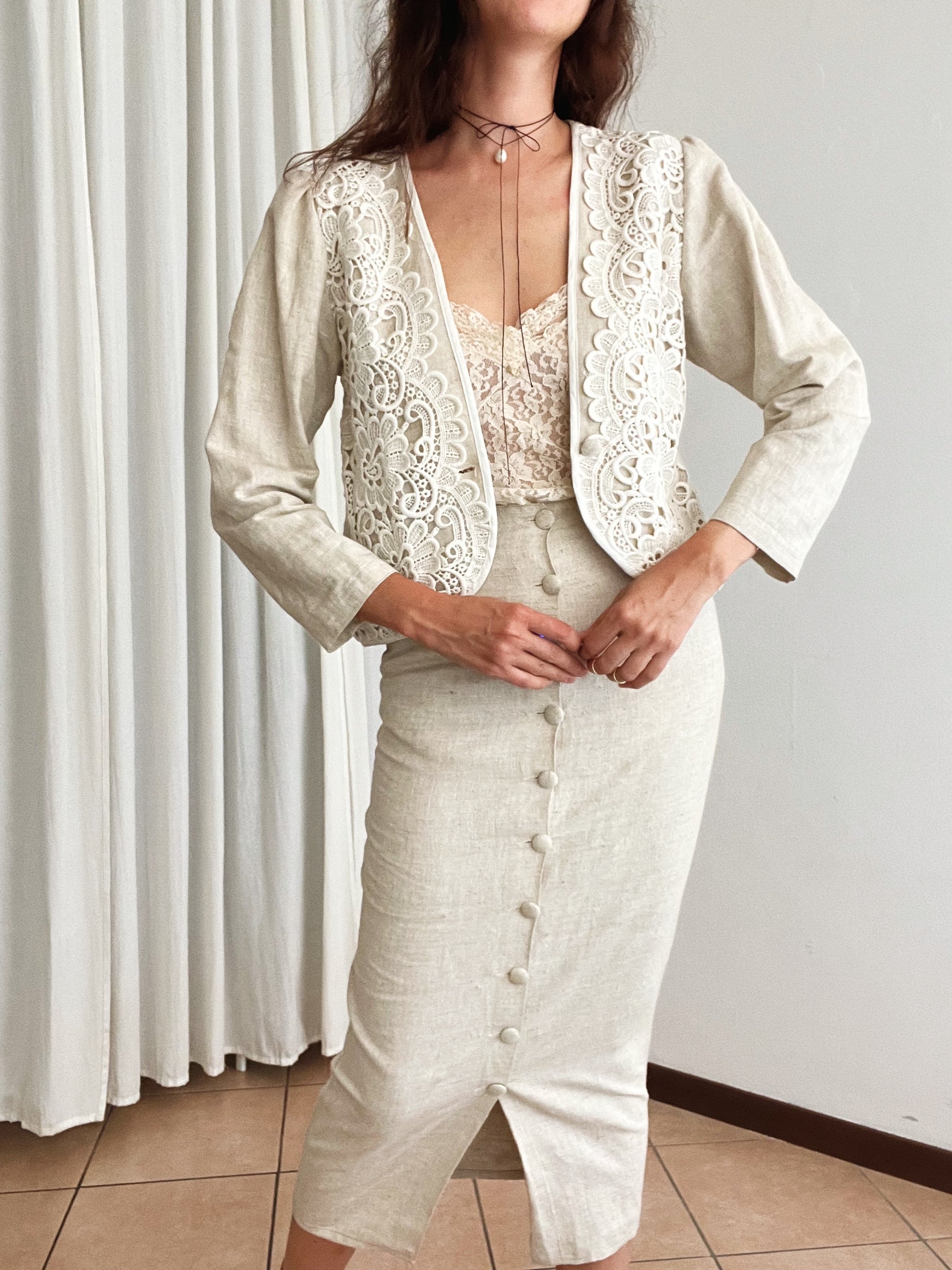 Gonna vintage sartoriale, in tessuto che direi è in lino con inserti in pizzo con bottoni centrali . Veste taglia M. Misure: vita 36, fianchi circa 47, lunghezza 83.